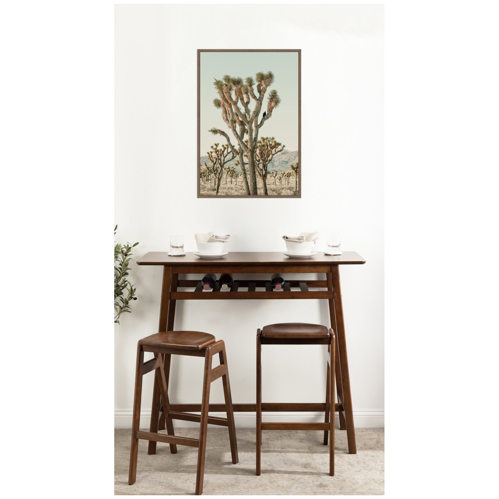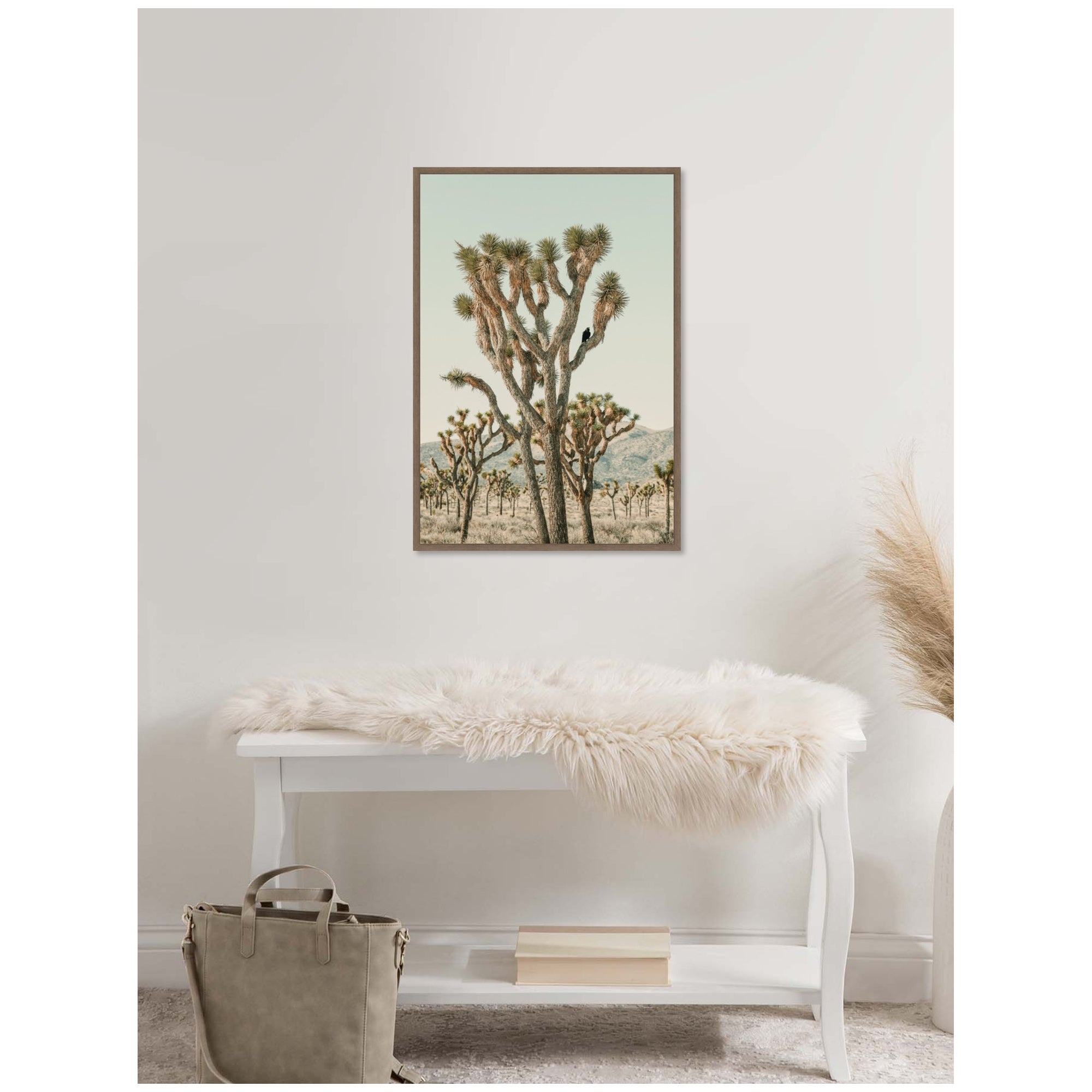 - Gallery Quality Art: Measuring 23 x 33 inches, this is beautifully presented in Sylvie Walnut frame - a modern, float frame with walnut woodgrain coloring and dramatic depth.. Expressive Wall Art Story:The image portrays a serene desert landscape featuring iconic Joshua trees. A solitary bird rests on one of the branches, highlighting the tranquility and vastness of the scene. The soft, muted tones emphasize the natural beauty and calm of the wilderness.