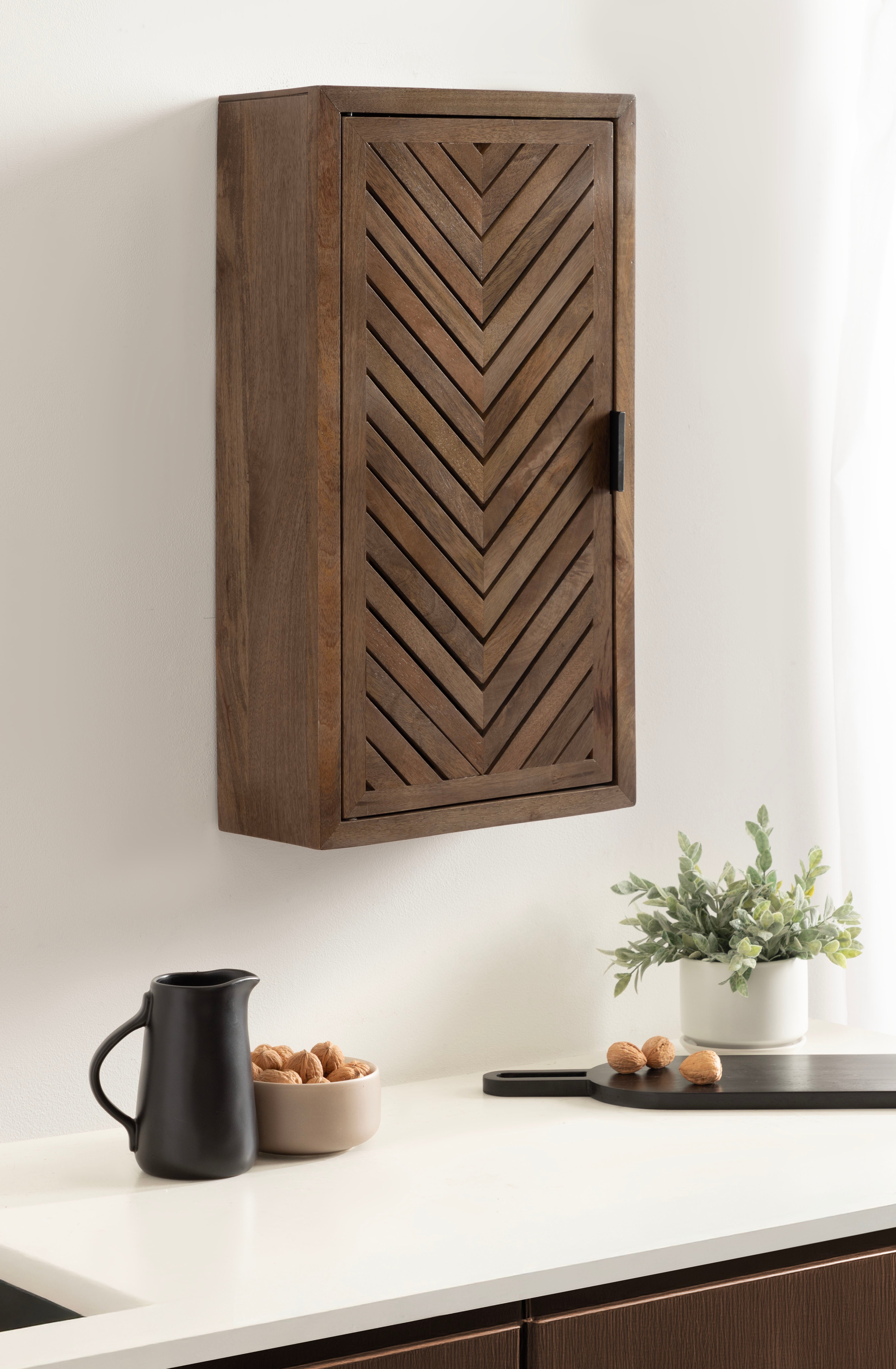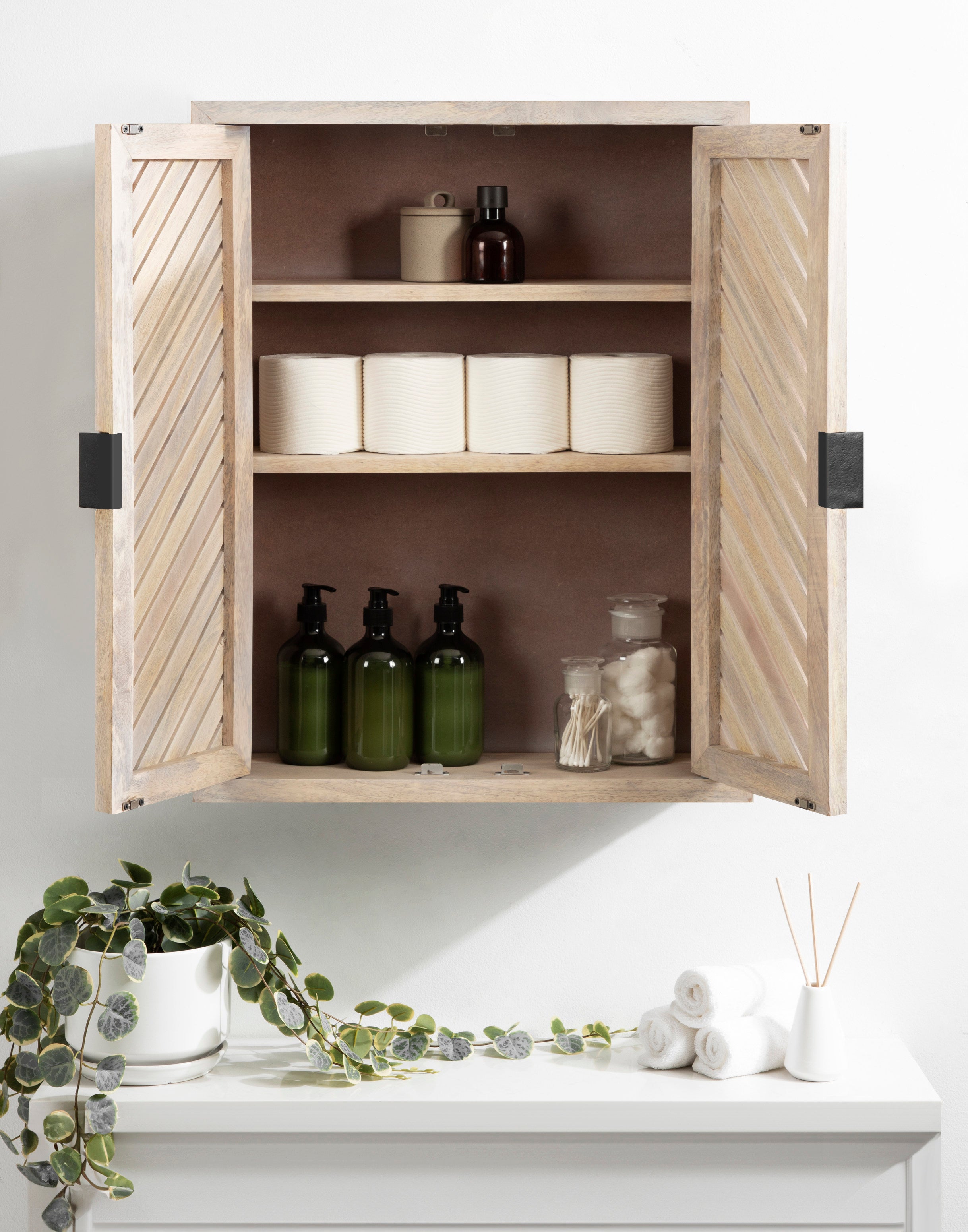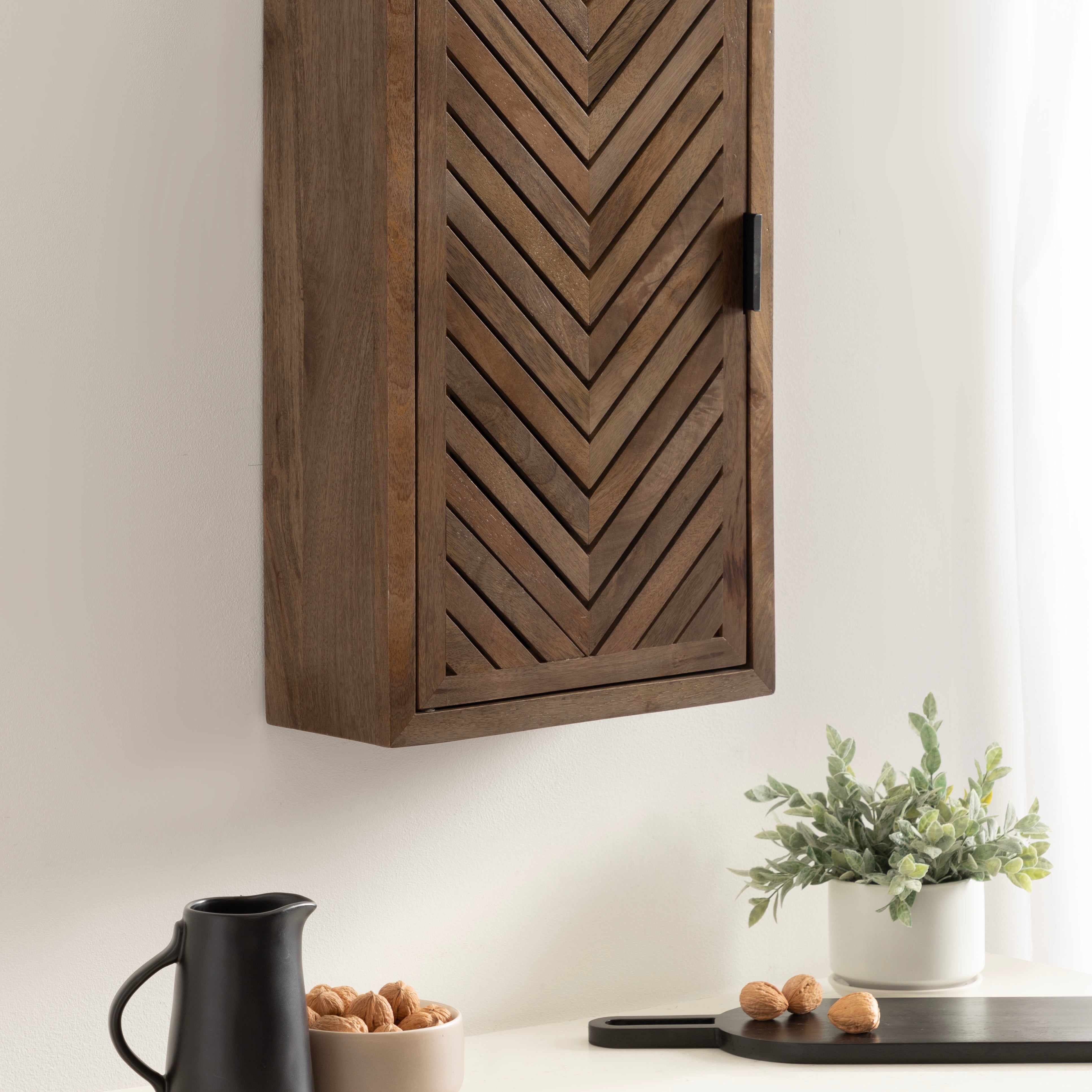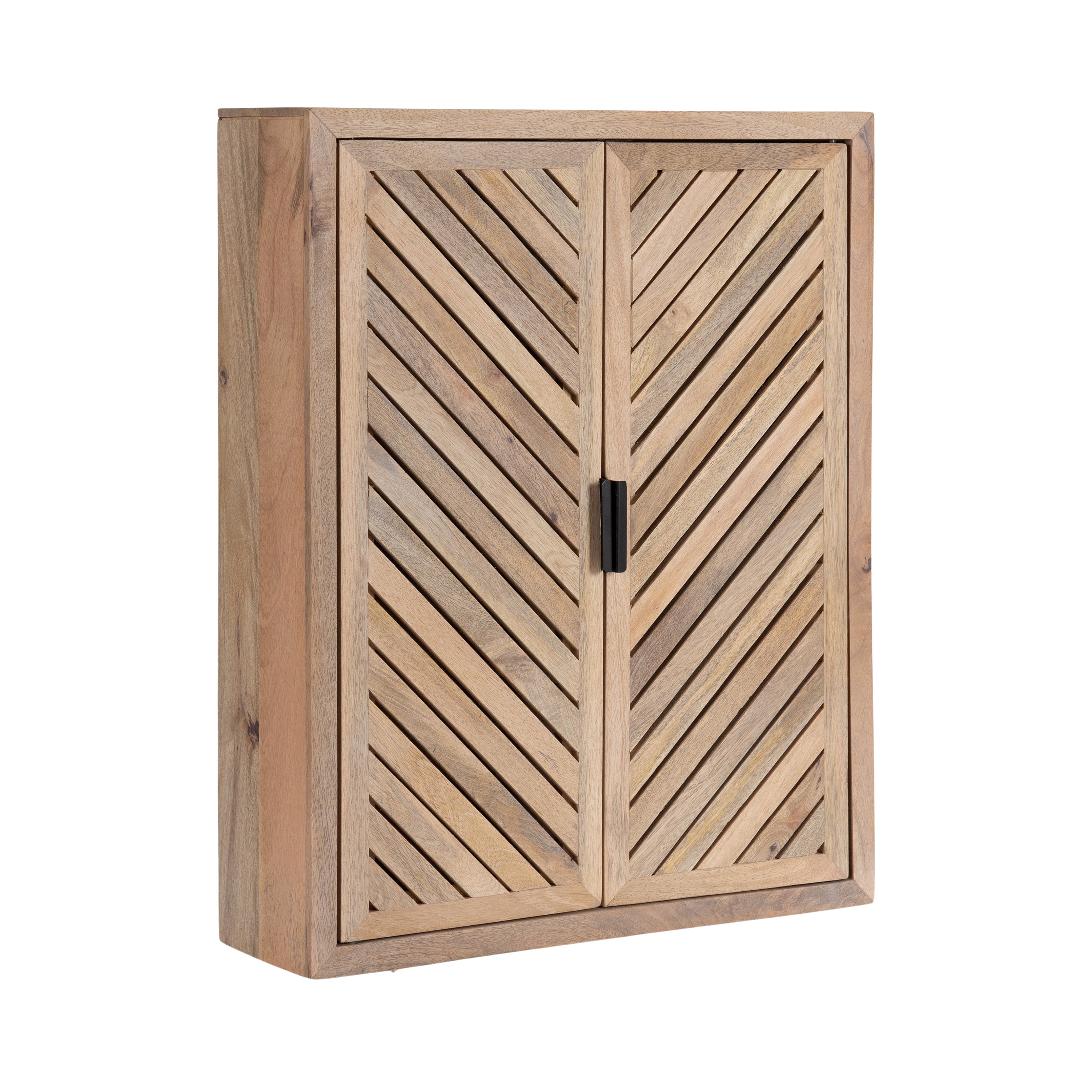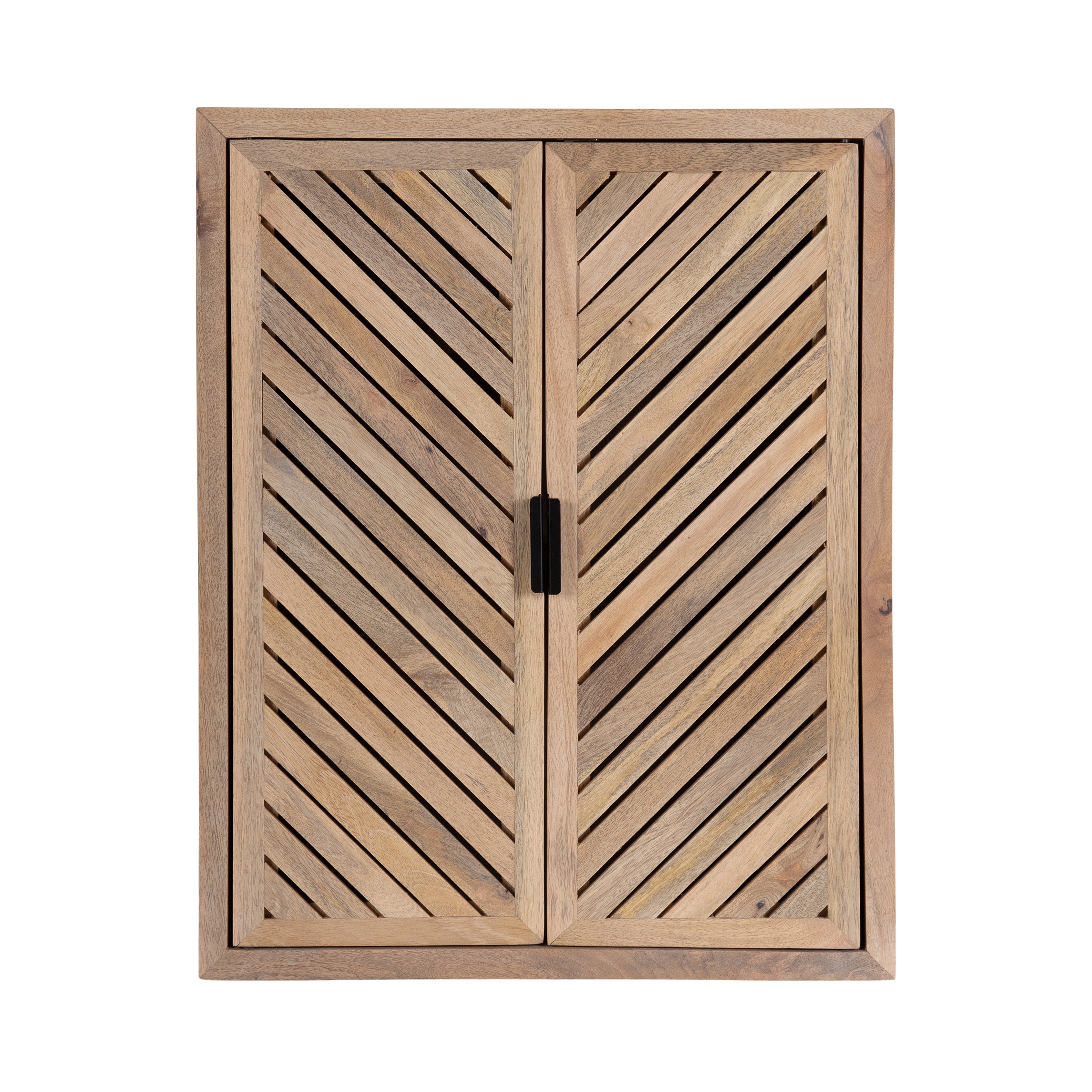 Store bathroom items, kitchen must-haves, small books, and more in this organic modern-inspired wall cabinet from Kate and Laurel. The Mezzeta cabinet has a mango wood composition, constructed in India by artisans and crafted by hand to give it a one-of-a-kind look and construction. The chevron arrows and black metal pulls also elevate this minimal modern design to blend into any boho decor. The Mezzeta cabinet is fantastic for housing your books, towels, and other everyday essentials, or you can use it as a functional space for small plates, mugs, and cups. Due to its size, the Mezzeta wall cabinet is perfect for use in a bedroom, living room, or bathroom as extra above-toilet storage. Your items will be secure thanks to the doors kept closed by magnetic clasps. The Mezzeta wall cabinet hangs on your wall in a matter of seconds, thanks to the metal Z-brackets that are securely attached to the back of the wooden frame.