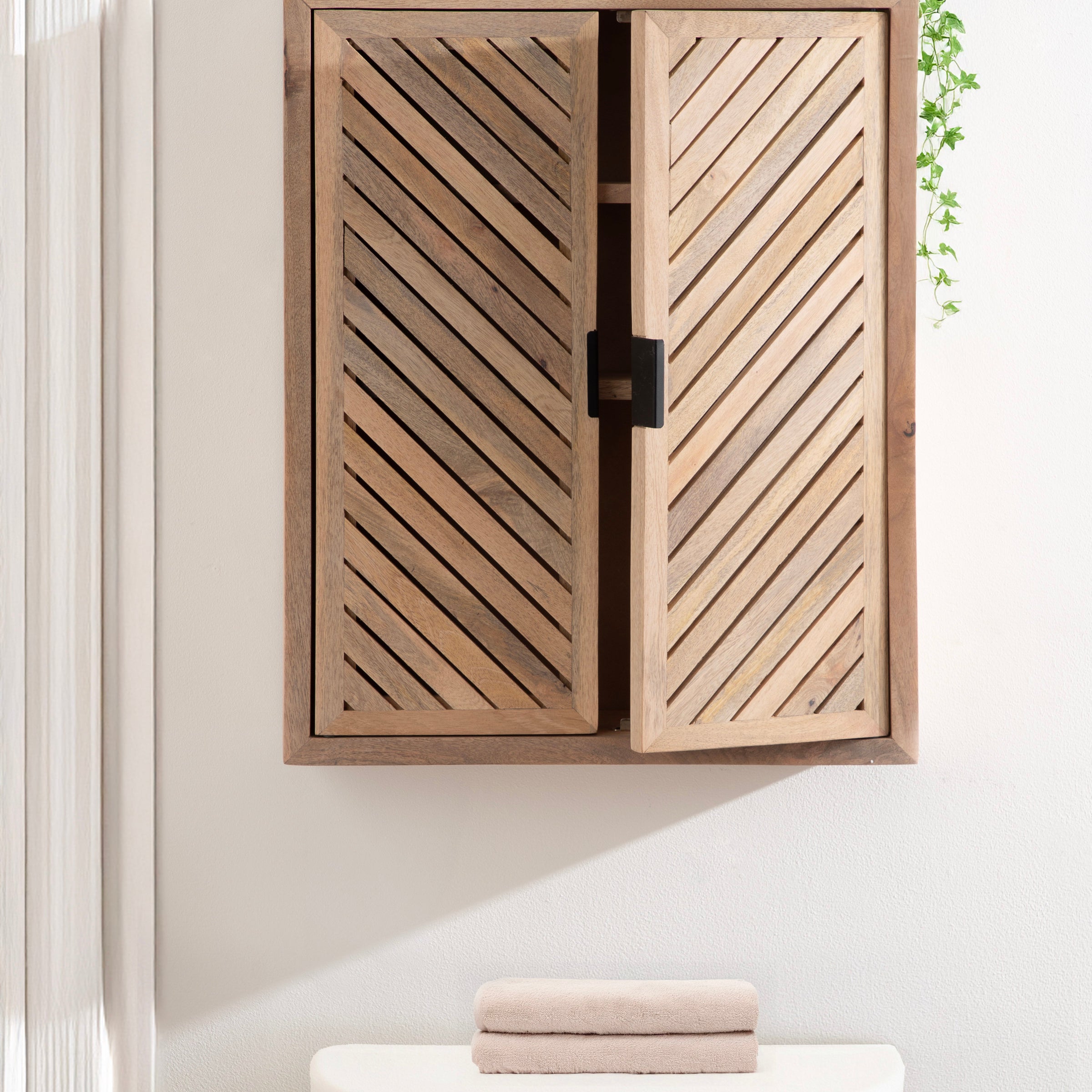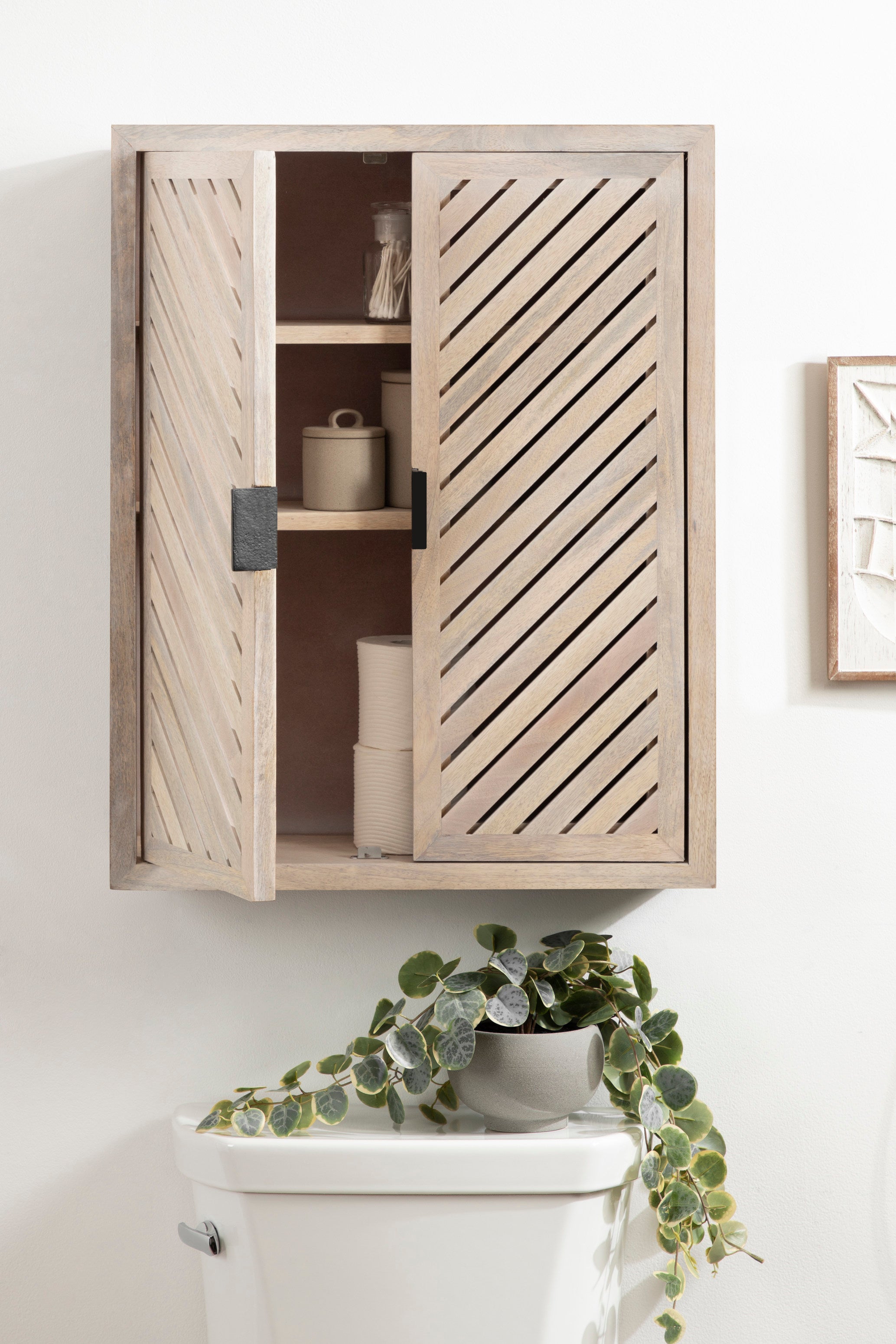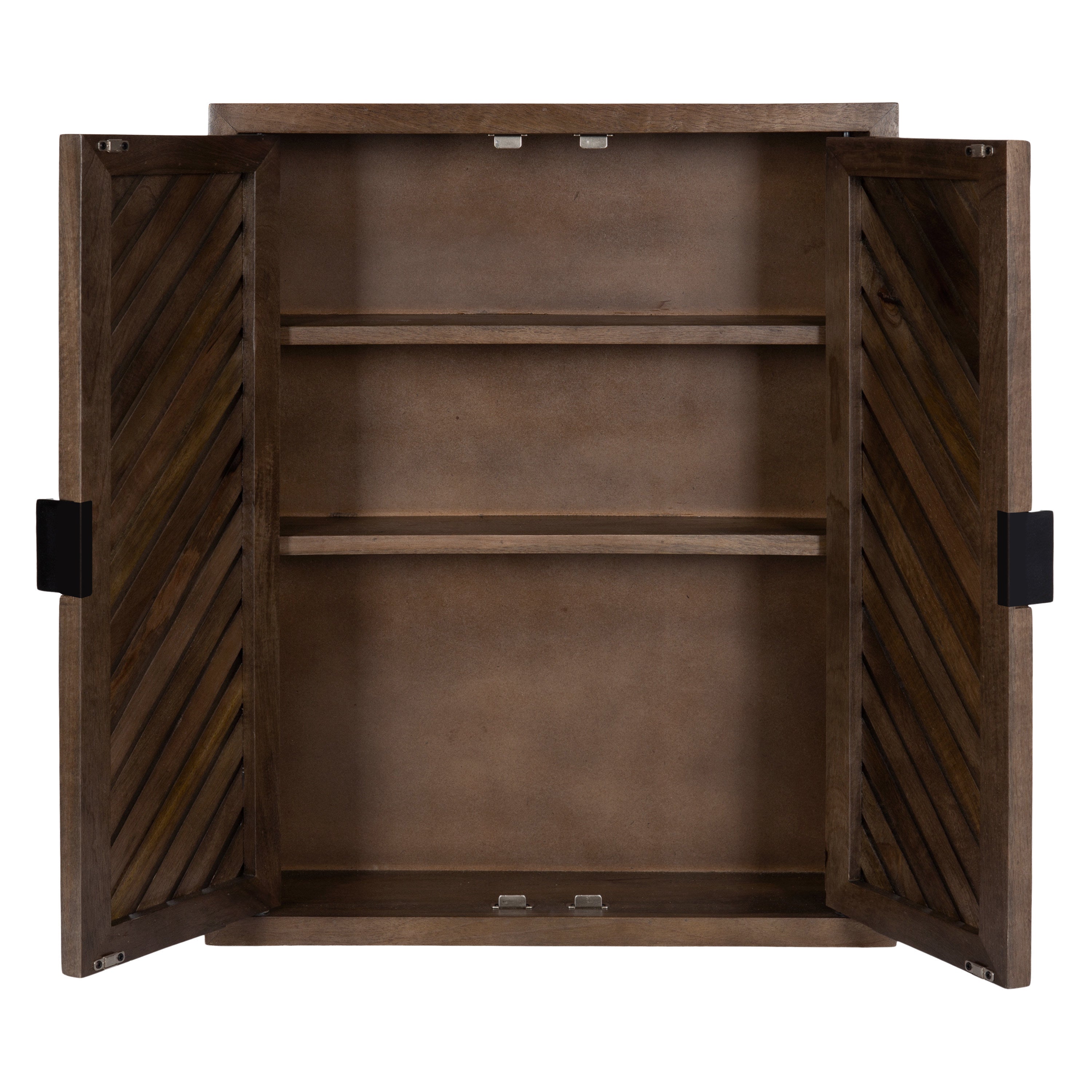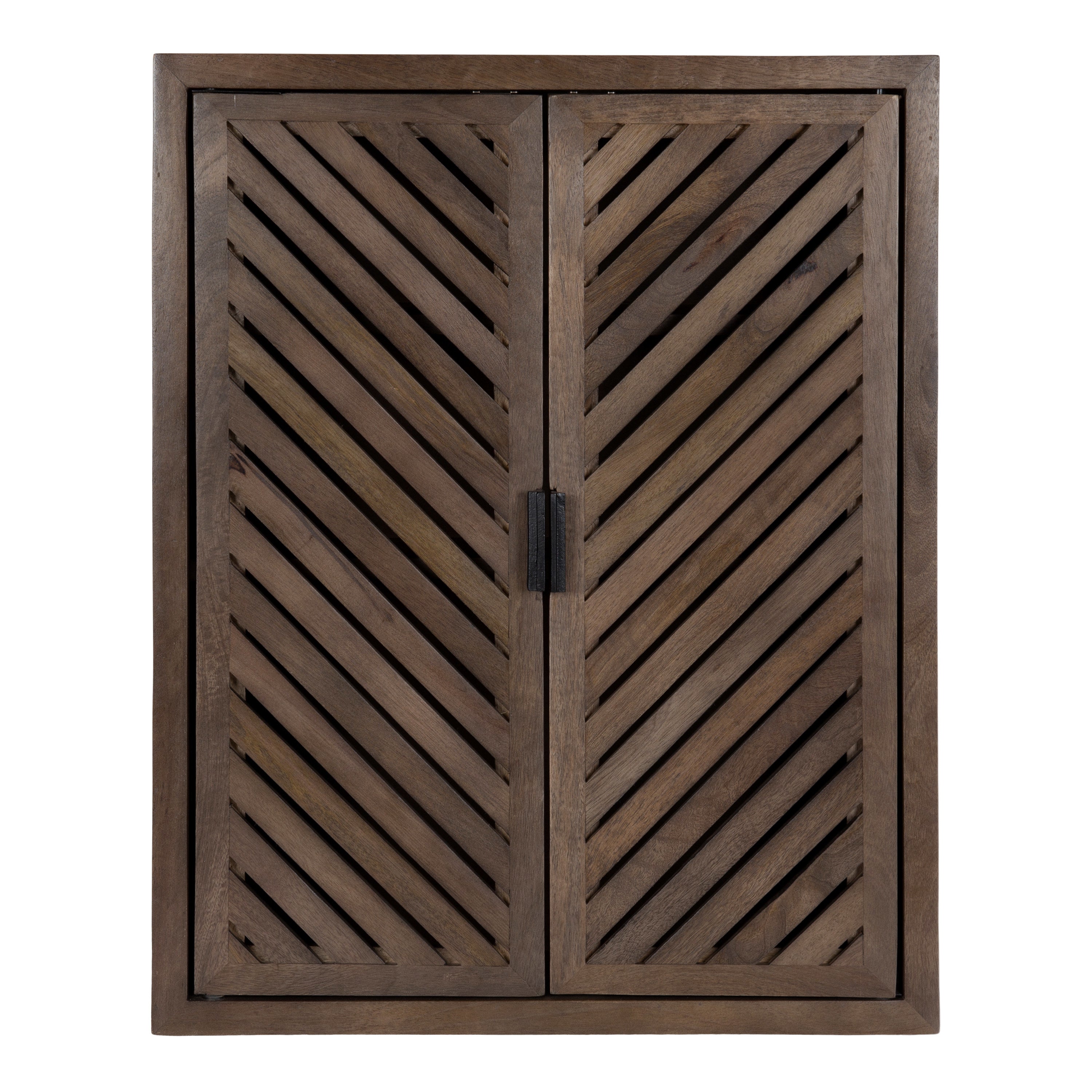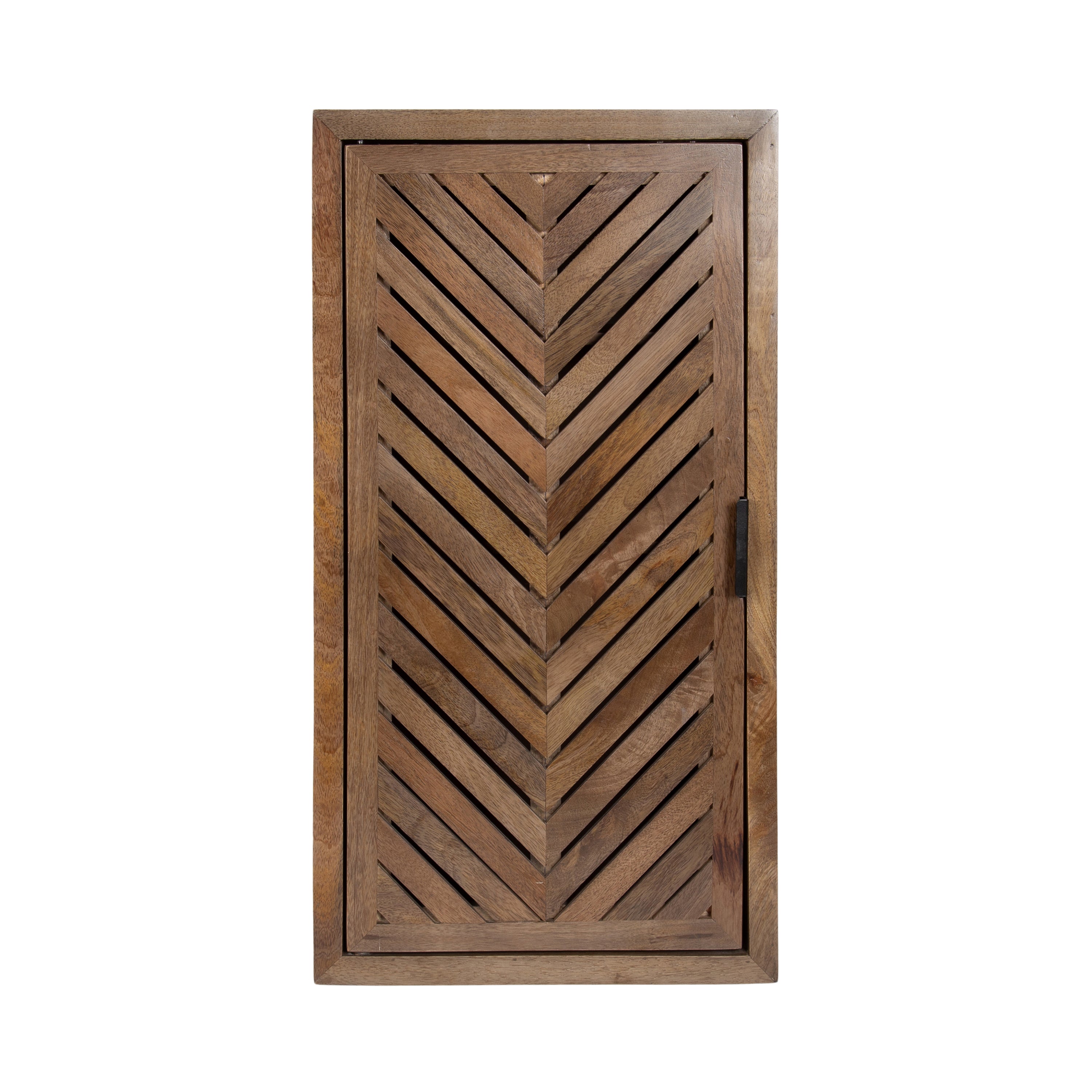Store bathroom items, kitchen must-haves, small books, and more in this organic modern-inspired wall cabinet from Kate and Laurel. The Mezzeta cabinet has a mango wood composition, constructed in India by artisans and crafted by hand to give it a one-of-a-kind look and construction. The chevron arrows and black metal pulls also elevate this minimal modern design to blend into any boho decor. The Mezzeta cabinet is fantastic for housing your books, towels, and other everyday essentials, or you can use it as a functional space for small plates, mugs, and cups. Due to its size, the Mezzeta wall cabinet is perfect for use in a bedroom, living room, or bathroom as extra above-toilet storage. Your items will be secure thanks to the doors kept closed by magnetic clasps. The Mezzeta wall cabinet hangs on your wall in a matter of seconds, thanks to the metal Z-brackets that are securely attached to the back of the wooden frame.