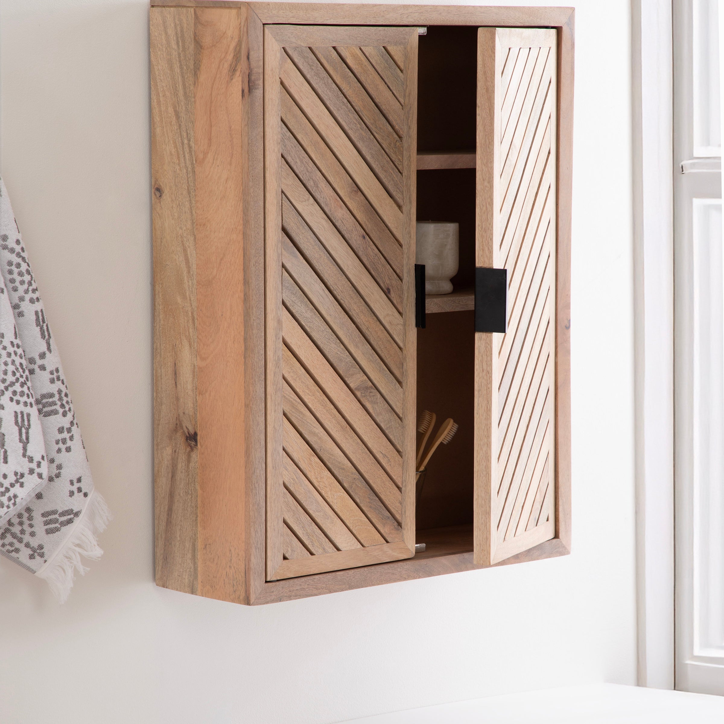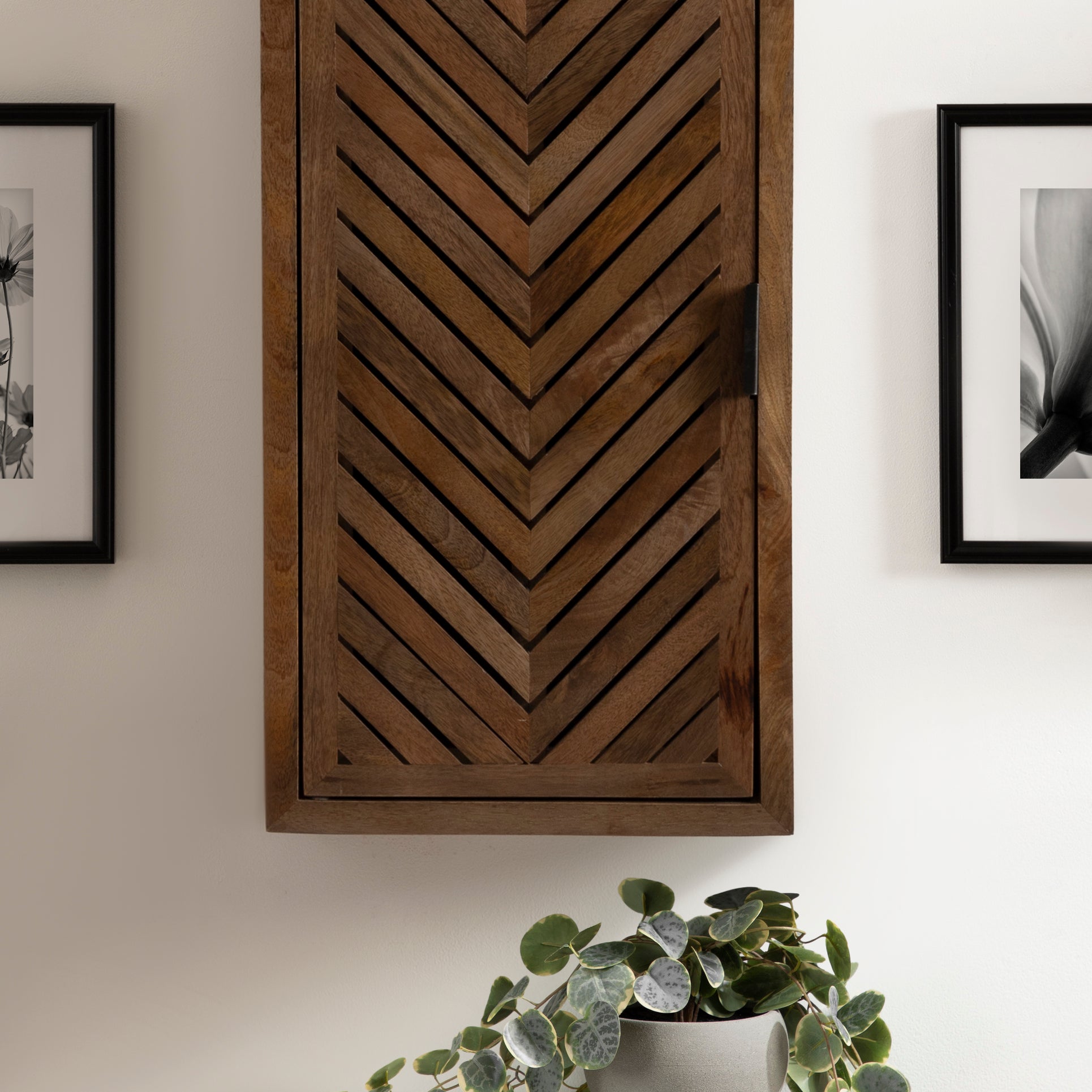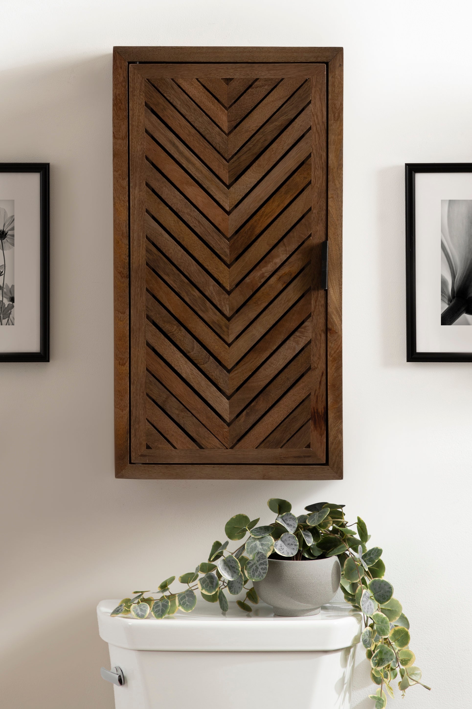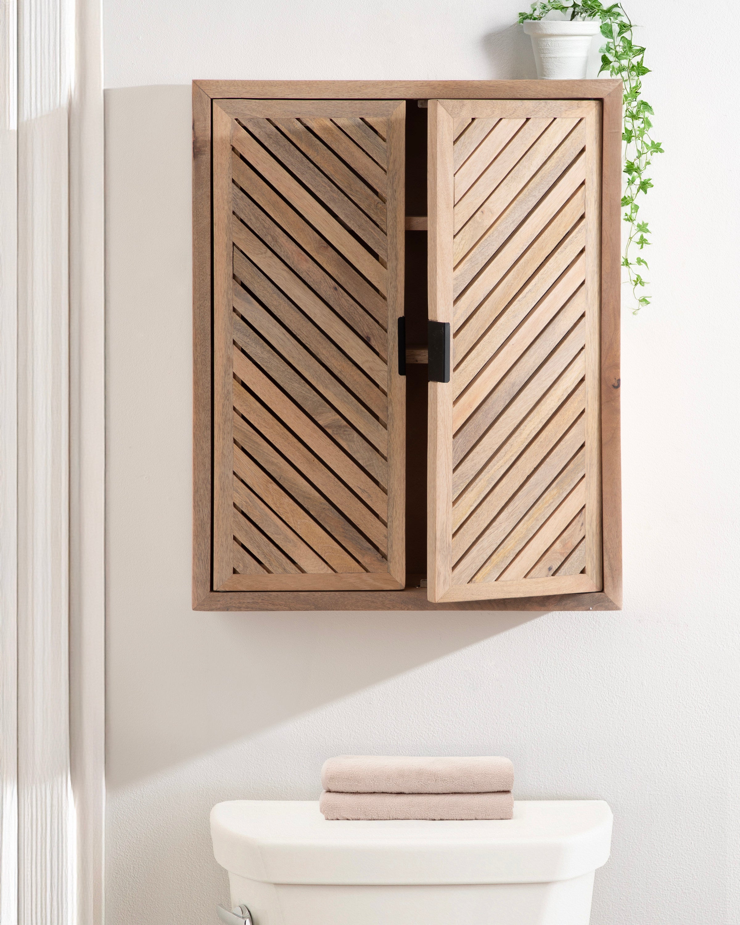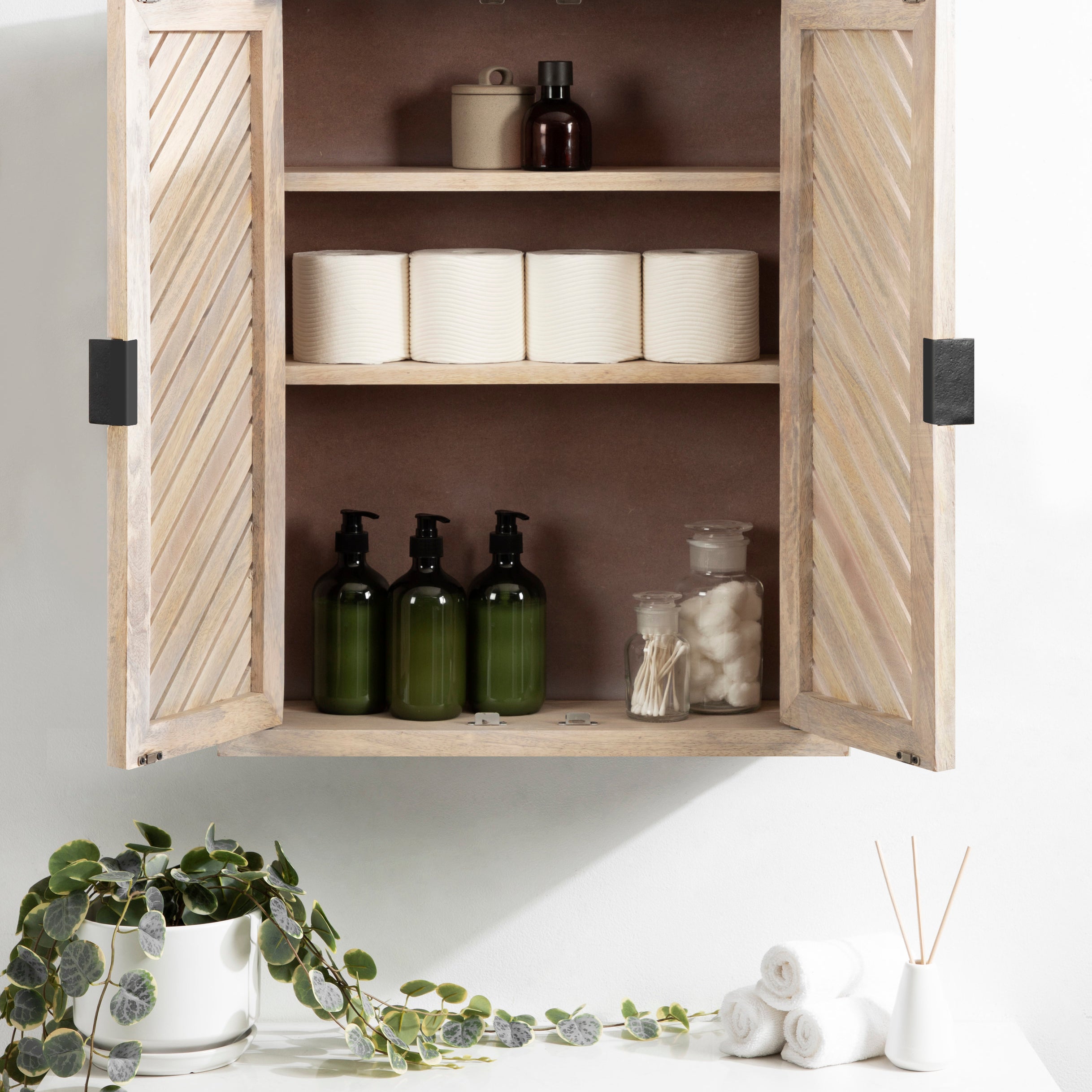 Store bathroom items, kitchen must-haves, small books, and more in this organic modern-inspired wall cabinet from Kate and Laurel. The Mezzeta cabinet has a mango wood composition, constructed in India by artisans and crafted by hand to give it a one-of-a-kind look and construction. The chevron arrows and black metal pulls also elevate this minimal modern design to blend into any boho decor. The Mezzeta cabinet is fantastic for housing your books, towels, and other everyday essentials, or you can use it as a functional space for small plates, mugs, and cups. Due to its size, the Mezzeta wall cabinet is perfect for use in a bedroom, living room, or bathroom as extra above-toilet storage. Your items will be secure thanks to the doors kept closed by magnetic clasps. The Mezzeta wall cabinet hangs on your wall in a matter of seconds, thanks to the metal Z-brackets that are securely attached to the back of the wooden frame.