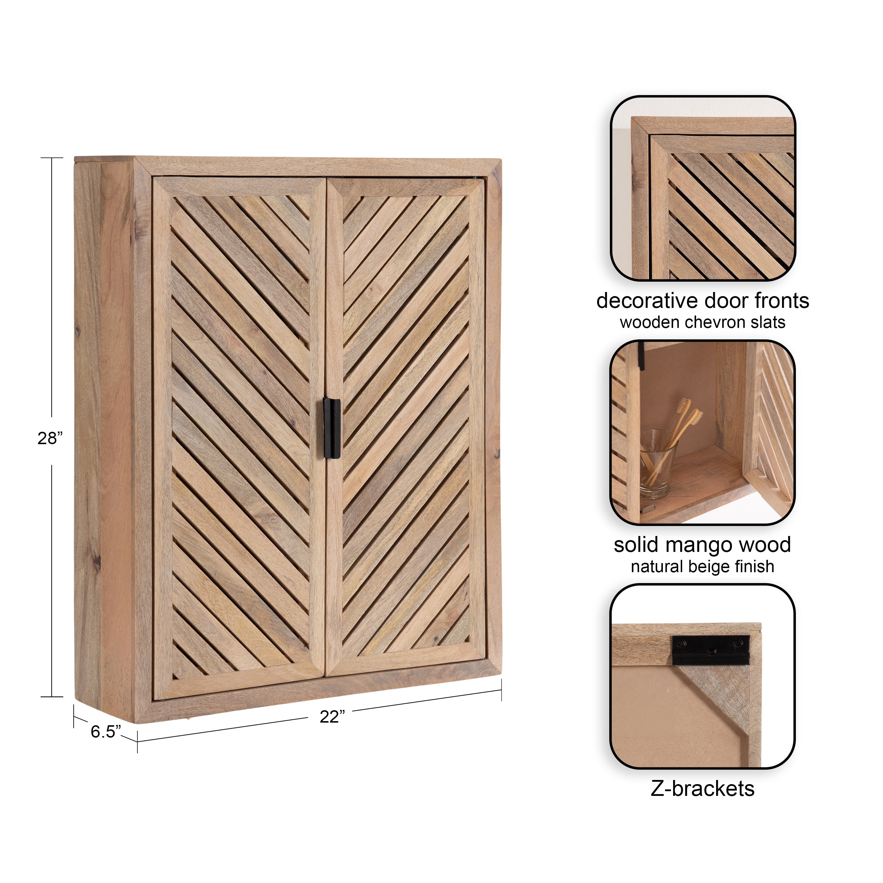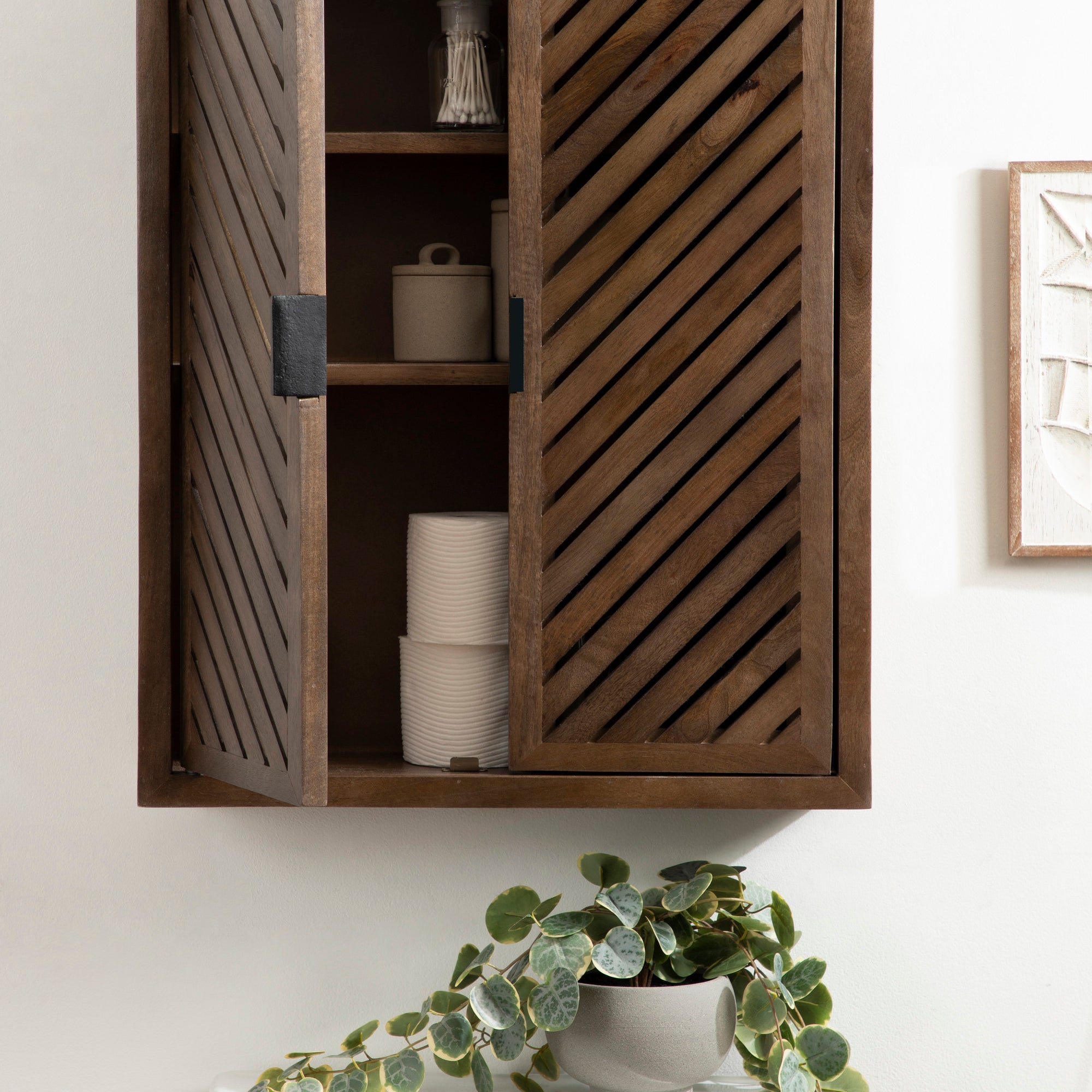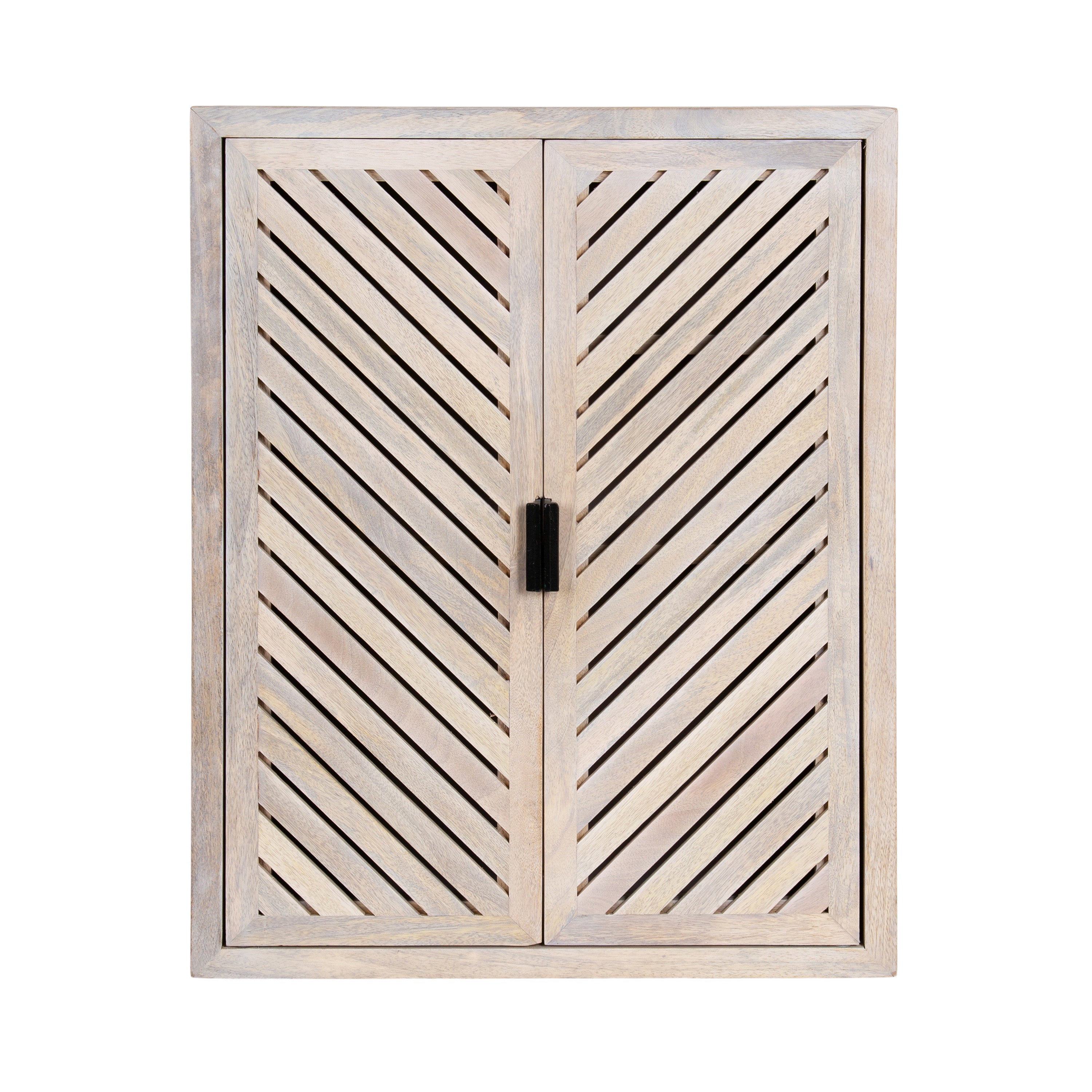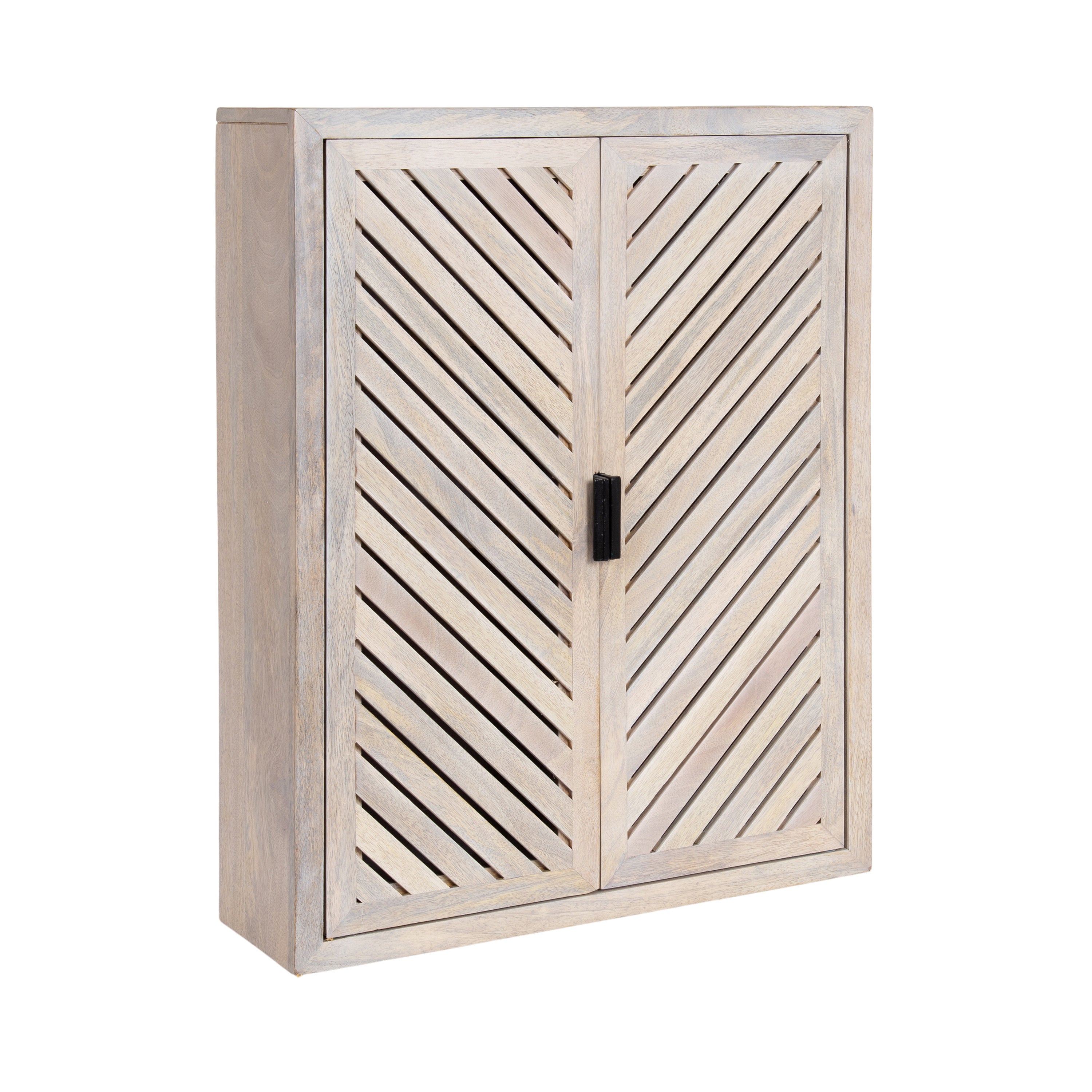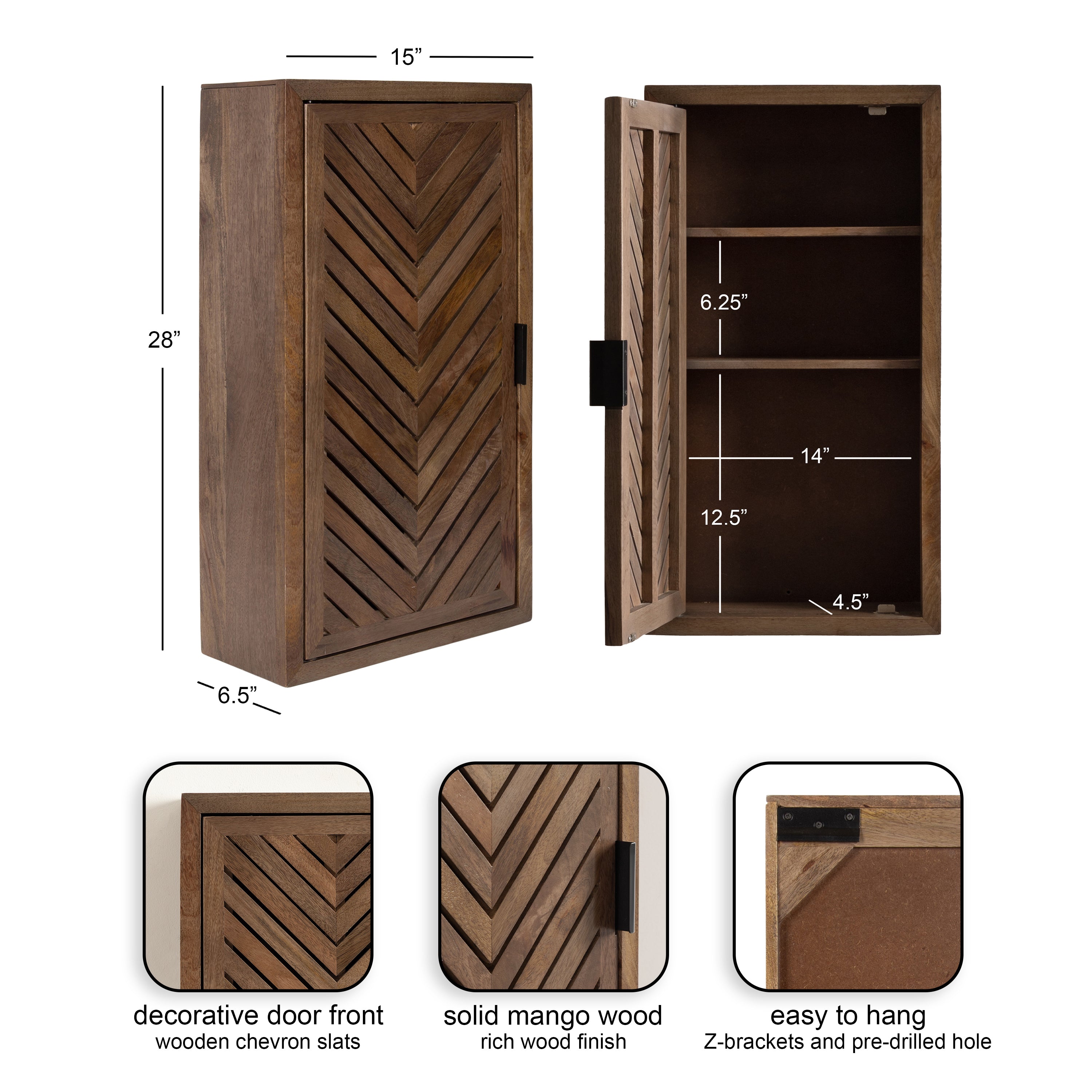 Store bathroom items, kitchen must-haves, small books, and more in this organic modern-inspired wall cabinet from Kate and Laurel. The Mezzeta cabinet has a mango wood composition, constructed in India by artisans and crafted by hand to give it a one-of-a-kind look and construction. The chevron arrows and black metal pulls also elevate this minimal modern design to blend into any boho decor. The Mezzeta cabinet is fantastic for housing your books, towels, and other everyday essentials, or you can use it as a functional space for small plates, mugs, and cups. Due to its size, the Mezzeta wall cabinet is perfect for use in a bedroom, living room, or bathroom as extra above-toilet storage. Your items will be secure thanks to the doors kept closed by magnetic clasps. The Mezzeta wall cabinet hangs on your wall in a matter of seconds, thanks to the metal Z-brackets that are securely attached to the back of the wooden frame.