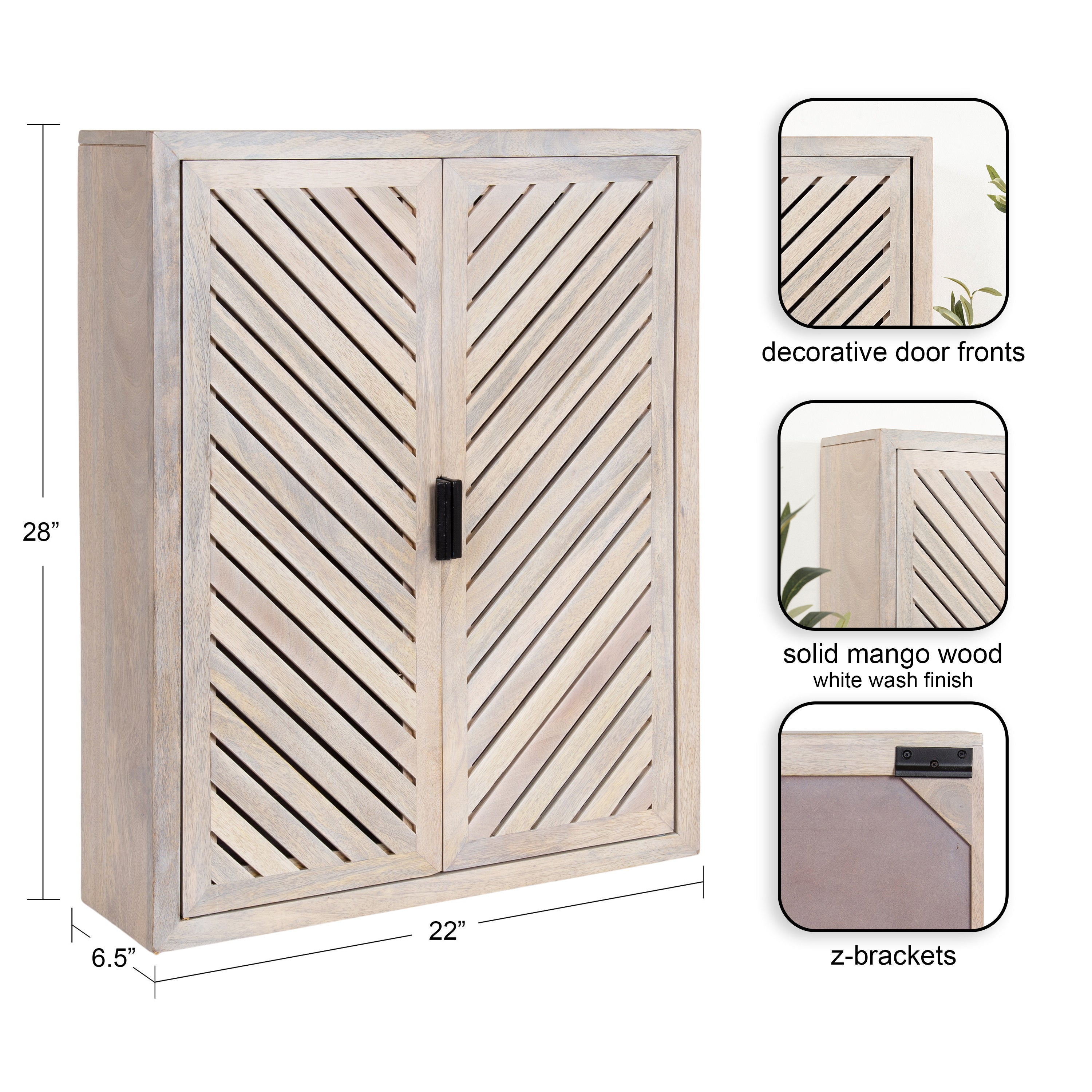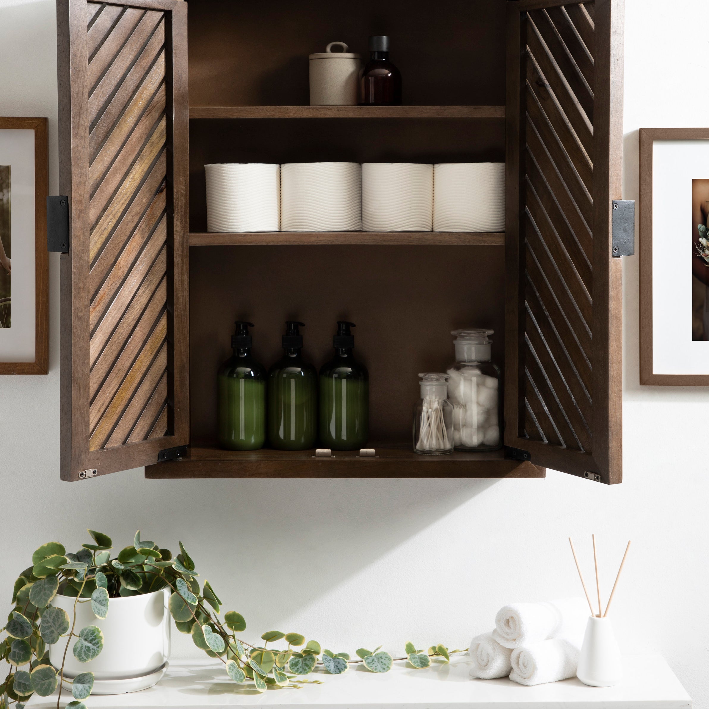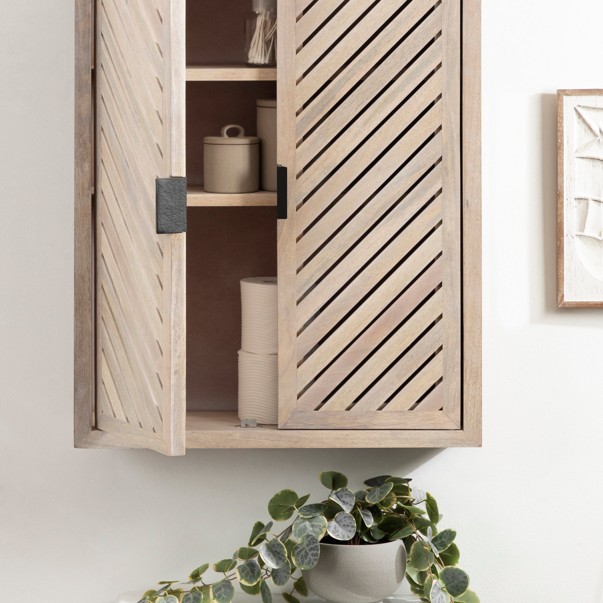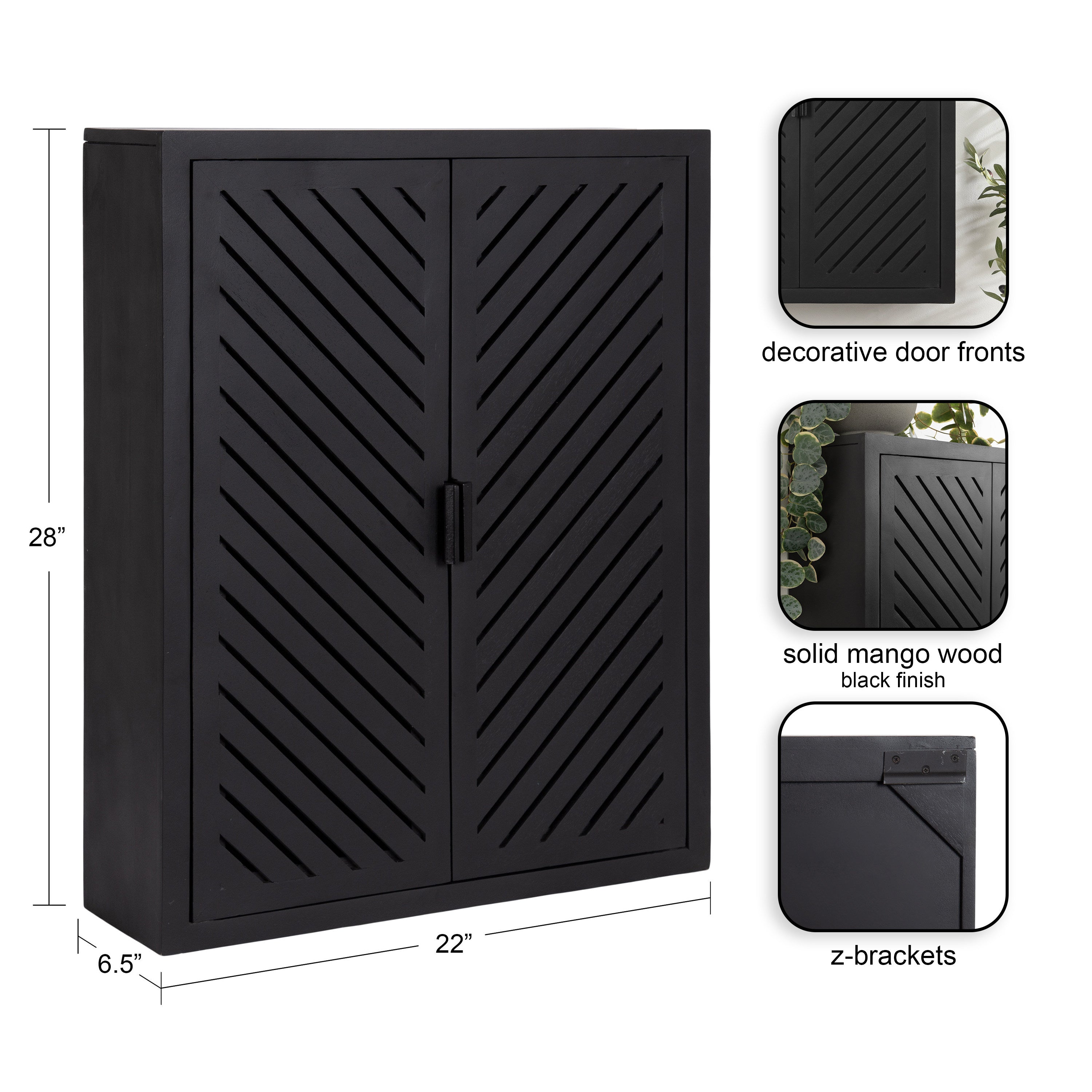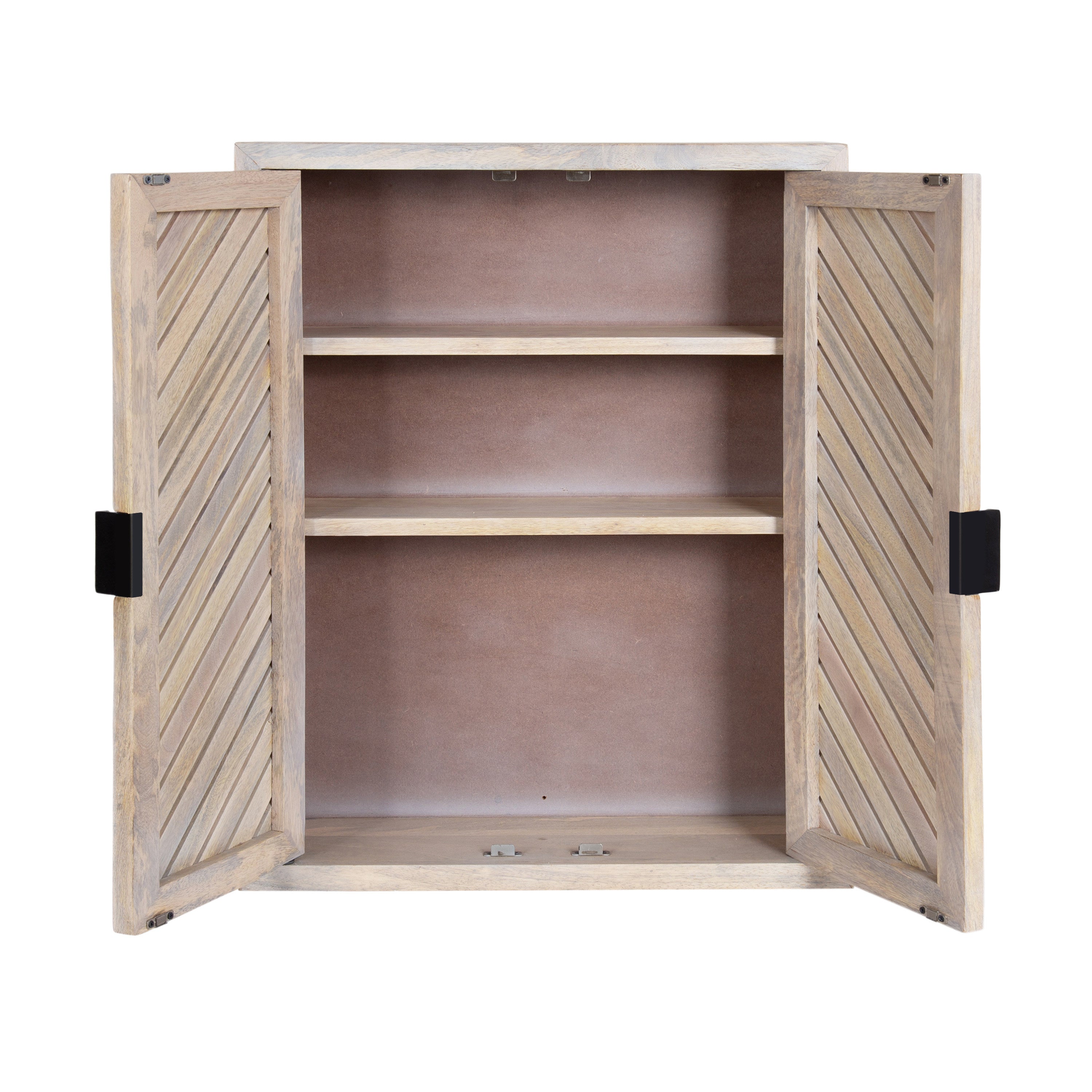 Store bathroom items, kitchen must-haves, small books, and more in this organic modern-inspired wall cabinet from Kate and Laurel. The Mezzeta cabinet has a mango wood composition, constructed in India by artisans and crafted by hand to give it a one-of-a-kind look and construction. The chevron arrows and black metal pulls also elevate this minimal modern design to blend into any boho decor. The Mezzeta cabinet is fantastic for housing your books, towels, and other everyday essentials, or you can use it as a functional space for small plates, mugs, and cups. Due to its size, the Mezzeta wall cabinet is perfect for use in a bedroom, living room, or bathroom as extra above-toilet storage. Your items will be secure thanks to the doors kept closed by magnetic clasps. The Mezzeta wall cabinet hangs on your wall in a matter of seconds, thanks to the metal Z-brackets that are securely attached to the back of the wooden frame.