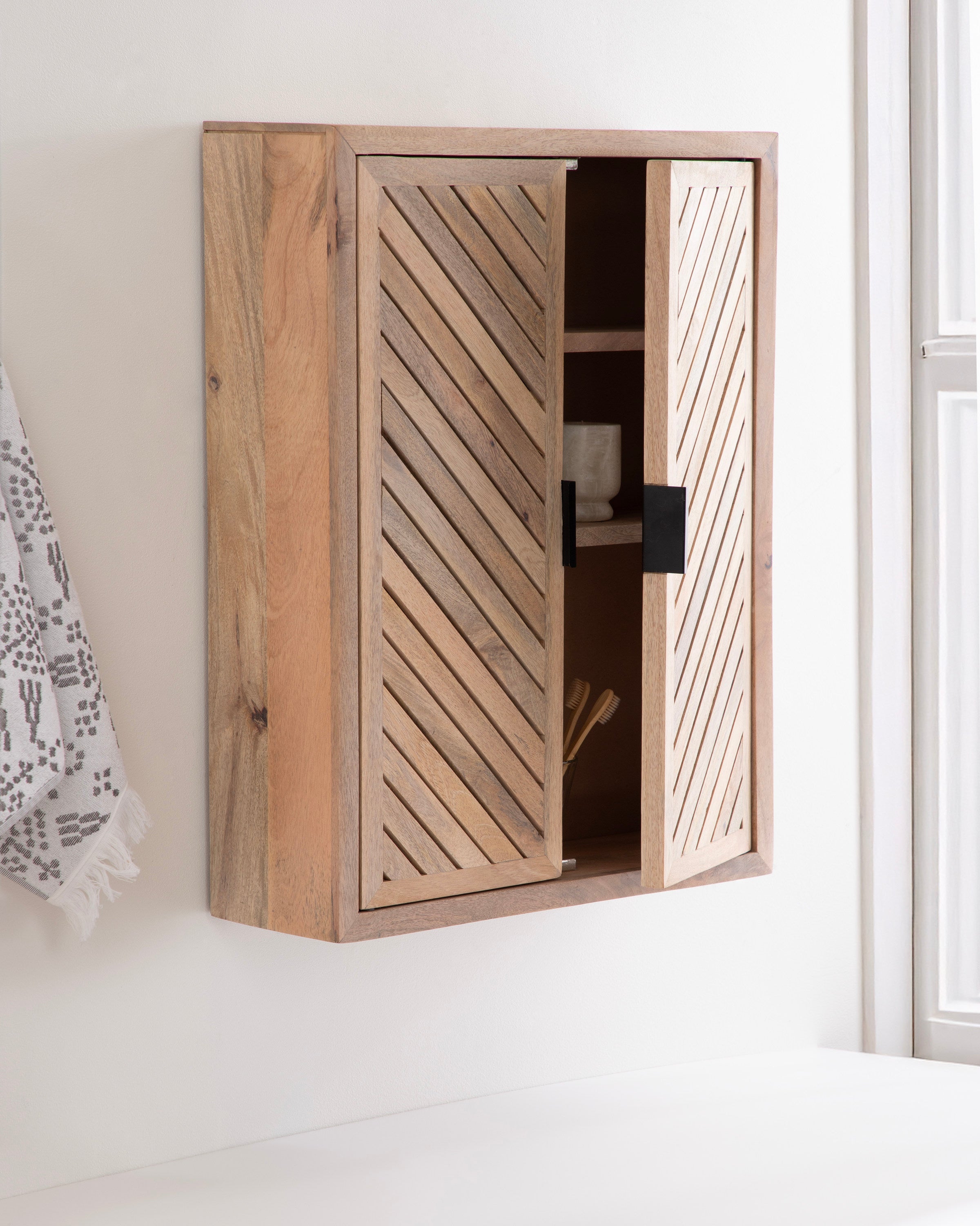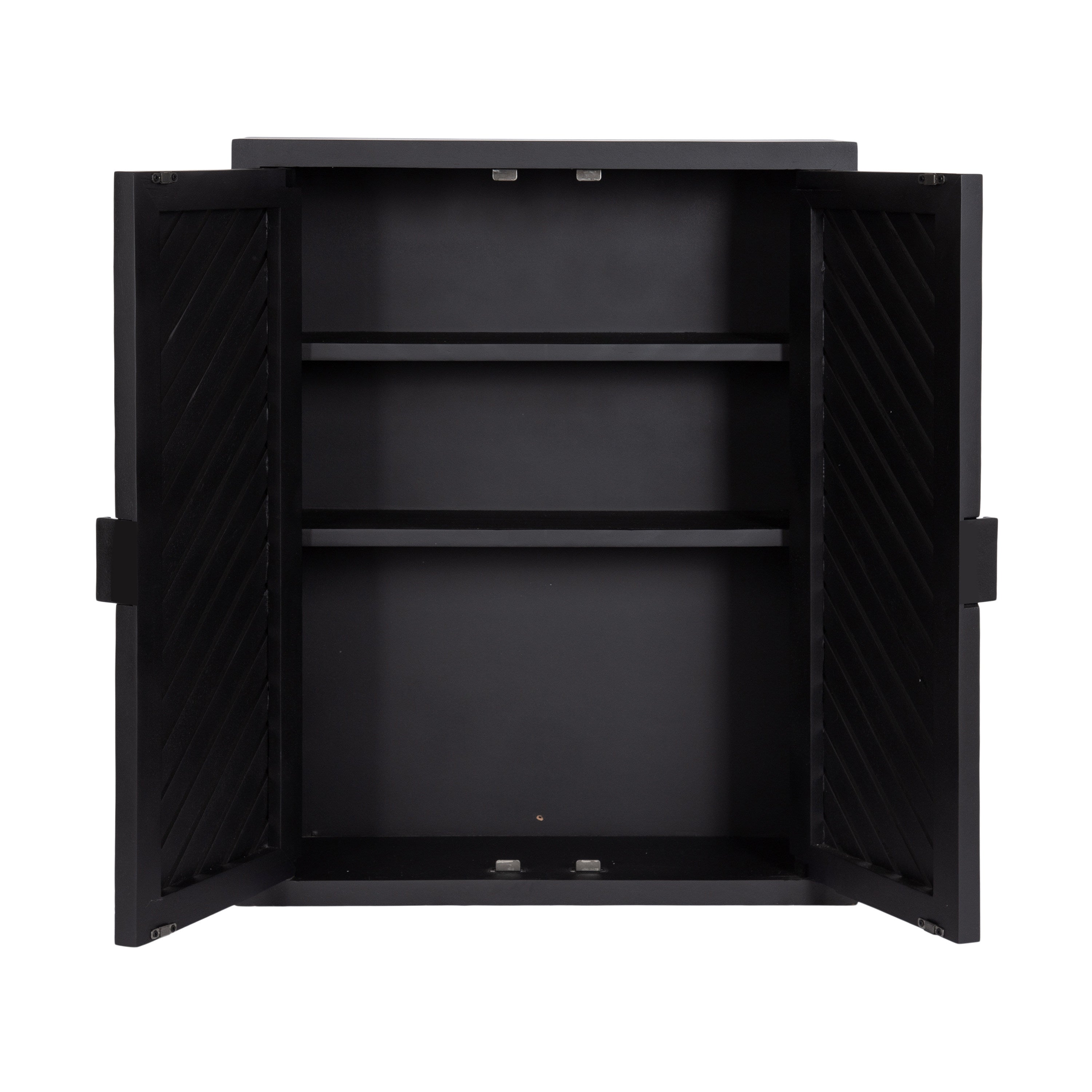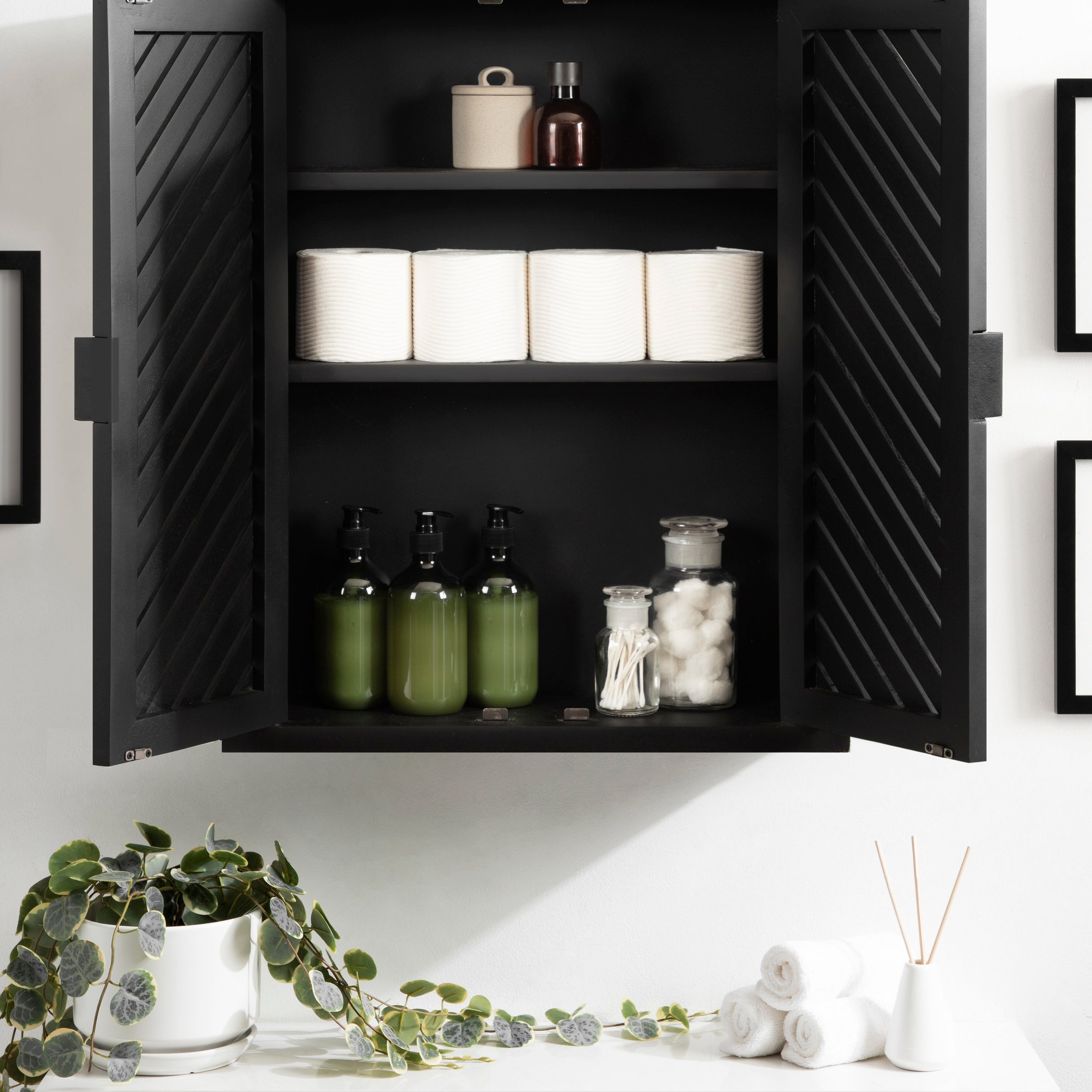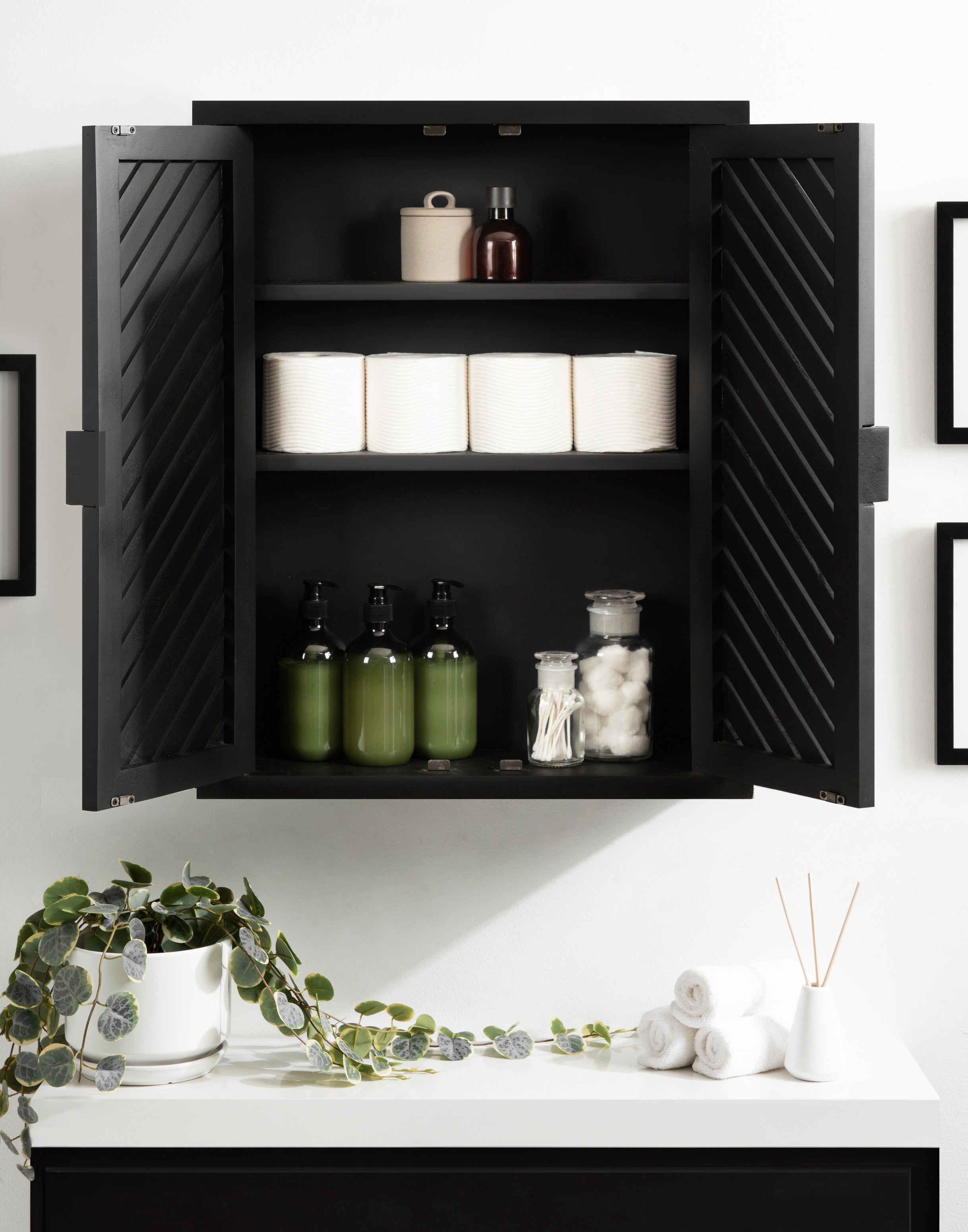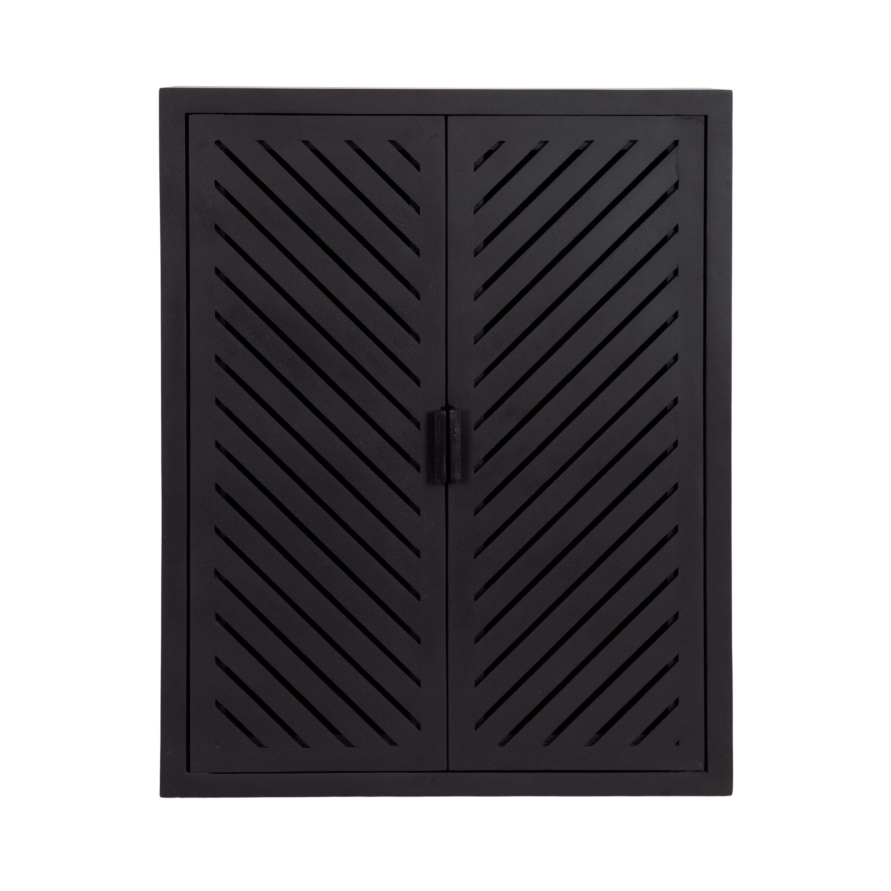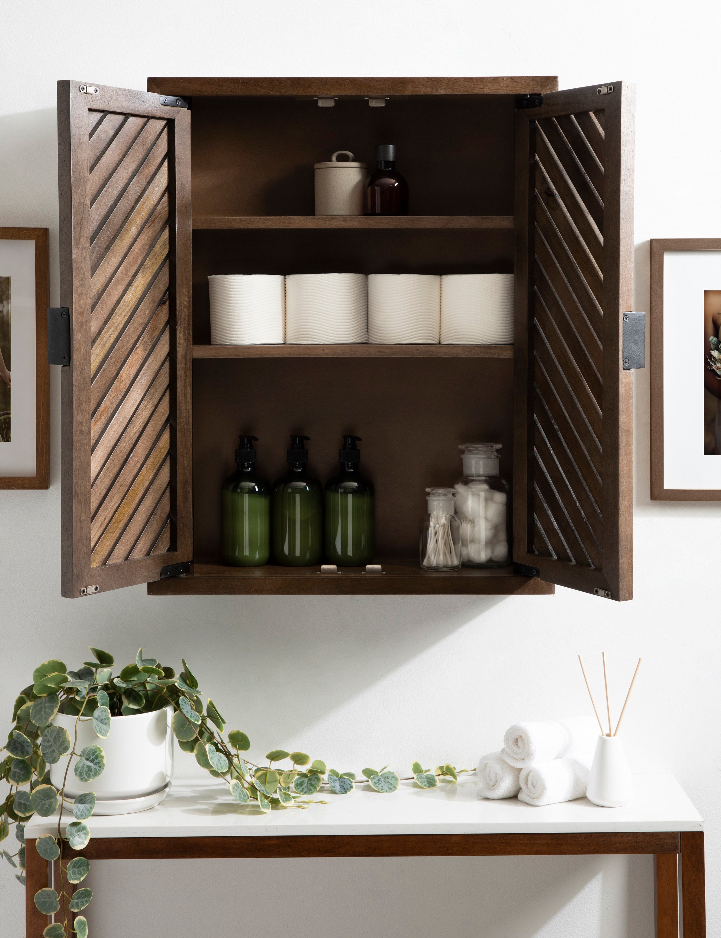 Store bathroom items, kitchen must-haves, small books, and more in this organic modern-inspired wall cabinet from Kate and Laurel. The Mezzeta cabinet has a mango wood composition, constructed in India by artisans and crafted by hand to give it a one-of-a-kind look and construction. The chevron arrows and black metal pulls also elevate this minimal modern design to blend into any boho decor. The Mezzeta cabinet is fantastic for housing your books, towels, and other everyday essentials, or you can use it as a functional space for small plates, mugs, and cups. Due to its size, the Mezzeta wall cabinet is perfect for use in a bedroom, living room, or bathroom as extra above-toilet storage. Your items will be secure thanks to the doors kept closed by magnetic clasps. The Mezzeta wall cabinet hangs on your wall in a matter of seconds, thanks to the metal Z-brackets that are securely attached to the back of the wooden frame.
