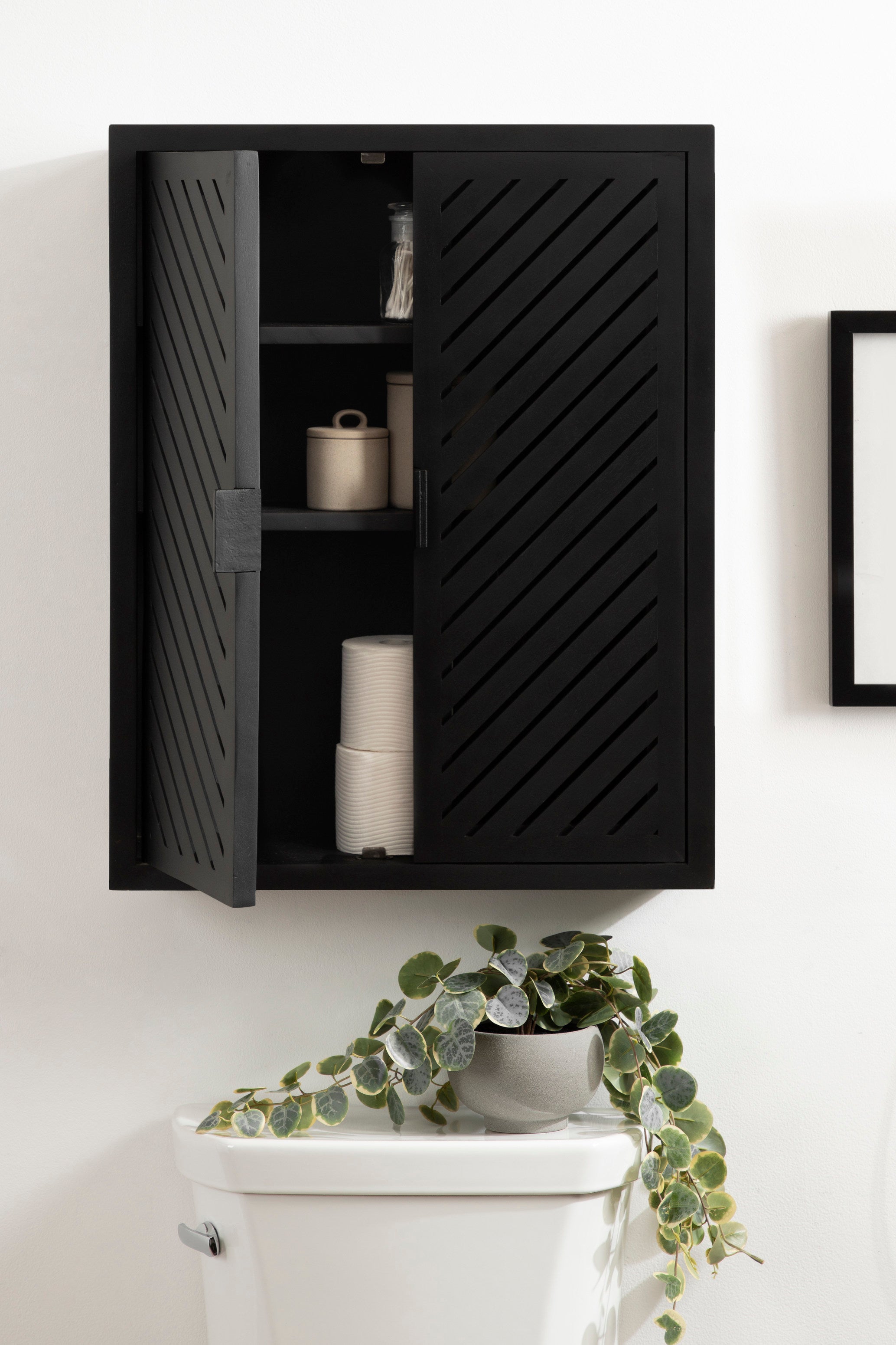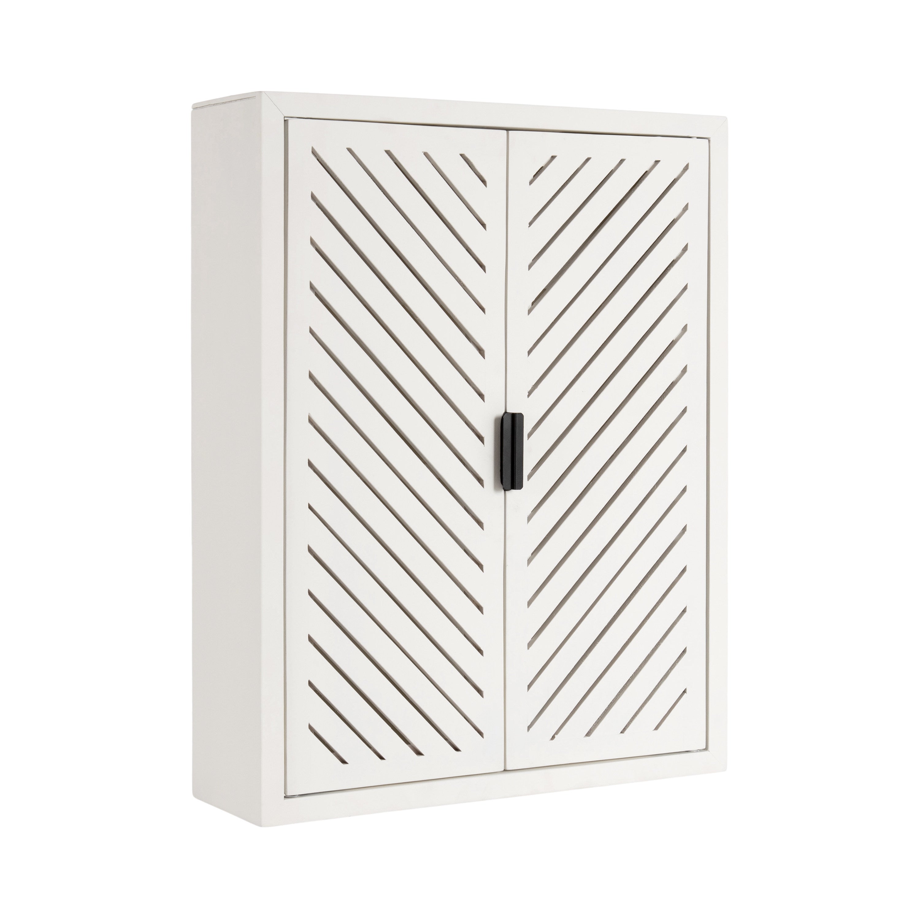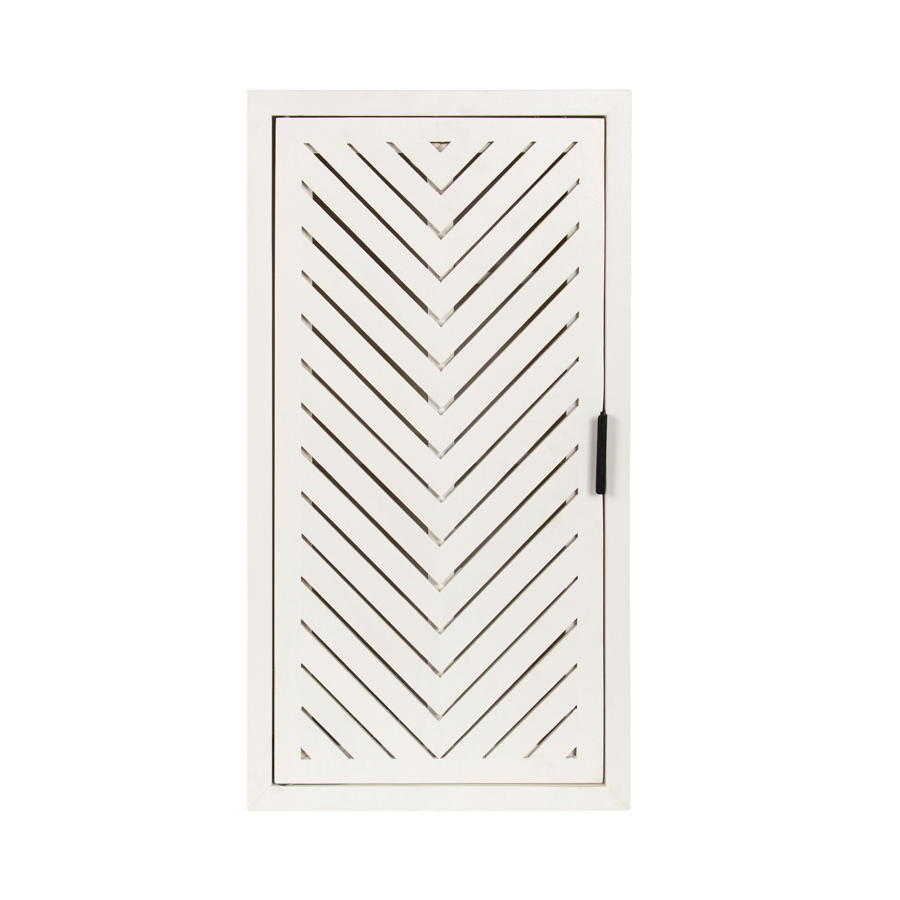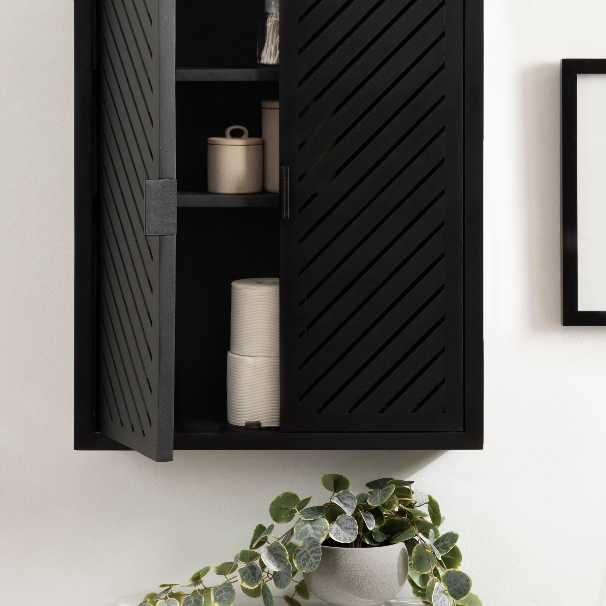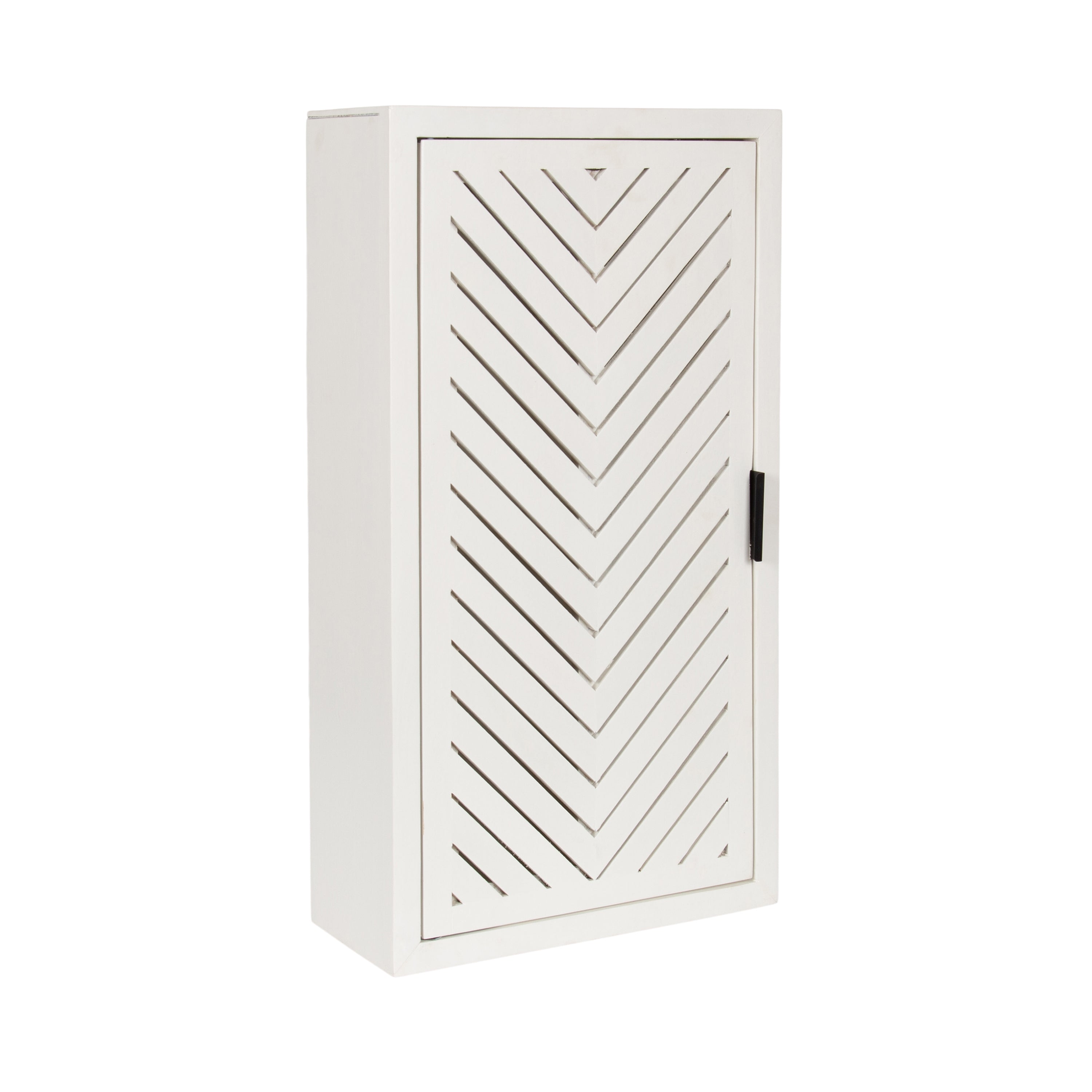 Store bathroom items, kitchen must-haves, small books, and more in this organic modern-inspired wall cabinet from Kate and Laurel. The Mezzeta cabinet has a mango wood composition, constructed in India by artisans and crafted by hand to give it a one-of-a-kind look and construction. The chevron arrows and black metal pulls also elevate this minimal modern design to blend into any boho decor. The Mezzeta cabinet is fantastic for housing your books, towels, and other everyday essentials, or you can use it as a functional space for small plates, mugs, and cups. Due to its size, the Mezzeta wall cabinet is perfect for use in a bedroom, living room, or bathroom as extra above-toilet storage. Your items will be secure thanks to the doors kept closed by magnetic clasps. The Mezzeta wall cabinet hangs on your wall in a matter of seconds, thanks to the metal Z-brackets that are securely attached to the back of the wooden frame.