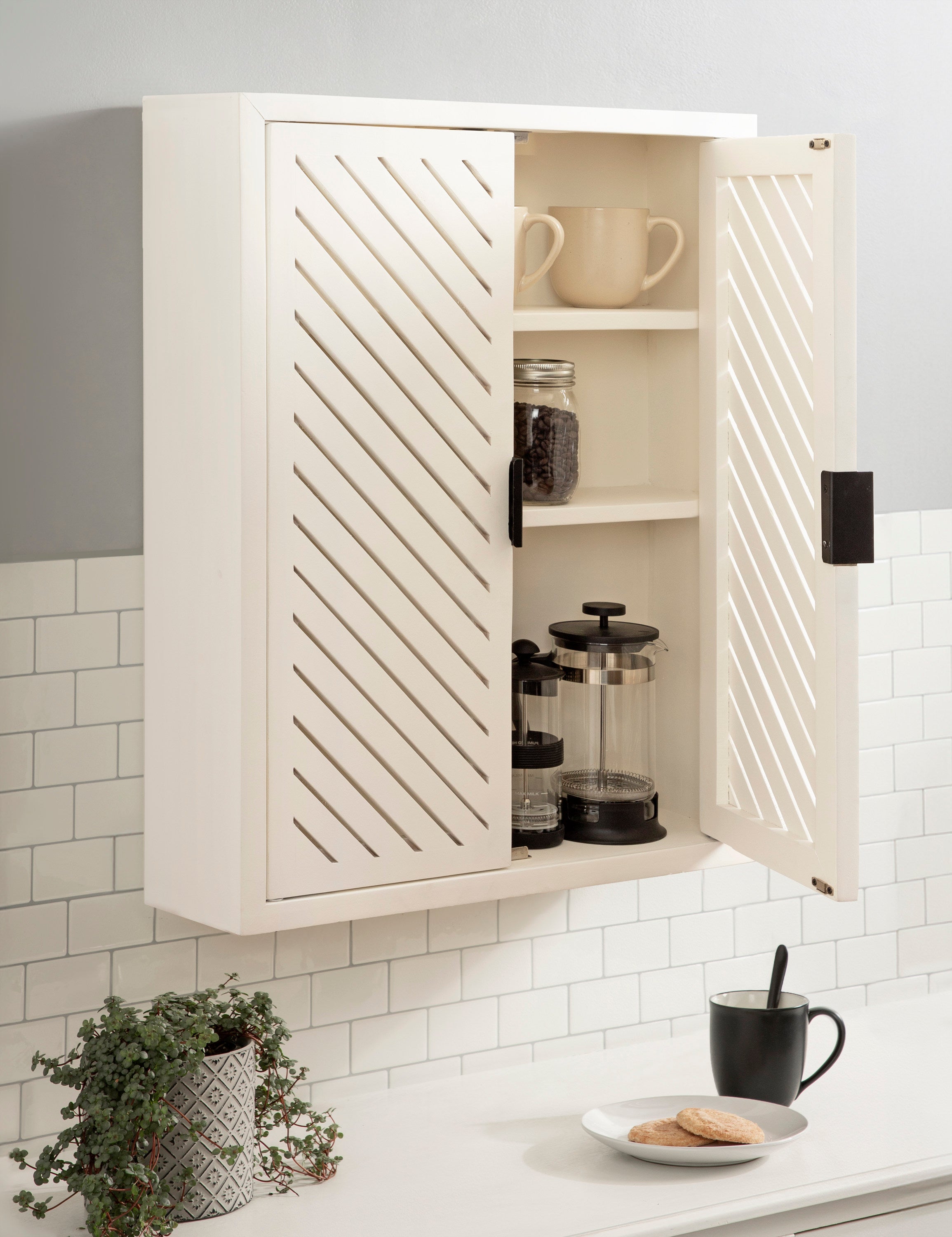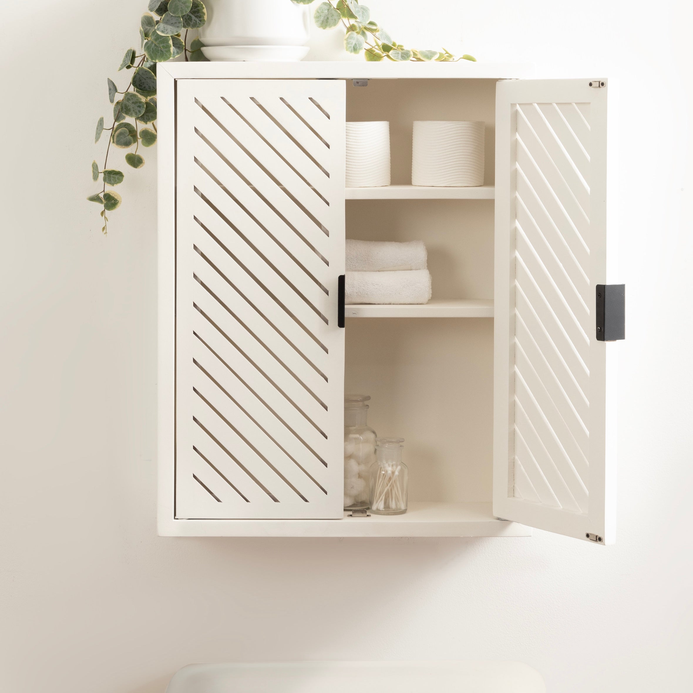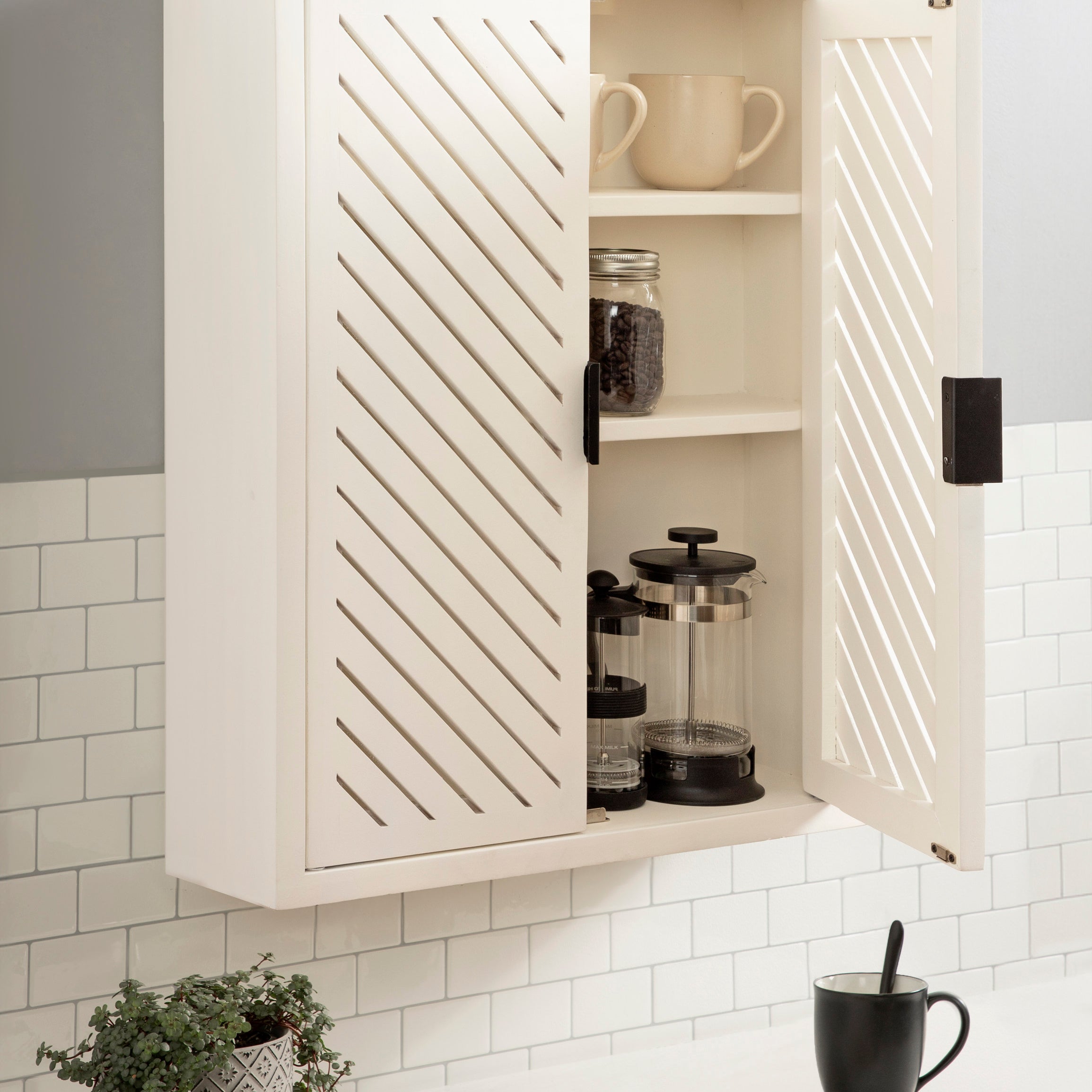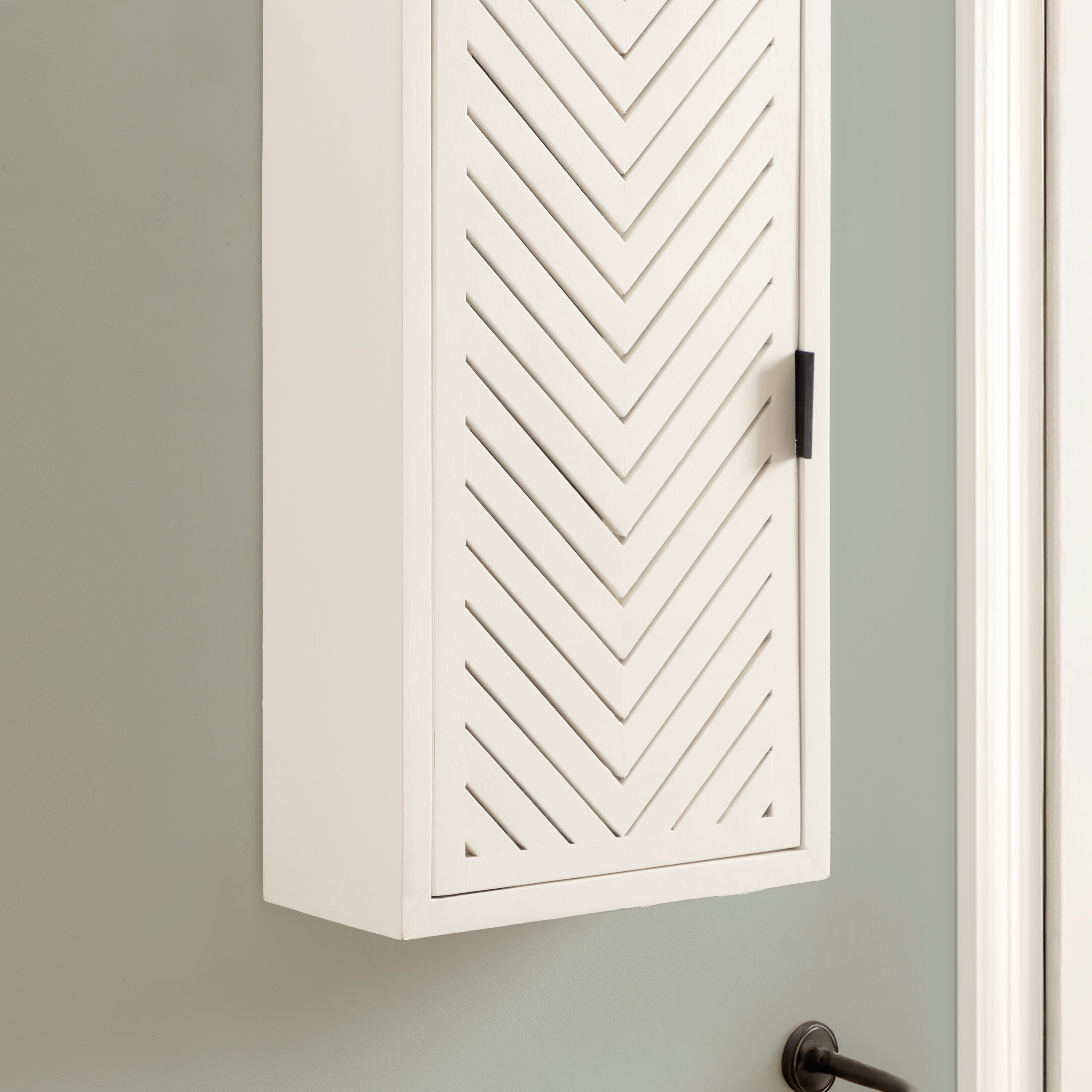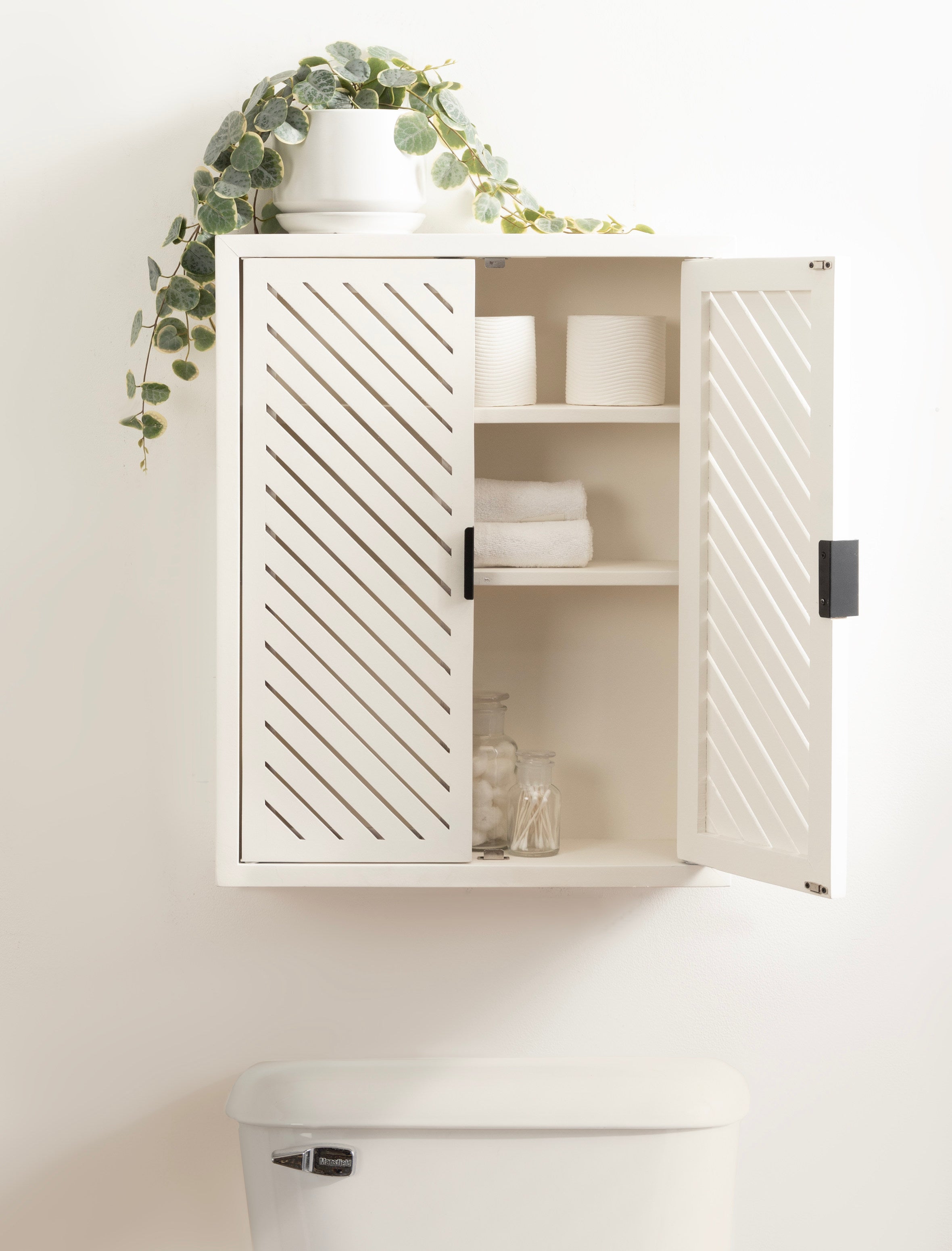 Store bathroom items, kitchen must-haves, small books, and more in this organic modern-inspired wall cabinet from Kate and Laurel. The Mezzeta cabinet has a mango wood composition, constructed in India by artisans and crafted by hand to give it a one-of-a-kind look and construction. The chevron arrows and black metal pulls also elevate this minimal modern design to blend into any boho decor. The Mezzeta cabinet is fantastic for housing your books, towels, and other everyday essentials, or you can use it as a functional space for small plates, mugs, and cups. Due to its size, the Mezzeta wall cabinet is perfect for use in a bedroom, living room, or bathroom as extra above-toilet storage. Your items will be secure thanks to the doors kept closed by magnetic clasps. The Mezzeta wall cabinet hangs on your wall in a matter of seconds, thanks to the metal Z-brackets that are securely attached to the back of the wooden frame.