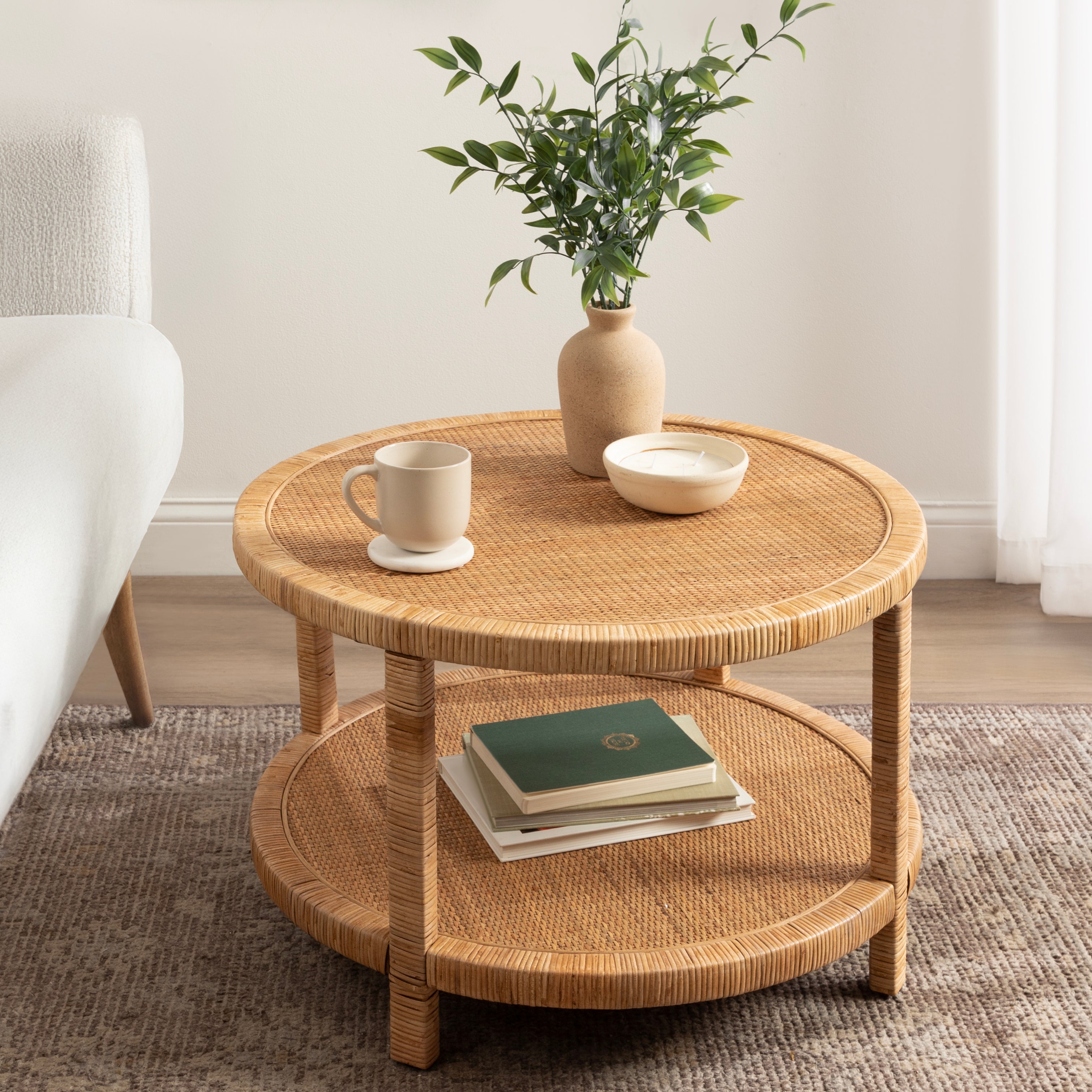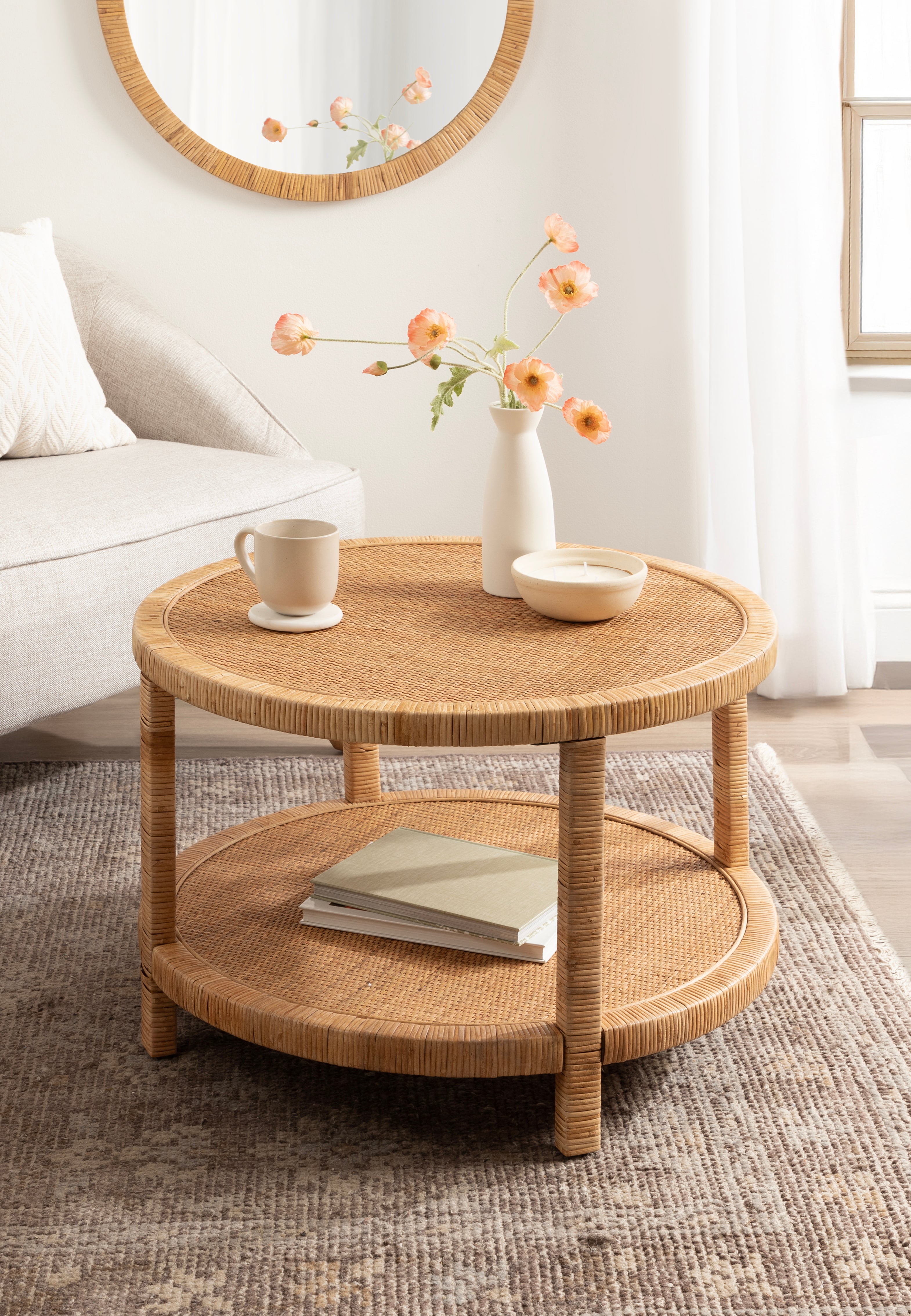 Add a charming accent to your home with this Rafina rattan coffee table. Between its rattan-wrapped table legs and round tabletop, the table serves as the most delightful living room display accent. Crafted from premium materials, this table features high-quality natural cane wrapping for a boho rattan table look. The Rafina is the optimal coffee table for your living room or another large living area. Perfect for a beach house or vacation home, this coastal table perfectly accentuates your beachy decor. With its unique design, this coastal coffee table comes with a very simple three-step assembly, so you can start enjoying and decorating it at once. The table's tiered design provides you with plenty of storage options. Complete your living room or bedroom decor scheme with this boho decor piece.