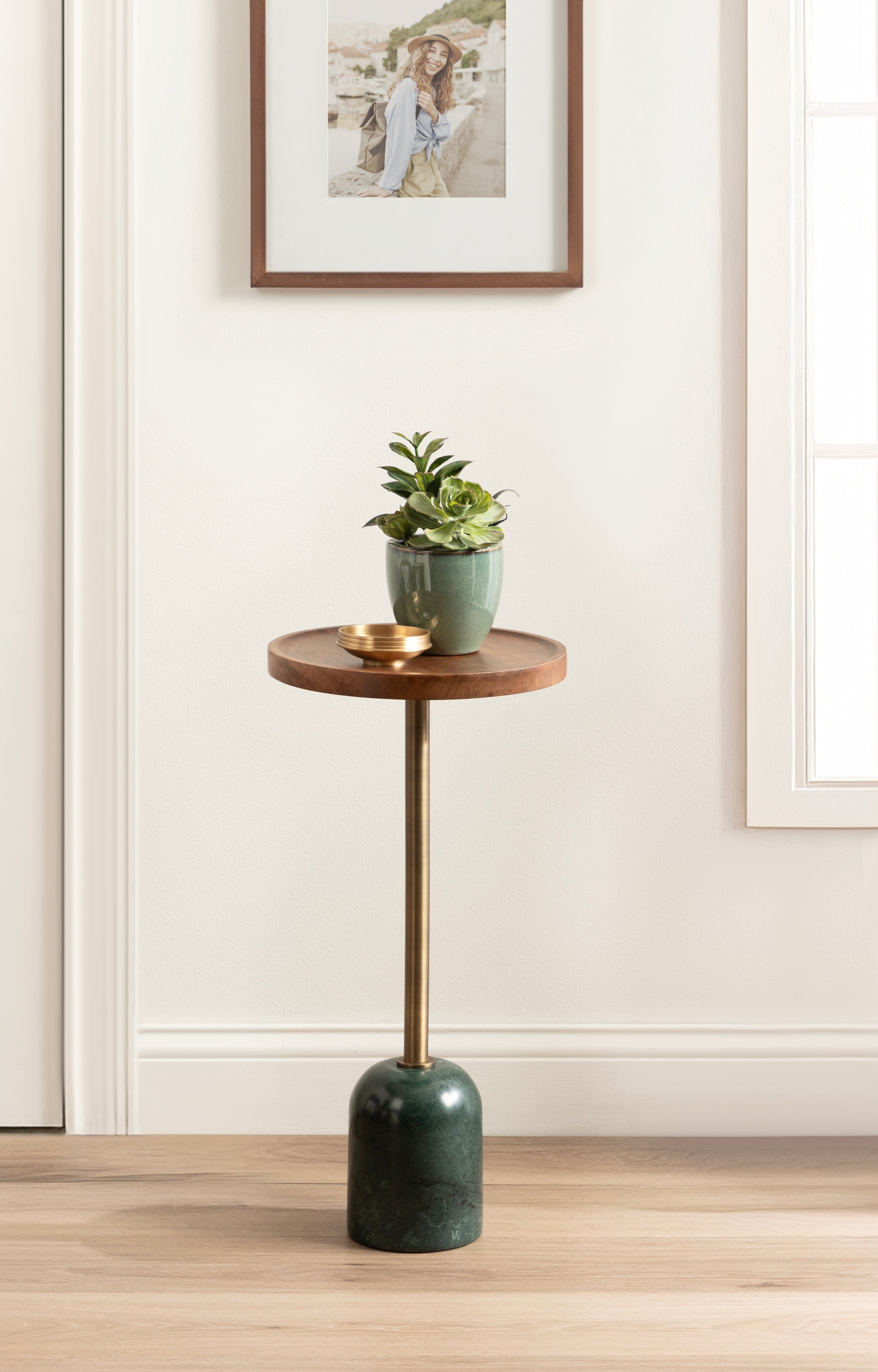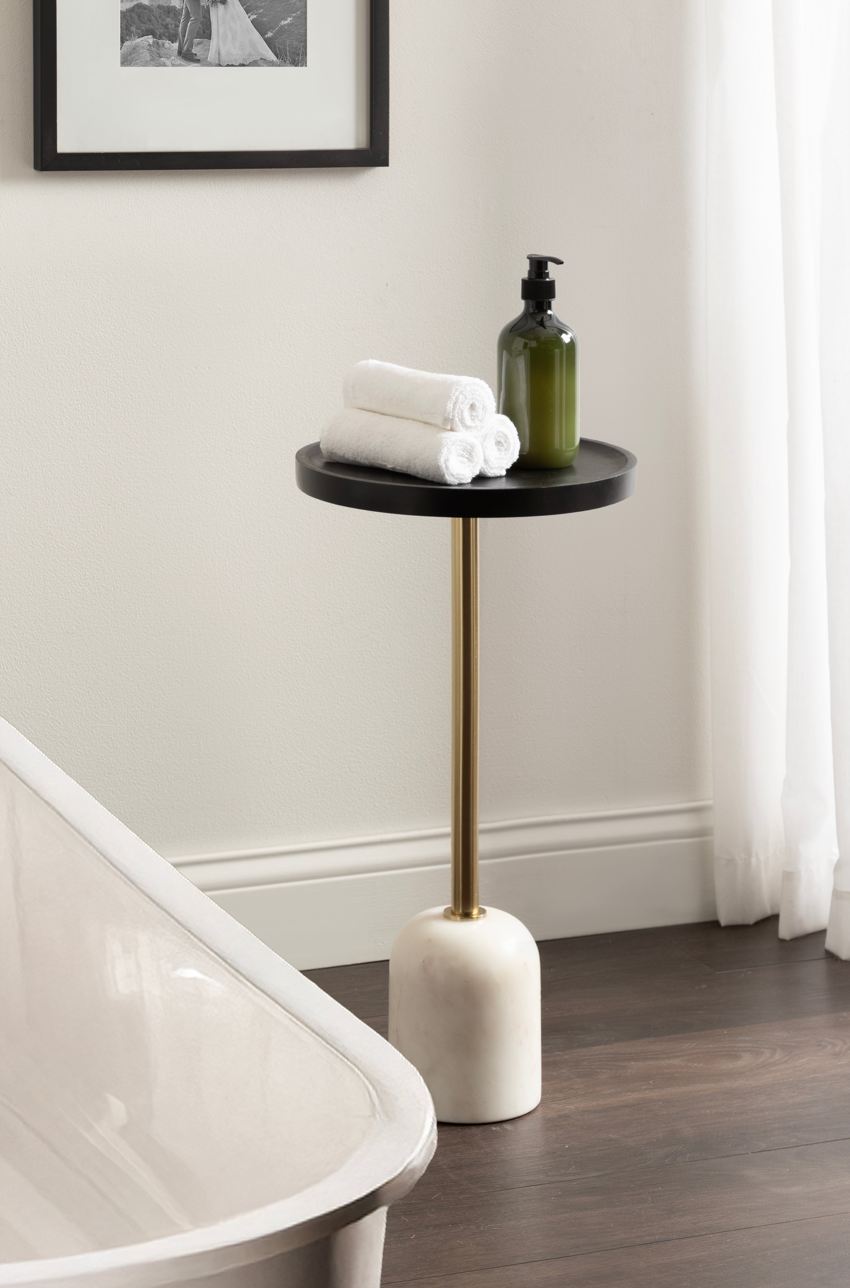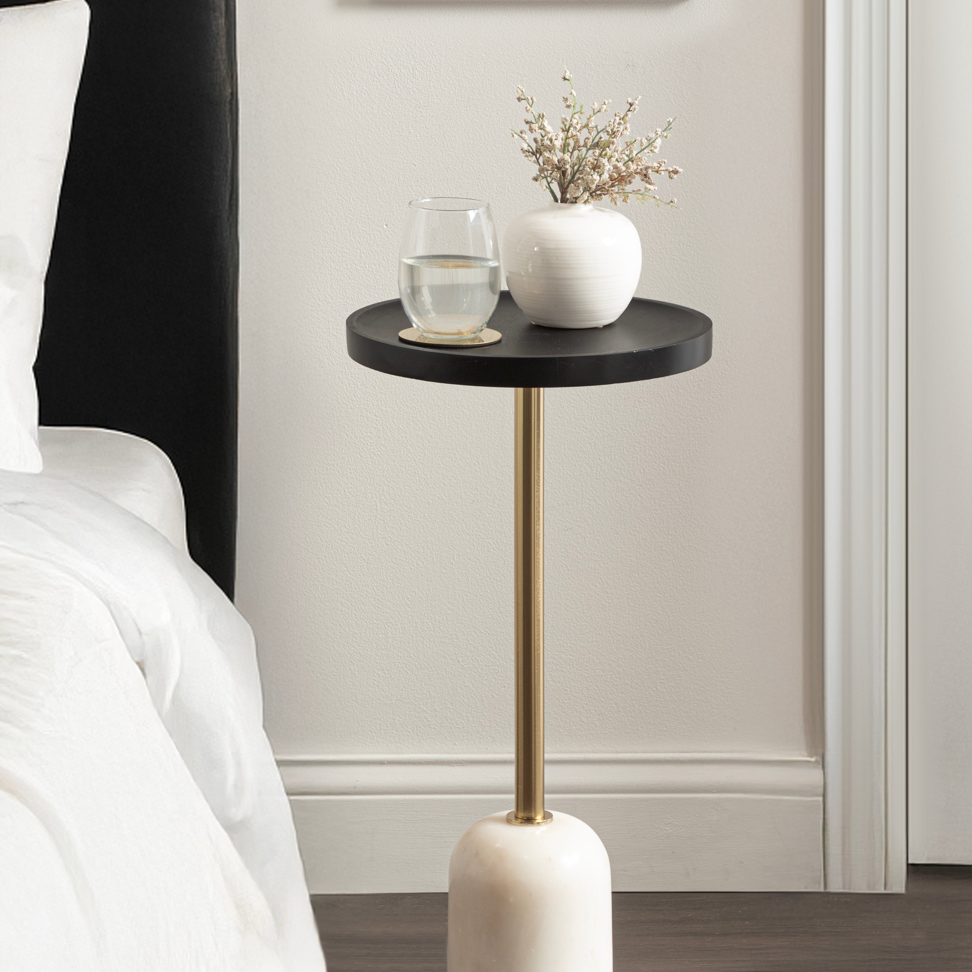 Design the minimal and modern space of your dreams by incorporating the Shorrock side table into your decor. Inspired by contemporary design, this table features a pedestal look, a round tabletop, and a fun, shaped base. The tabletop is crafted from solid mango wood with a rich marble stone base, while the base is crafted from resilient iron. Each Shorrock table is handcrafted in India, giving each piece its distinct woodgrain and marble veining. This edition of the Shorrock side table features a variety of finishes, providing a transitional aesthetic that works in various decor scenes. This stunning small side table is a fabulous way to get the conversation going and showcase your effortlessly elegant style in your favorite room. When your new table arrives, it takes a matter of minutes to put together with the convenient no-tools two-step assembly instructions.