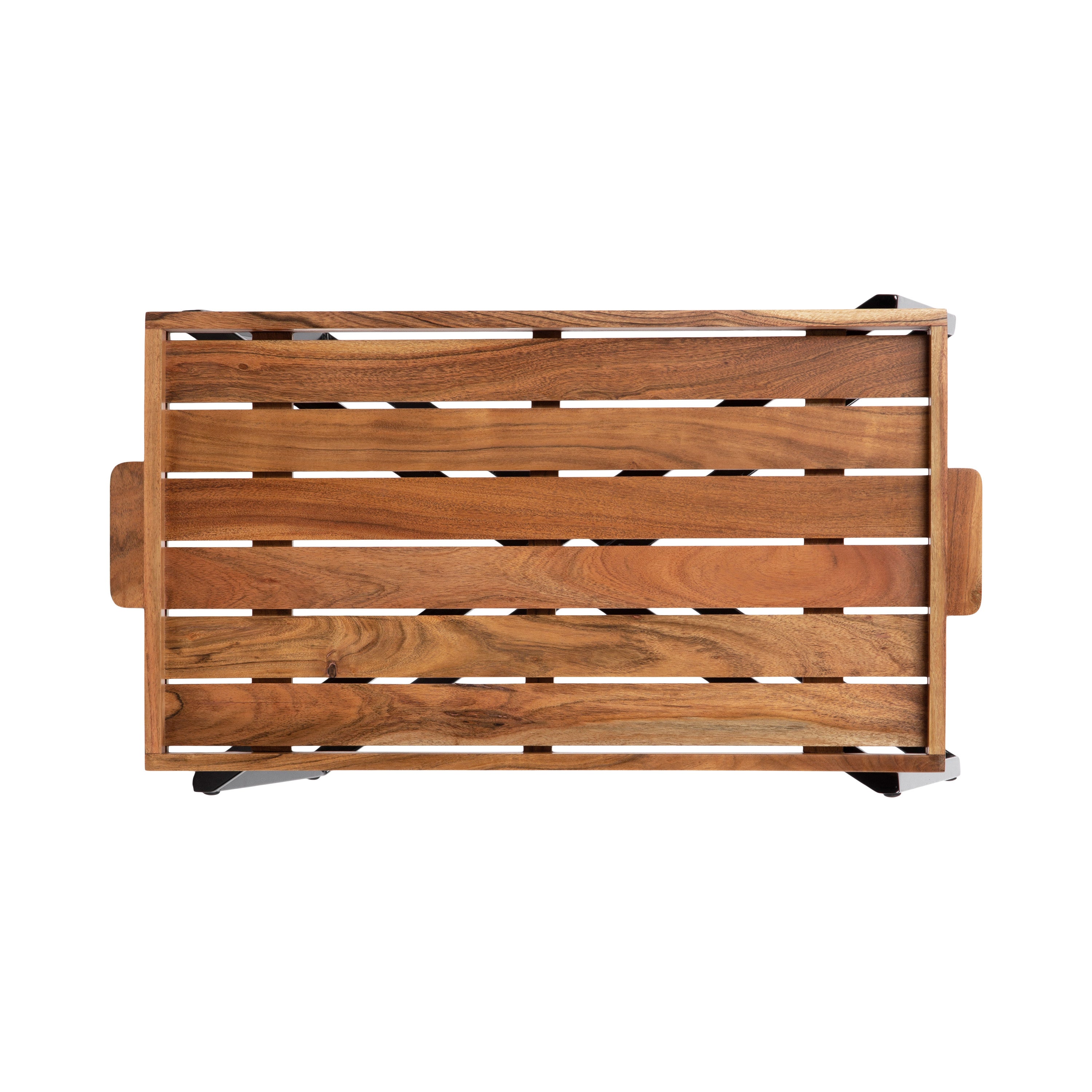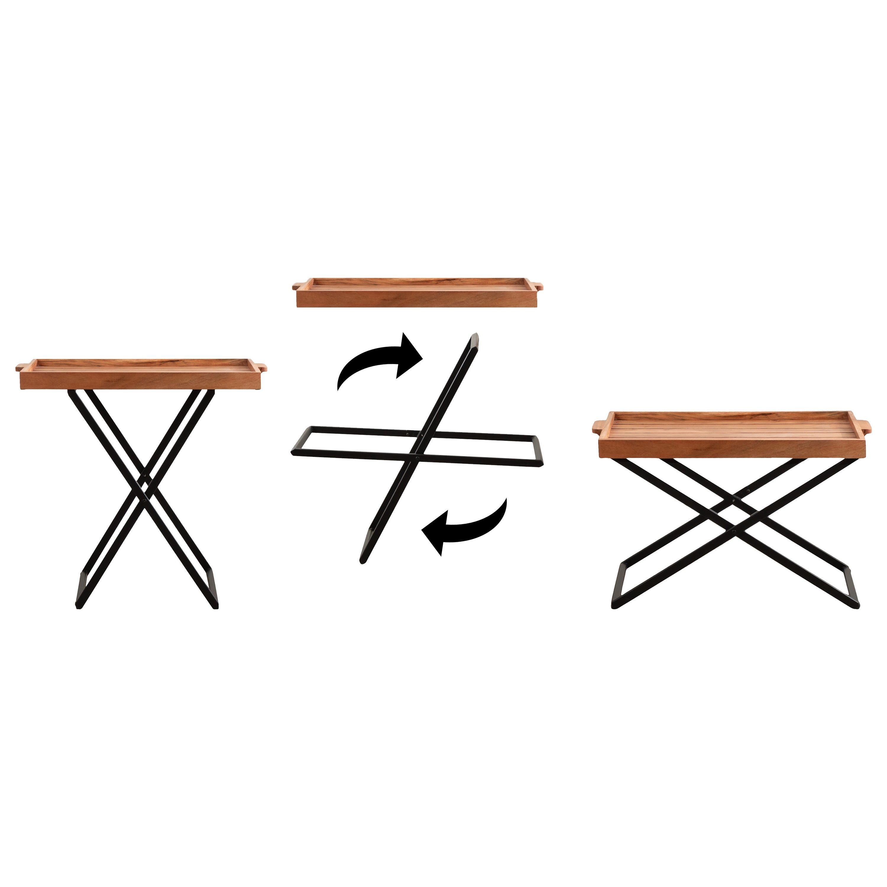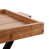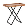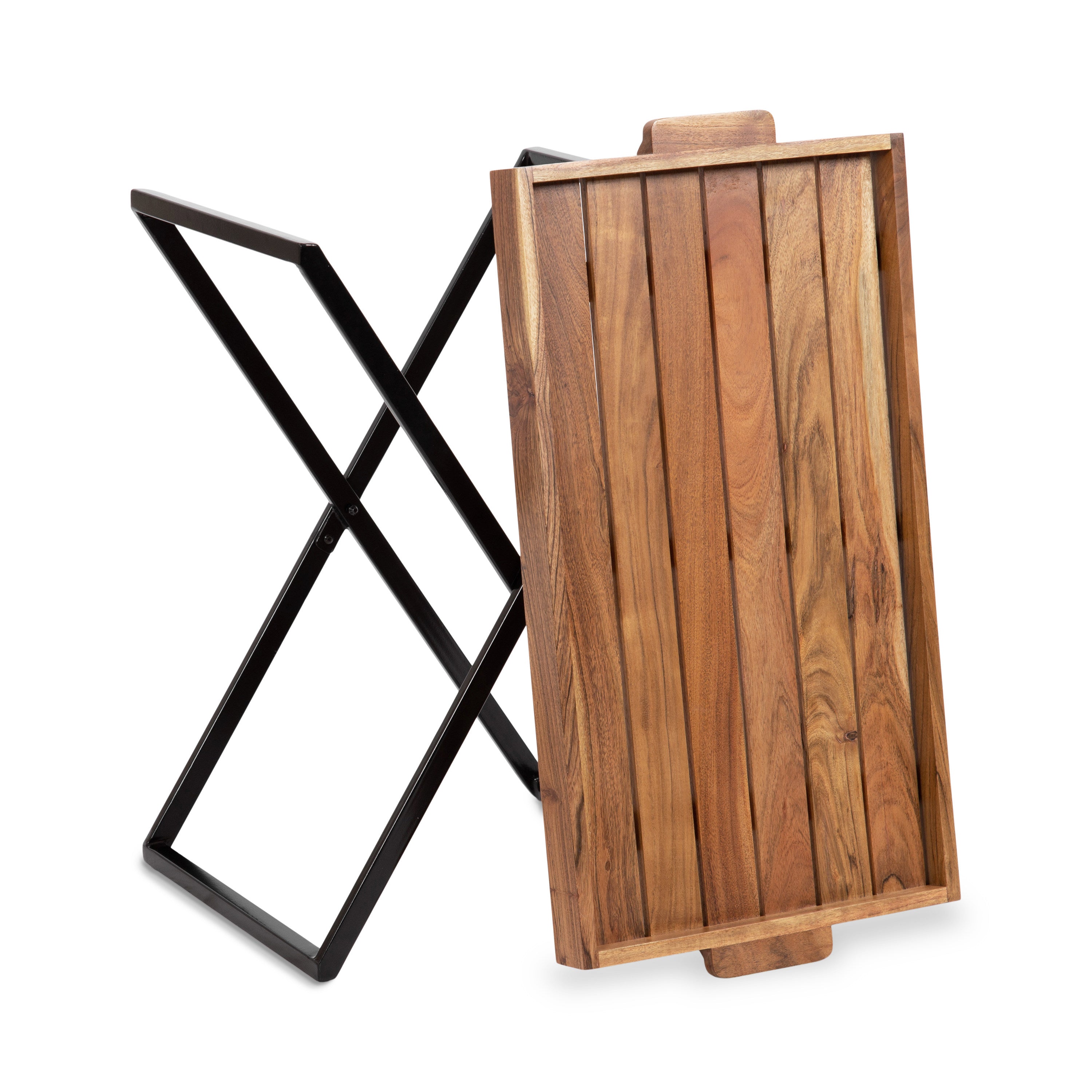 There's a lot to love with the Monaco tray table: it combines modern mixed materials design with functional practicality. The Monaco tray table draws inspiration from farmhouse design for a unique, transitional home decor aesthetic. Its acacia wood surface and charming finish make it a one-of-a-kind statement piece for any room in your home or even outdoors. Remove the tray for easy transport using the stylish yet functional handles. Also, the metal base can be used vertically or horizontally, so you can use it for different heights and purposes throughout your home or outside patio. The taller height (27.75 inches) is great for serving food on the tabletop, while the shorter orientation (18.75 inches) can be used as a coffee table or side table. This table is rated for both indoor and outdoor use, so you can find a multitude of uses for it.