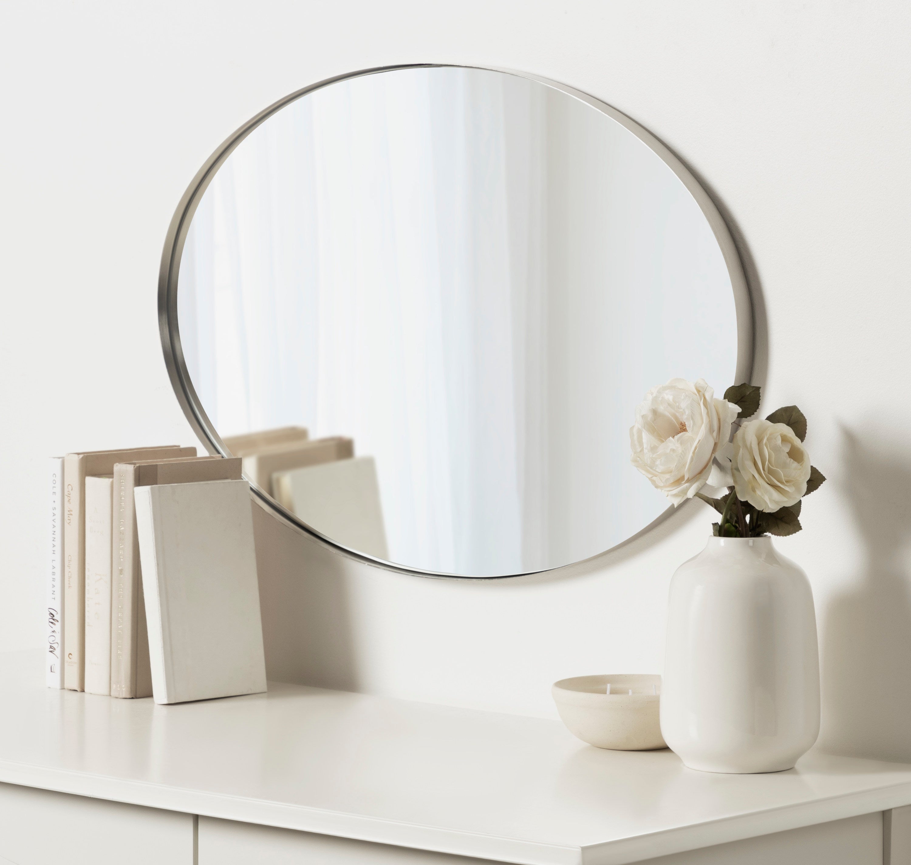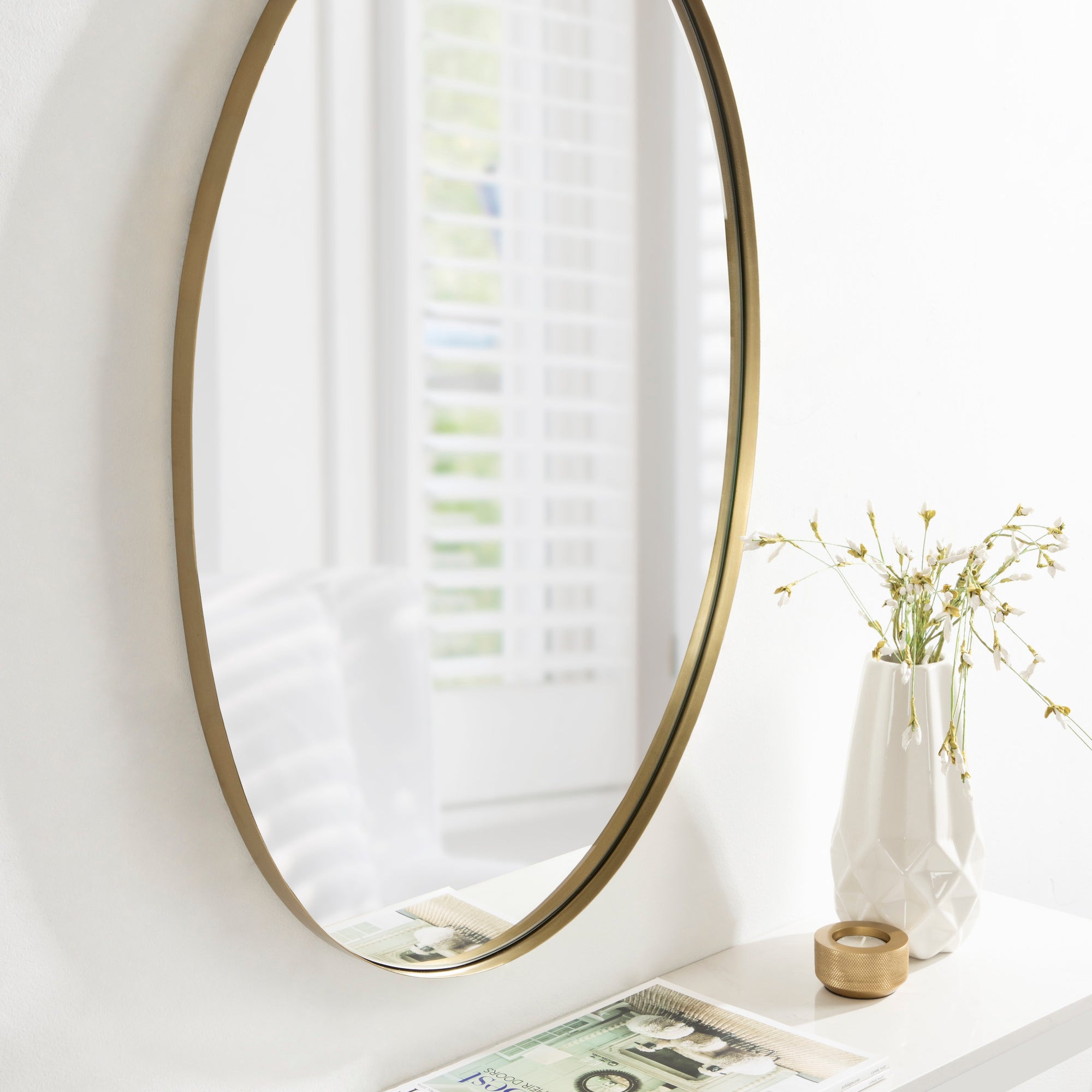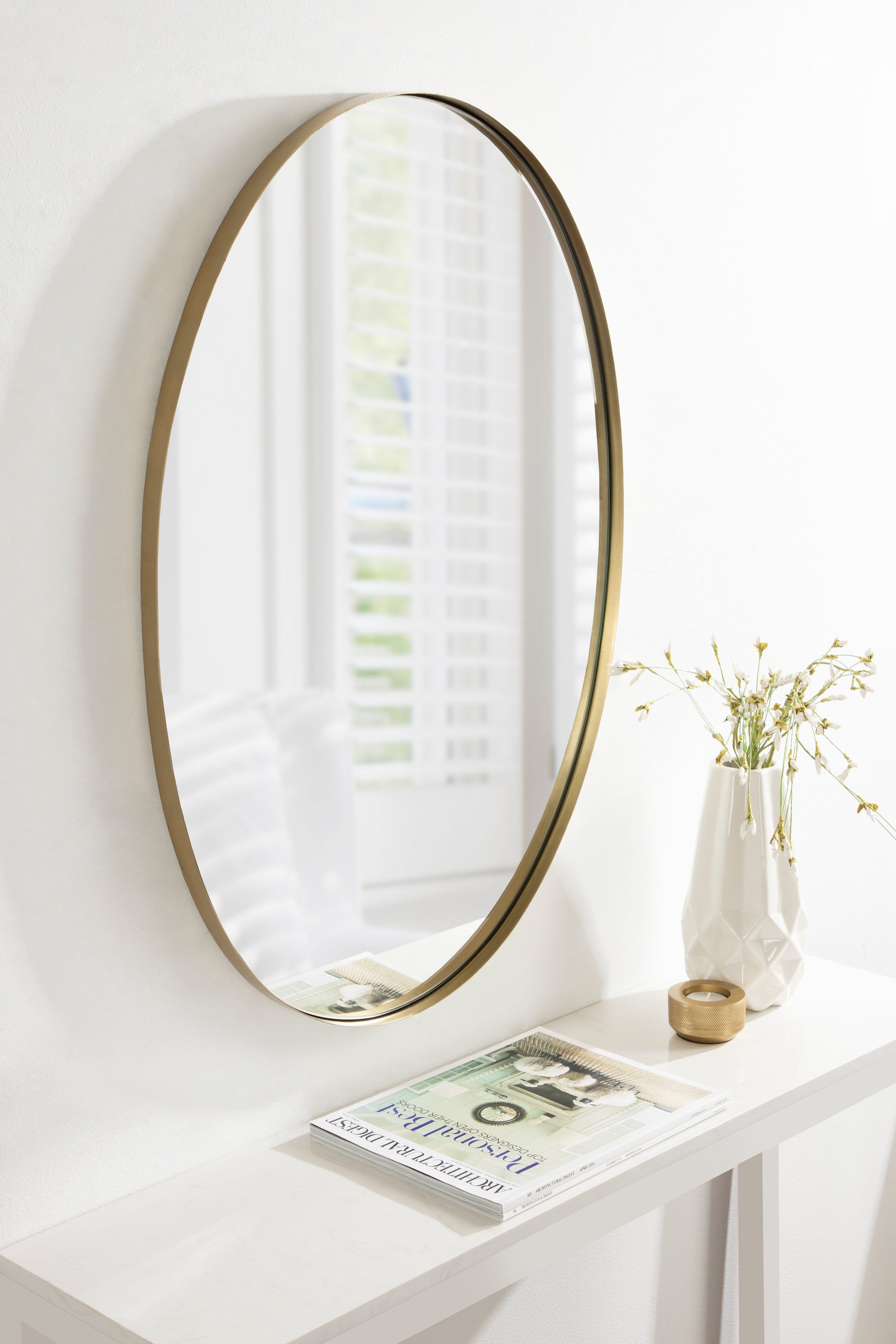 Create a cohesive decorative aesthetic with the beautiful Rollo mirror. Inspired by modern design, this mirror has a geometric design with an oval shape and a beautiful finish. It makes a bold impression in every room, enhancing the depth and vibrancy of the space. Use it as a decorative focal point to unify your decor or use it as a bathroom mirror above your vanity.