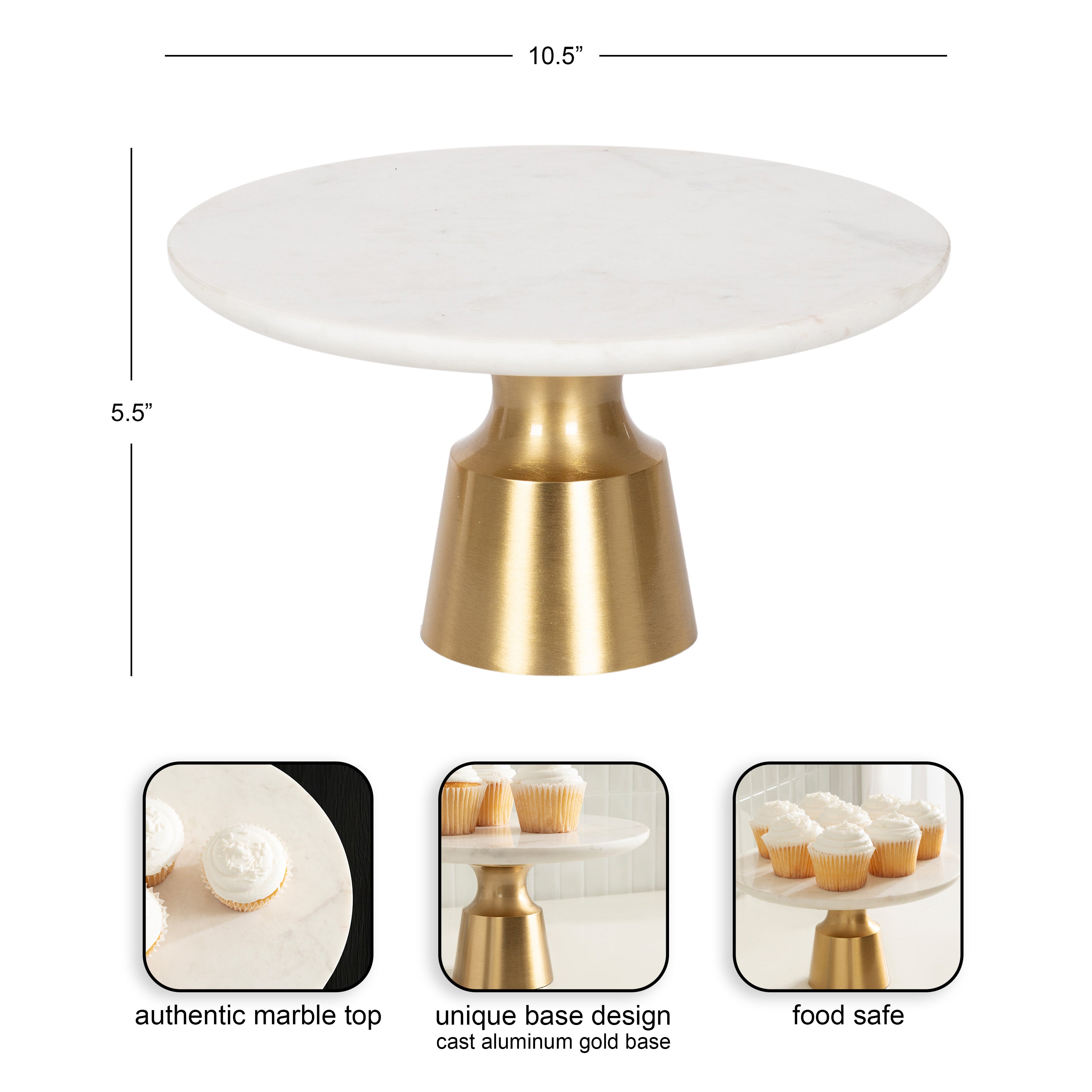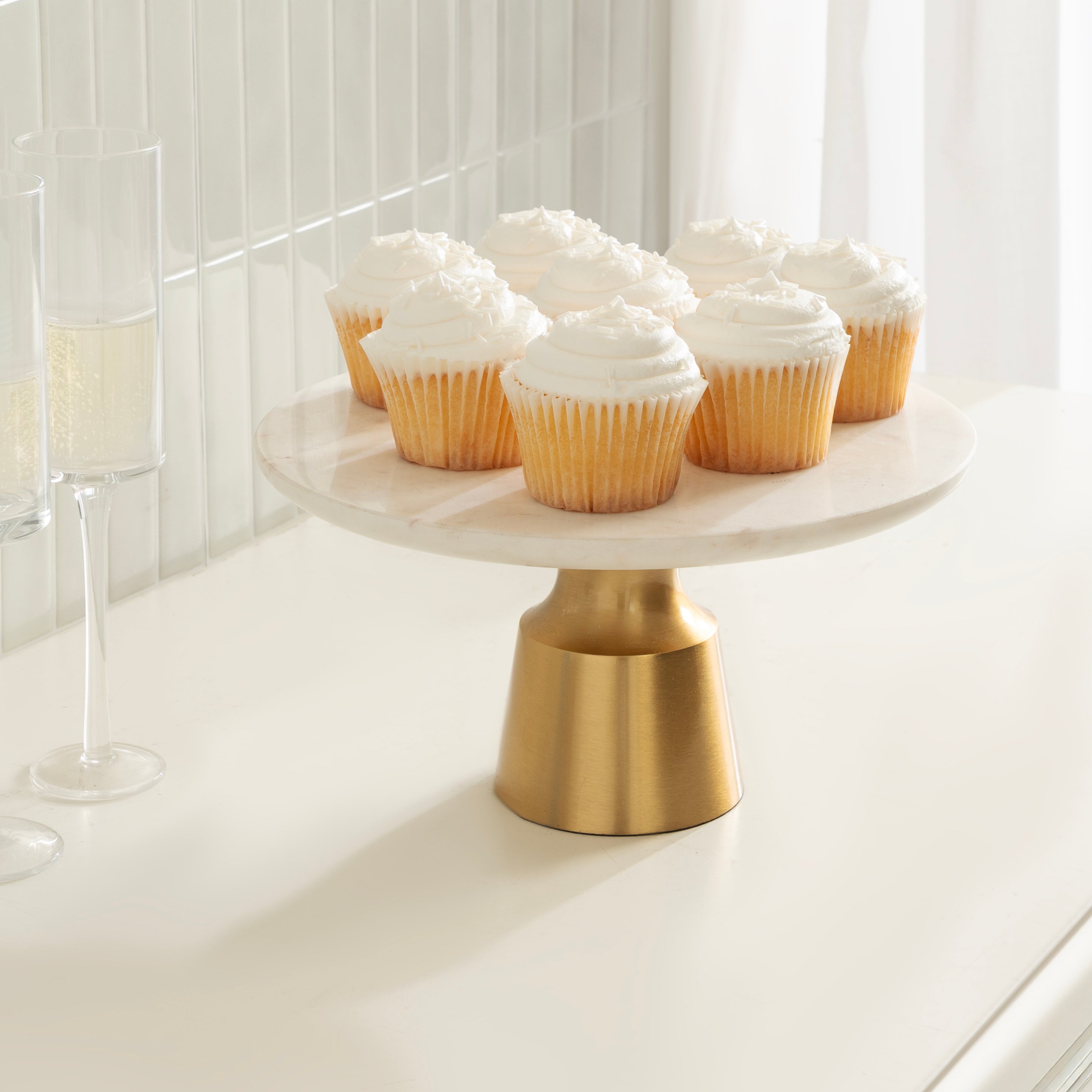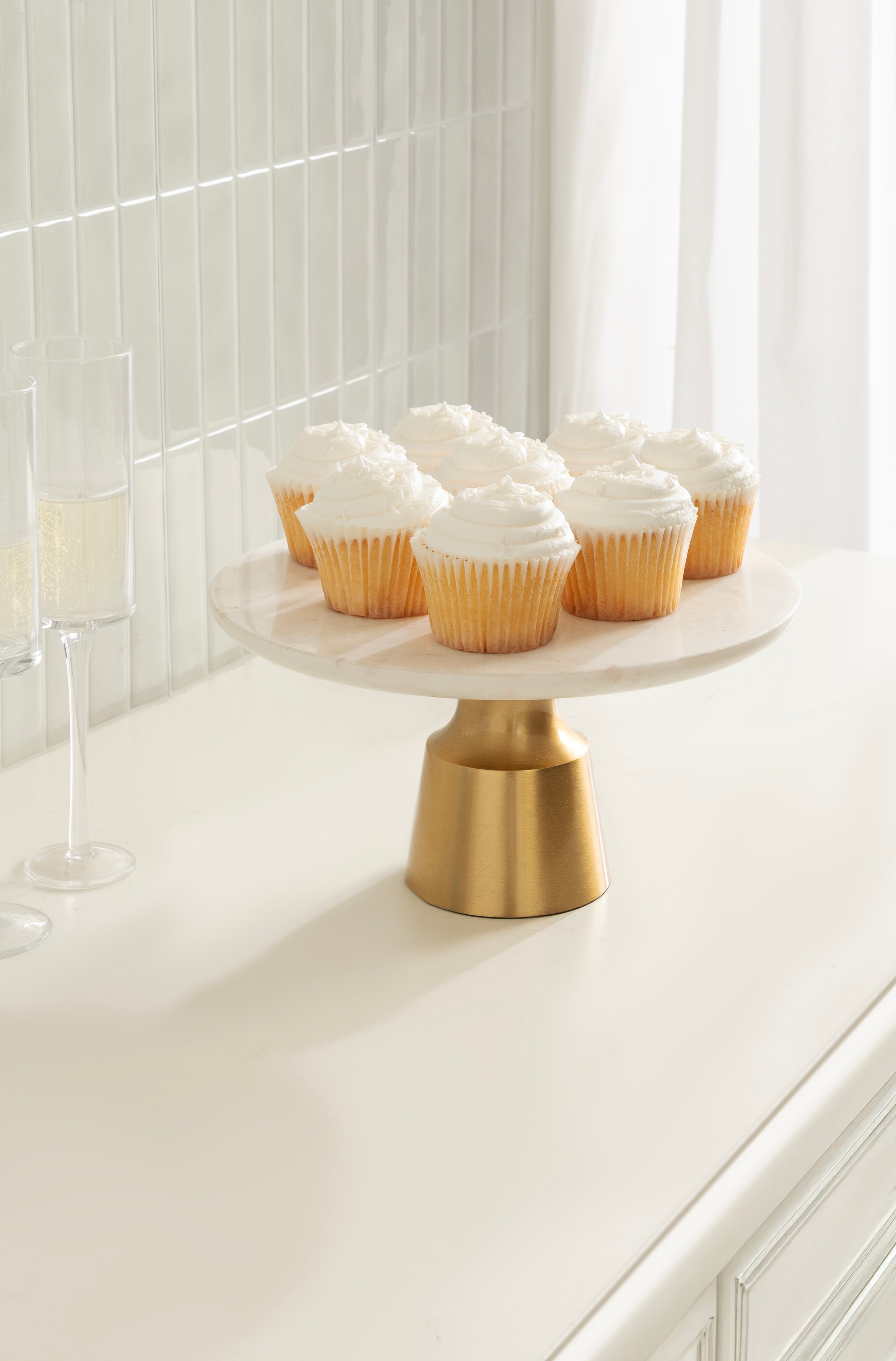 Create a vision of modern design with the Anjana marble cake stand. Inspired by glam aesthetics, this beautiful tray features a sleek design with a round shape and premium finishes. The Anjana is crafted from authentic marble with a sturdy sculptural metal base, making it a resilient display piece that is meant to last for multiple years. This versatile surface area allows this cake stand to also serve other purposes across multiple rooms: use it as a charming table centerpiece, a decorative nightstand tray, or a storage catch-all for perfume and jewelry on your vanity. The metal base creates an attractive pedestal tray look to easily and literally elevate your space! Even better, the Anjana is perfect for any of your wood, metal, or marble surfaces with protective padding attached to the bottom.