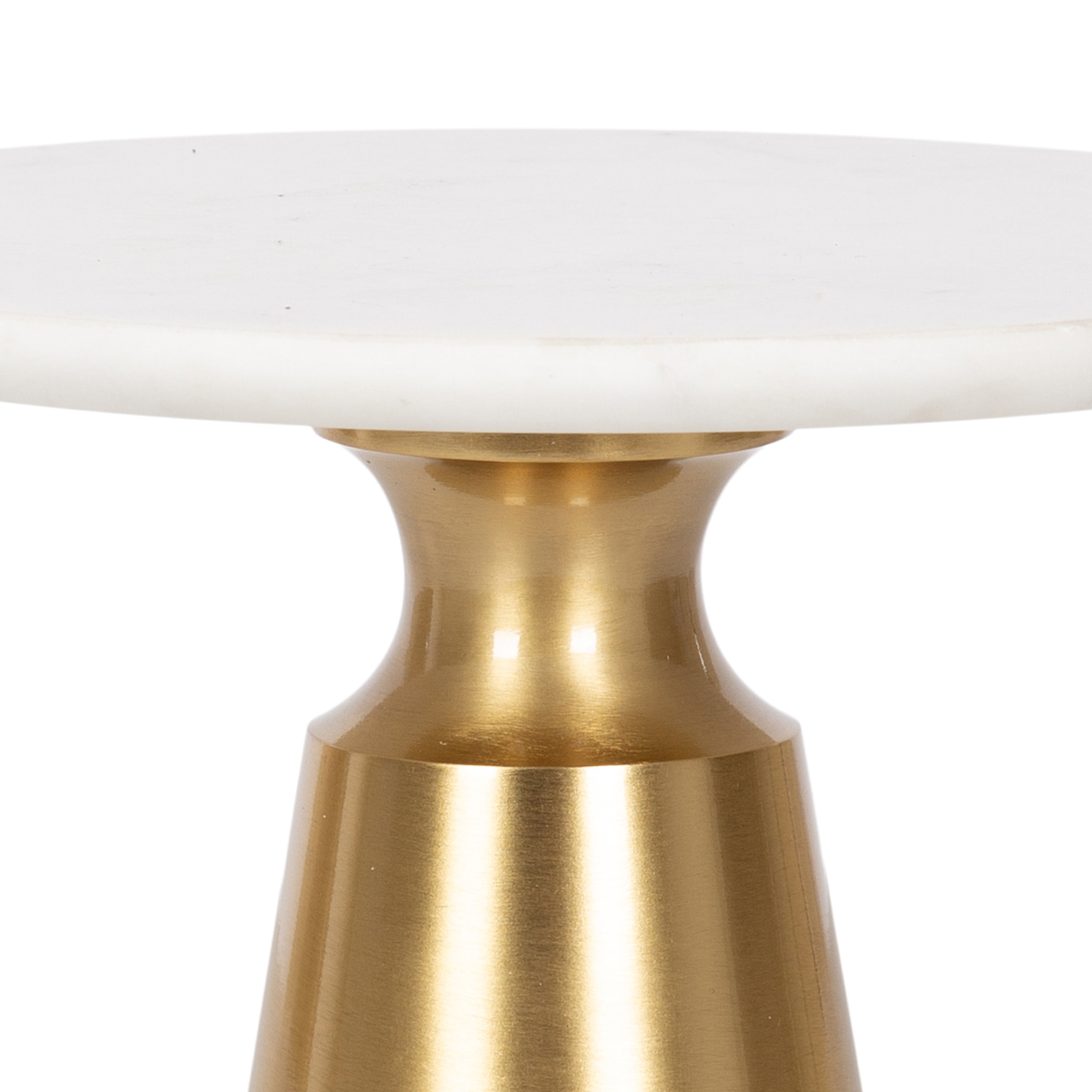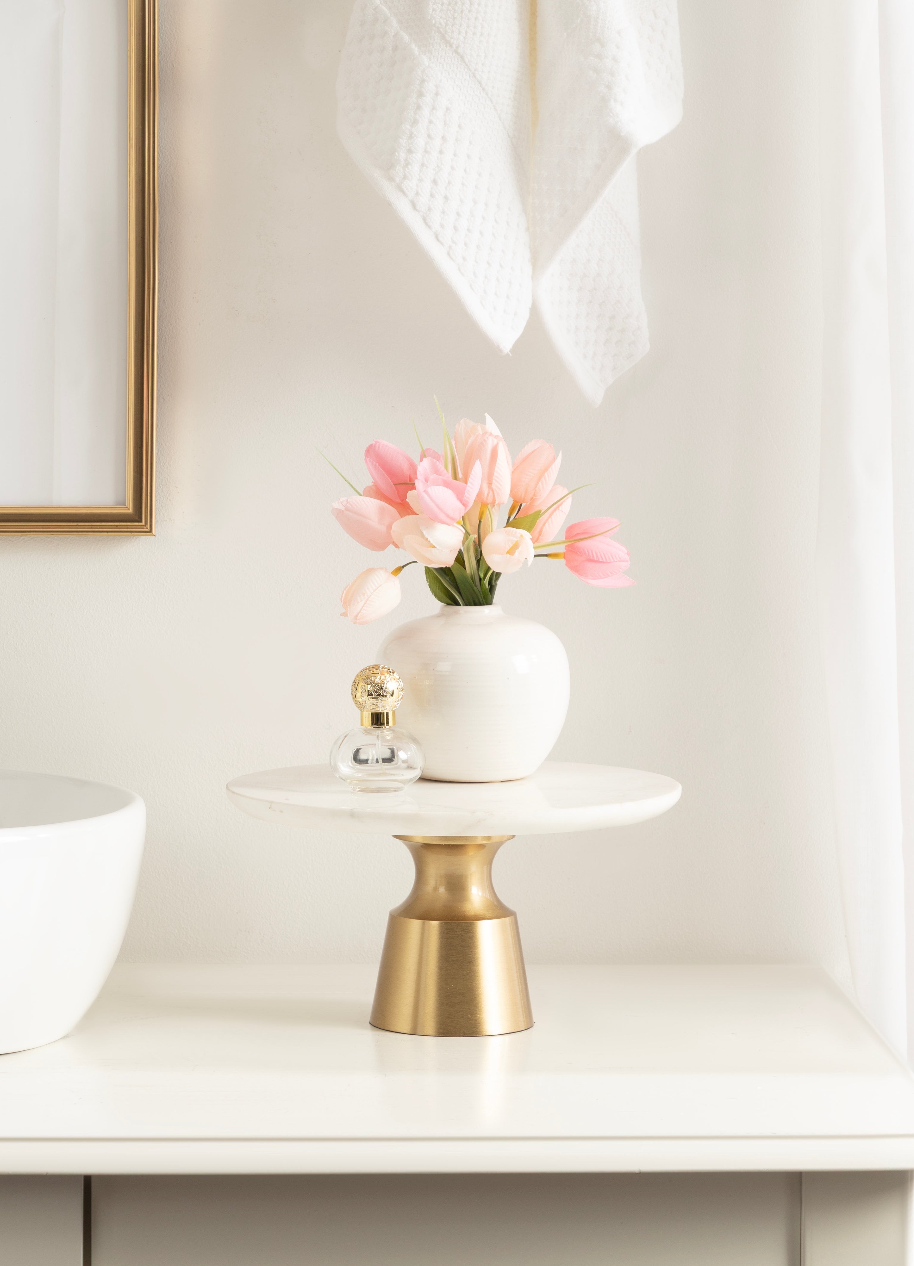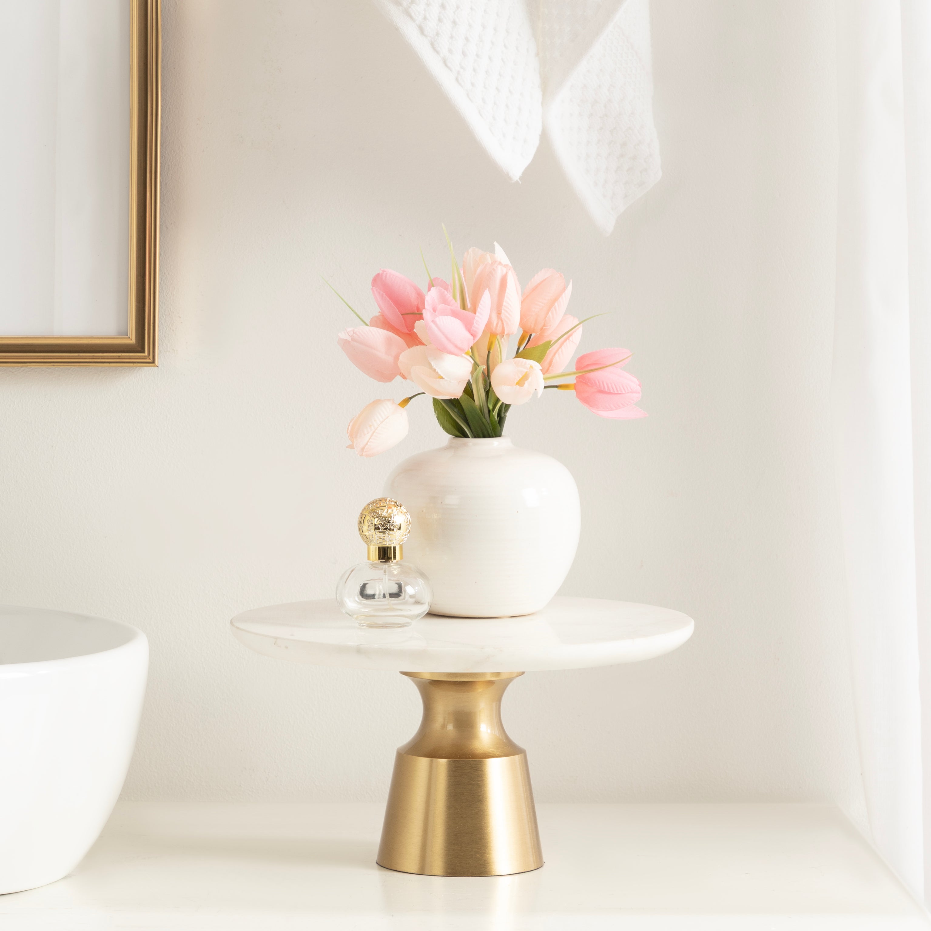 Create a vision of modern design with the Anjana marble cake stand. Inspired by glam aesthetics, this beautiful tray features a sleek design with a round shape and premium finishes. The Anjana is crafted from authentic marble with a sturdy sculptural metal base, making it a resilient display piece that is meant to last for multiple years. This versatile surface area allows this cake stand to also serve other purposes across multiple rooms: use it as a charming table centerpiece, a decorative nightstand tray, or a storage catch-all for perfume and jewelry on your vanity. The metal base creates an attractive pedestal tray look to easily and literally elevate your space! Even better, the Anjana is perfect for any of your wood, metal, or marble surfaces with protective padding attached to the bottom.
