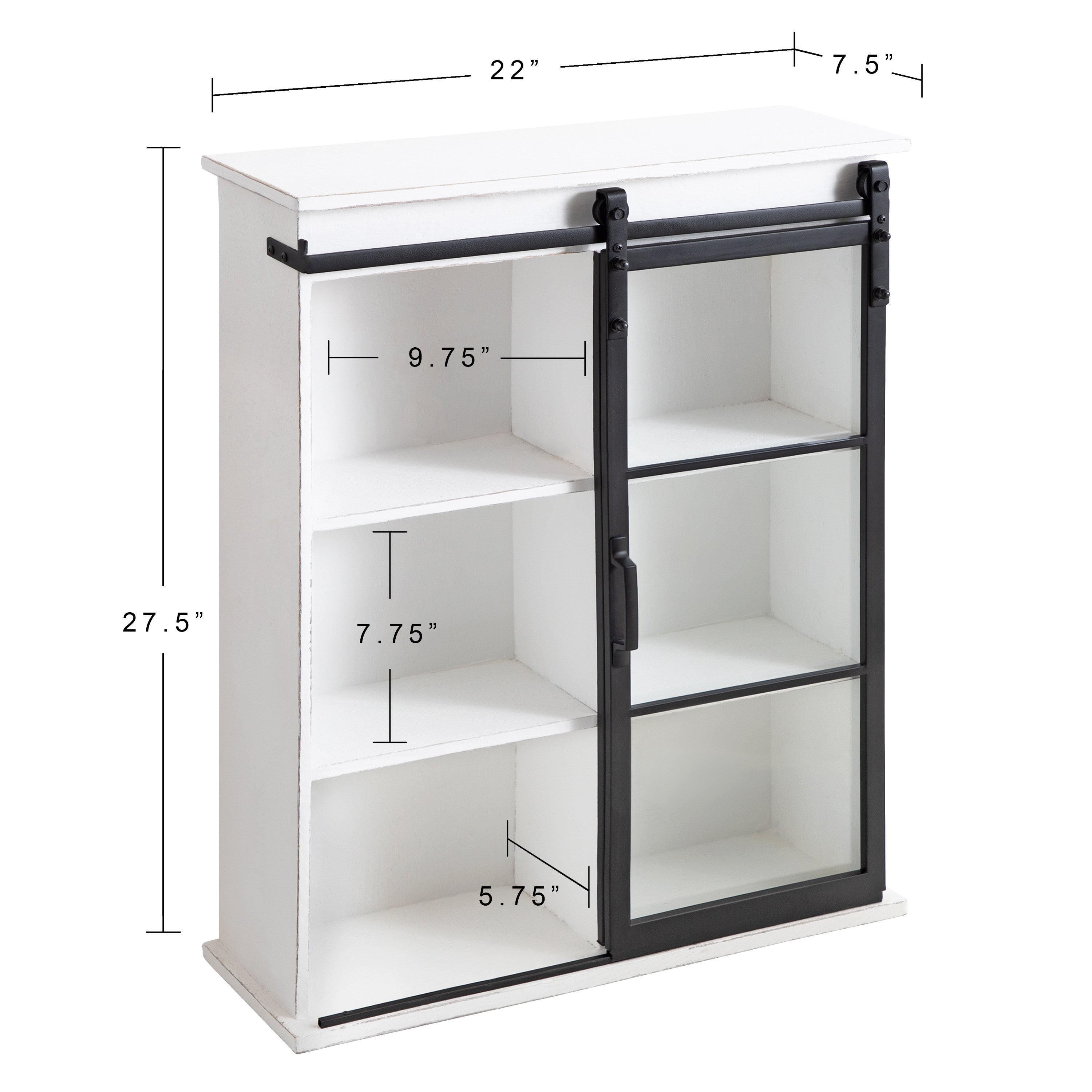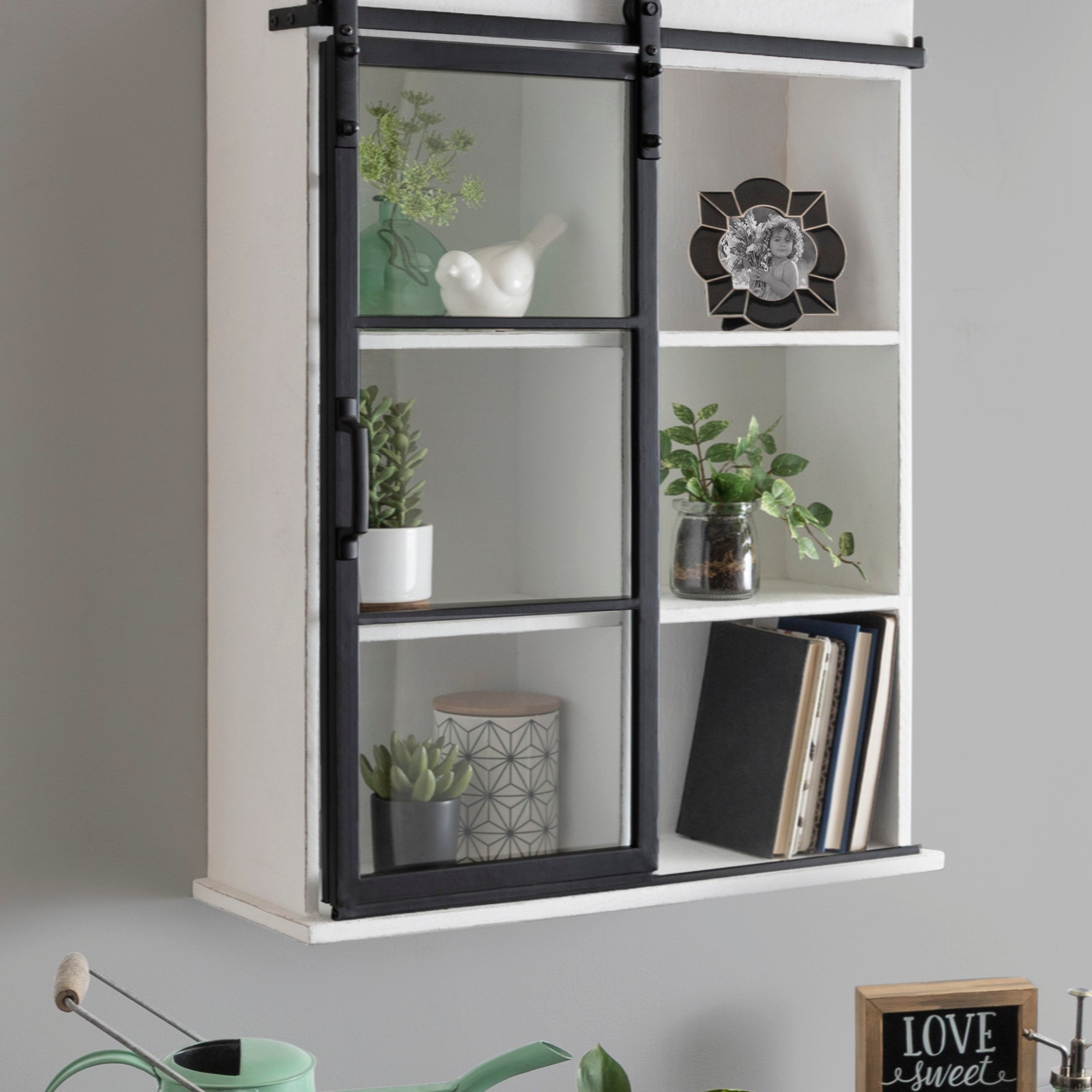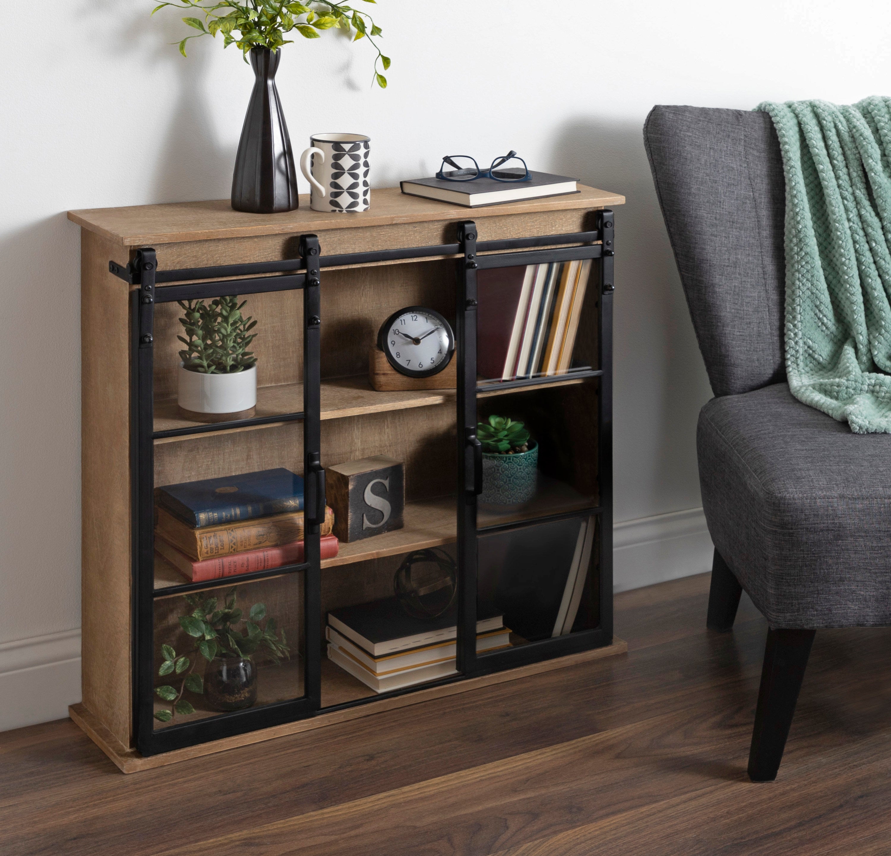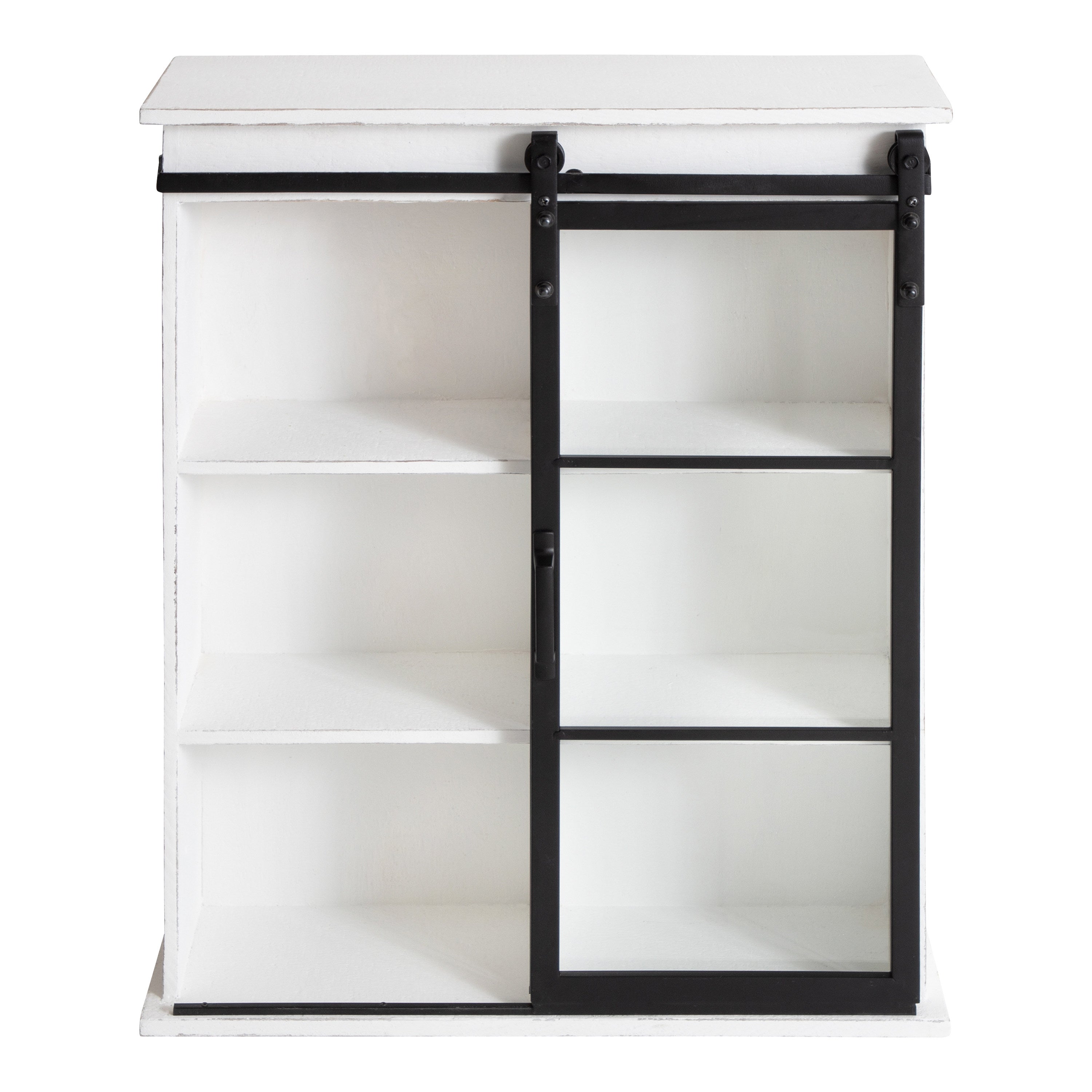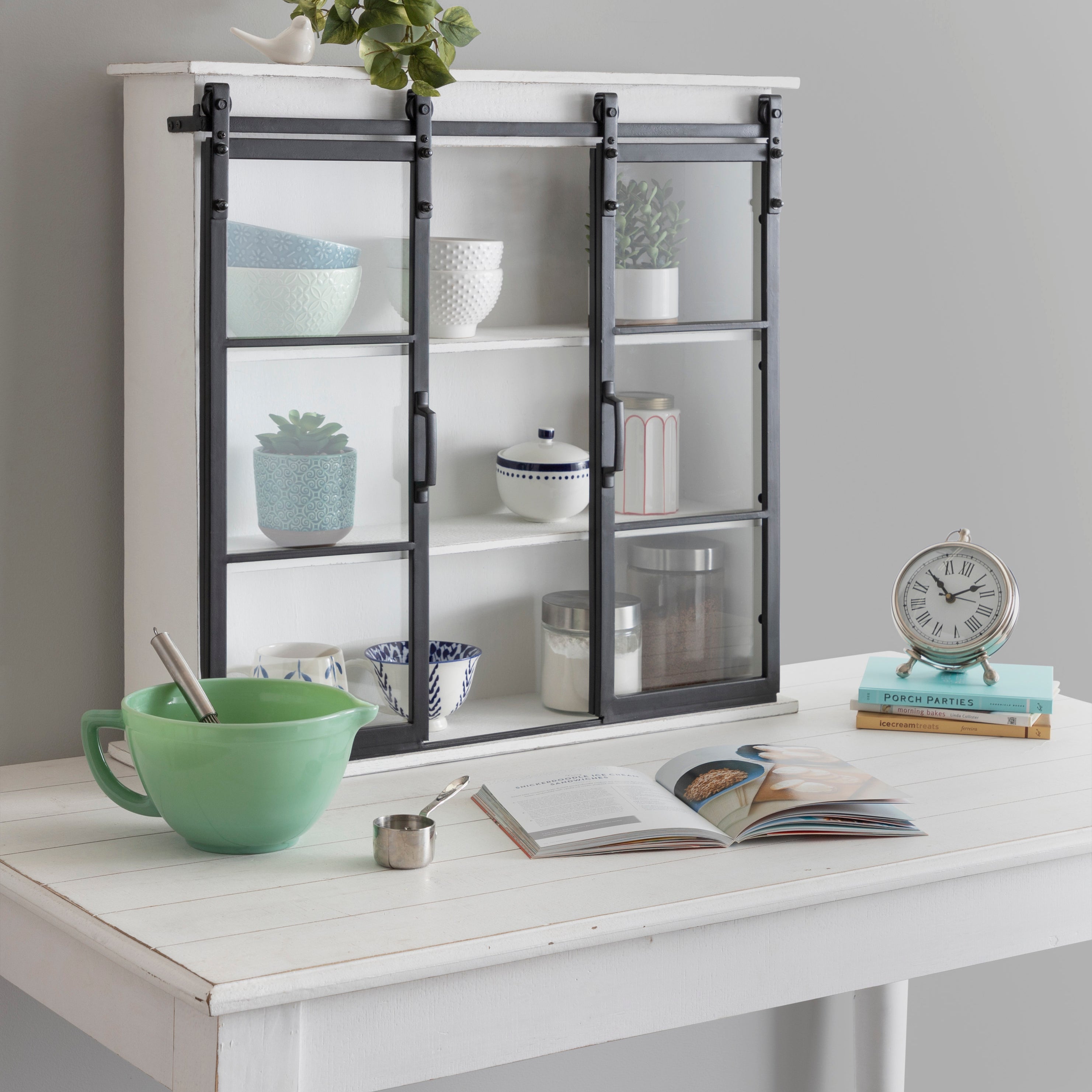 Create a beautiful storage area for your small decor pieces and other household items with the Barnhardt cabinet. This cabinet features shelves and a farmhouse-inspired metal framed glass sliding barndoor, perfect for storage and display. Use this modern farmhouse cabinet to showcase family photos, store spices or mugs, and even store your toiletries as a vanity in your master bathroom.