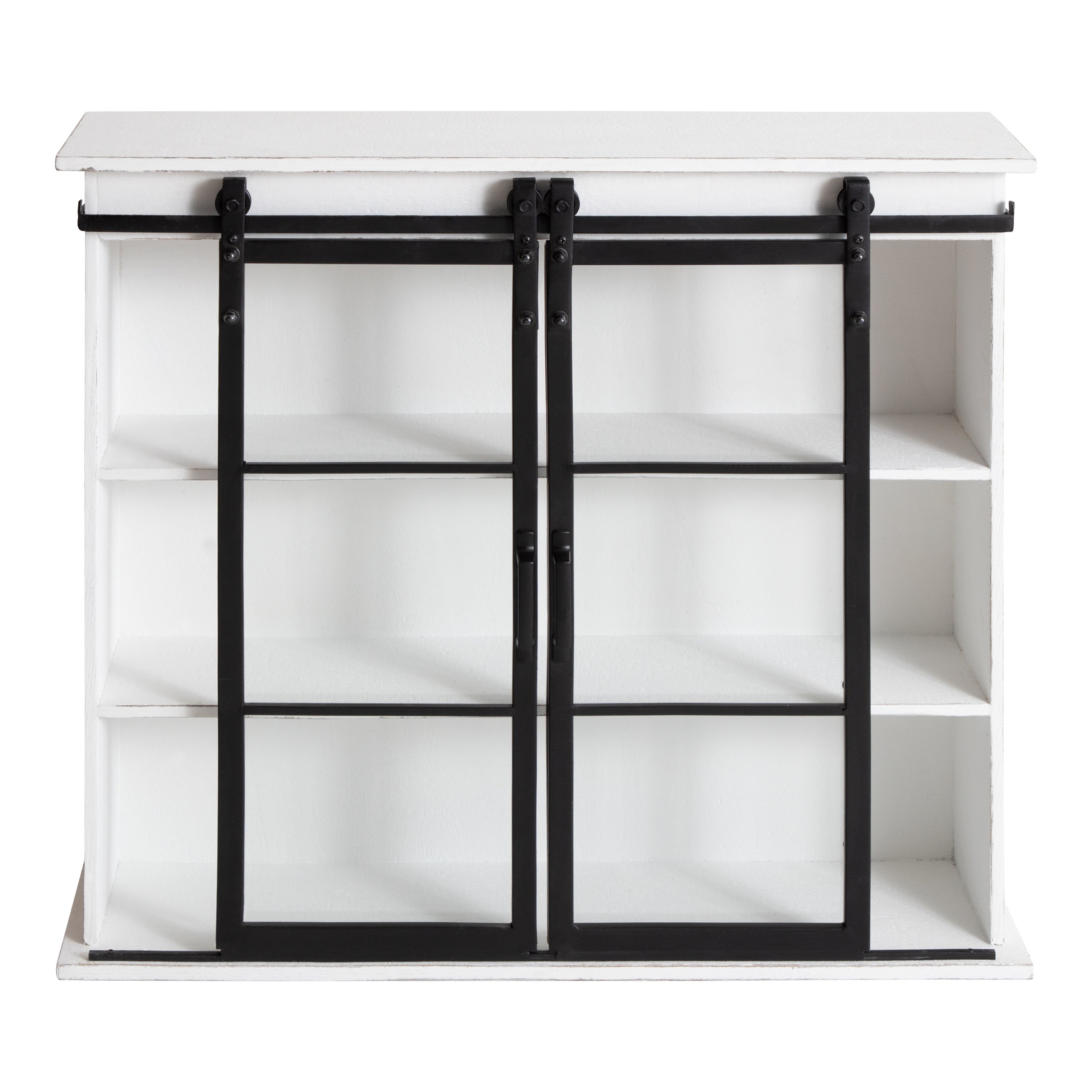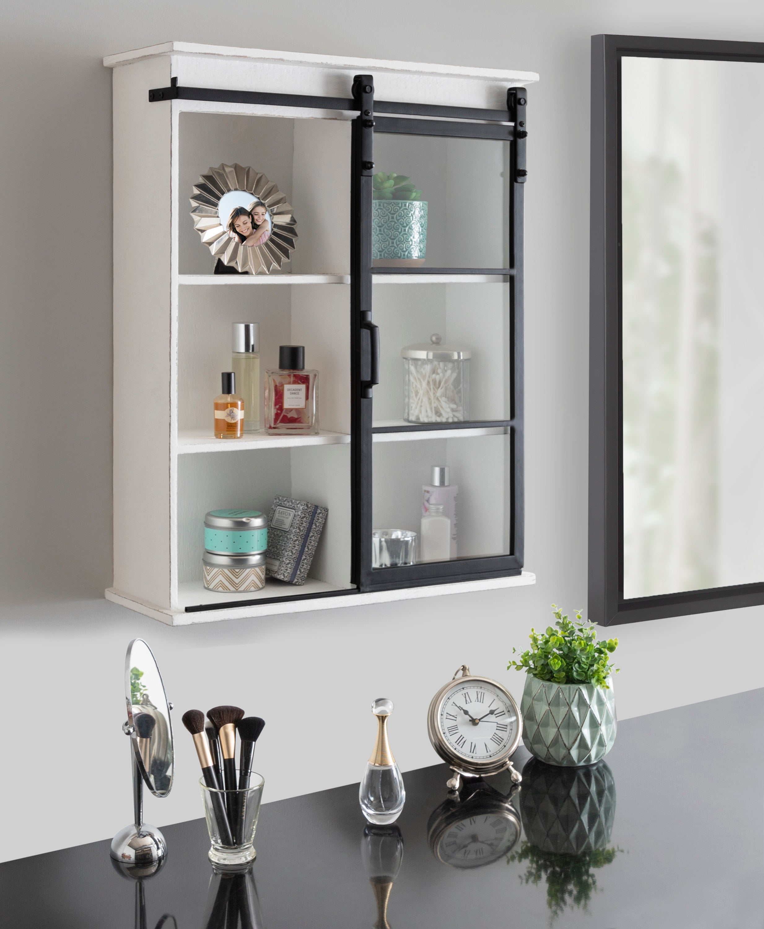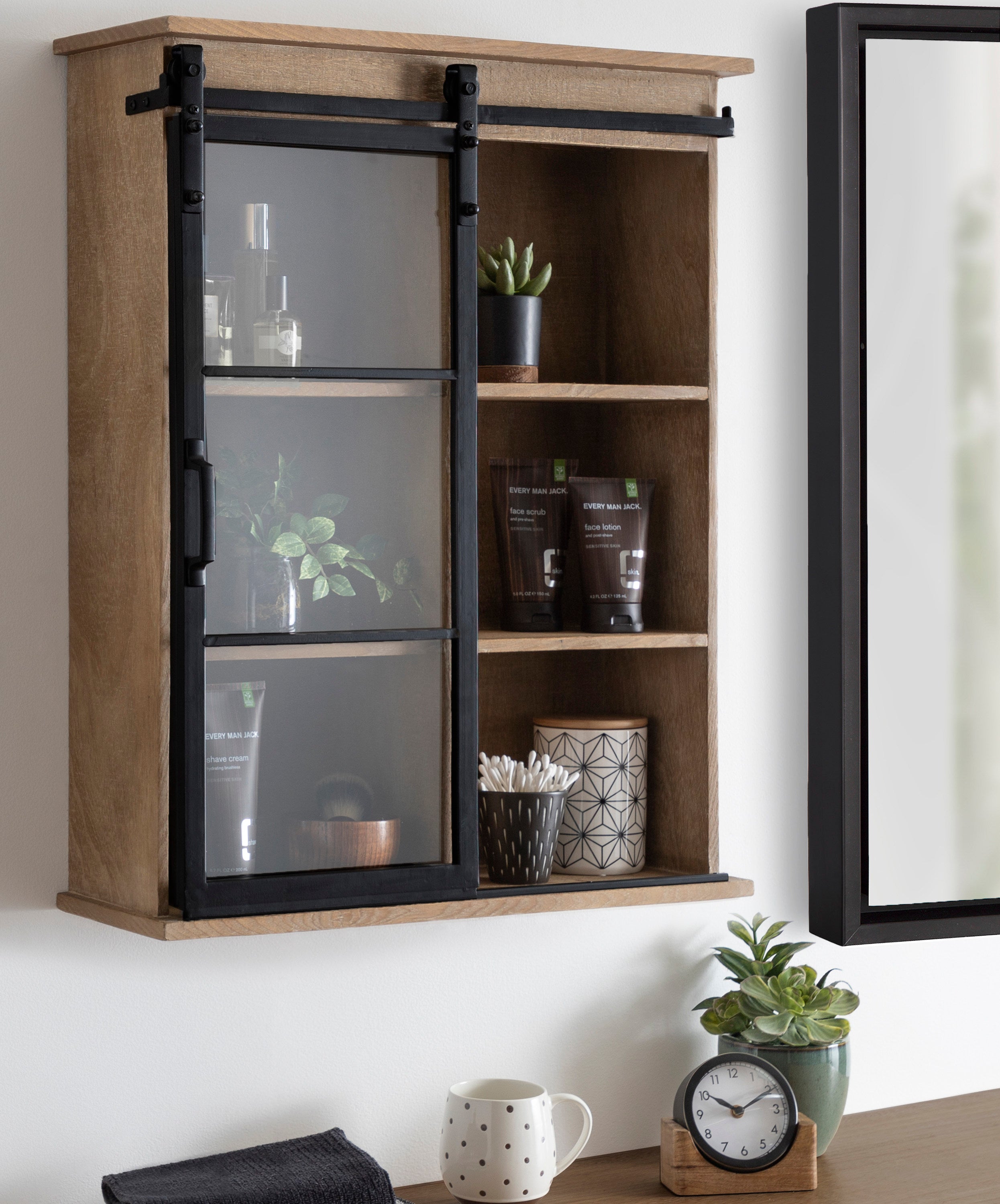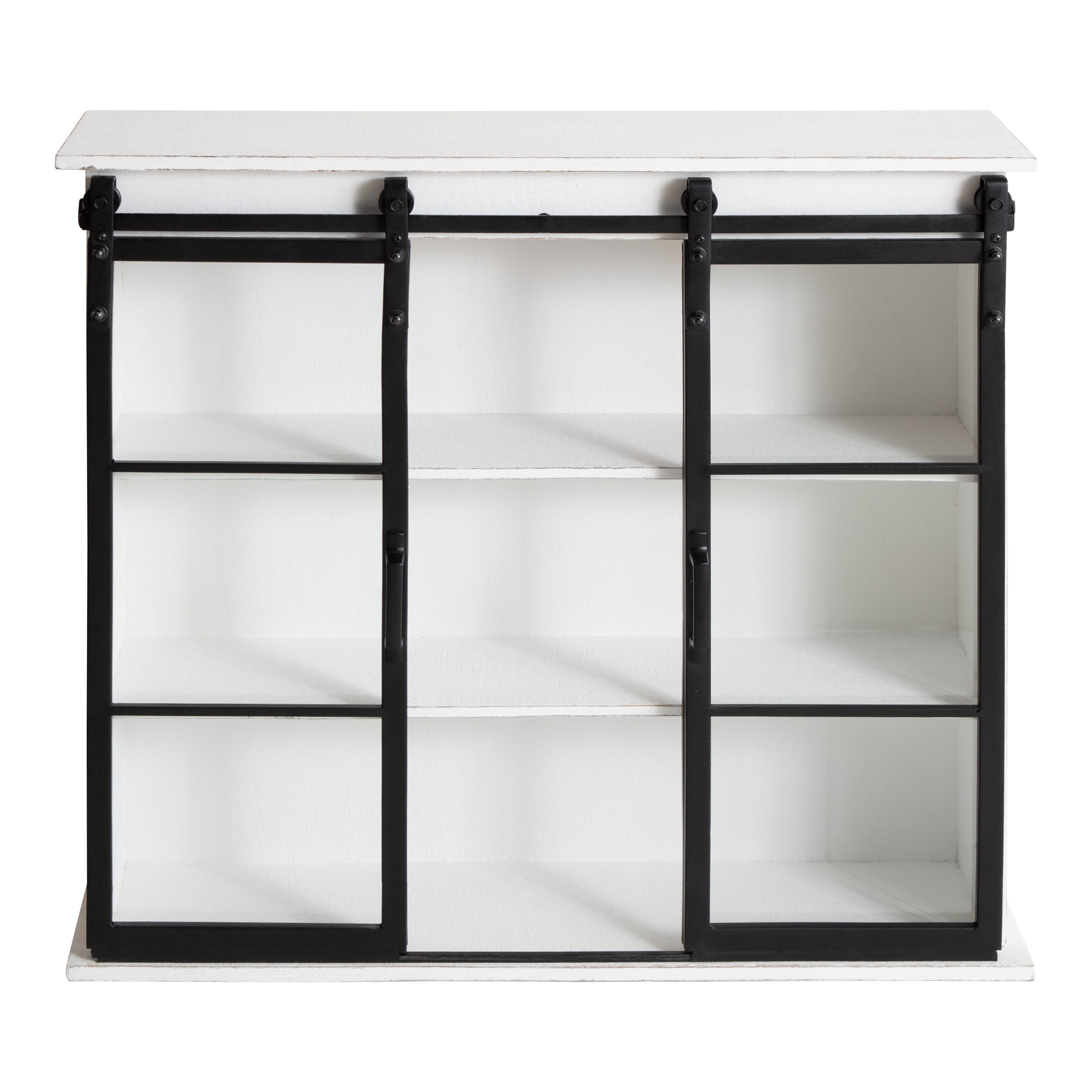 Create a beautiful storage area for your small decor pieces and other household items with the Barnhardt cabinet. This cabinet features shelves and a farmhouse-inspired metal framed glass sliding barndoor, perfect for storage and display. Use this modern farmhouse cabinet to showcase family photos, store spices or mugs, and even store your toiletries as a vanity in your master bathroom.