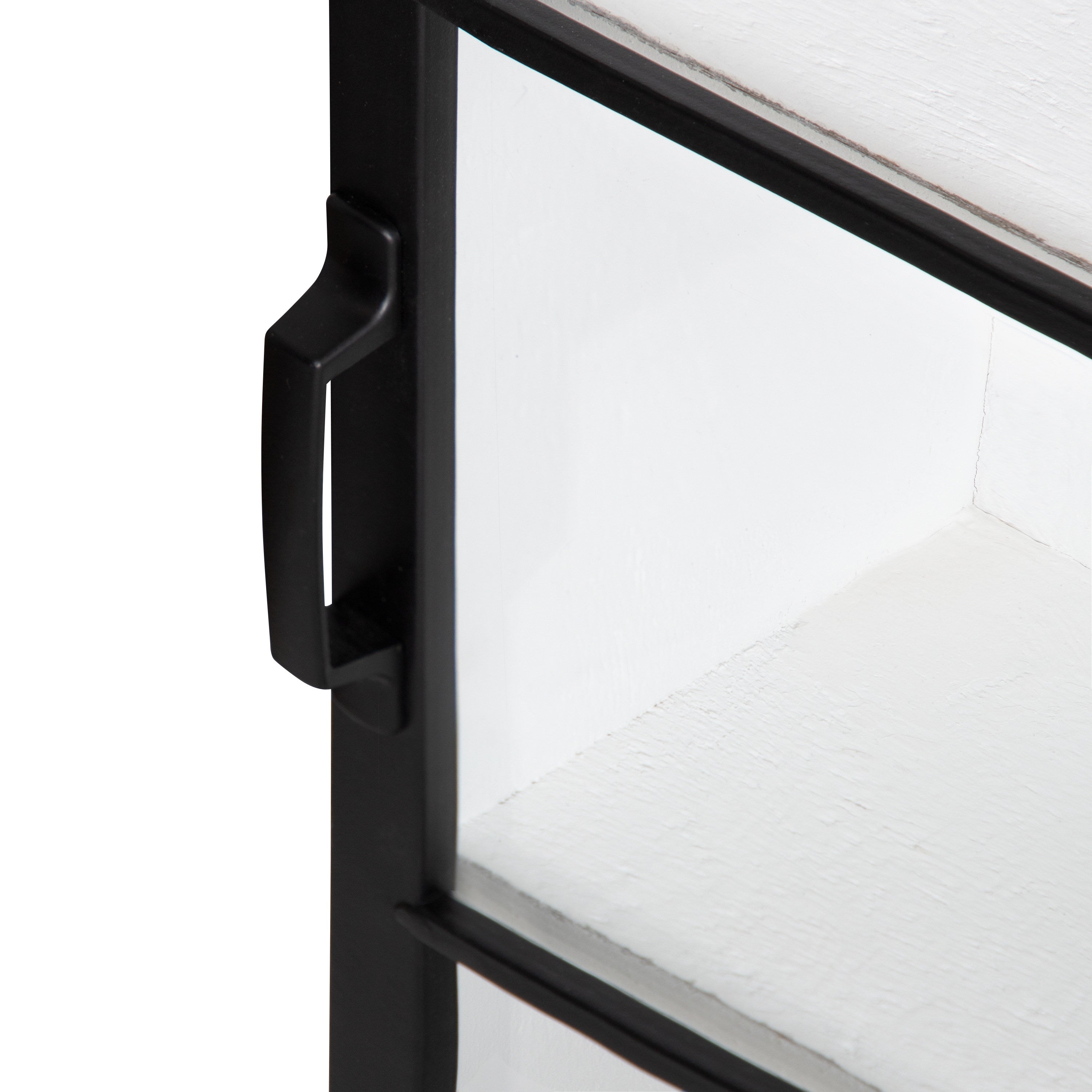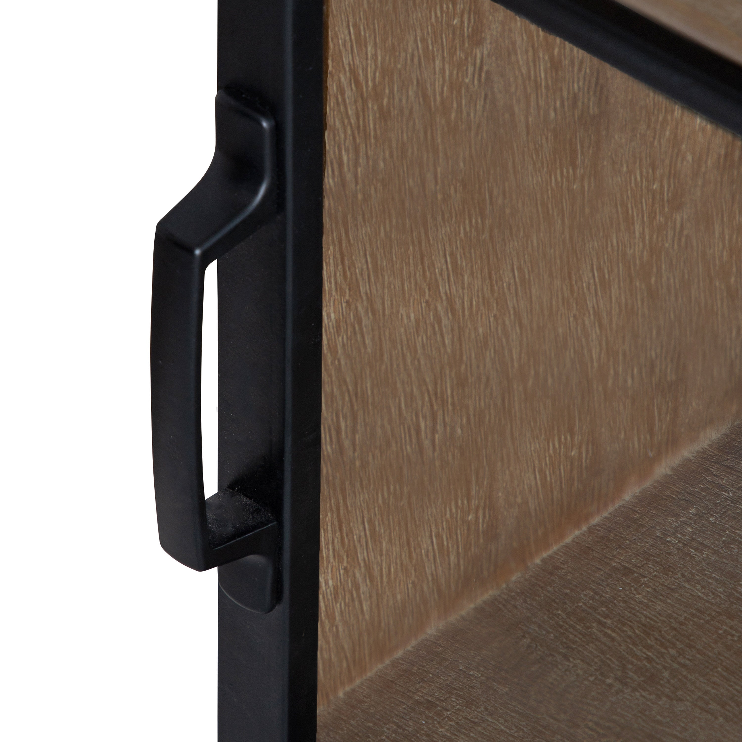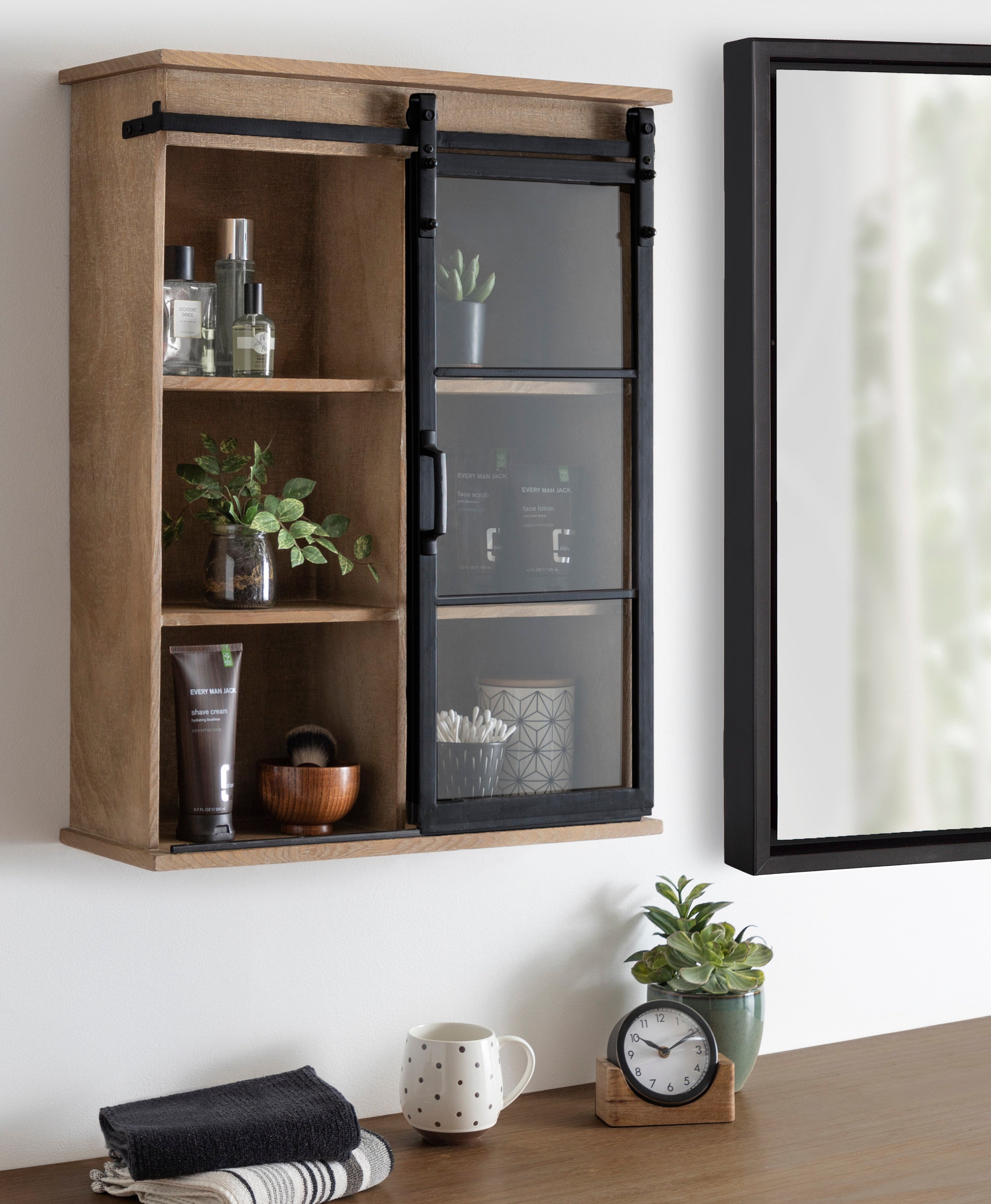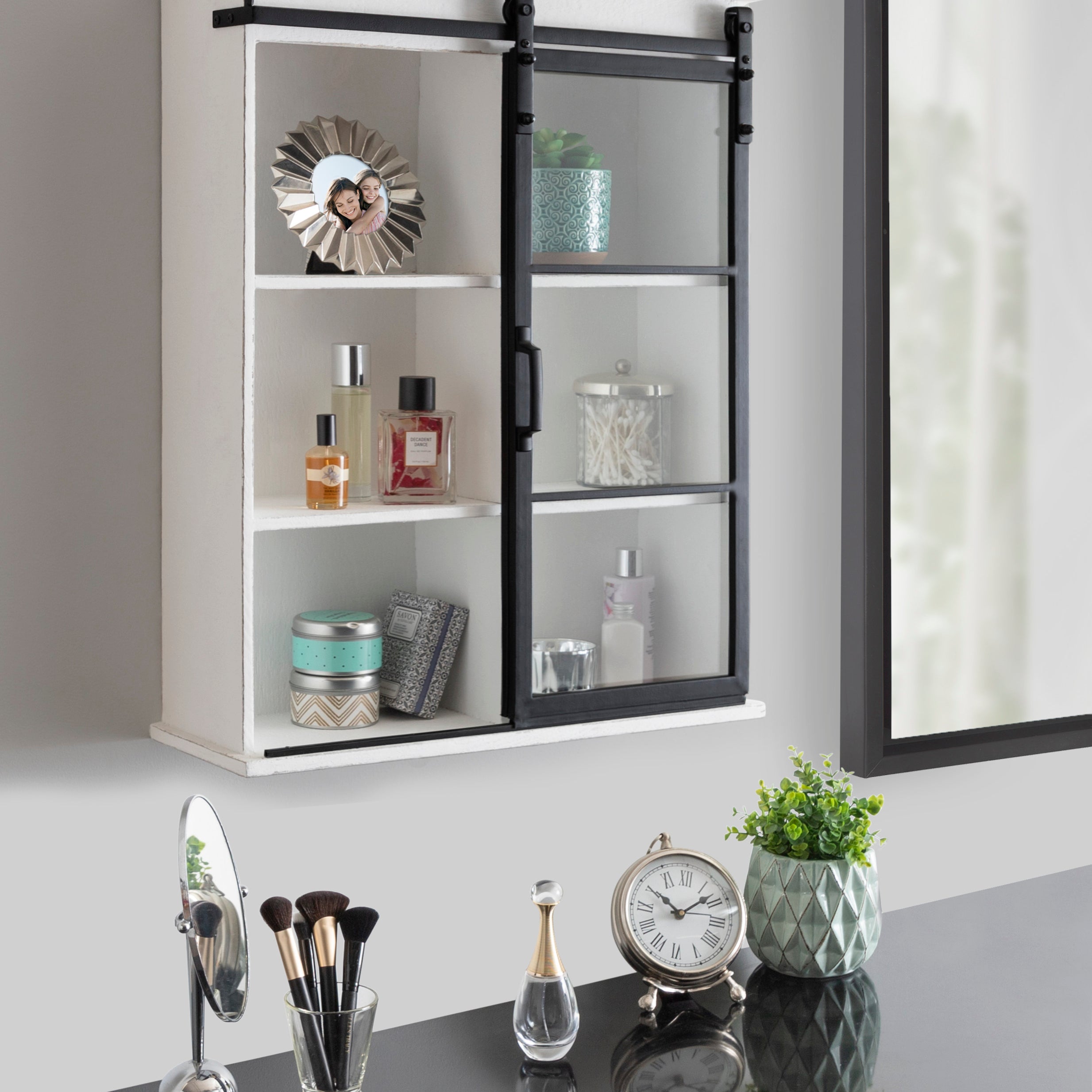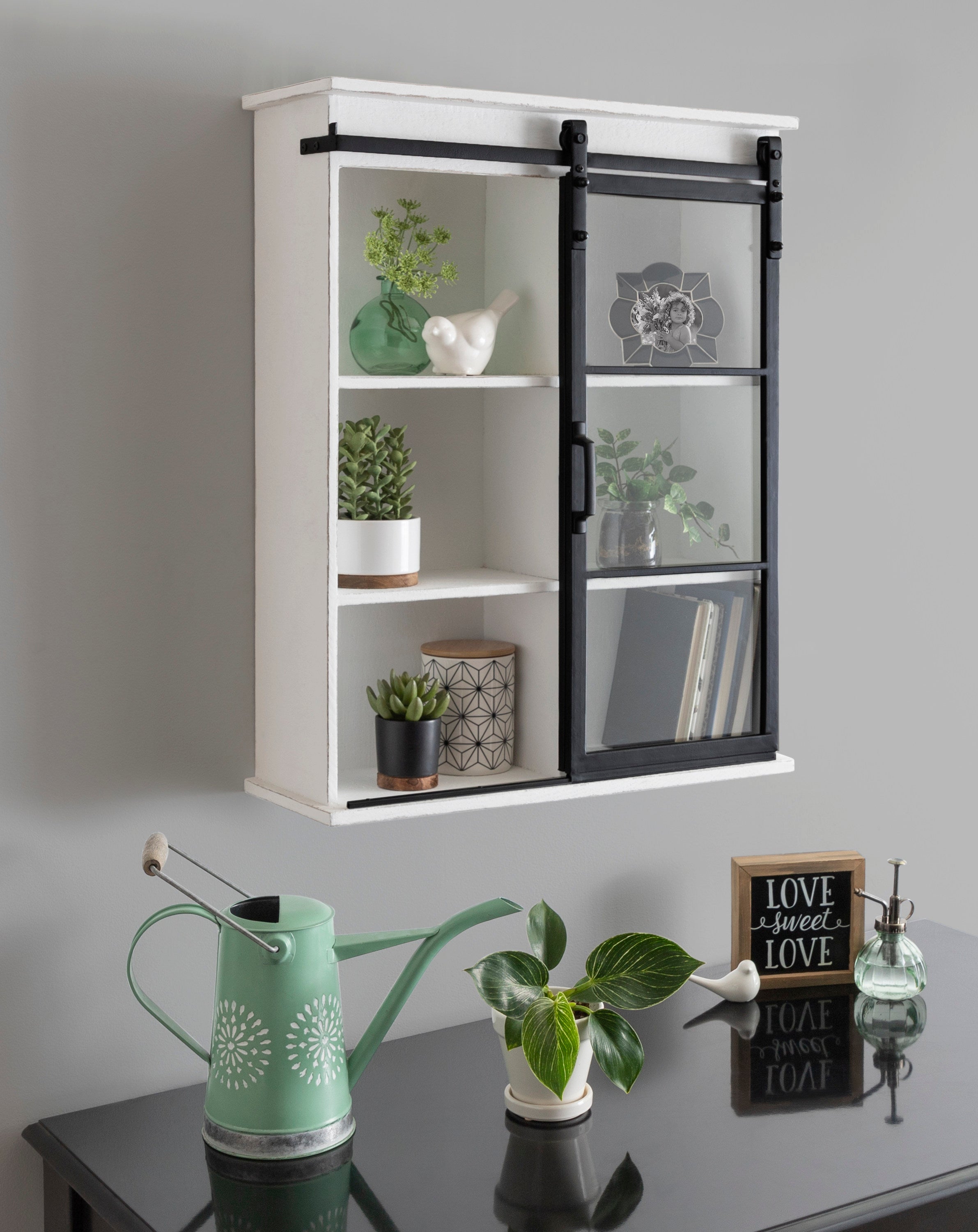 Create a beautiful storage area for your small decor pieces and other household items with the Barnhardt cabinet. This cabinet features shelves and a farmhouse-inspired metal framed glass sliding barndoor, perfect for storage and display. Use this modern farmhouse cabinet to showcase family photos, store spices or mugs, and even store your toiletries as a vanity in your master bathroom.