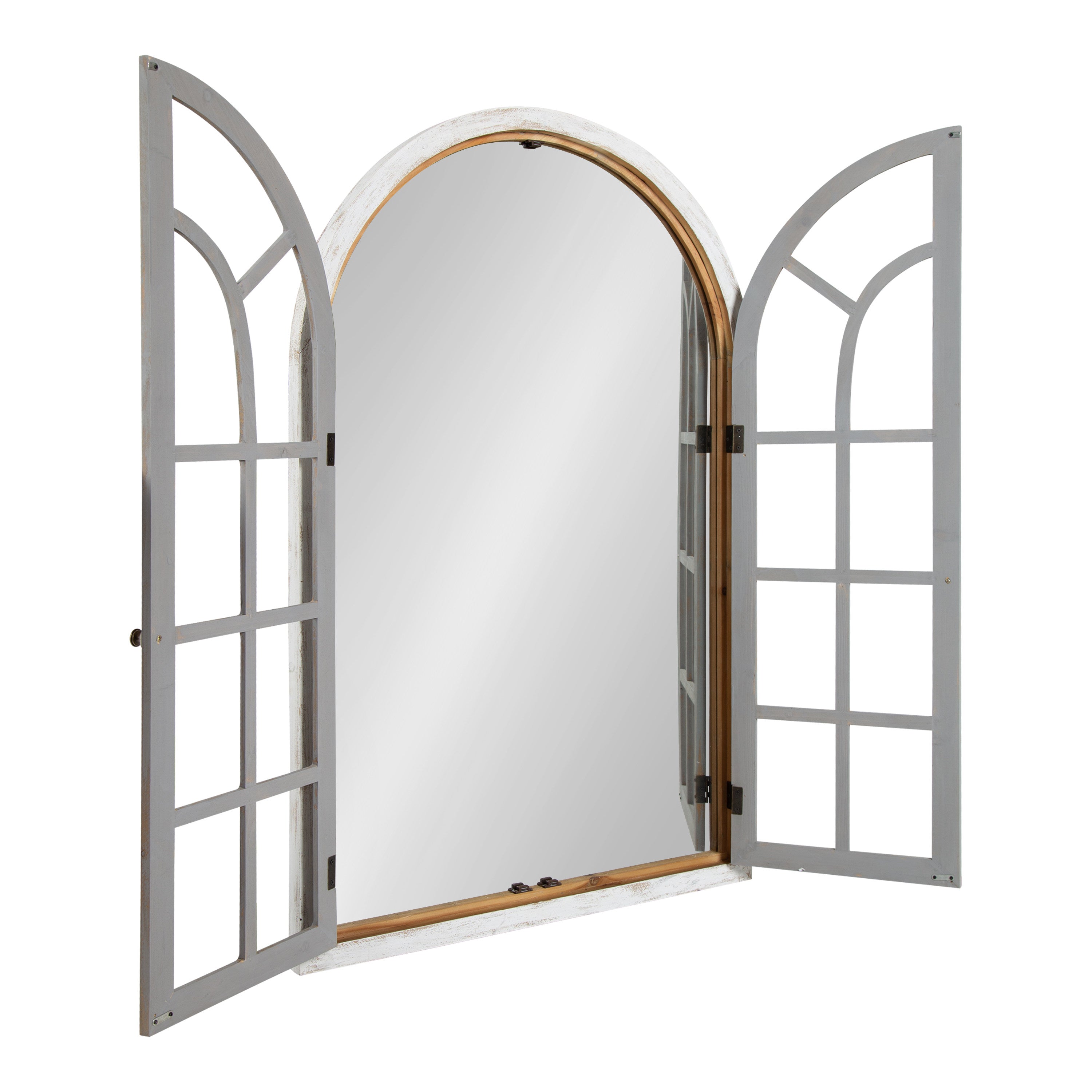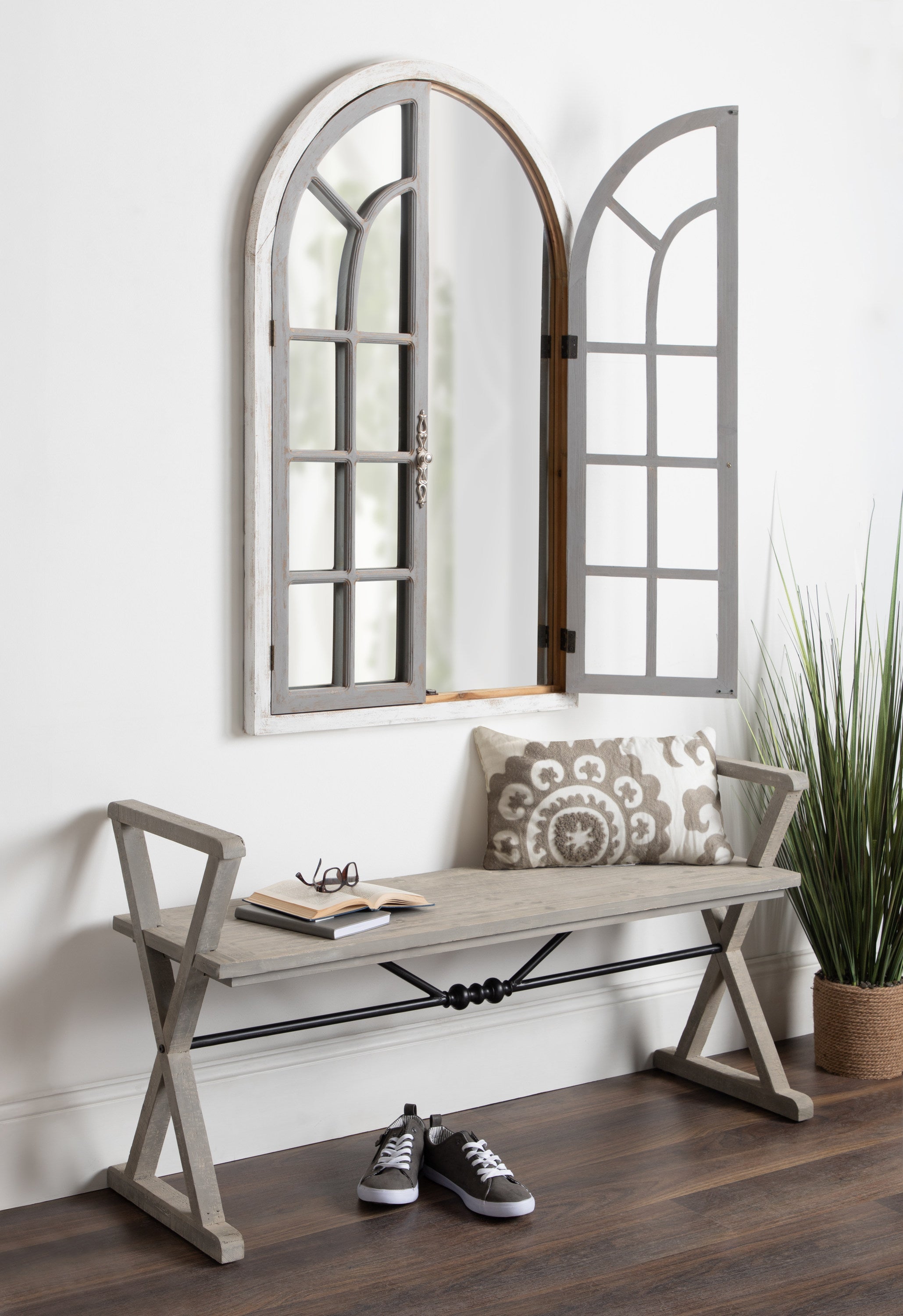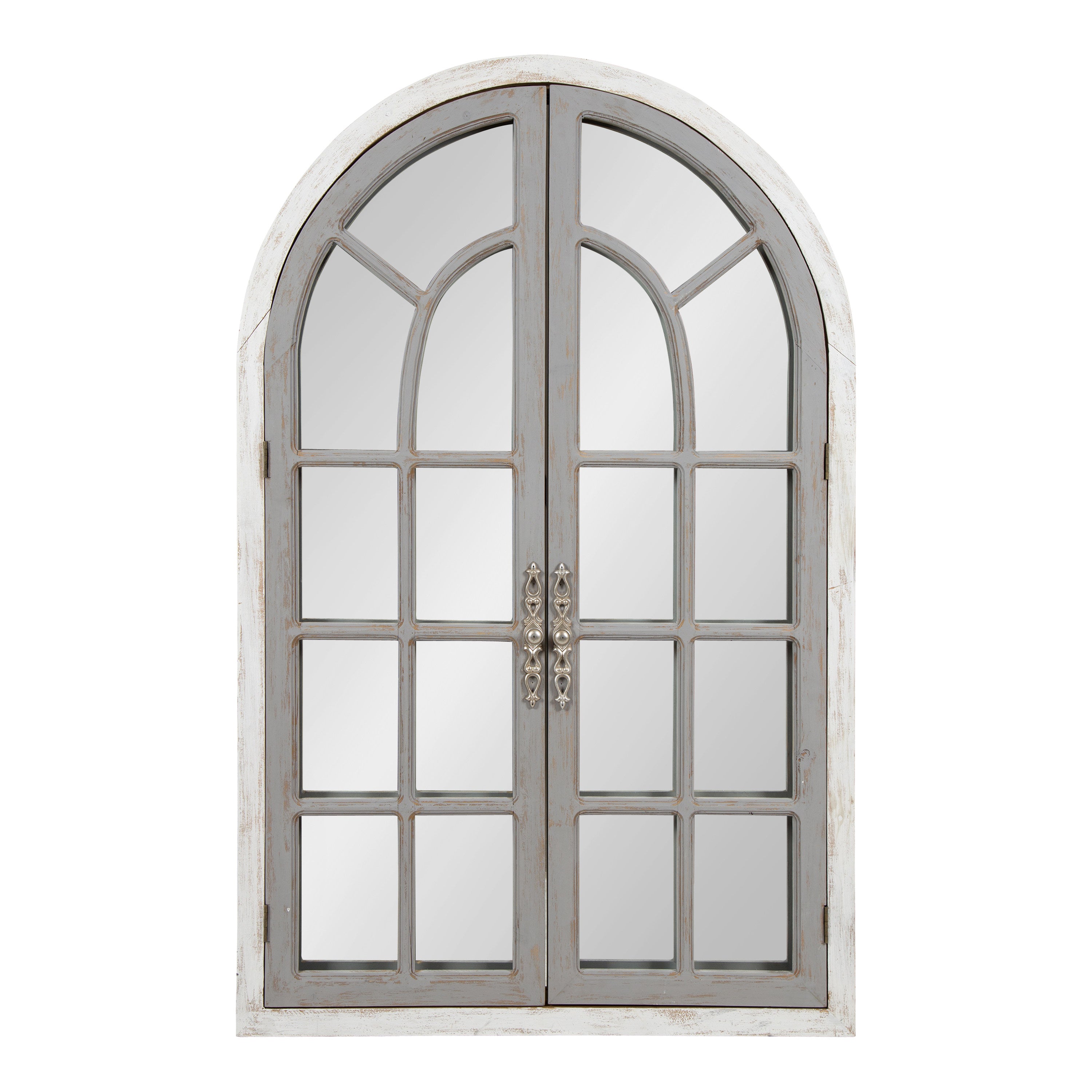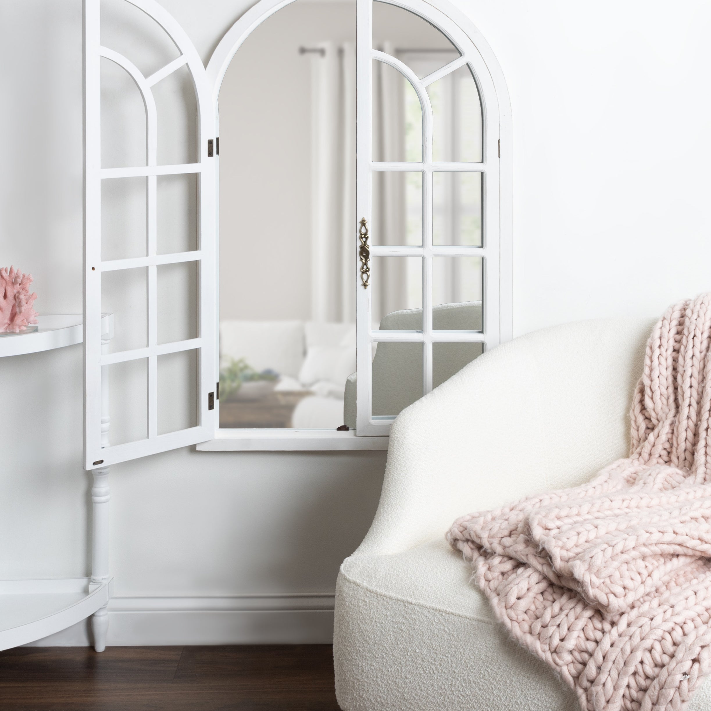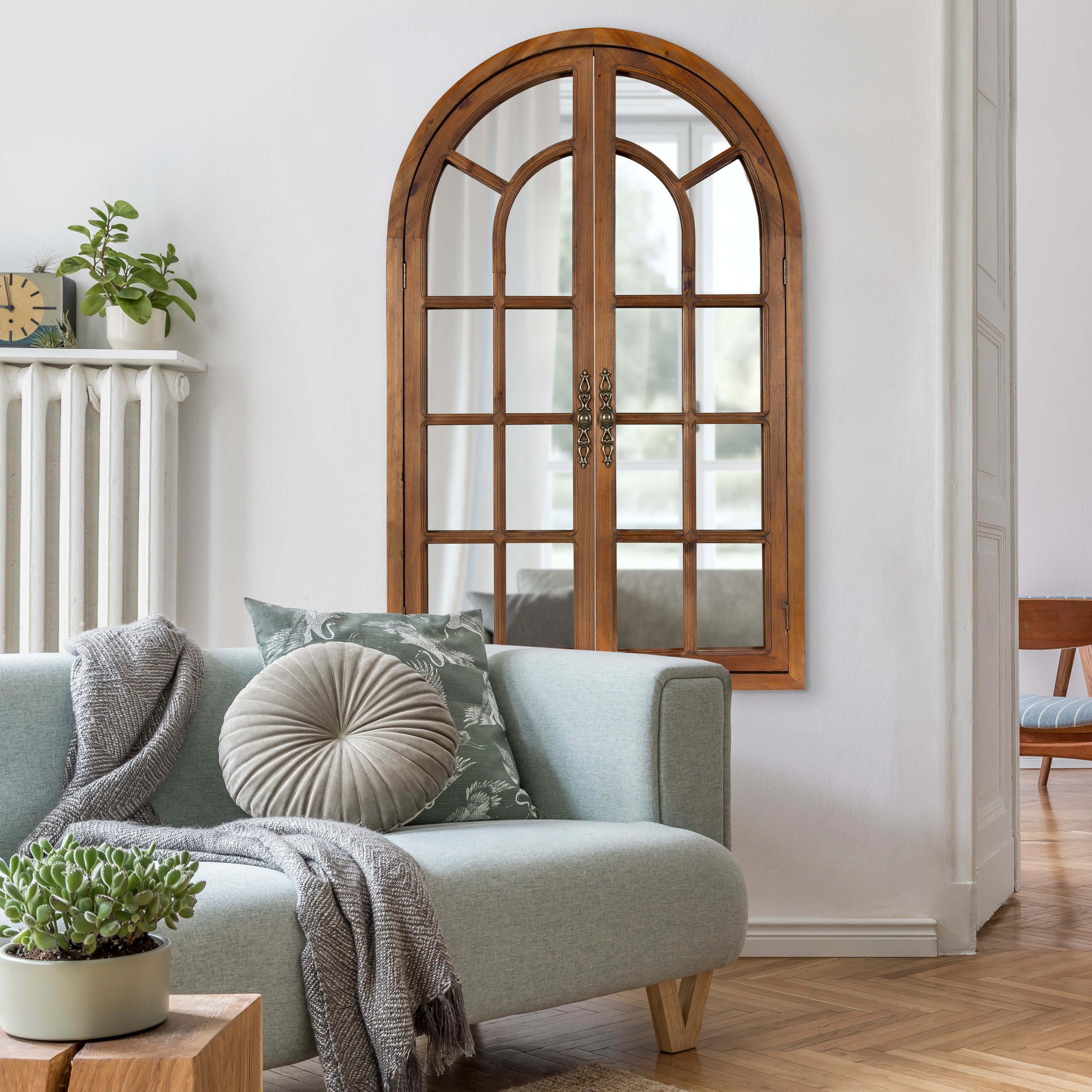 Craft a beautiful farmhouse theme within your favorite living space with the Boldmere arched wall mirror. Inspired by rustic farmhouses, the Boldmere has a window-inspired look with a latched two-door design. It's fantastic for bringing in light and creating a more open-concept space. It's fantastic for providing a beautiful farmhouse charm to any living room, bedroom, entryway, or bathroom.