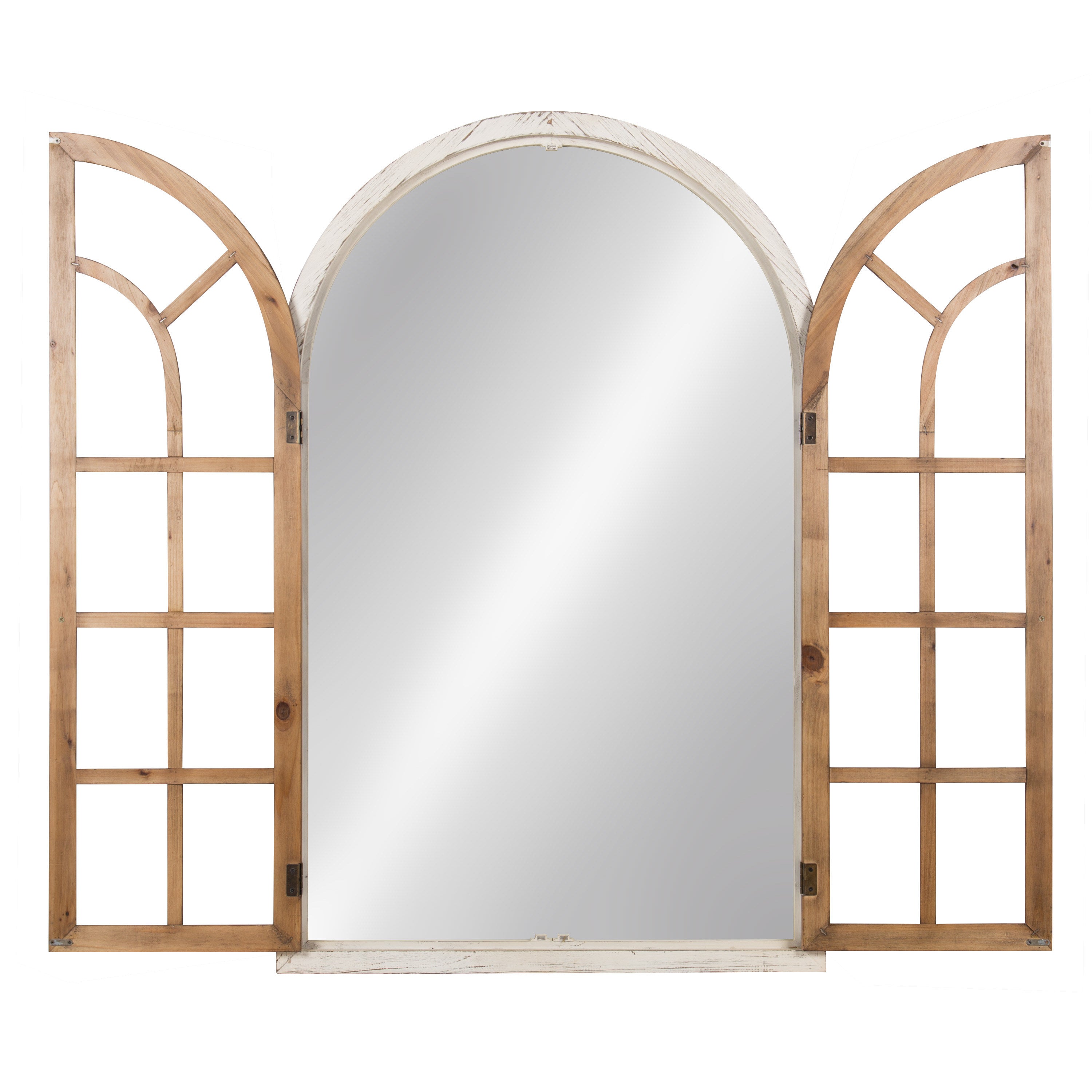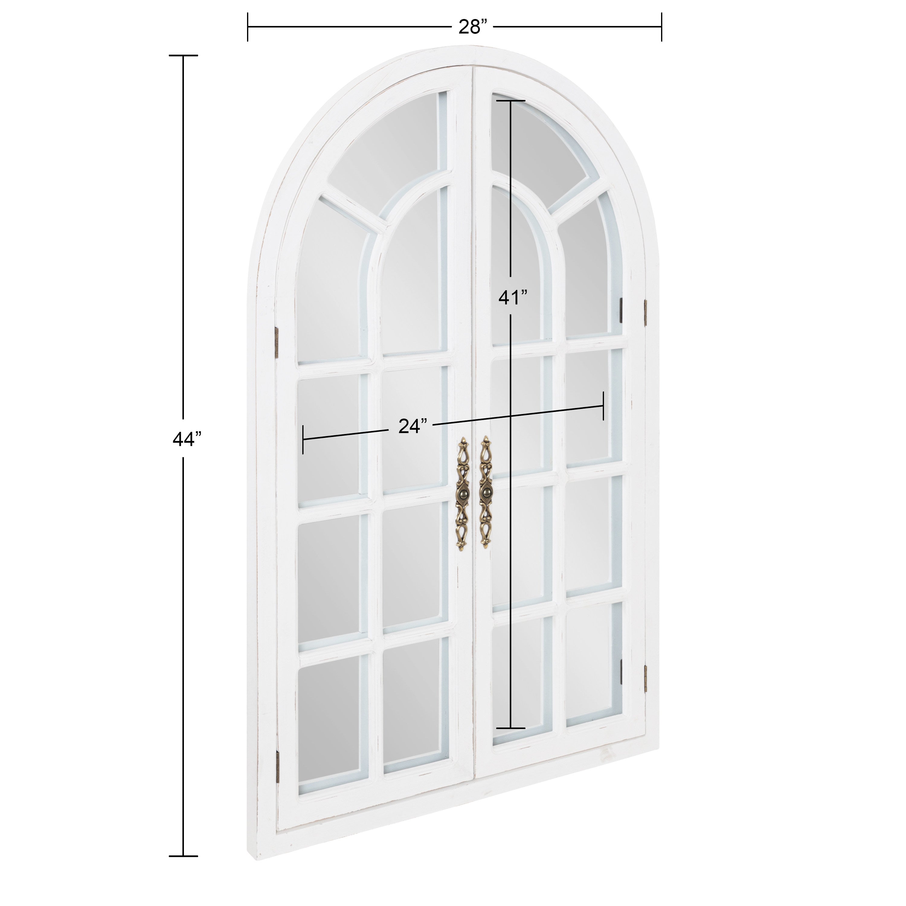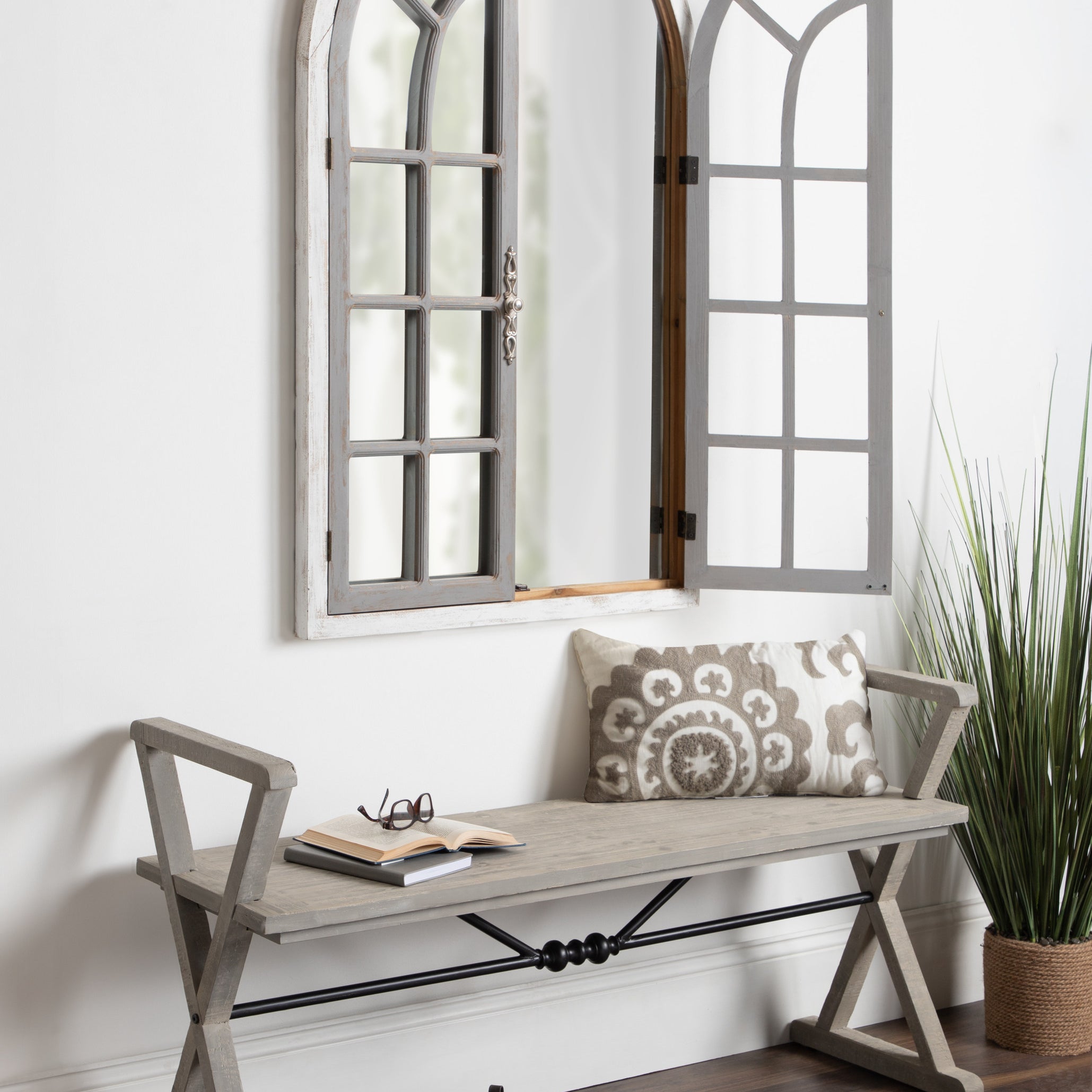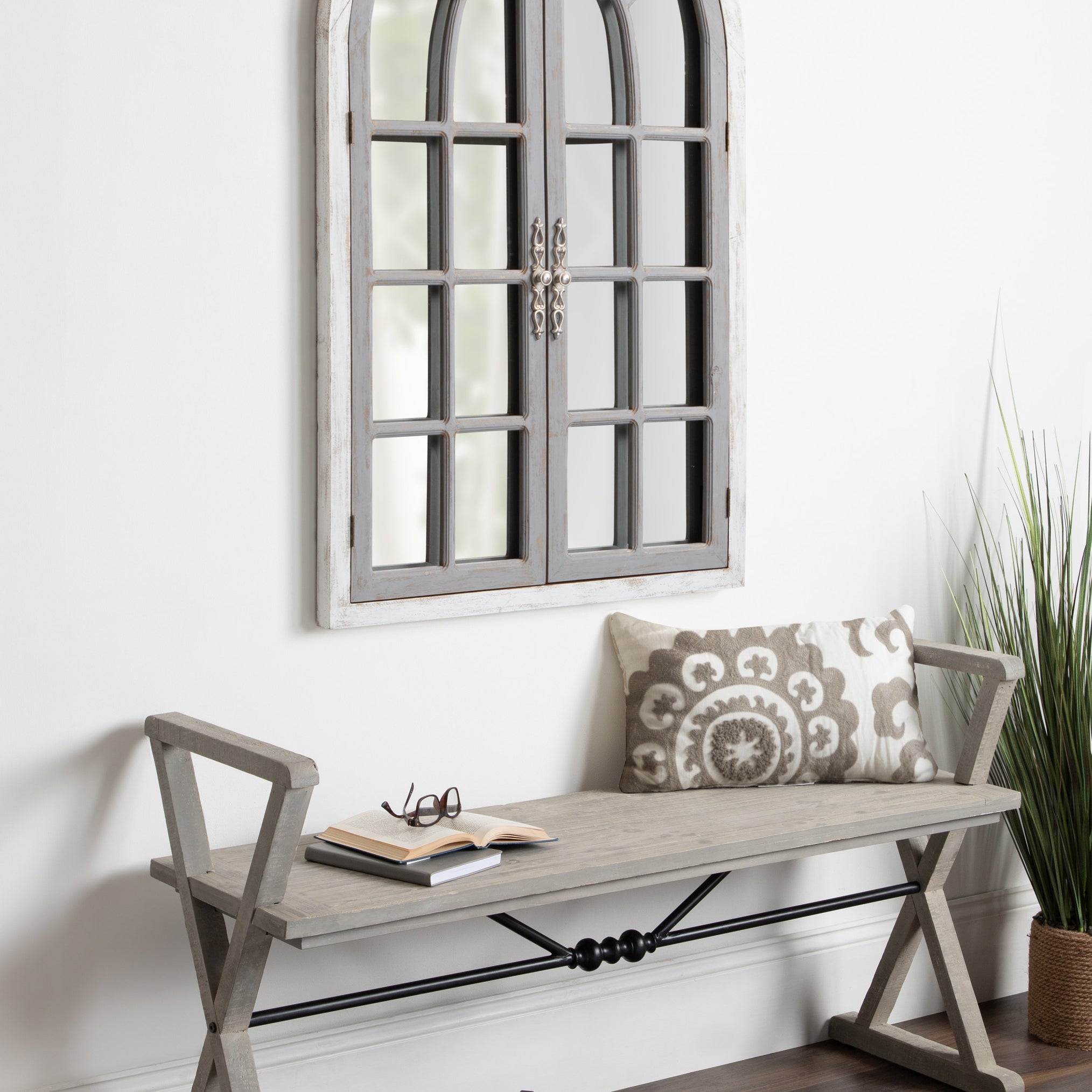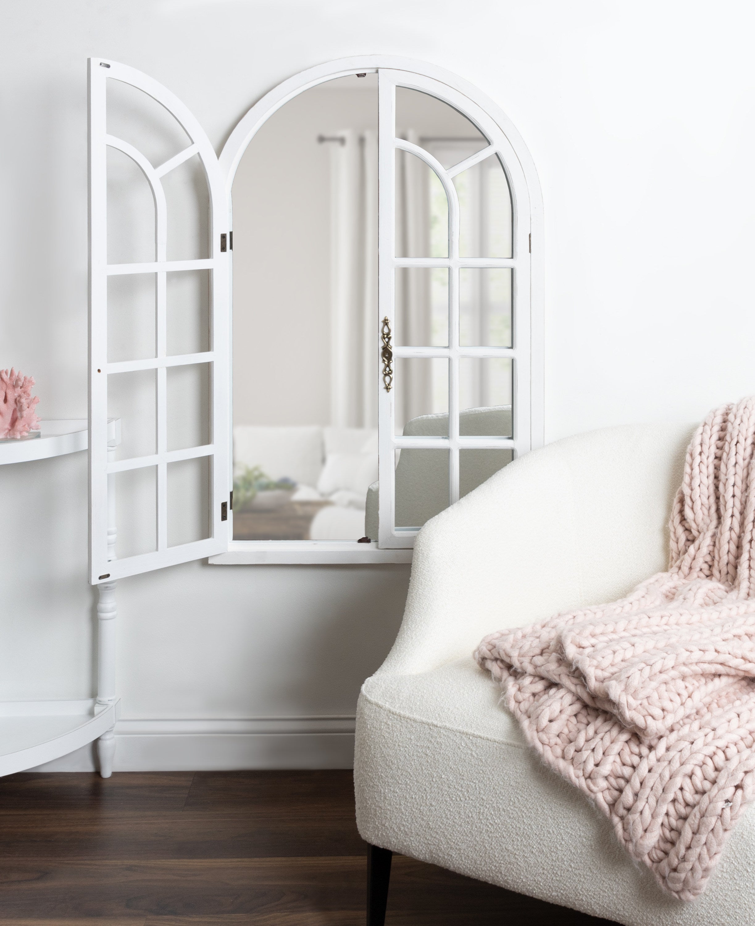 Craft a beautiful farmhouse theme within your favorite living space with the Boldmere arched wall mirror. Inspired by rustic farmhouses, the Boldmere has a window-inspired look with a latched two-door design. It's fantastic for bringing in light and creating a more open-concept space. It's fantastic for providing a beautiful farmhouse charm to any living room, bedroom, entryway, or bathroom.