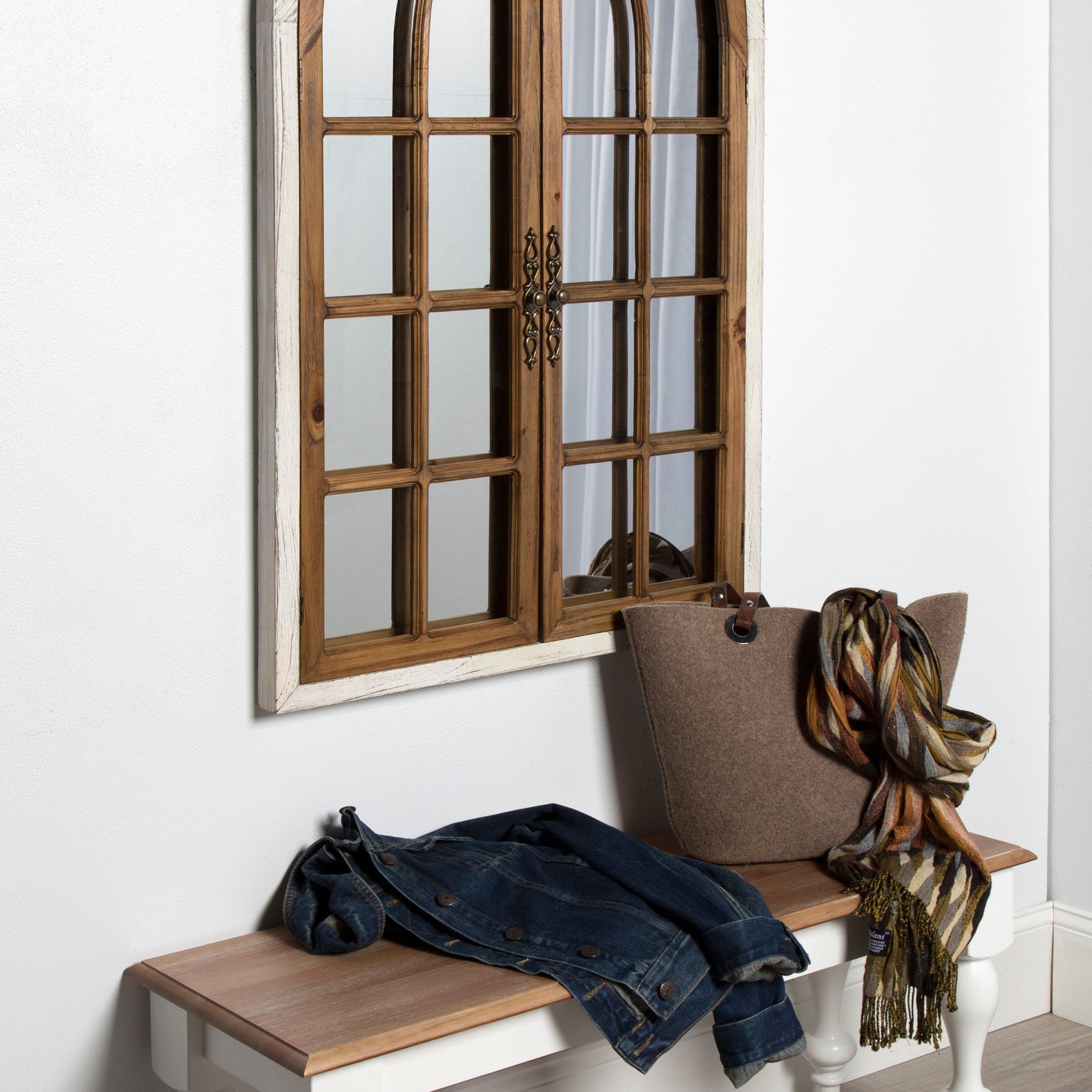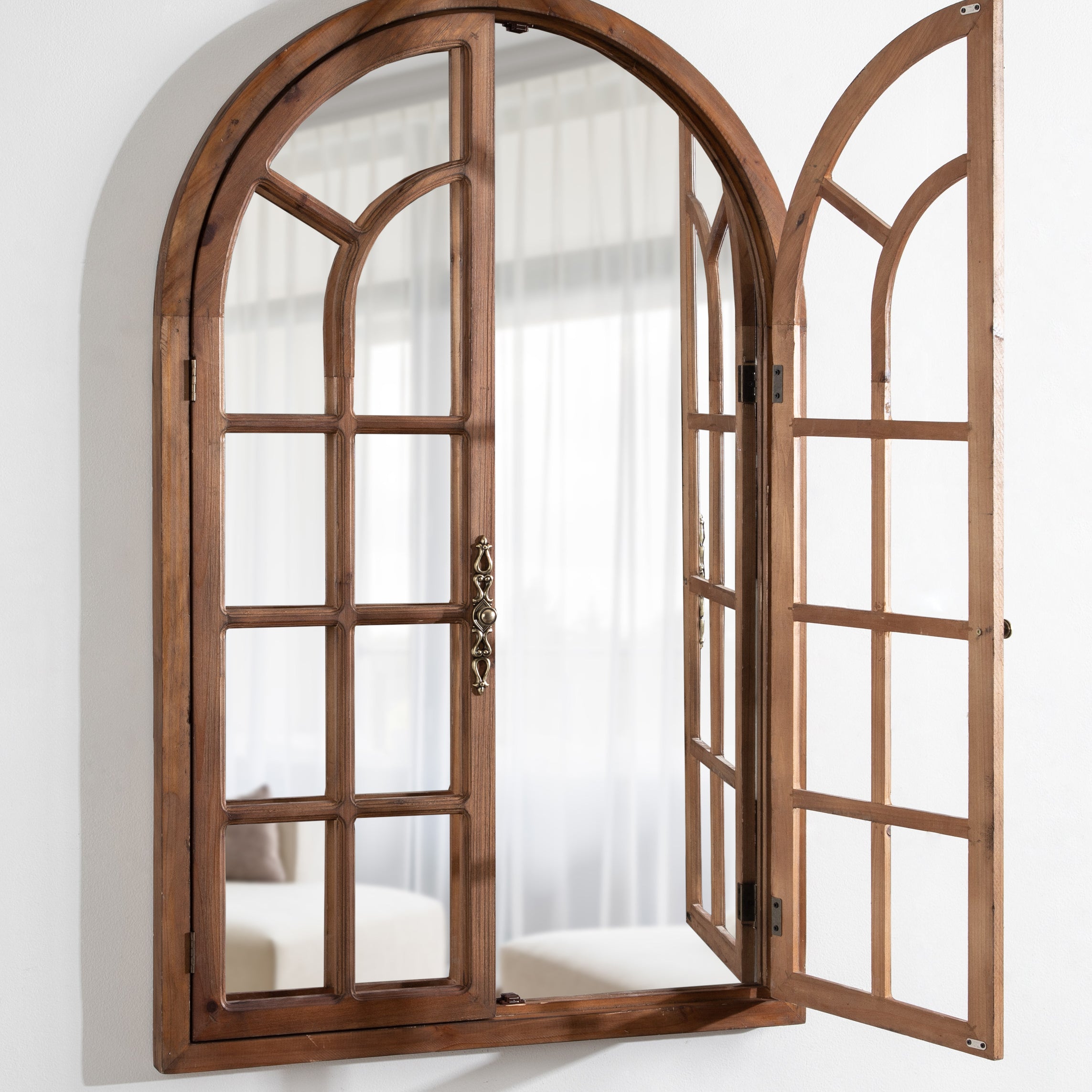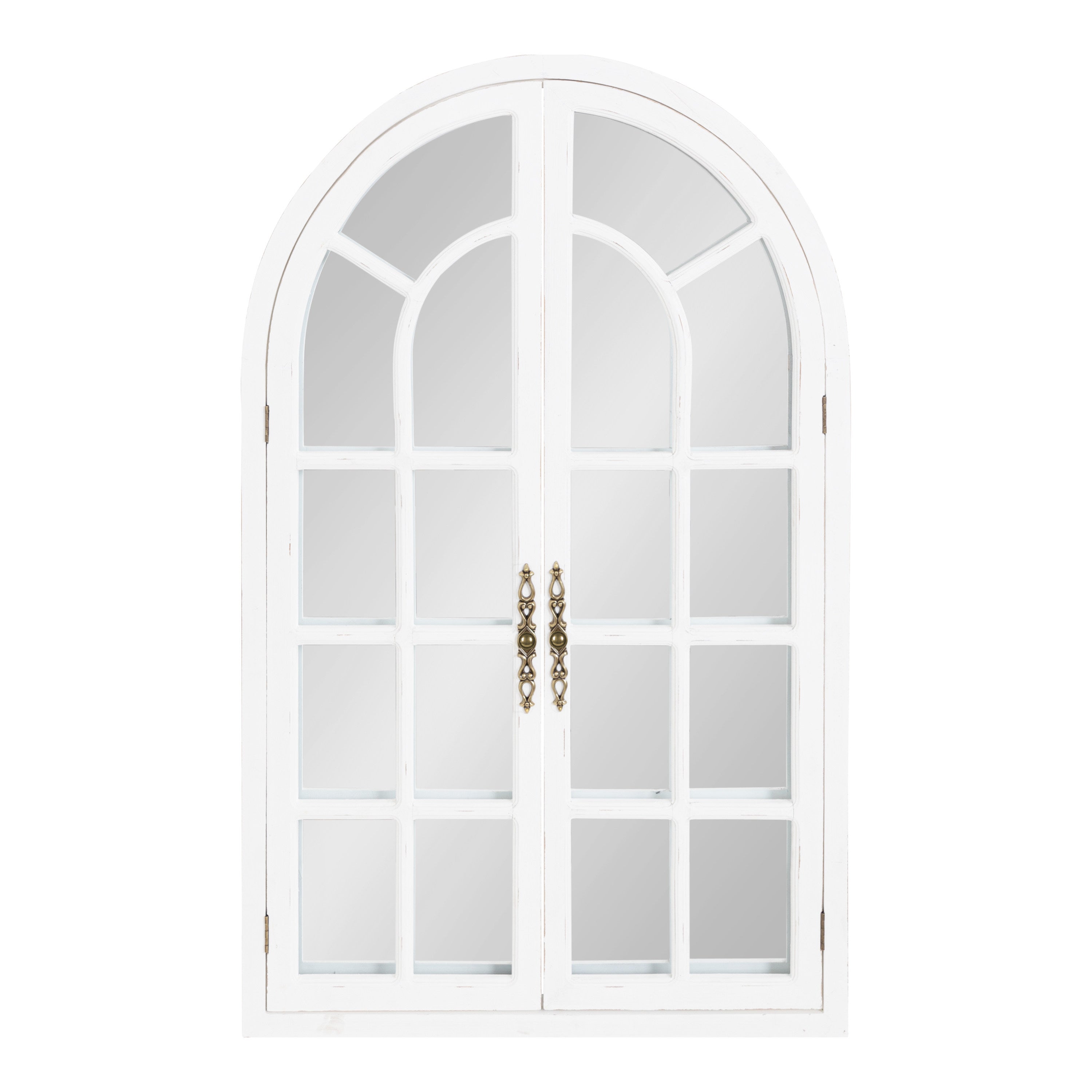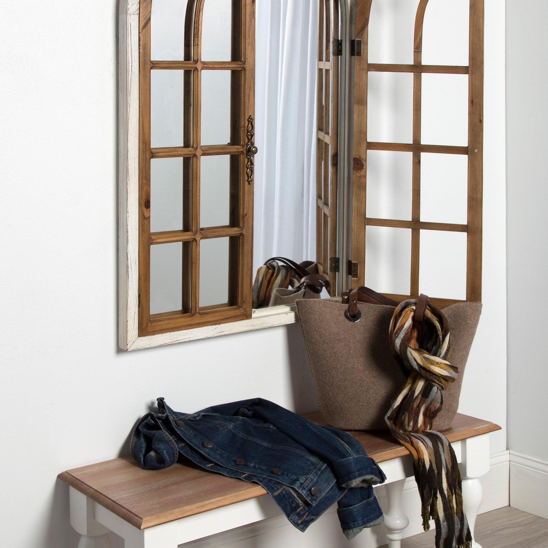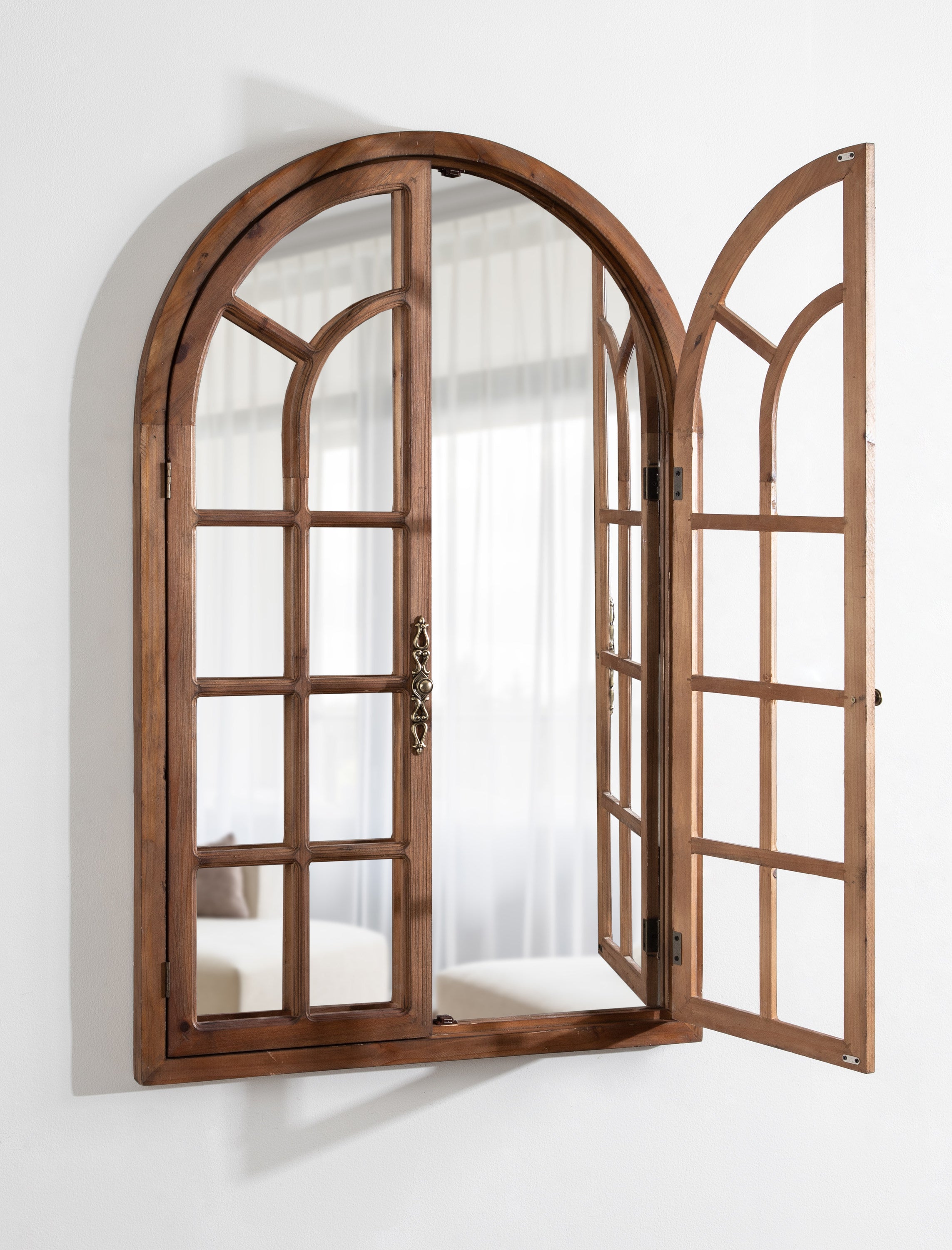 Craft a beautiful farmhouse theme within your favorite living space with the Boldmere arched wall mirror. Inspired by rustic farmhouses, the Boldmere has a window-inspired look with a latched two-door design. It's fantastic for bringing in light and creating a more open-concept space. It's fantastic for providing a beautiful farmhouse charm to any living room, bedroom, entryway, or bathroom.
