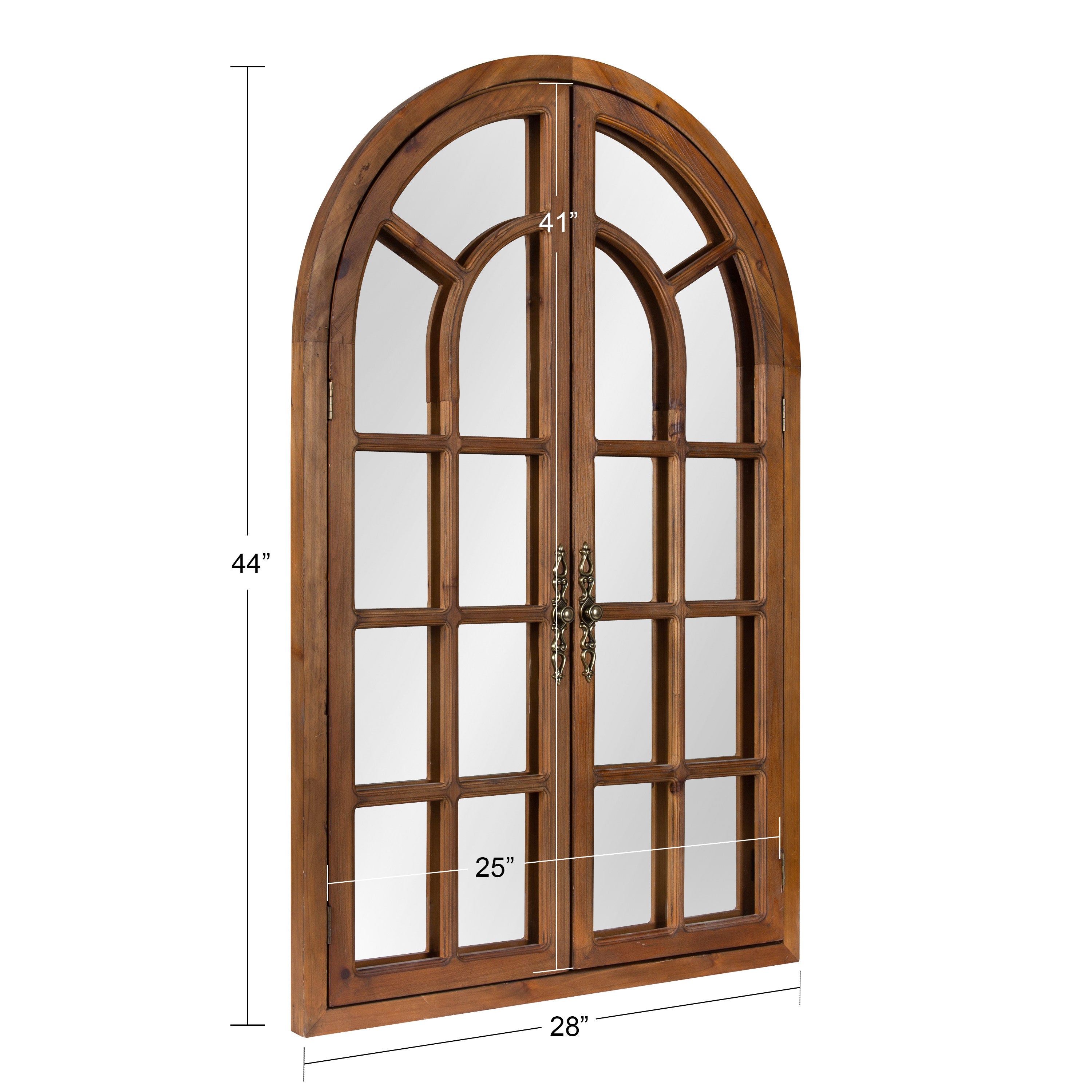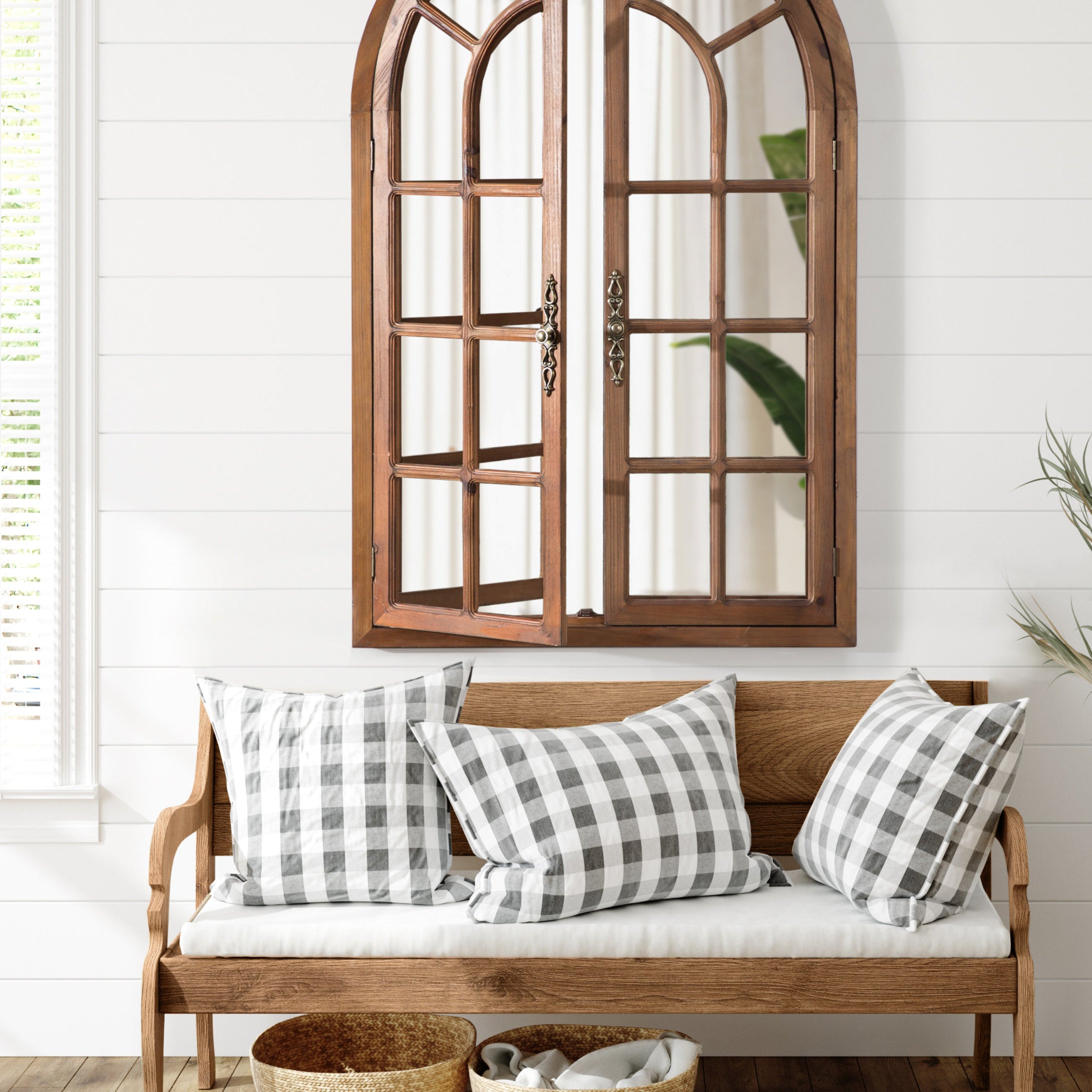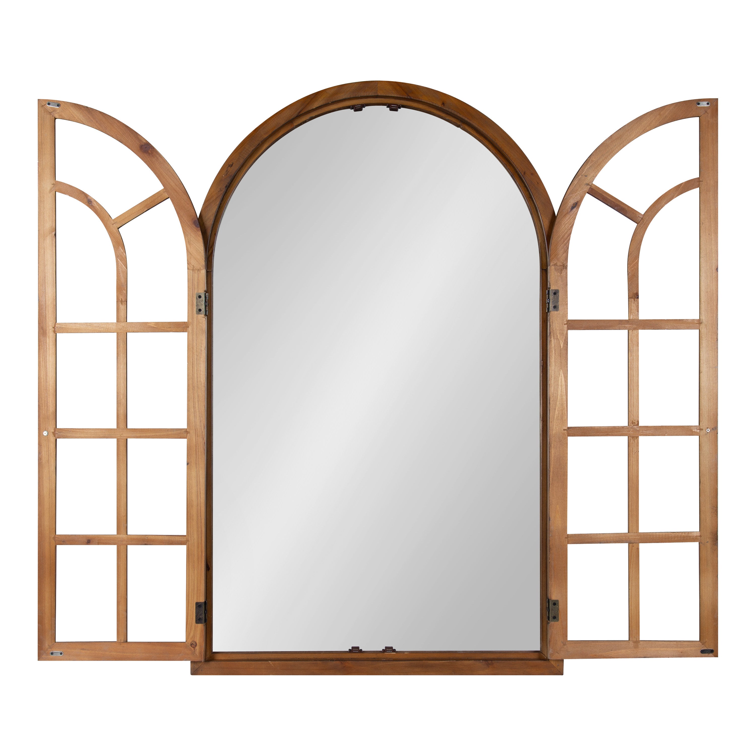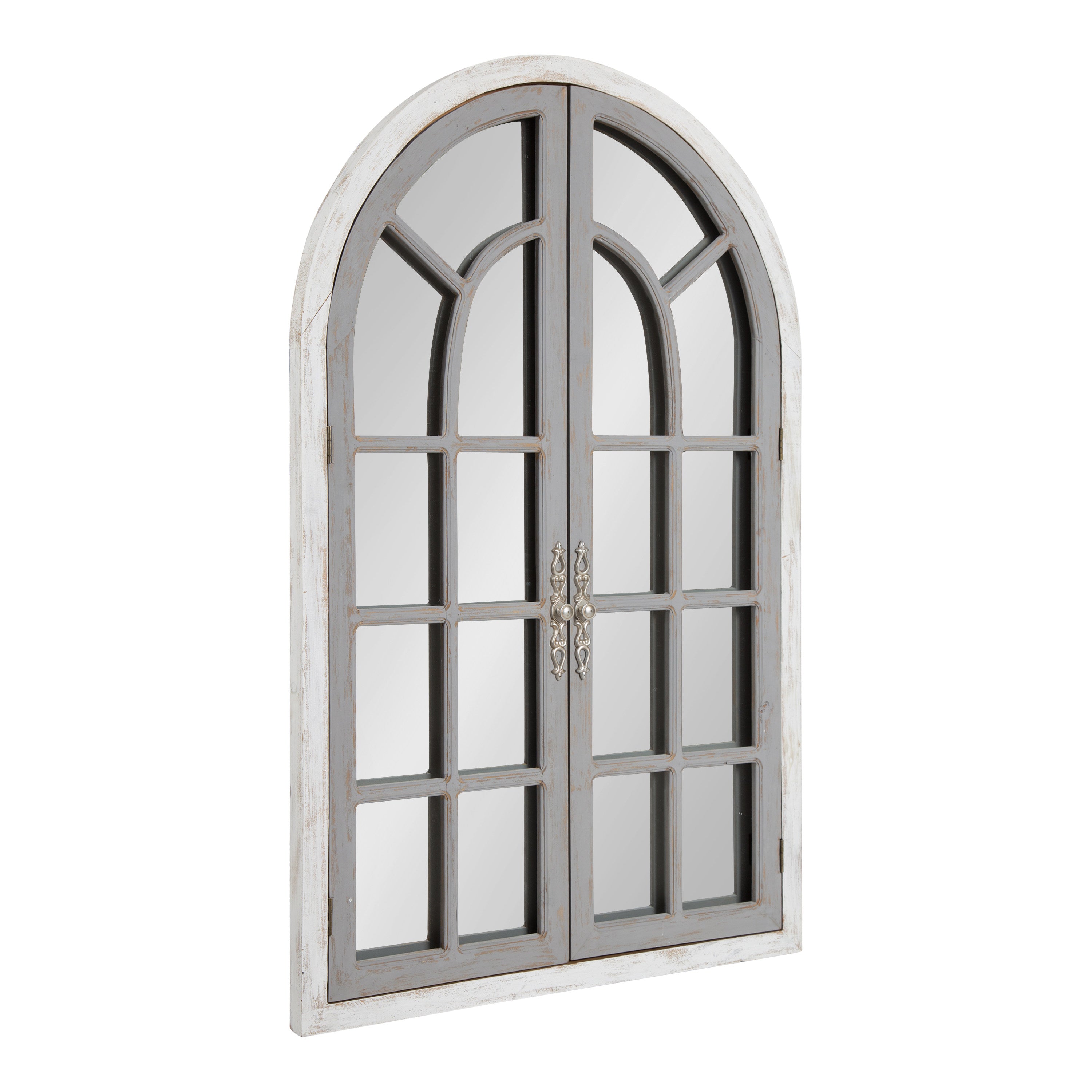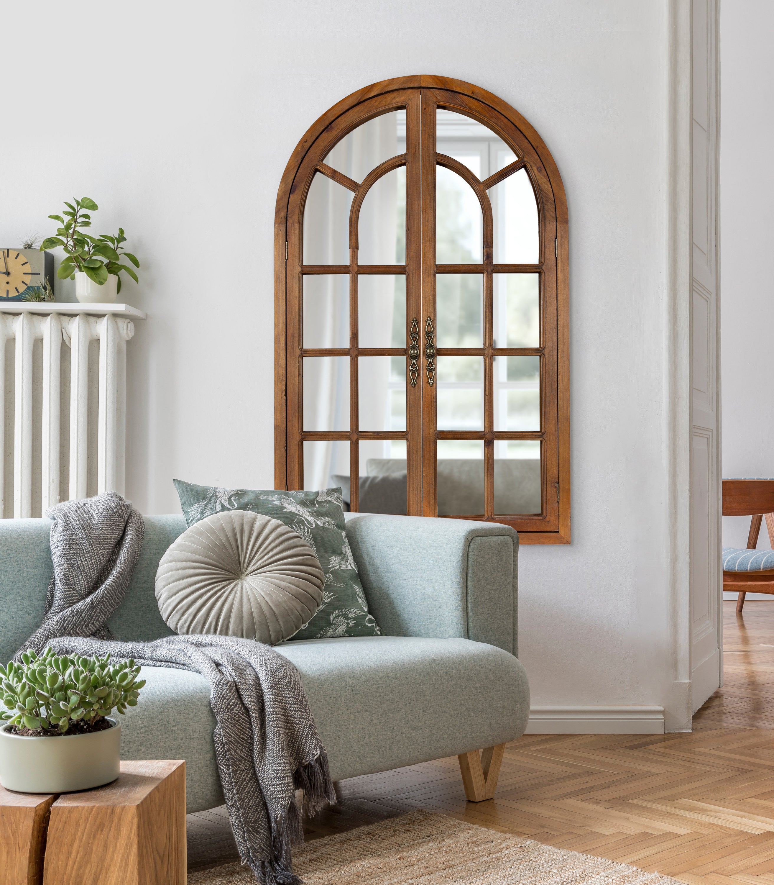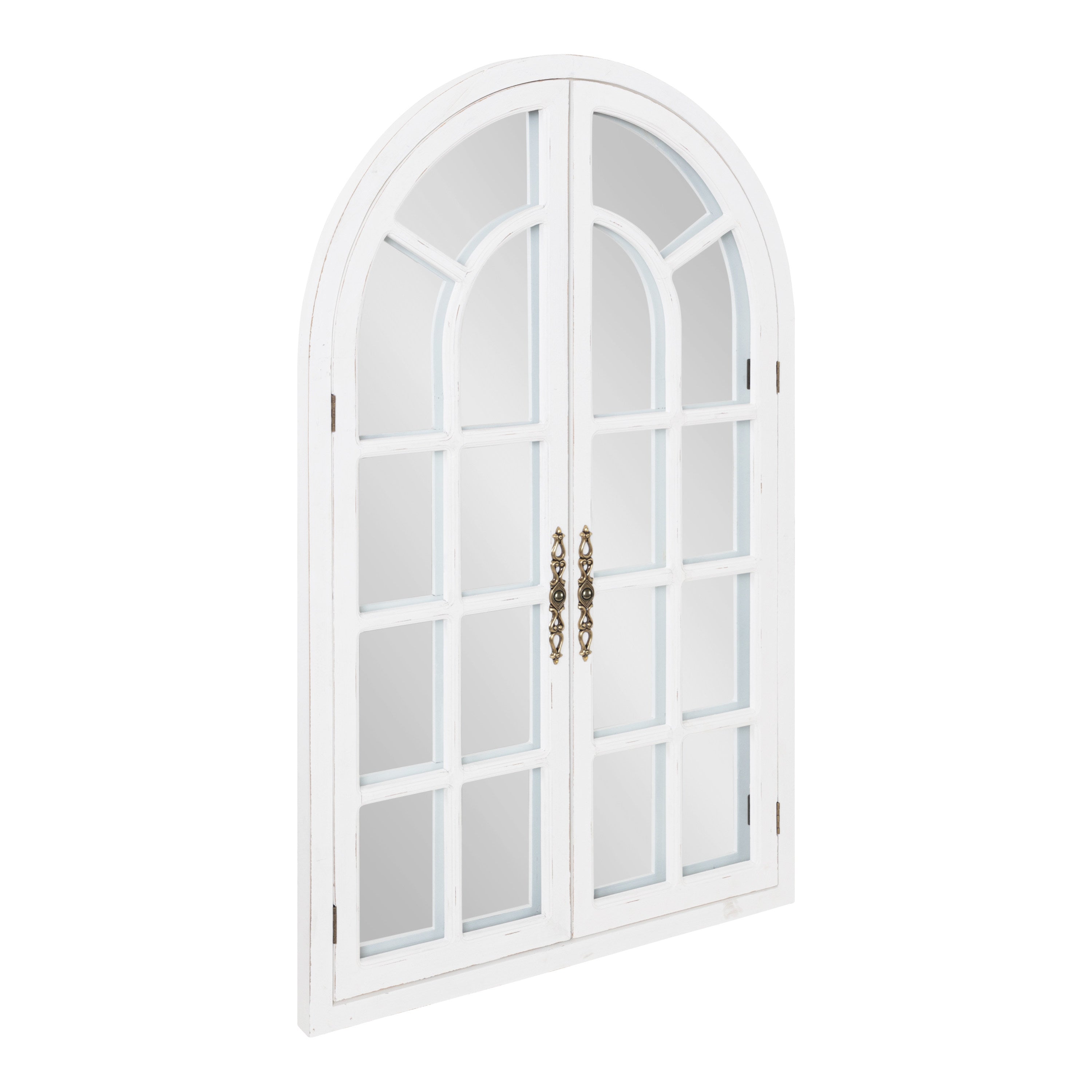 Craft a beautiful farmhouse theme within your favorite living space with the Boldmere arched wall mirror. Inspired by rustic farmhouses, the Boldmere has a window-inspired look with a latched two-door design. It's fantastic for bringing in light and creating a more open-concept space. It's fantastic for providing a beautiful farmhouse charm to any living room, bedroom, entryway, or bathroom.