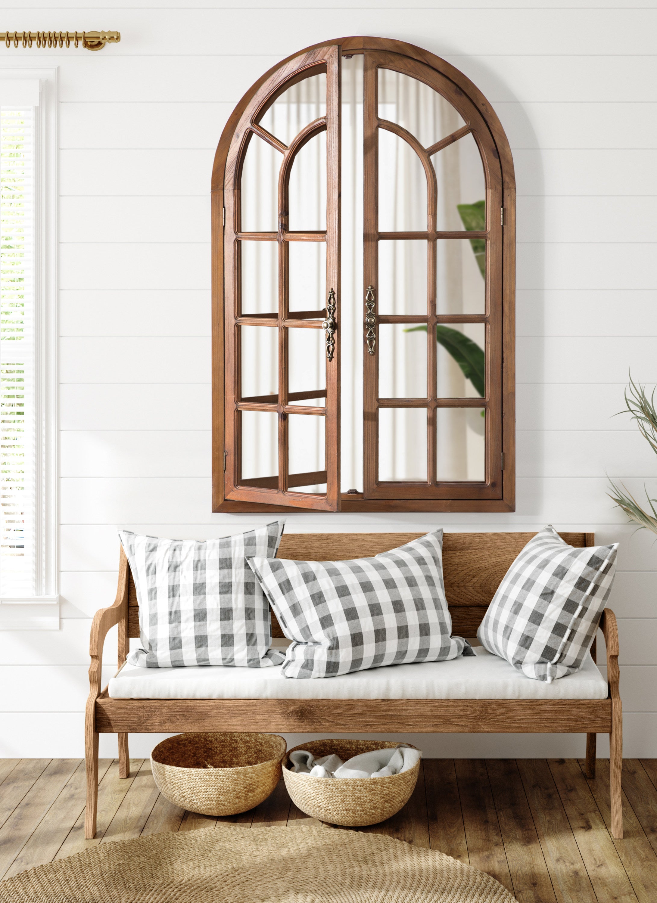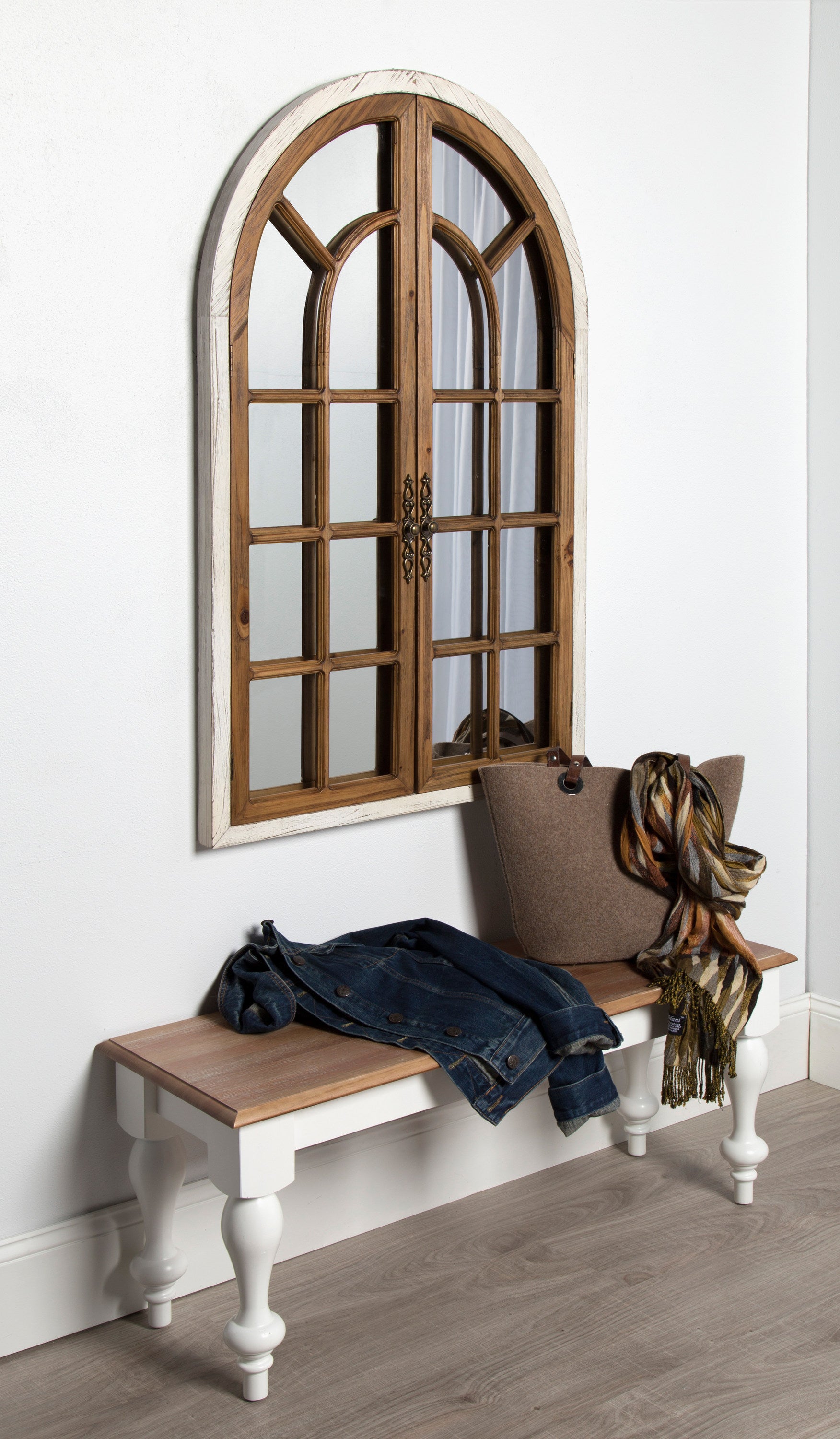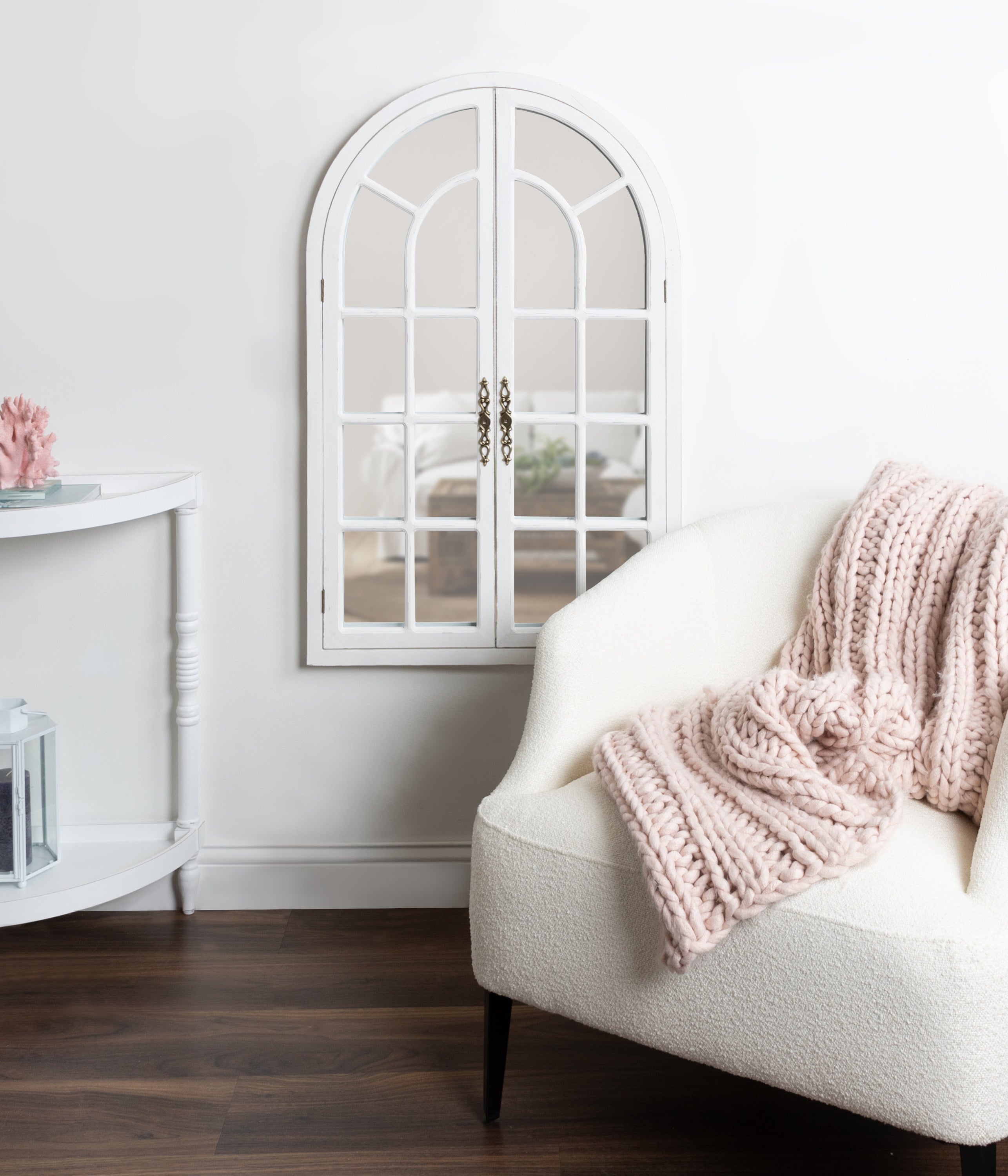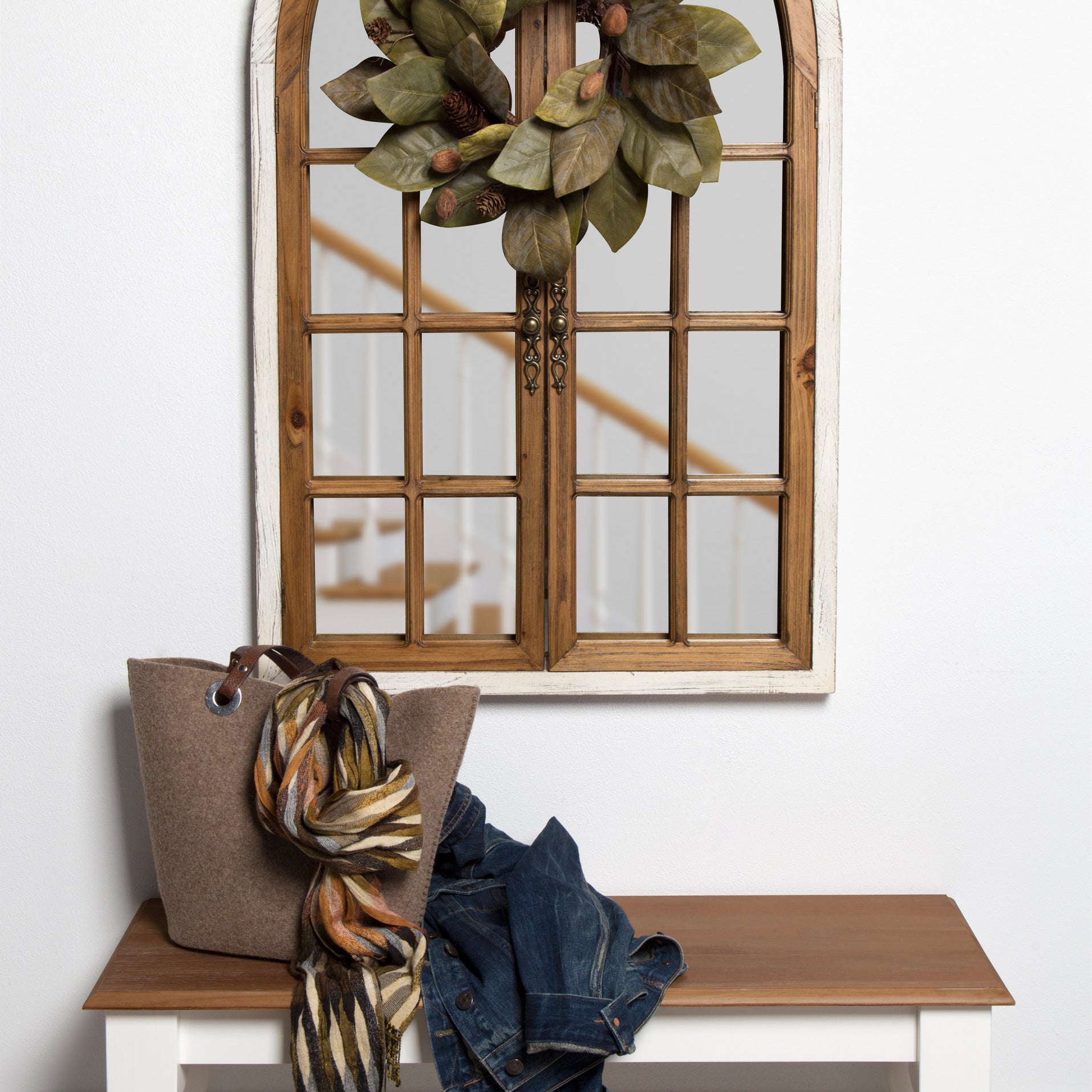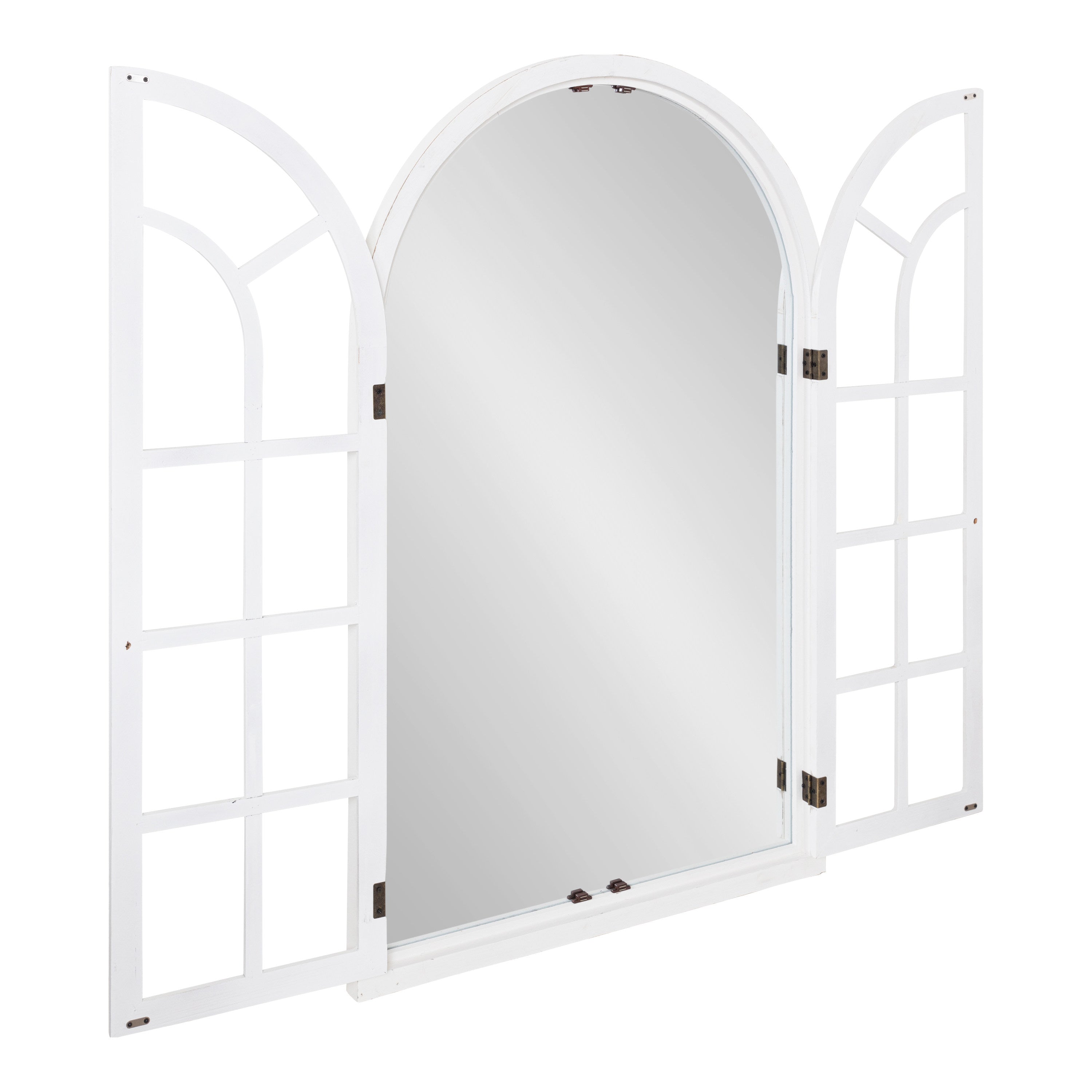 Craft a beautiful farmhouse theme within your favorite living space with the Boldmere arched wall mirror. Inspired by rustic farmhouses, the Boldmere has a window-inspired look with a latched two-door design. It's fantastic for bringing in light and creating a more open-concept space. It's fantastic for providing a beautiful farmhouse charm to any living room, bedroom, entryway, or bathroom.
