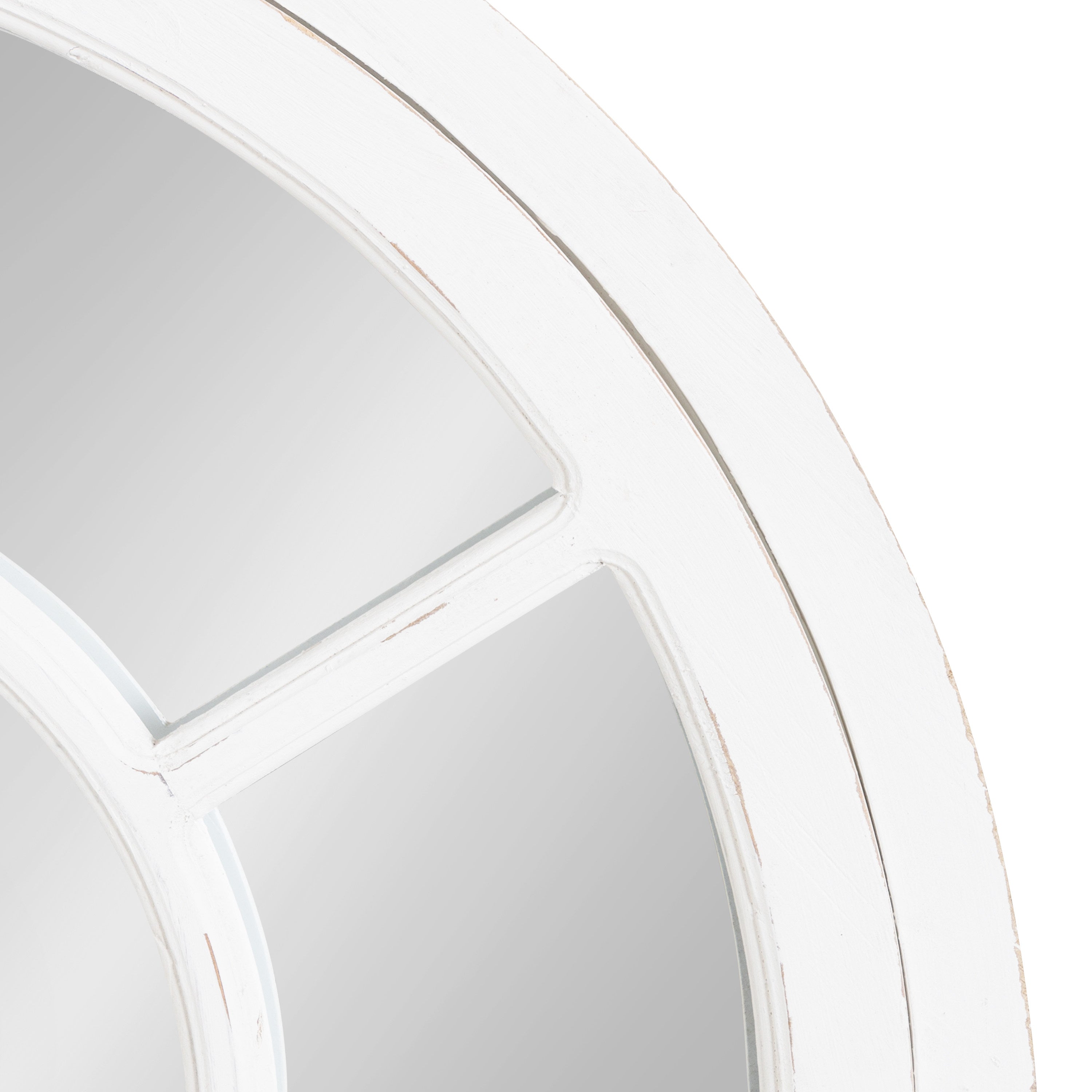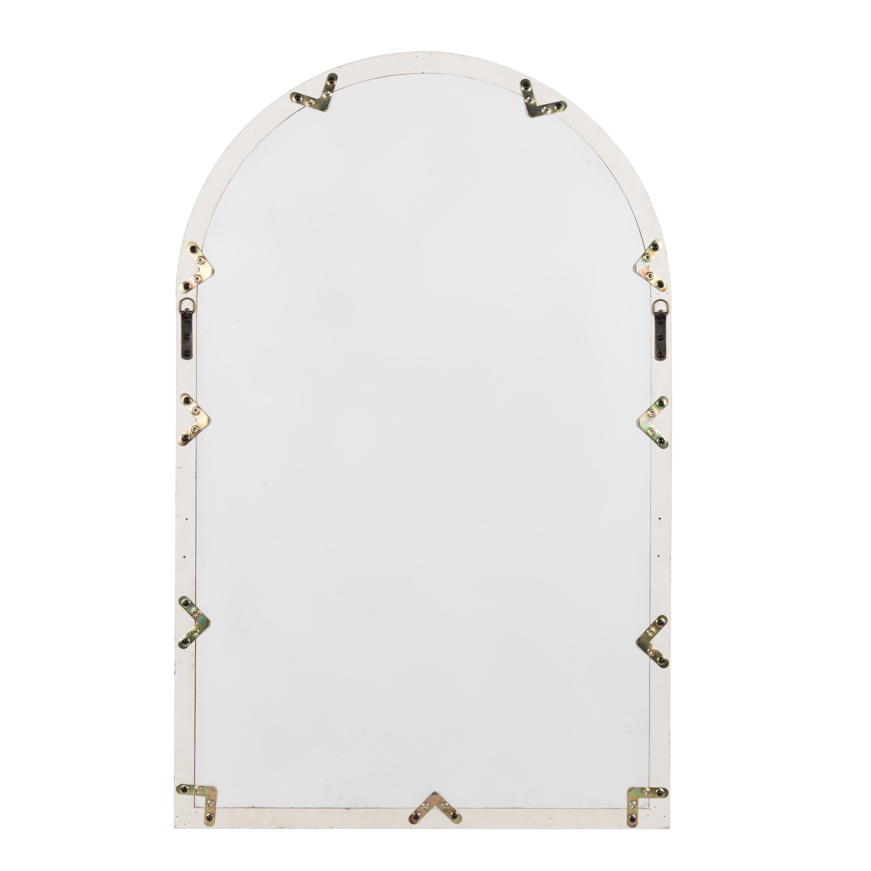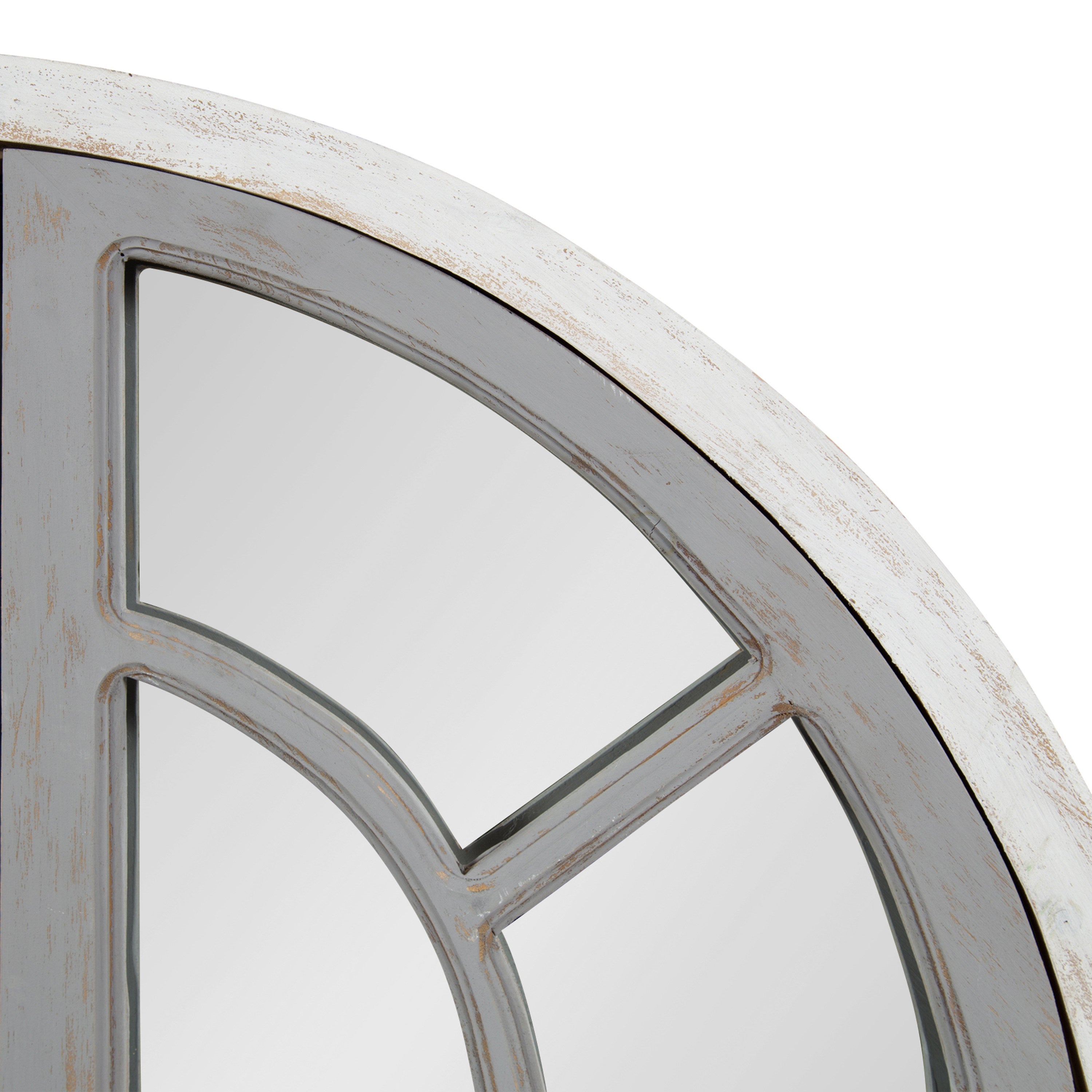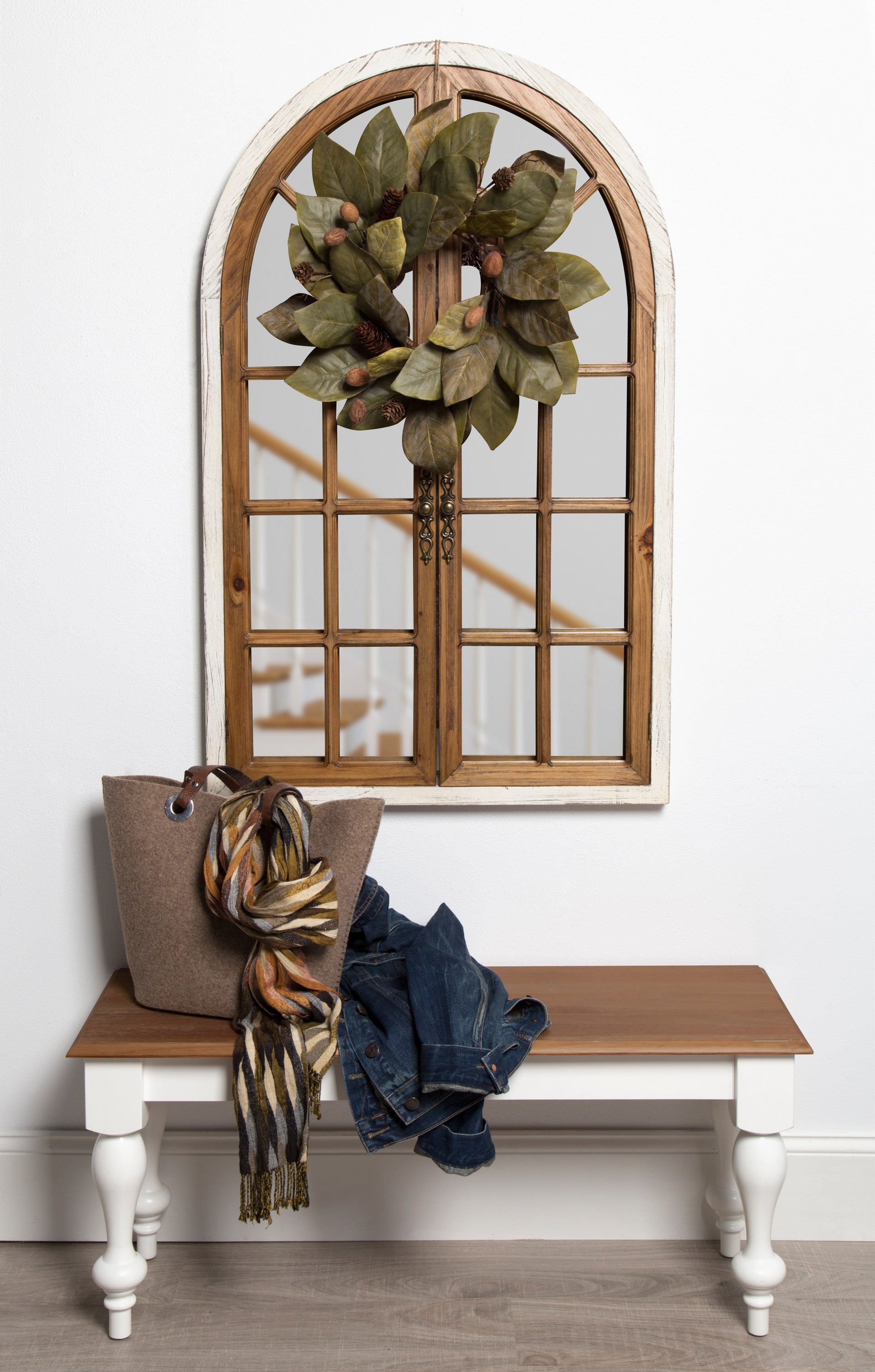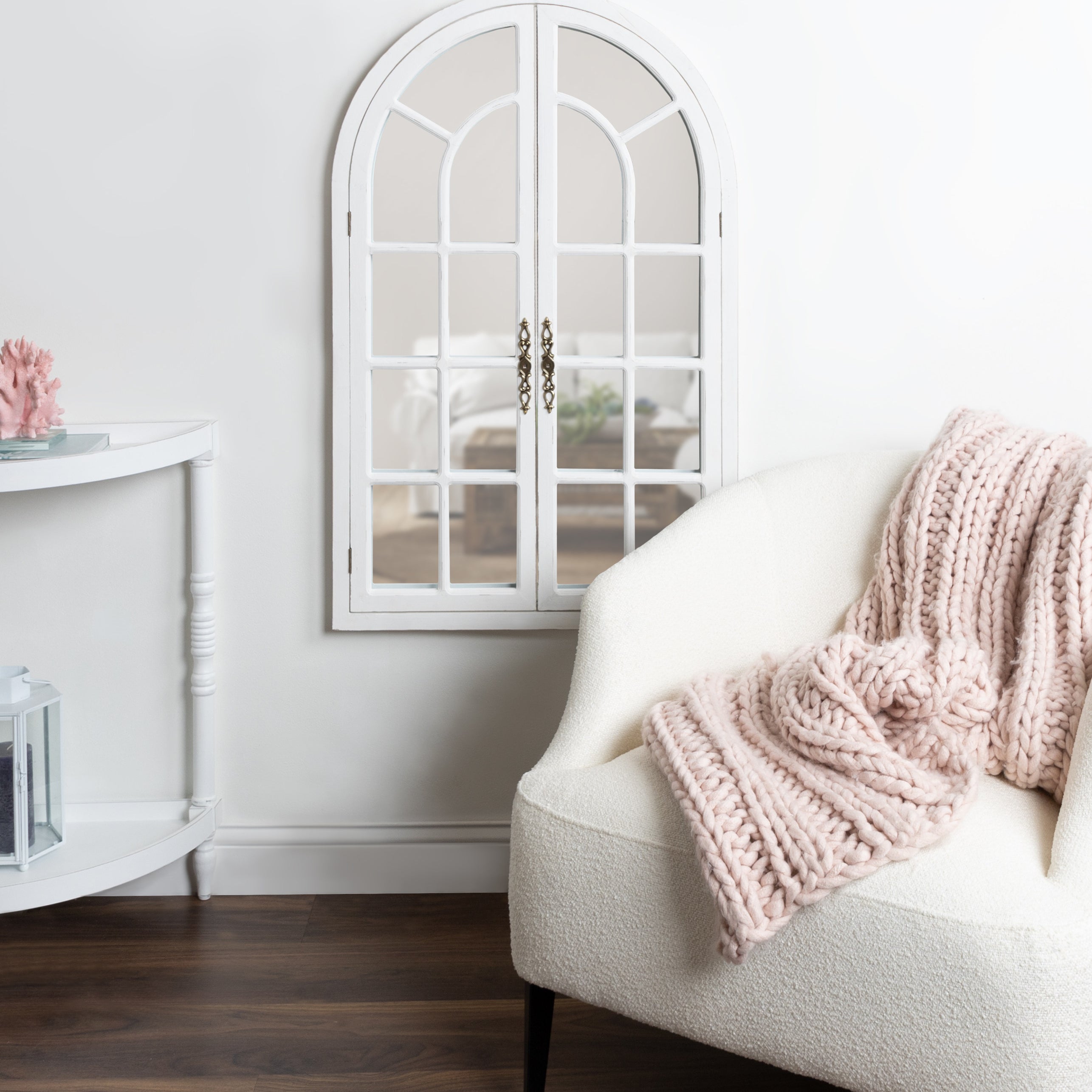 Craft a beautiful farmhouse theme within your favorite living space with the Boldmere arched wall mirror. Inspired by rustic farmhouses, the Boldmere has a window-inspired look with a latched two-door design. It's fantastic for bringing in light and creating a more open-concept space. It's fantastic for providing a beautiful farmhouse charm to any living room, bedroom, entryway, or bathroom.