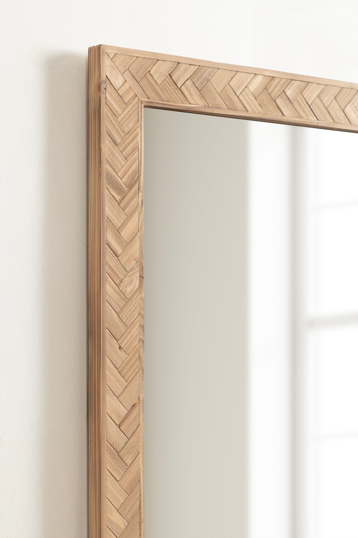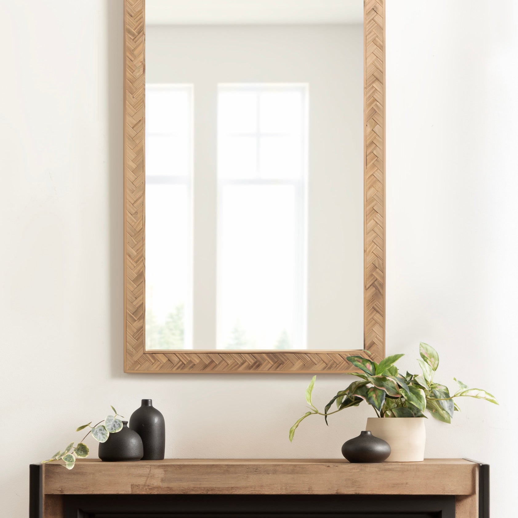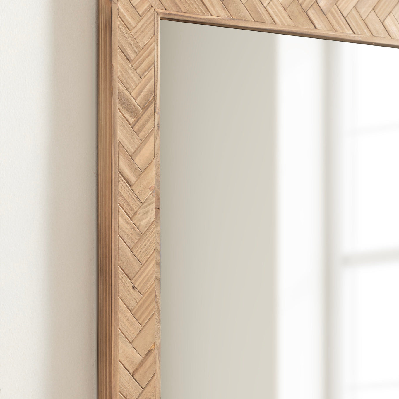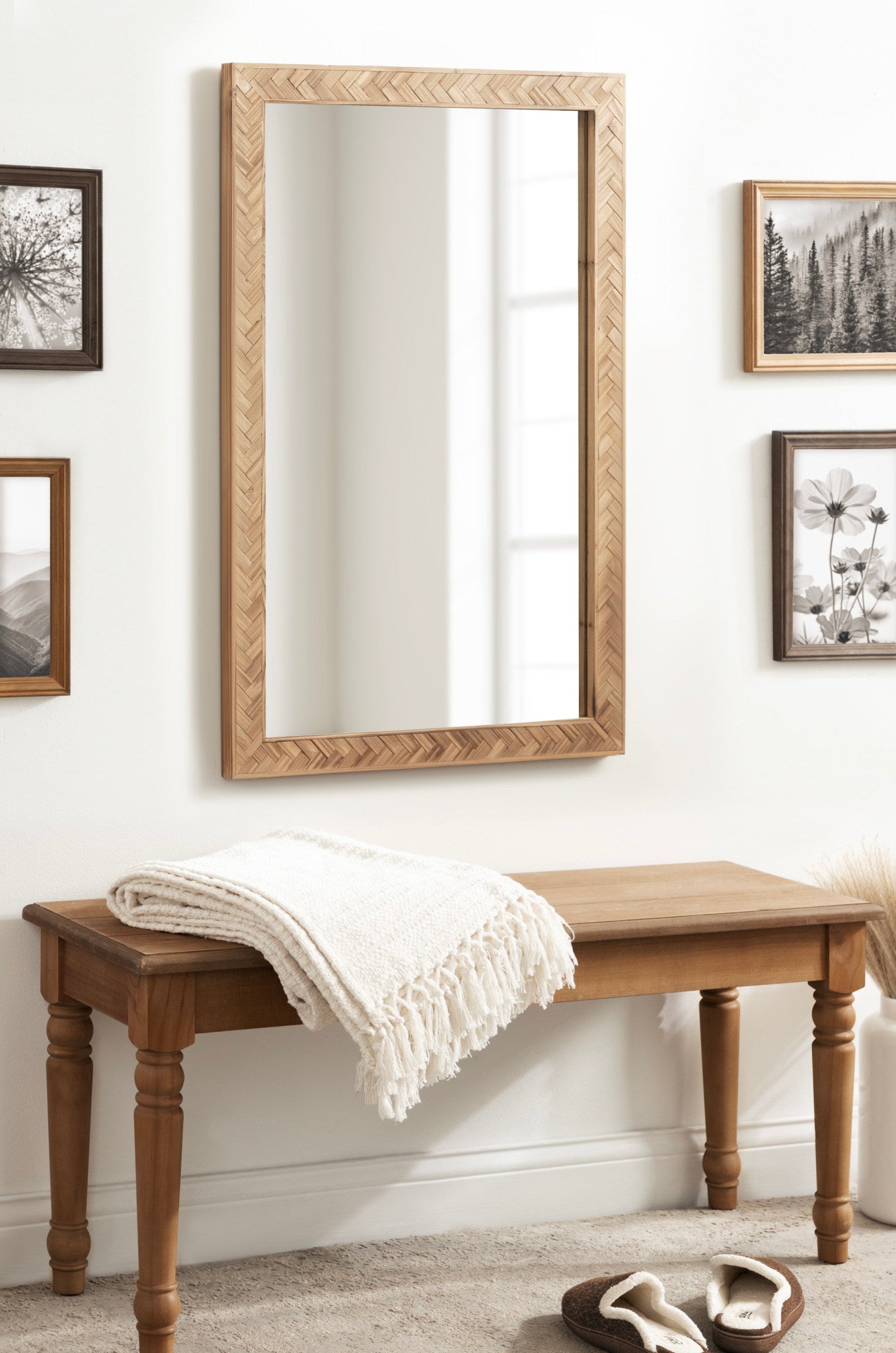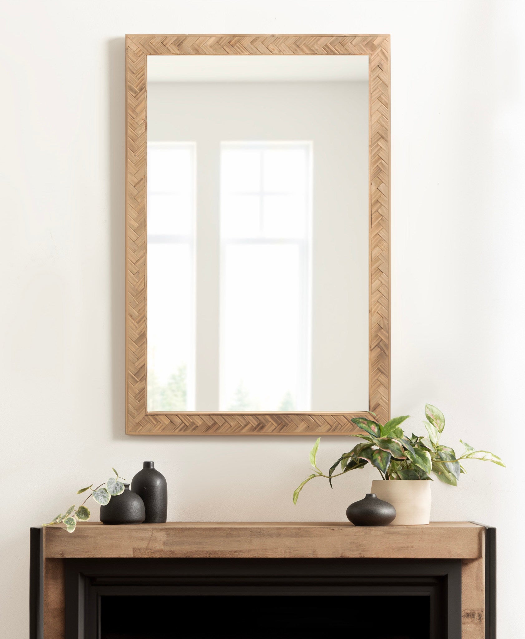 Create a coastal aesthetic in your home with this eclectic, natural Braywood mirror. This beautiful mirror is the epitome of organic modern design, featuring a unique pieced wood look on the frame that pops off the wall. The trendy chevron-patterned frame is made from solid wood, showing off its rich, authentic look through organic wood grain variations. The classic rectangular shape emphasizes its unique look as it works well all throughout your home. This coastal mirror features a sizable reflective surface, providing an accent piece that adds vibrancy and openness to any room of your home. Hang this stunning piece of wall decor in your bedroom, entryway, dining room, living room, or even bathroom with its organic modern mirror design. Hang the coastal Braywood wall mirror in a matter of minutes with the convenient D-ring hangers attached to the back of the frame.