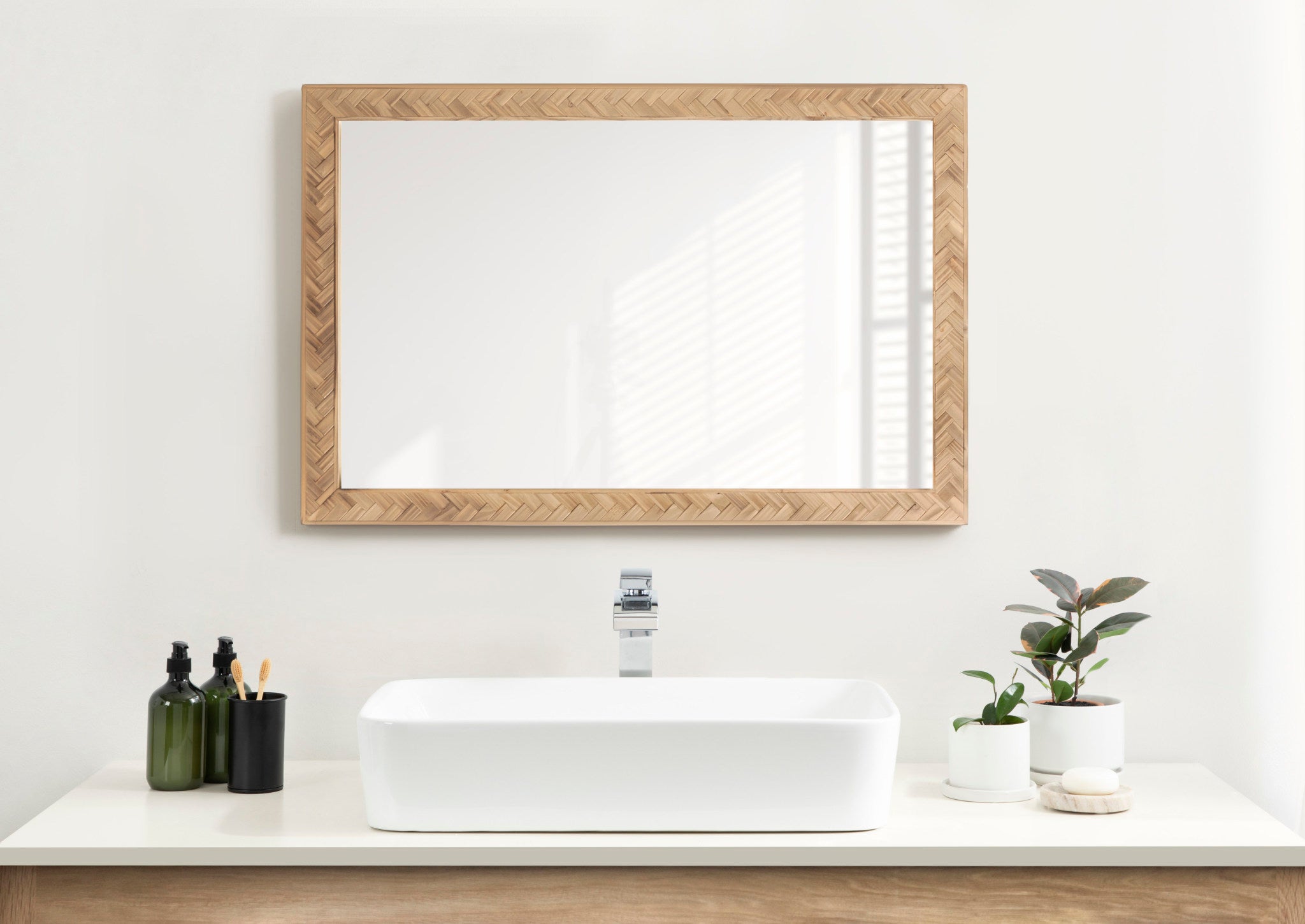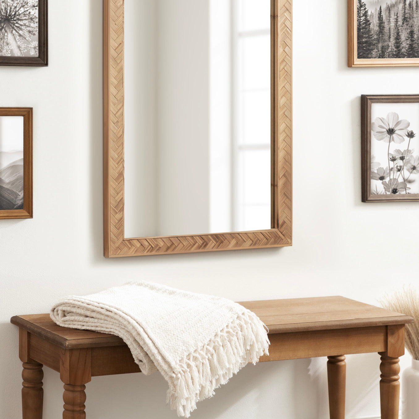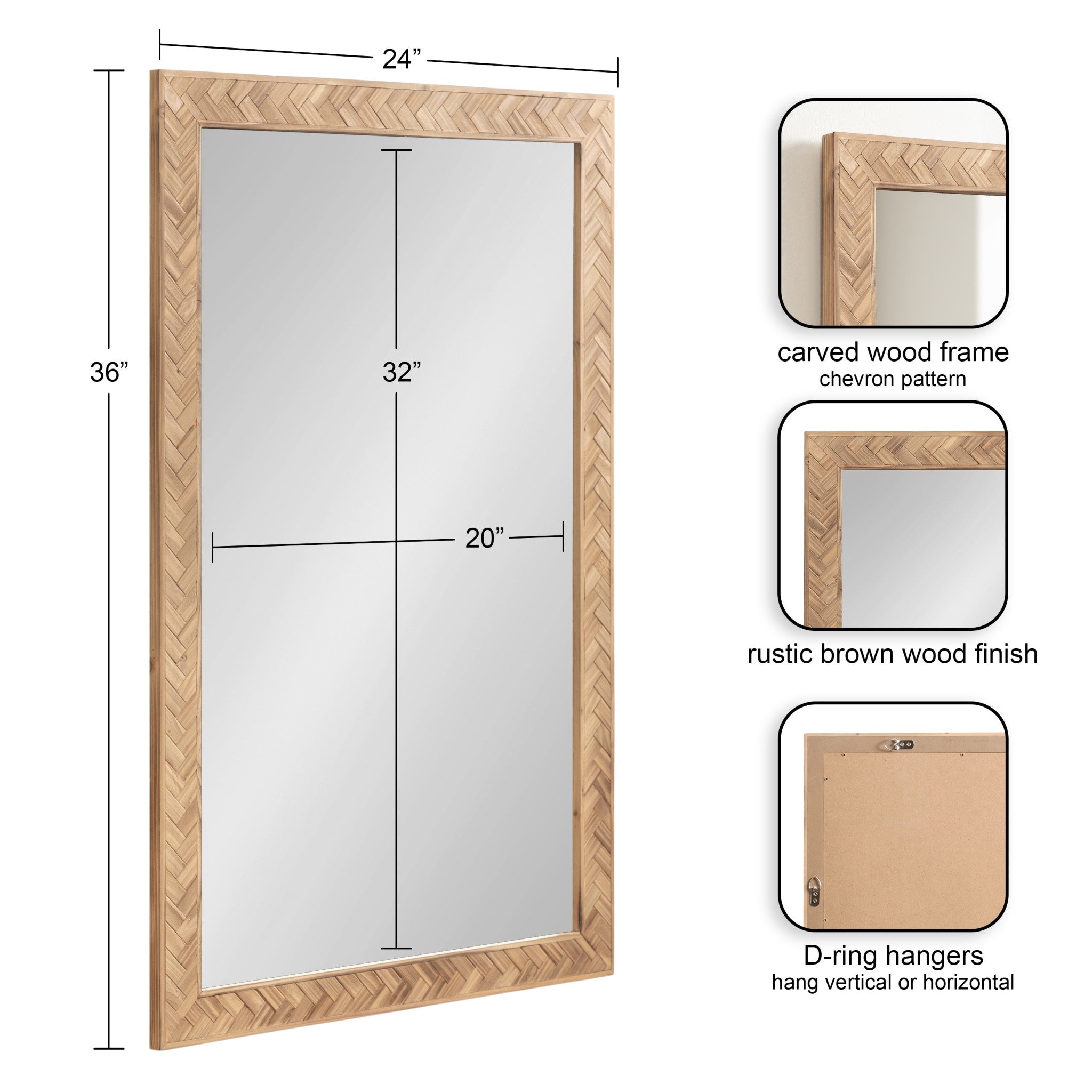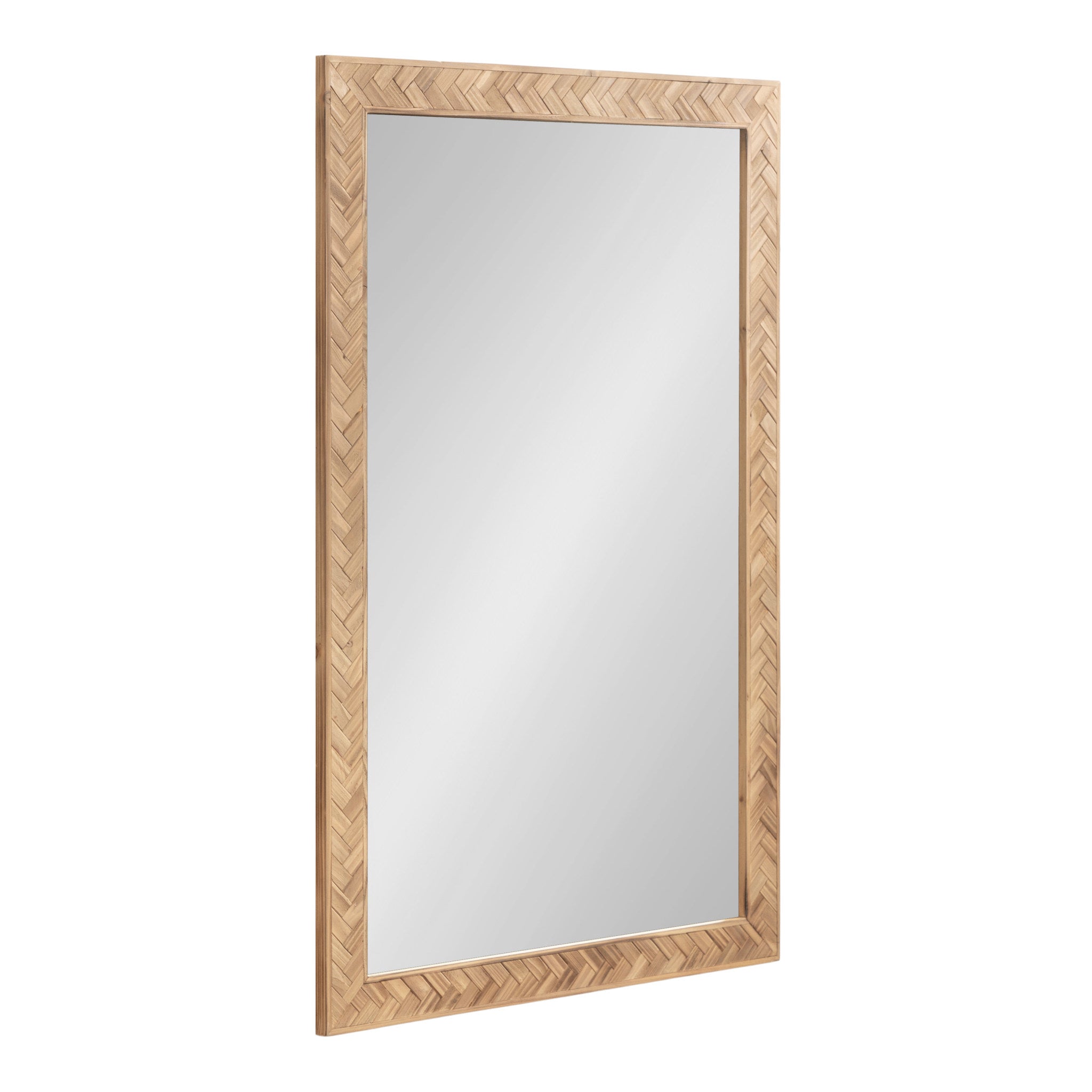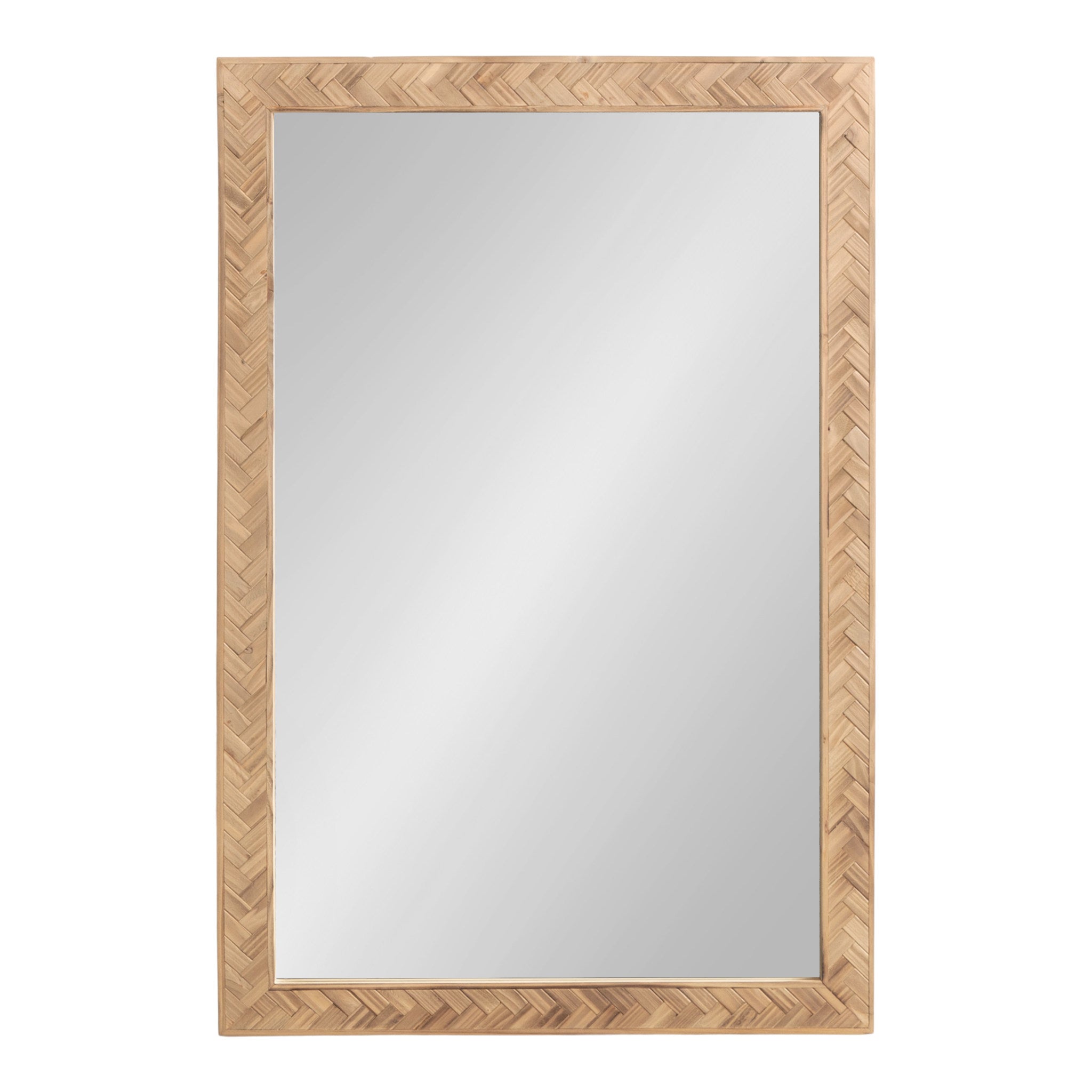 Create a coastal aesthetic in your home with this eclectic, natural Braywood mirror. This beautiful mirror is the epitome of organic modern design, featuring a unique pieced wood look on the frame that pops off the wall. The trendy chevron-patterned frame is made from solid wood, showing off its rich, authentic look through organic wood grain variations. The classic rectangular shape emphasizes its unique look as it works well all throughout your home. This coastal mirror features a sizable reflective surface, providing an accent piece that adds vibrancy and openness to any room of your home. Hang this stunning piece of wall decor in your bedroom, entryway, dining room, living room, or even bathroom with its organic modern mirror design. Hang the coastal Braywood wall mirror in a matter of minutes with the convenient D-ring hangers attached to the back of the frame.