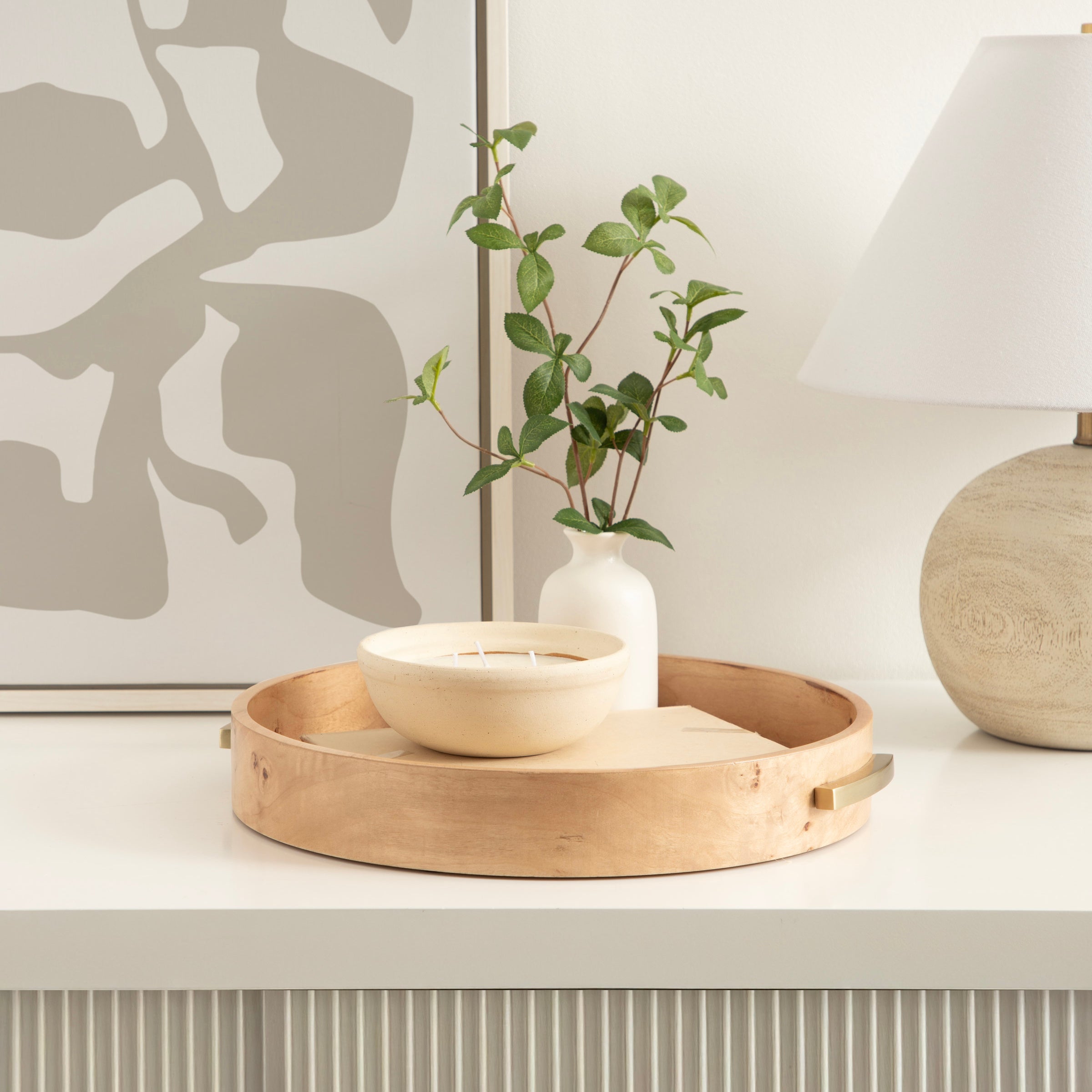 Bring transitional style into your home with this charming round burlwood tray with metal handles. Place this tray on your entrance console table as a trinket tray to hold your keys and change as you come and go. This circular tray can also be used as a decorative accent on an ottoman to hold your beverages or on your vanity for makeup organization. Constructed of sturdy wooden material with a burlwood veneer and polished metal handles, this tray is dependable to carry your cocktails from room to room! An update to the classic accent tray, the base has a raised edge to keep your items more secure when transporting them. From a dining room table to a living room ottoman, this circle tray brings tremendous versatility anywhere throughout your home. Its versatile size makes it great for serving snacks on little plates or as a decorative display option.