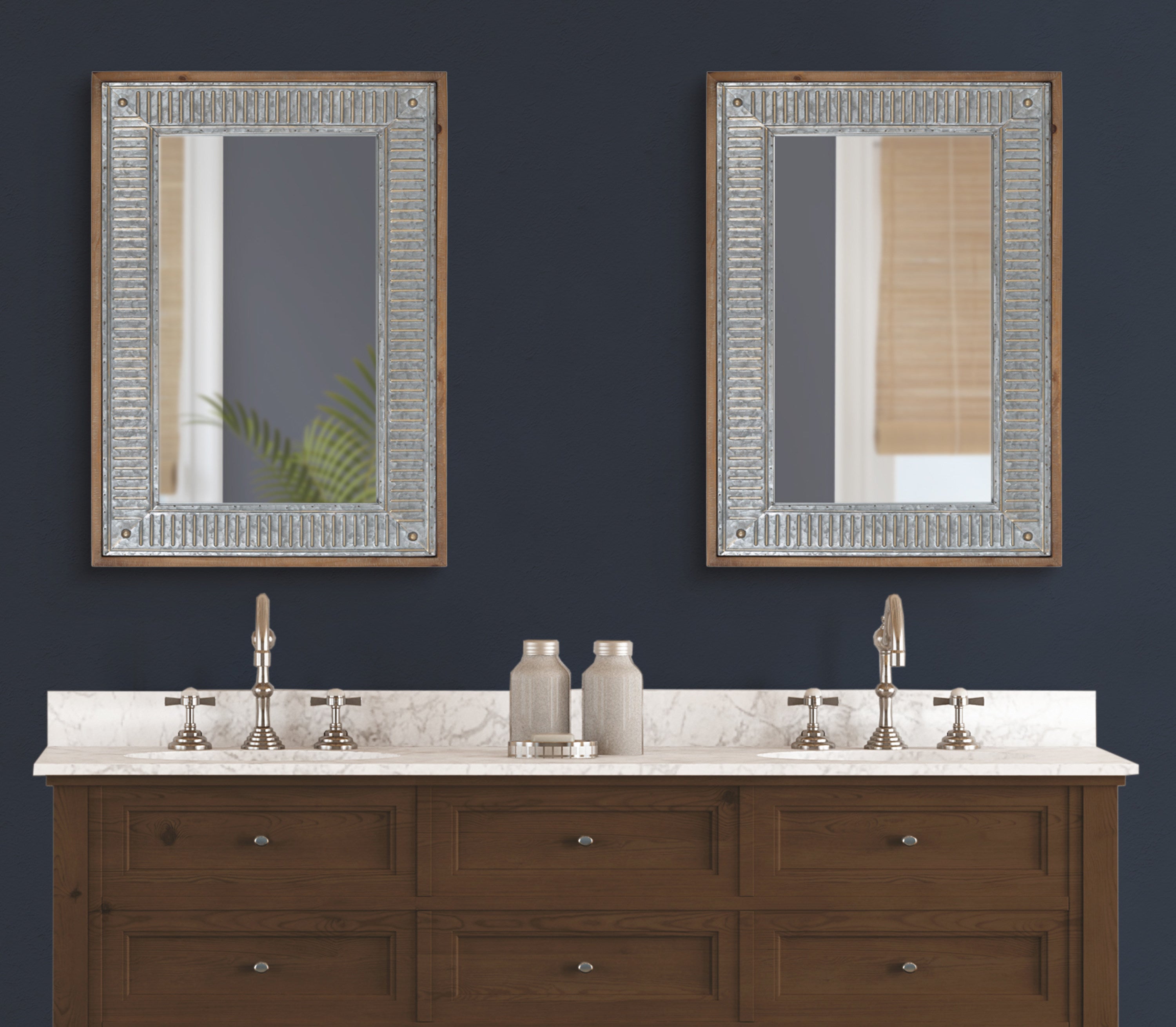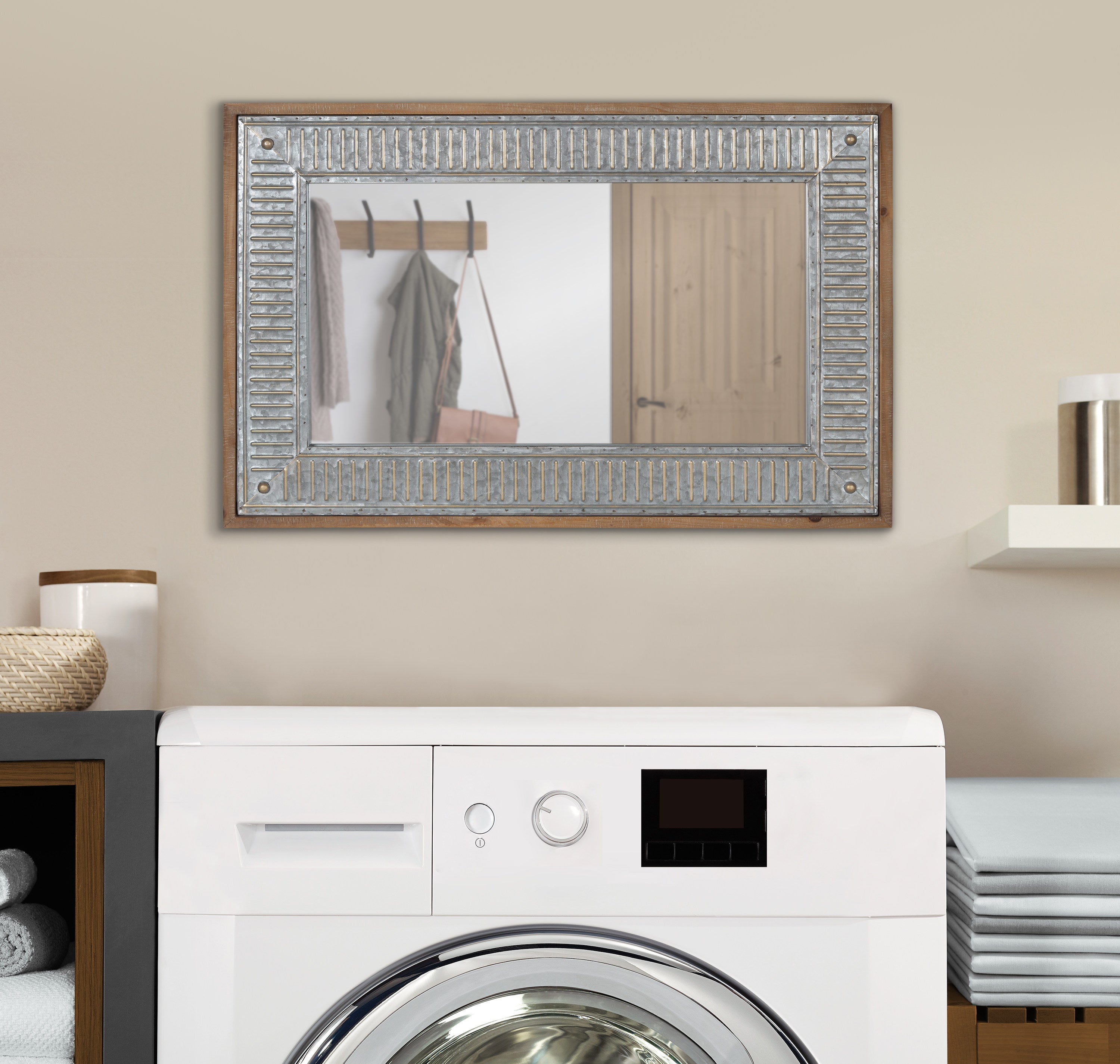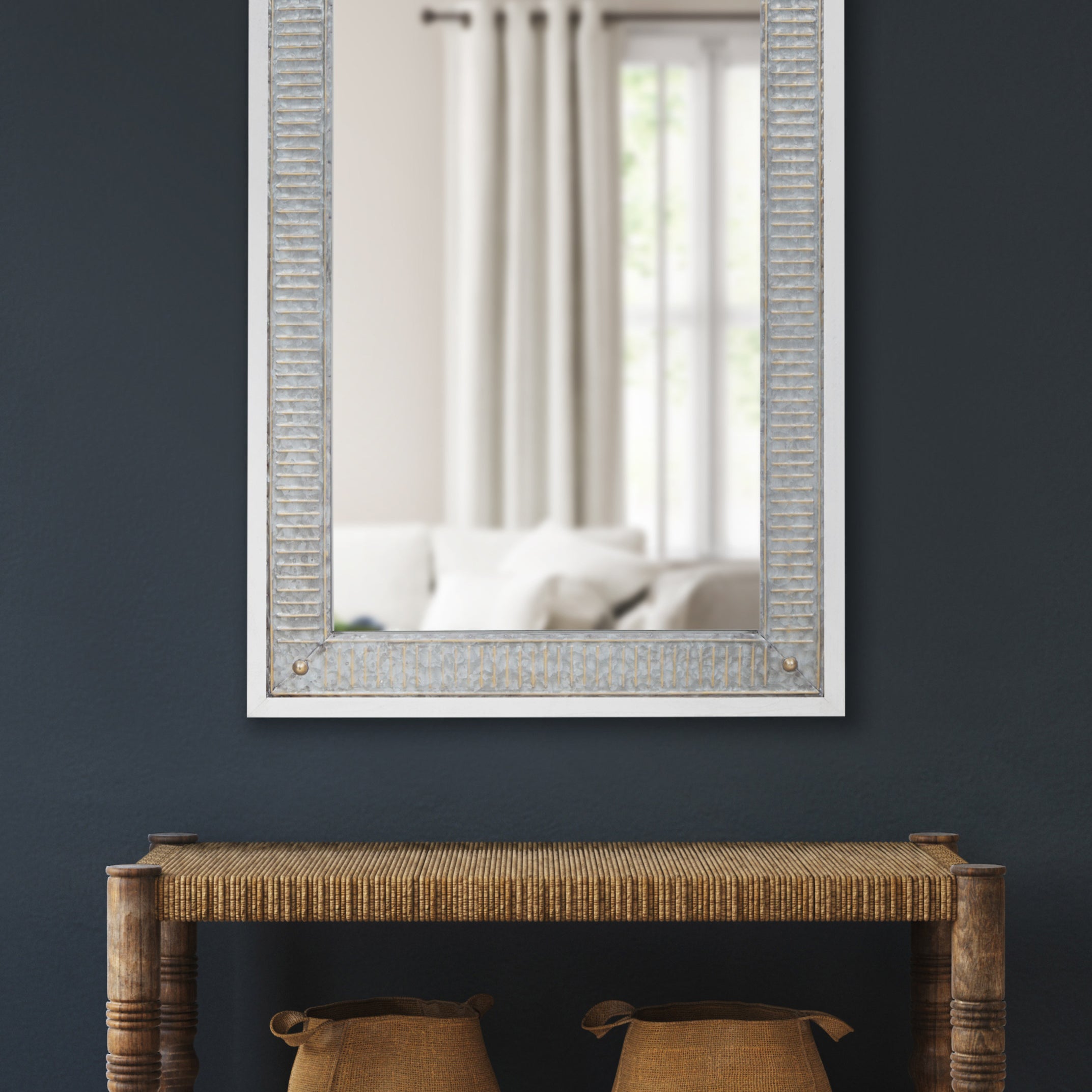 The charming Deely wall mirror is a fantastic way to bring a rustic aesthetic to your home. Inspired by vintage farmhouses, the Deely features a wooden frame with a lovely white finish. Its signature look is amplified by its vintage interior frame, composed of a rustic galvanized metal. This sophisticated wall accent is perfect for delivering the quality craftsmanship of antiquity without the hassle of doing a flea market flip. Use the sophisticated look of the Deely mirror as a way to add dimension and light to your living room, bathroom, entryway, or bedroom. It hangs both vertically and horizontally, giving you an eye-catching statement that's not only beautiful but versatile.