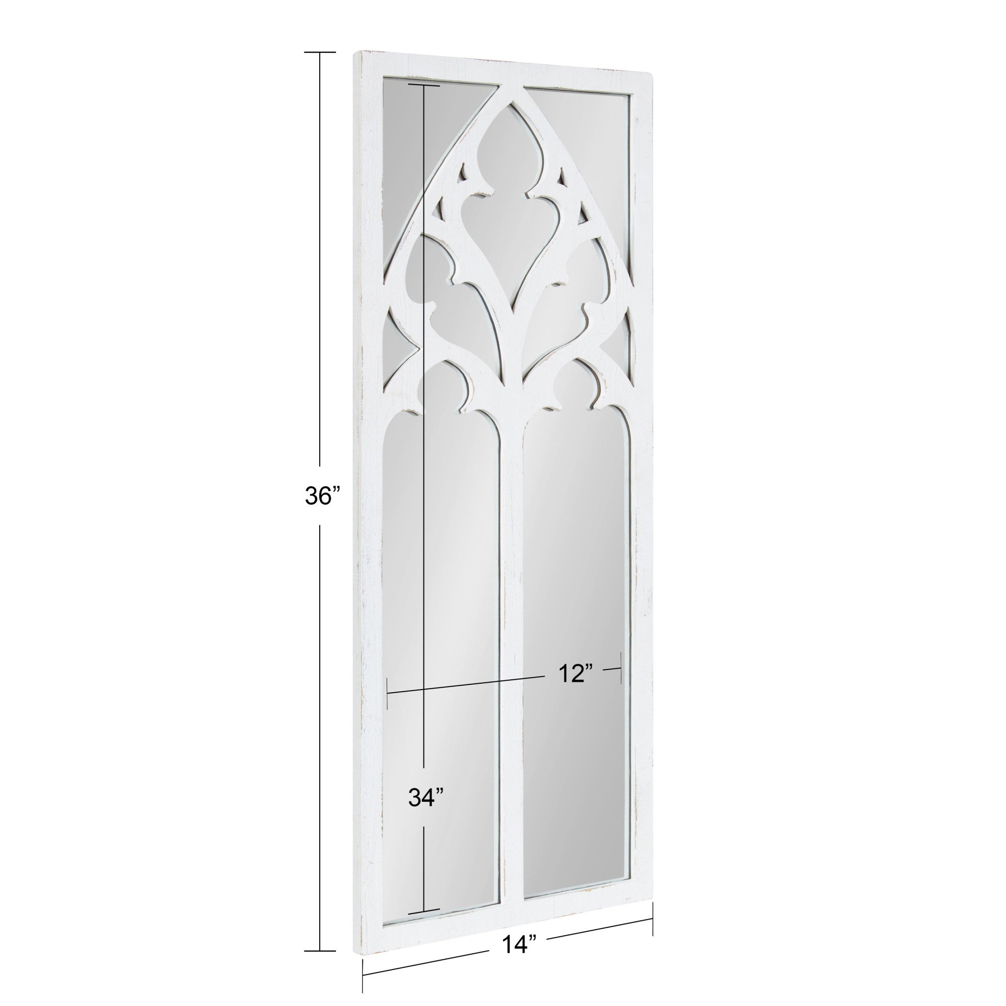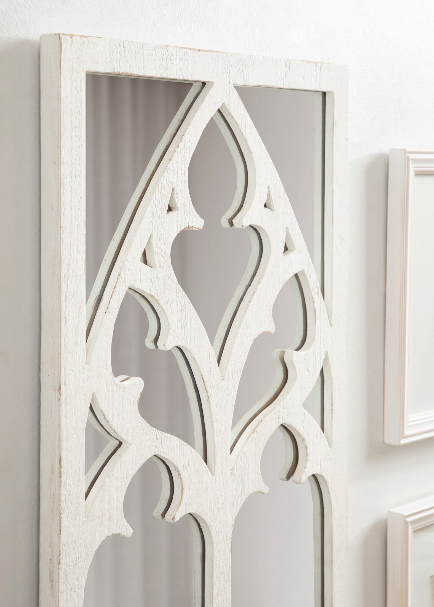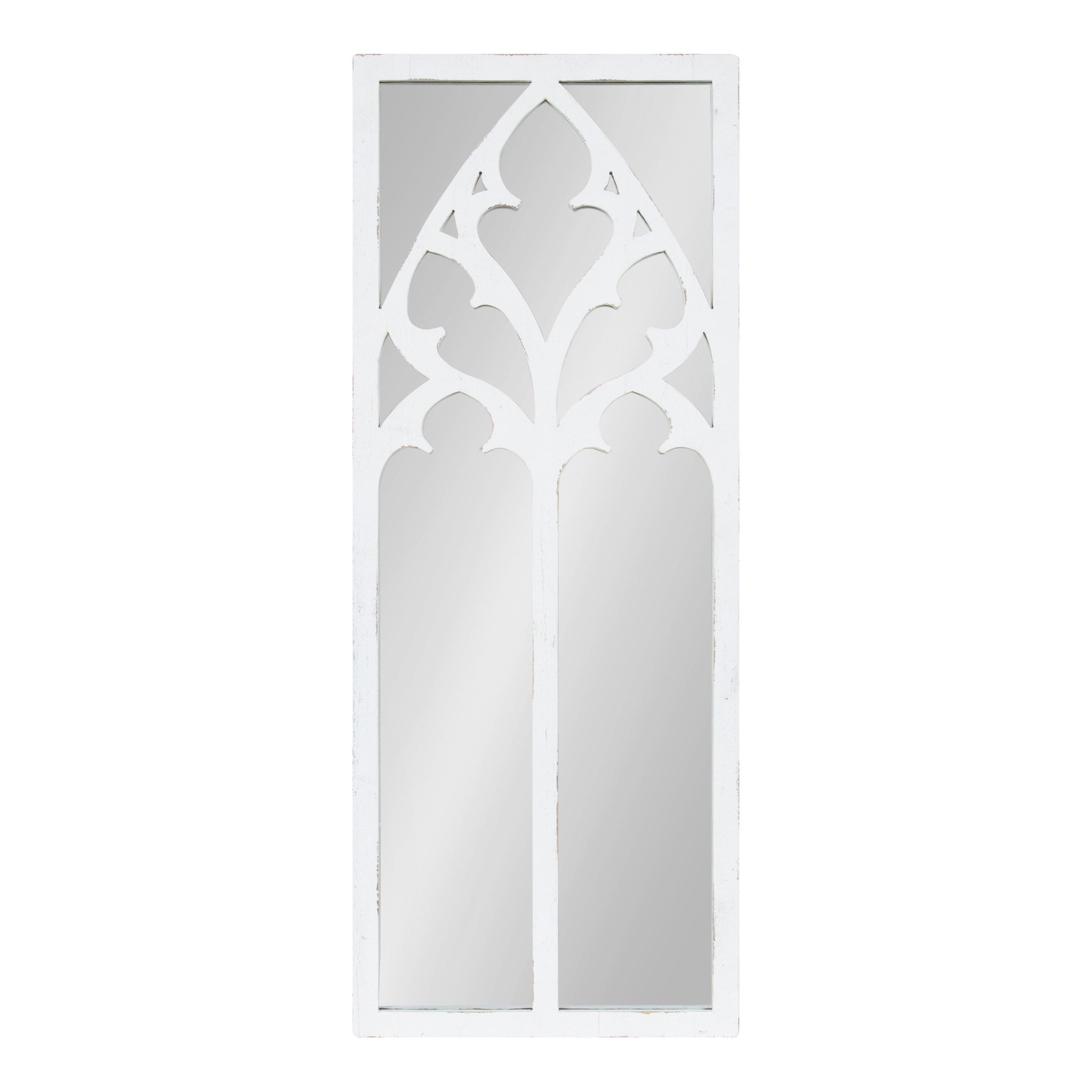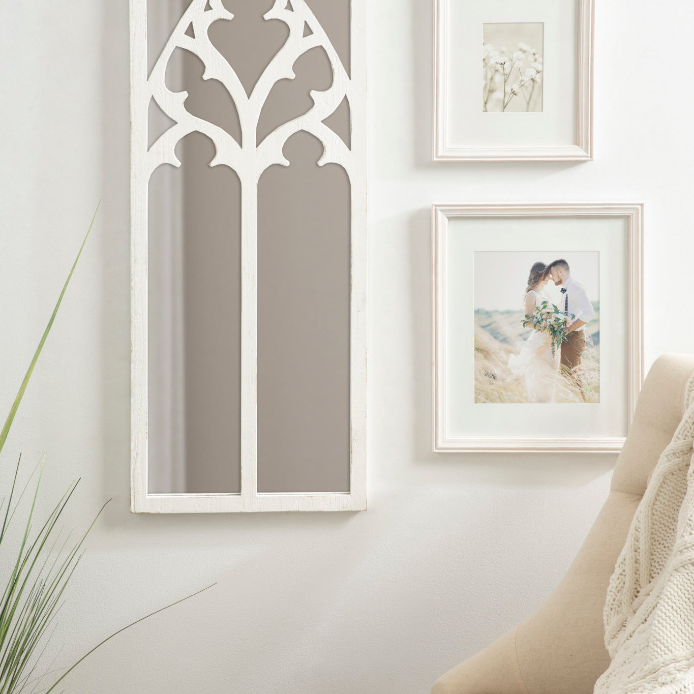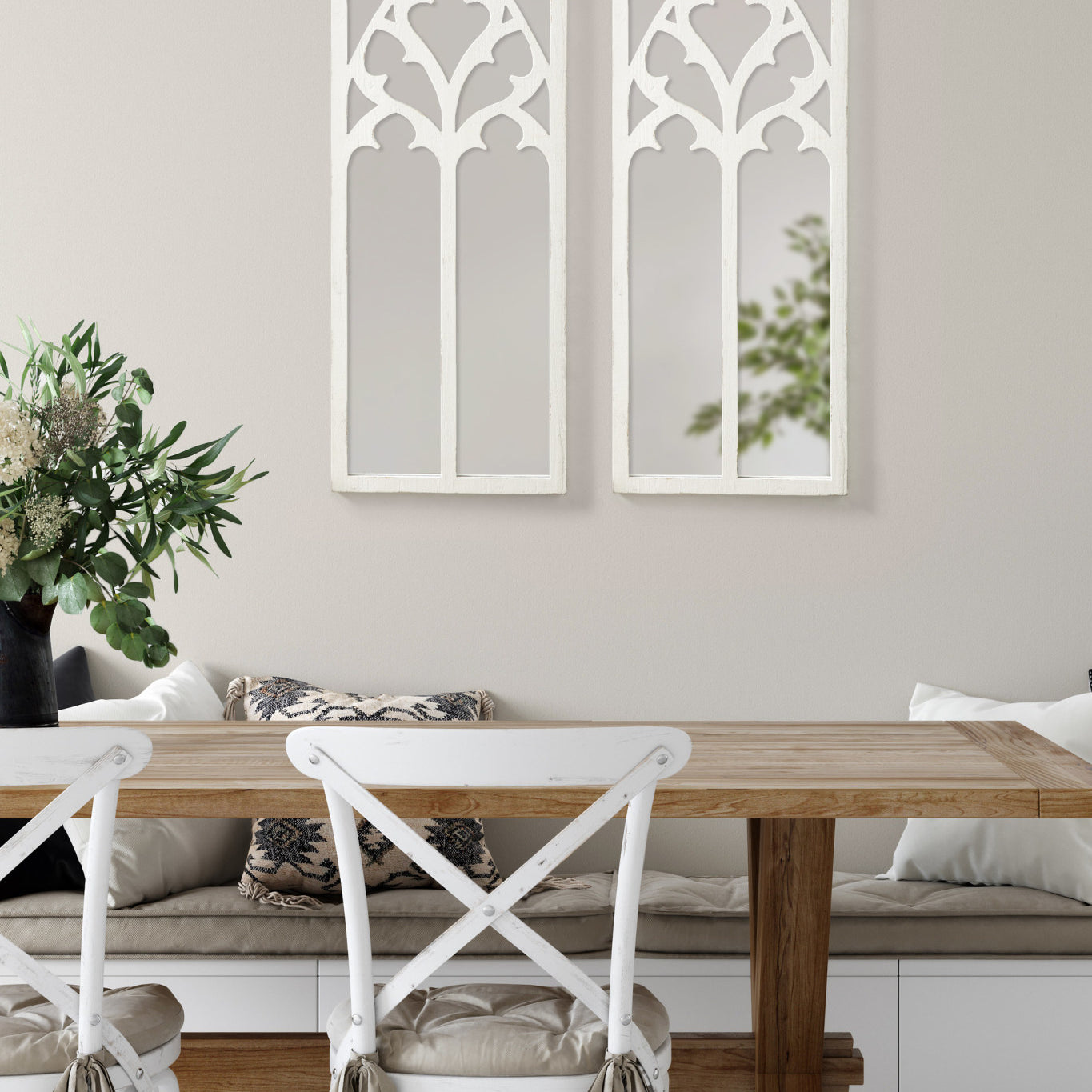 Decorate your beautiful farmhouse home with the lovely Dutchess wall mirror. Inspired by vintage decor, the Dutchess mirror has a solid wood frame with a wood inlay reminiscent of cathedral or farmhouse windows. The arched inlay is an excellent symmetrical accent for any wall of your home. The Dutchess goes to work by adding vibrancy to any tall wall, reflecting more light throughout the room and enhancing the dimension. The traditional look of this mirror is sure to make all your guests' heads turn.