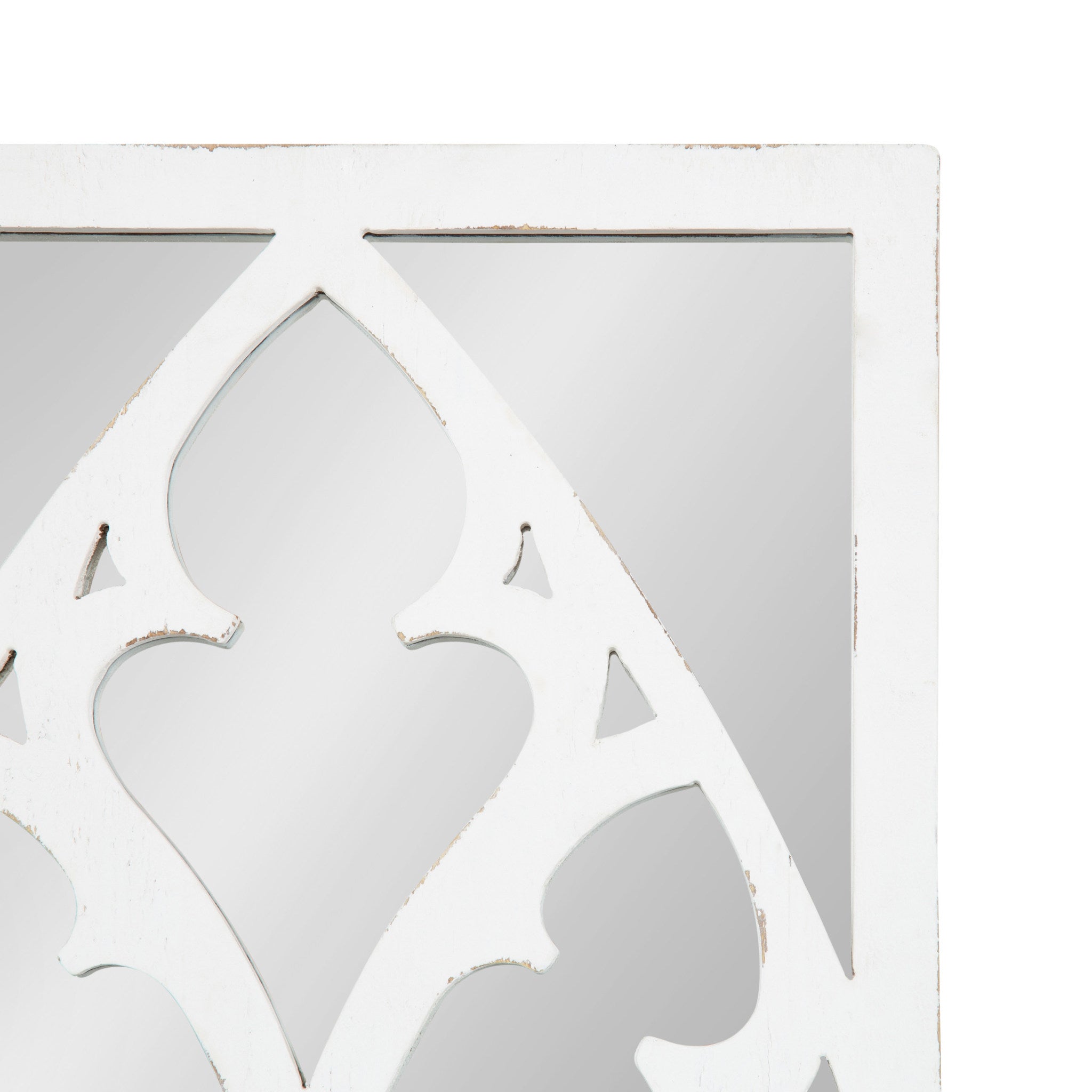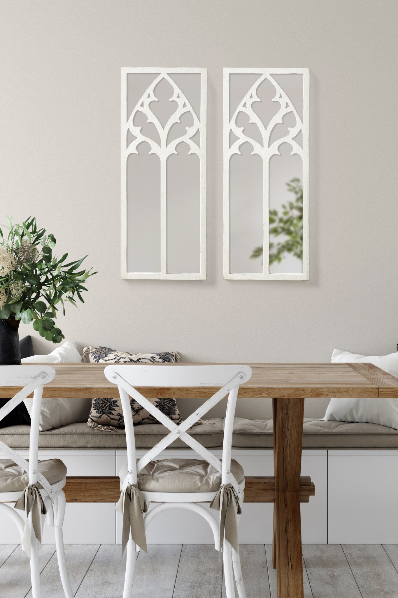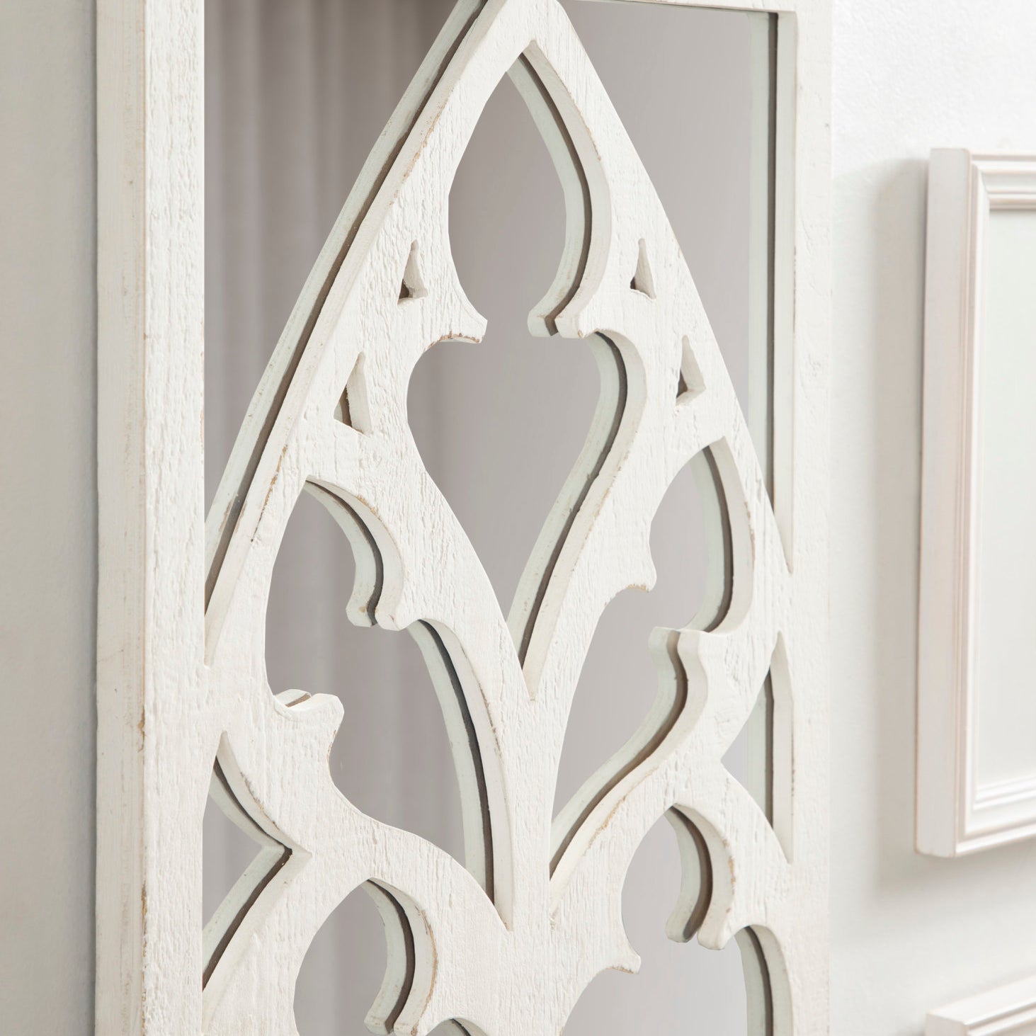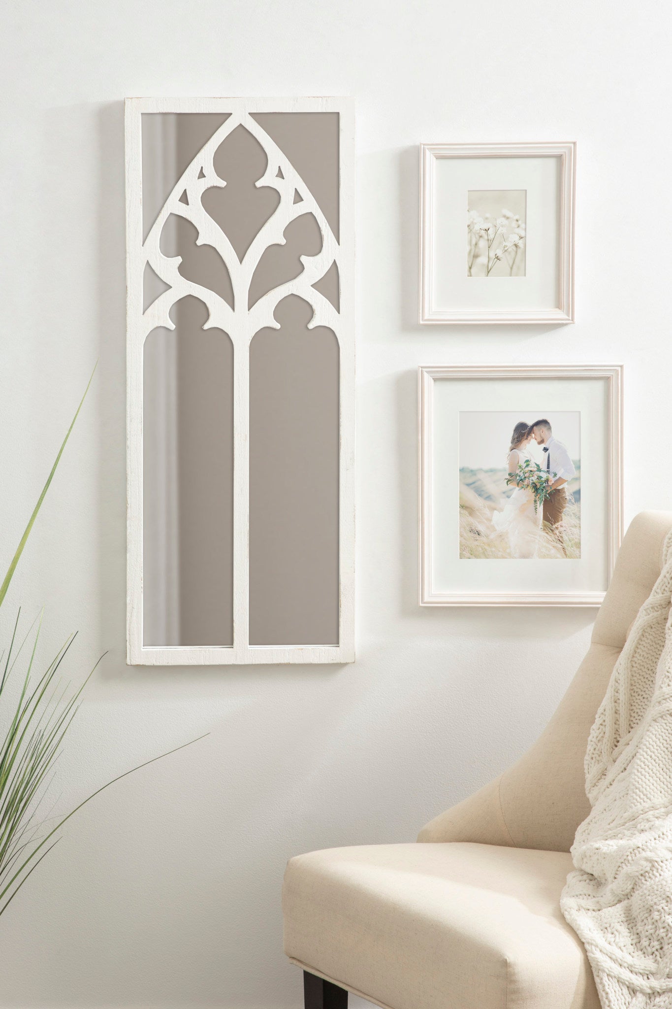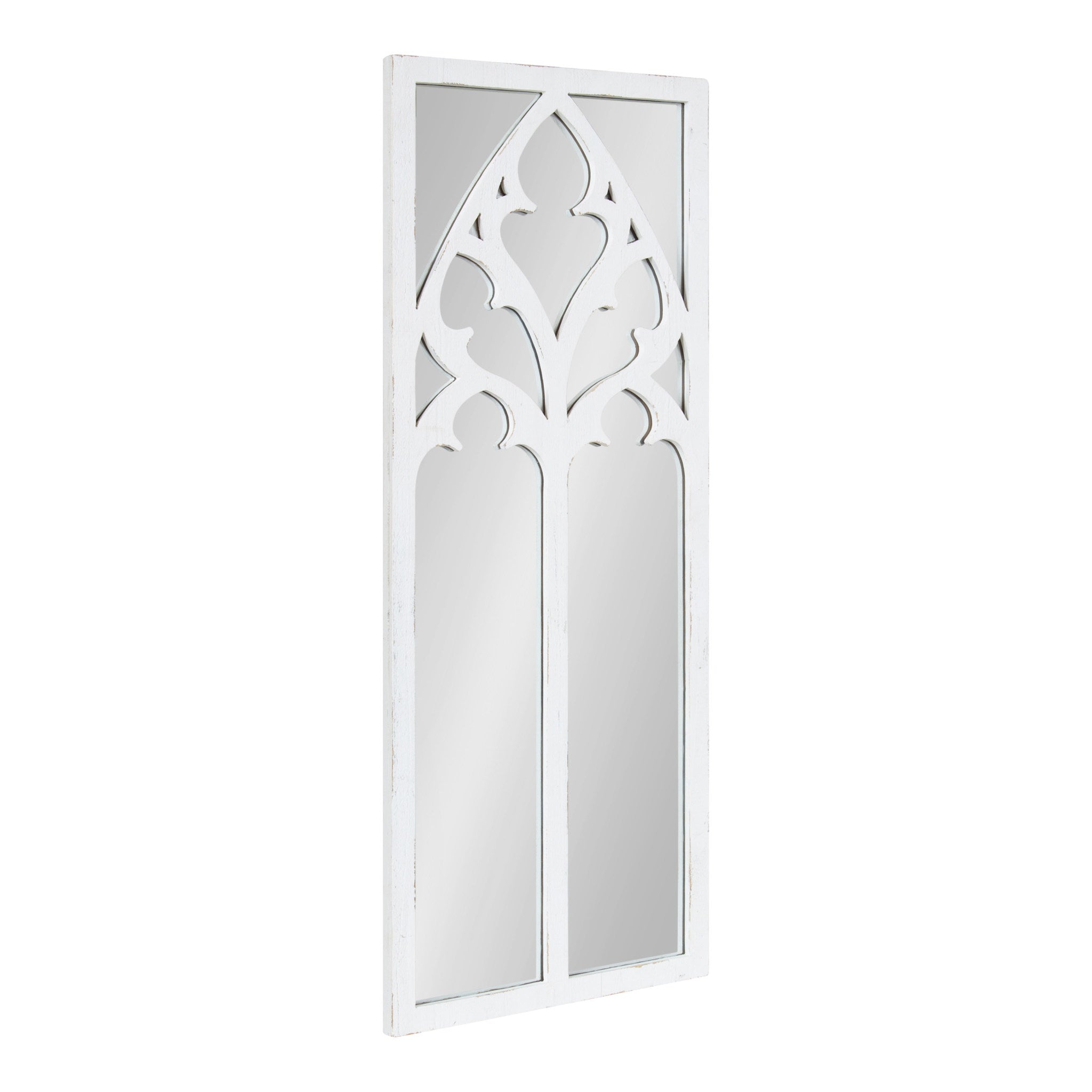 Decorate your beautiful farmhouse home with the lovely Dutchess wall mirror. Inspired by vintage decor, the Dutchess mirror has a solid wood frame with a wood inlay reminiscent of cathedral or farmhouse windows. The arched inlay is an excellent symmetrical accent for any wall of your home. The Dutchess goes to work by adding vibrancy to any tall wall, reflecting more light throughout the room and enhancing the dimension. The traditional look of this mirror is sure to make all your guests' heads turn.