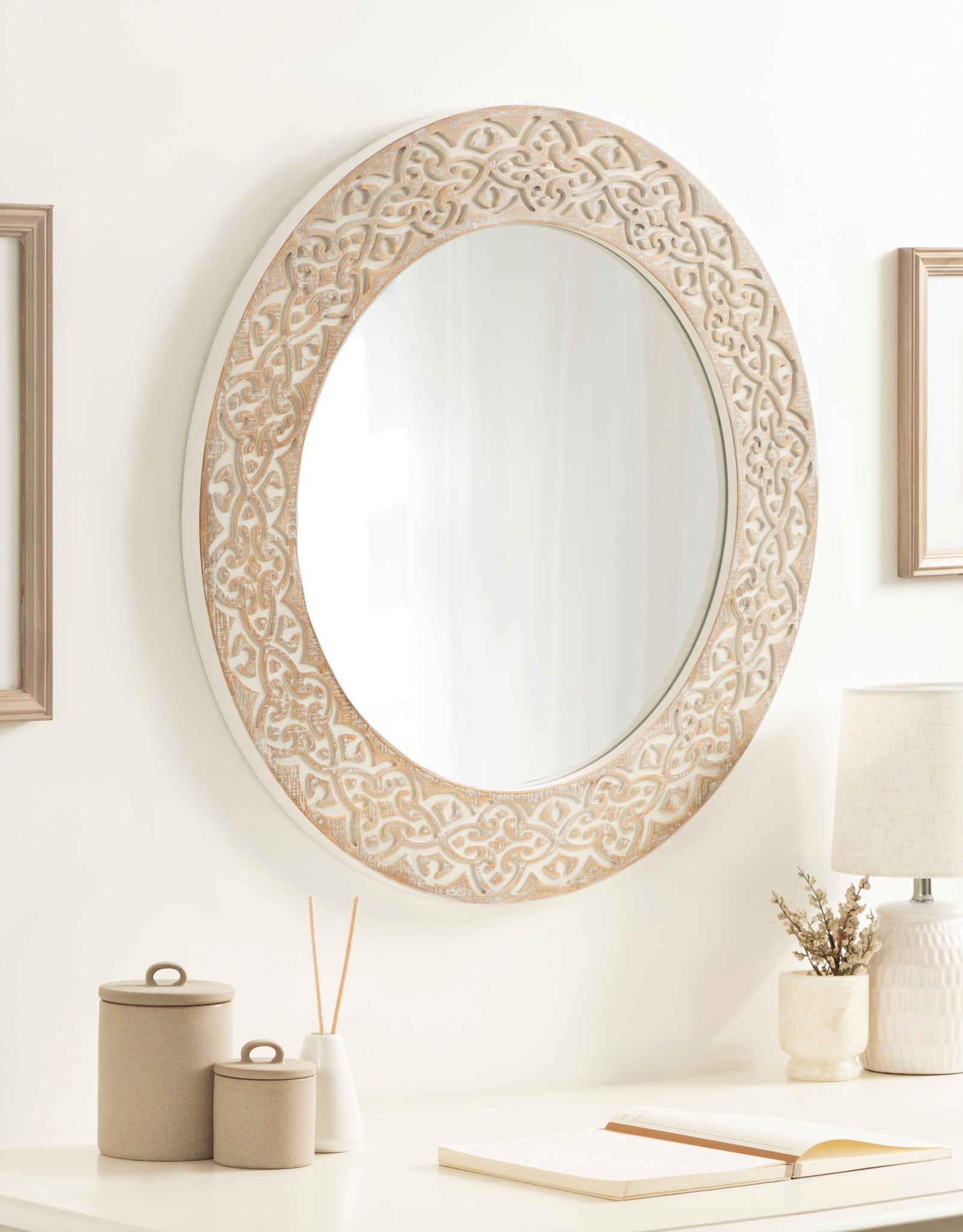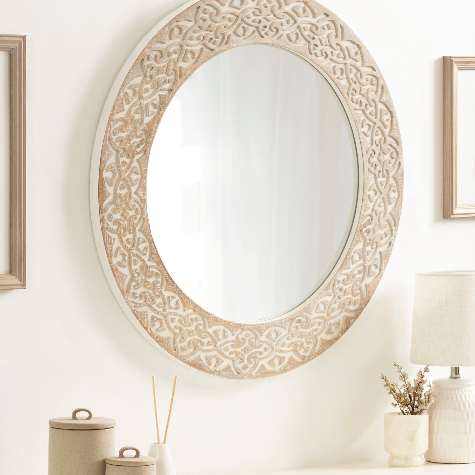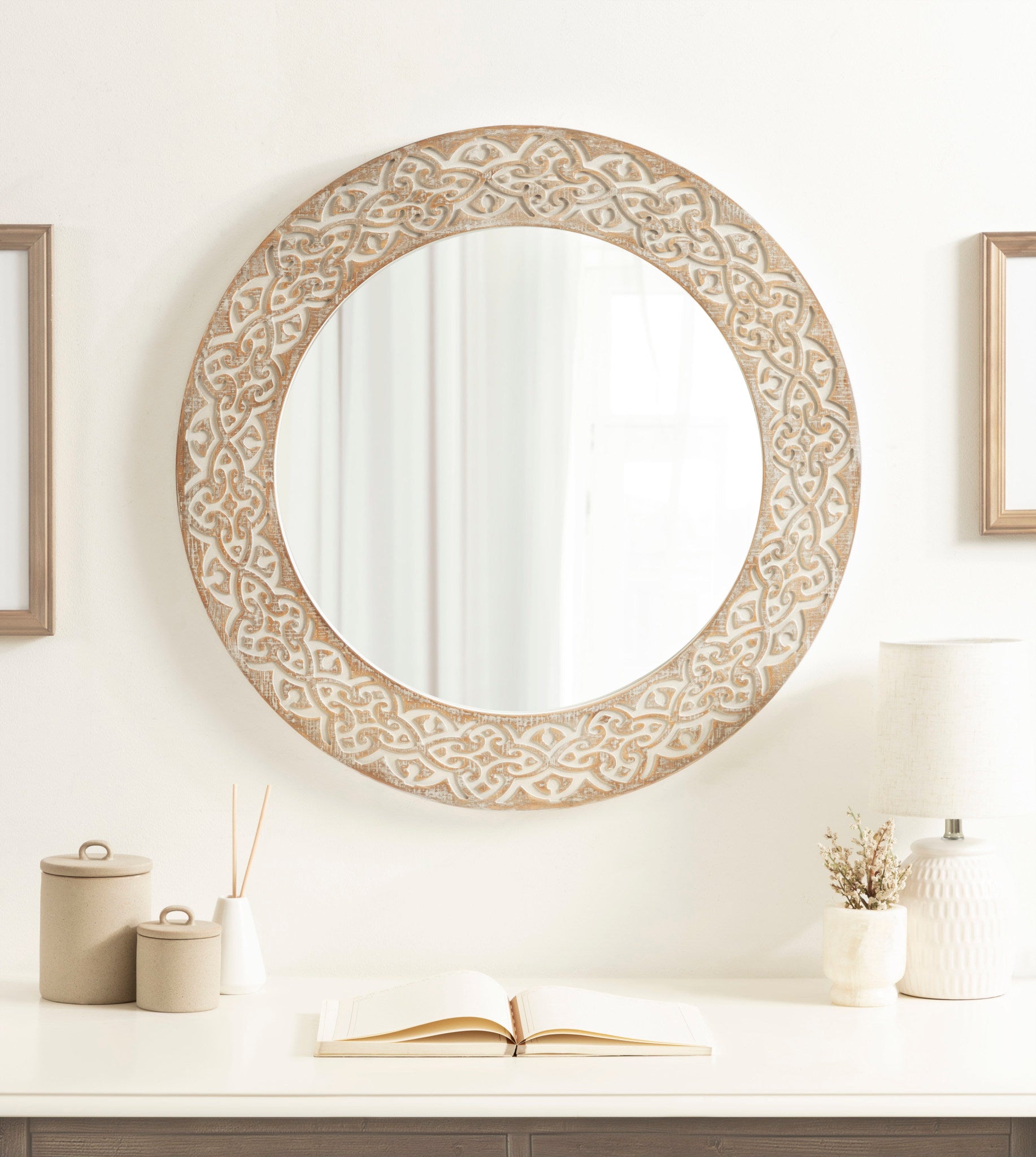 Add a stunning farmhouse statement to your home with the Engrahm round mirror. The Engrahm features a delightful carved pattern and paint distressing along its wide frame. That wide frame turns this piece into a unique statement with its textured engravings. As a versatile piece, the Engrahm wall mirror is a delightful statement to use in an entryway, a living room, a dining room, or as a round bathroom vanity mirror.