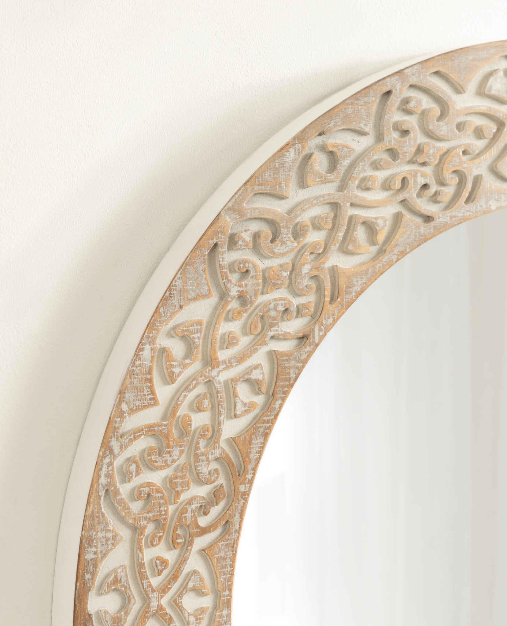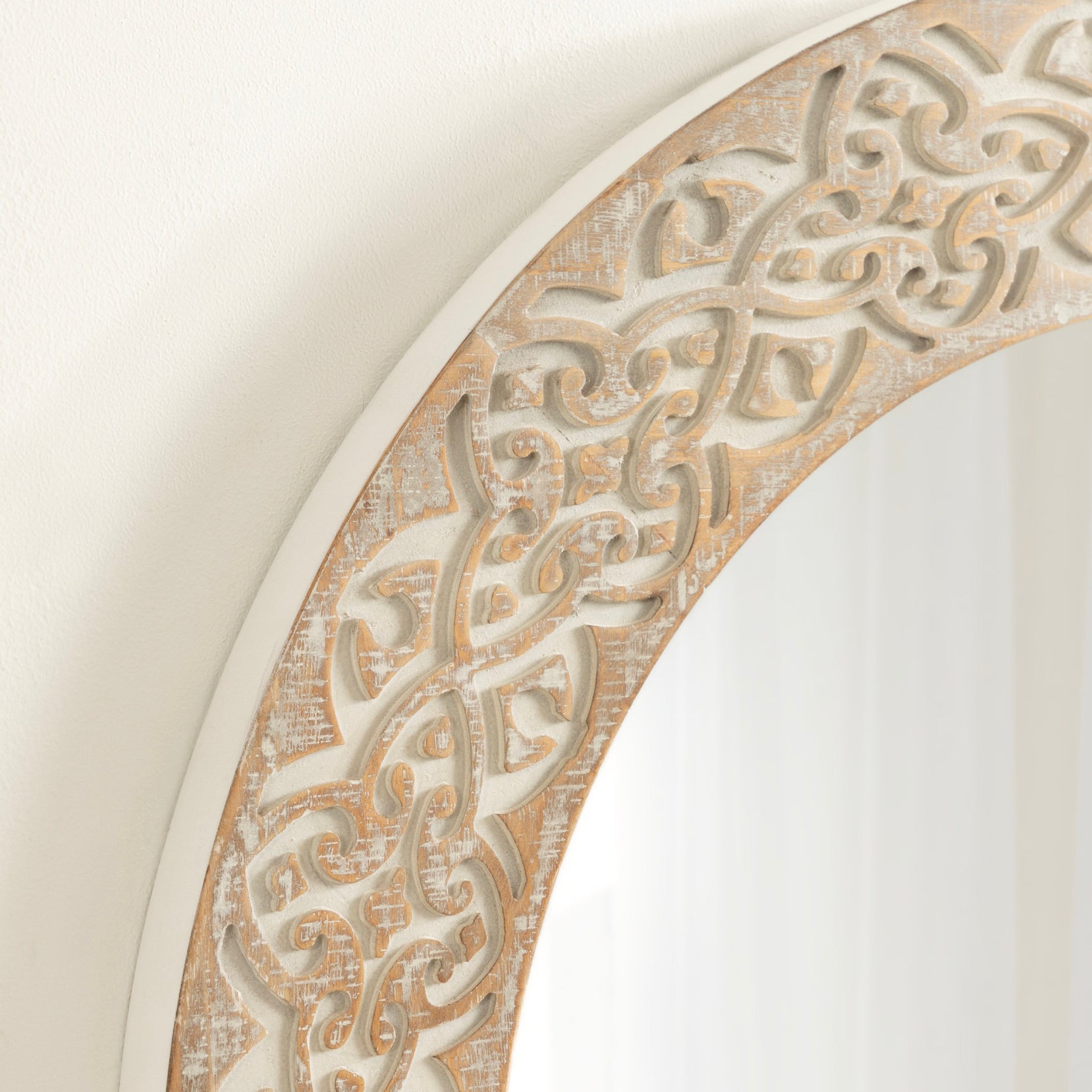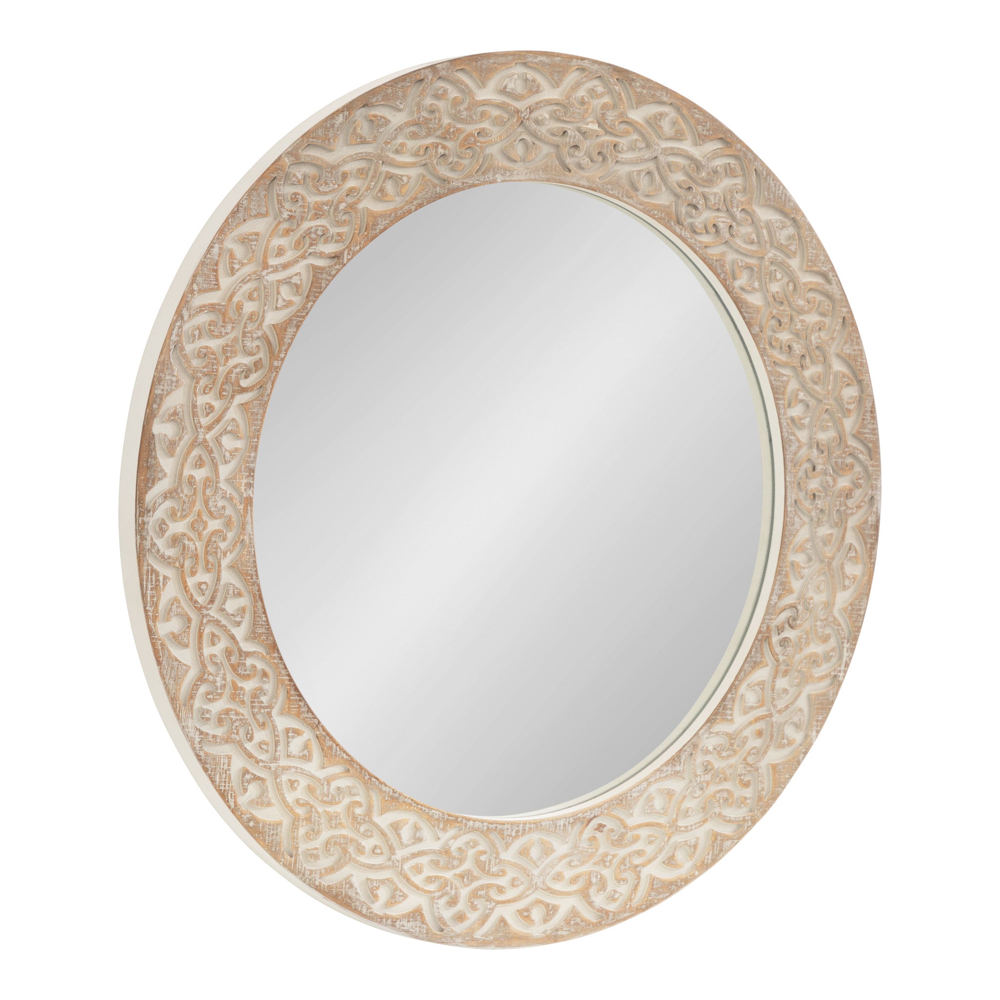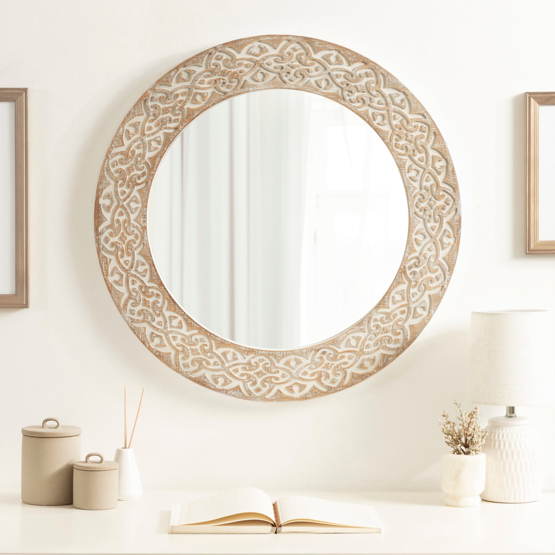 Add a stunning farmhouse statement to your home with the Engrahm round mirror. The Engrahm features a delightful carved pattern and paint distressing along its wide frame. That wide frame turns this piece into a unique statement with its textured engravings. As a versatile piece, the Engrahm wall mirror is a delightful statement to use in an entryway, a living room, a dining room, or as a round bathroom vanity mirror.