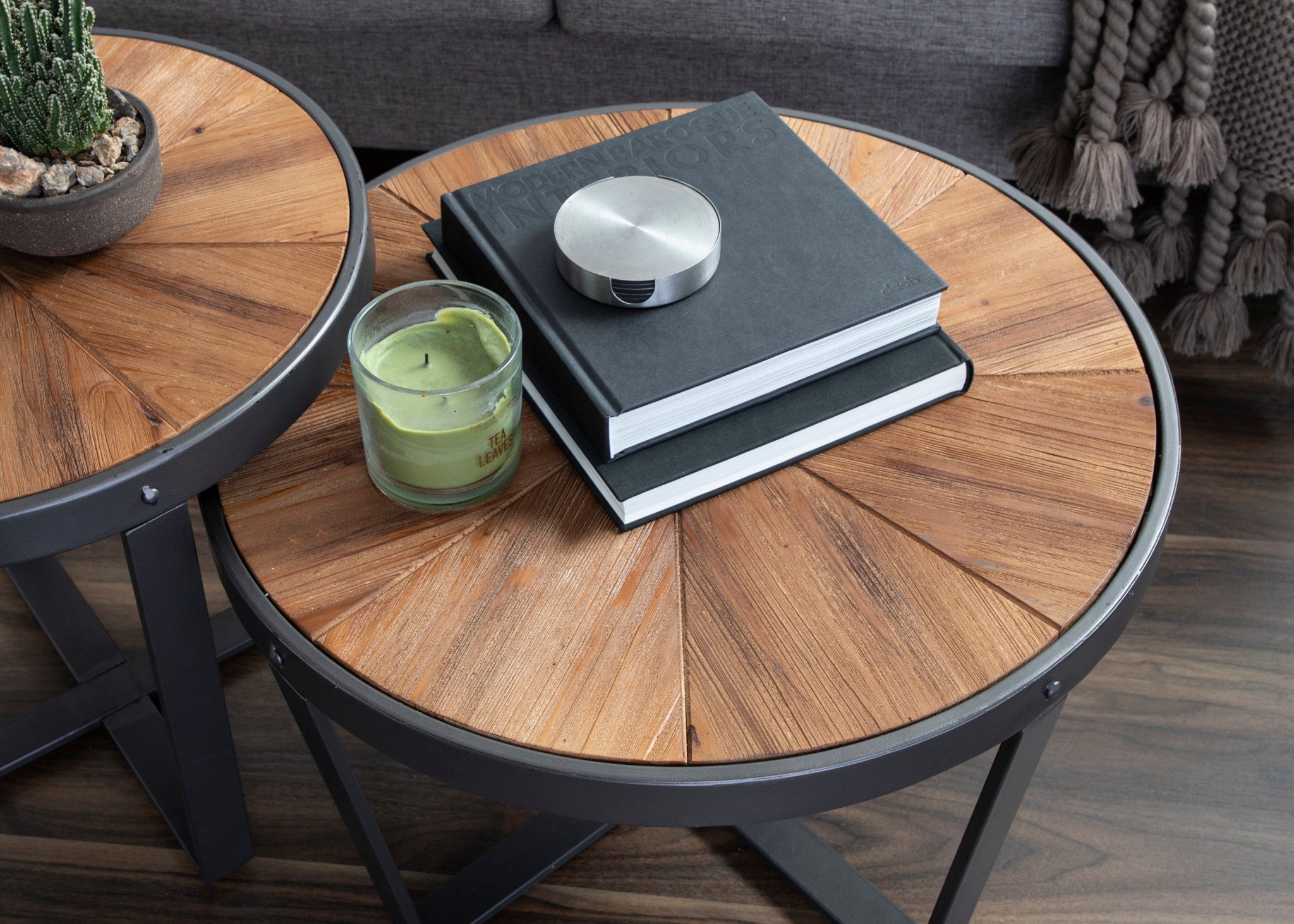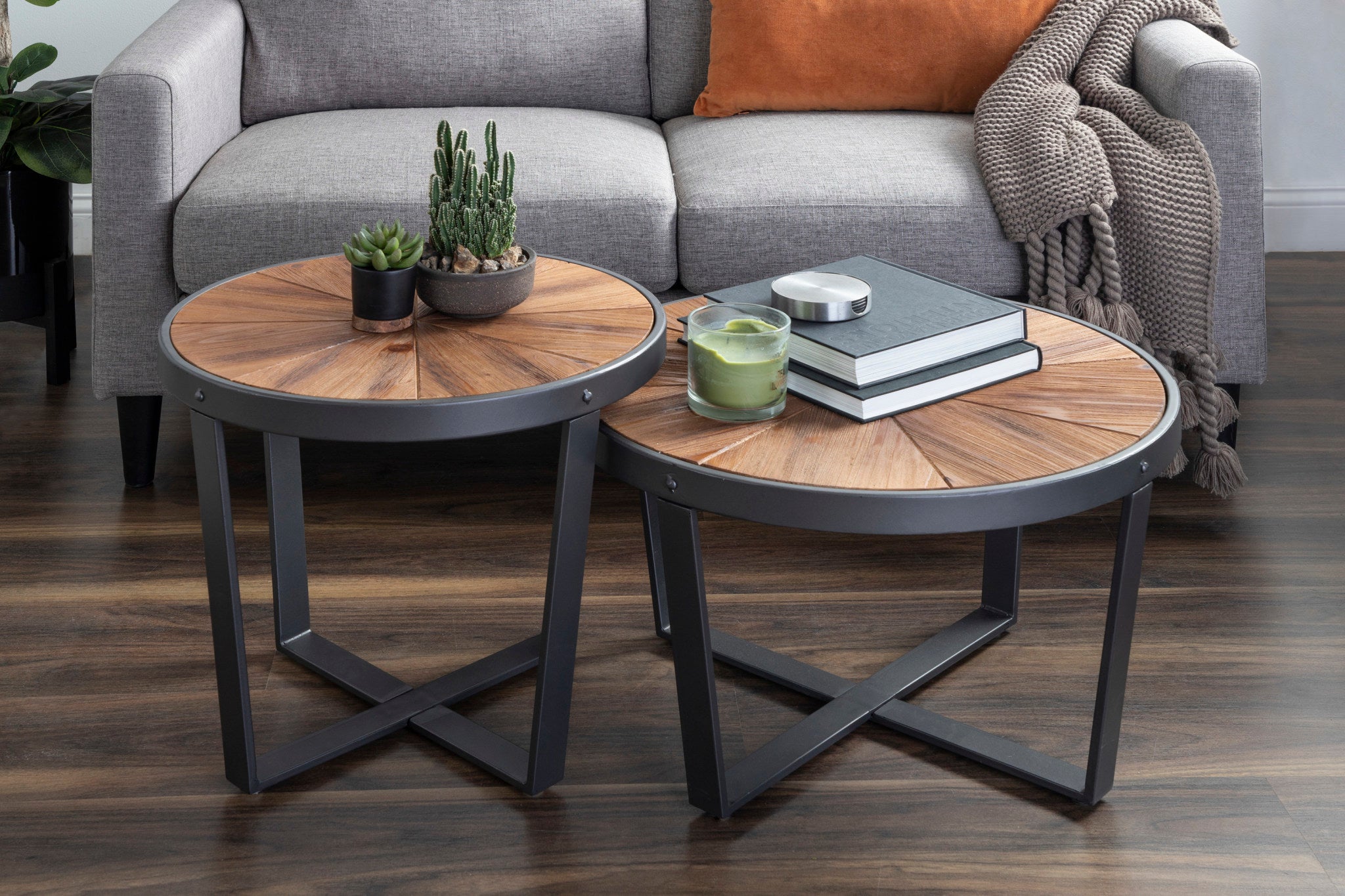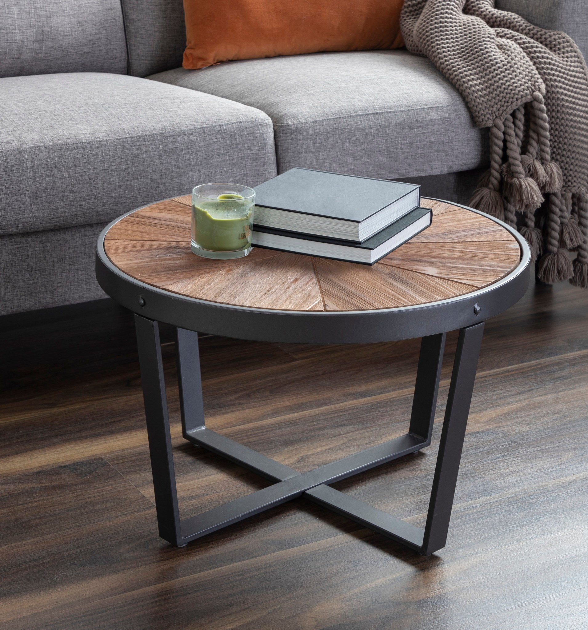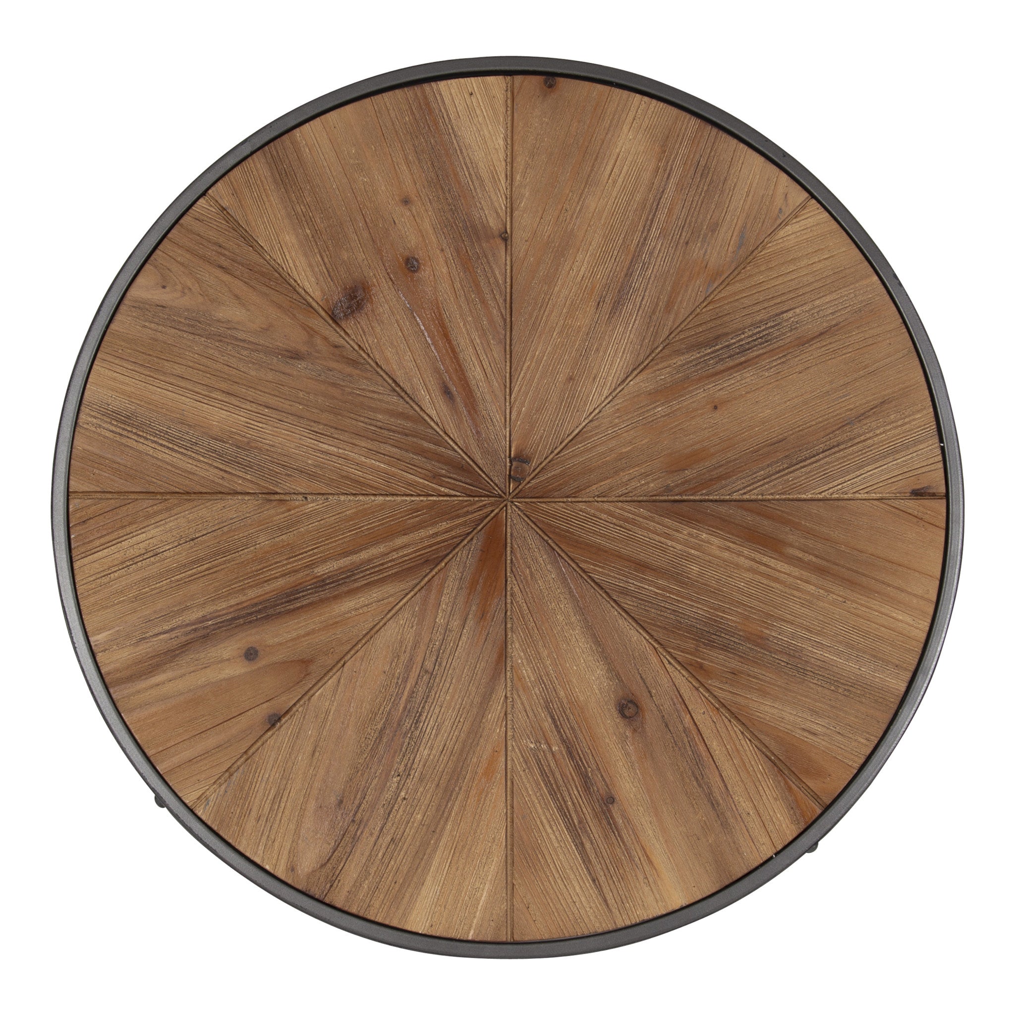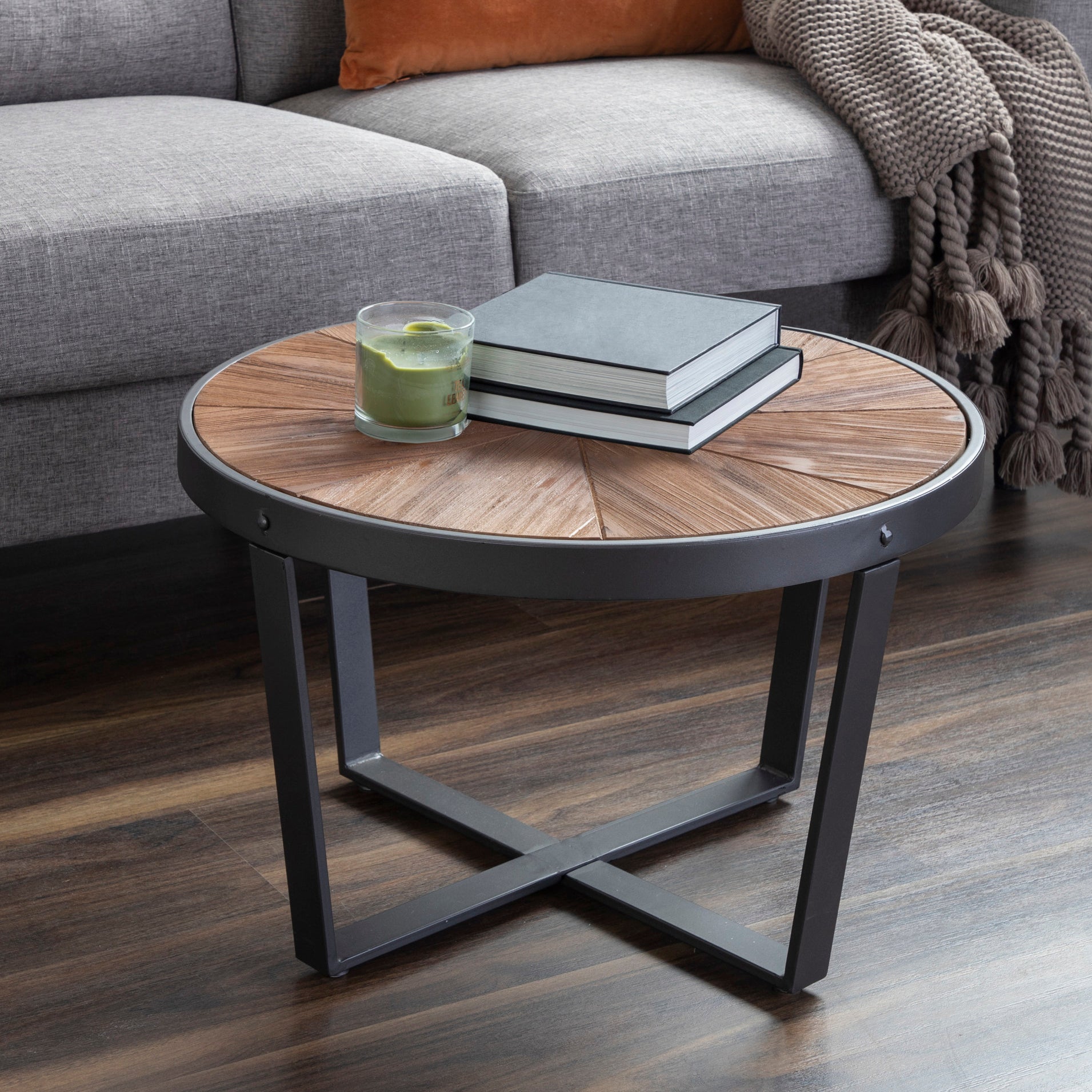 Take your modern farmhouse to new heights with the lovely Gerhardt coffee table. Its farmhouse inspiration comes from its lovely wooden tabletop, featuring a one-of-a-kind starburst design pieced by wood. Use this modern farmhouse table to serve drinks on coasters, display small succulents, or house media remotes. Its minimal metal legs also feature pads on the bottom to help prevent damage to hard surfaces.