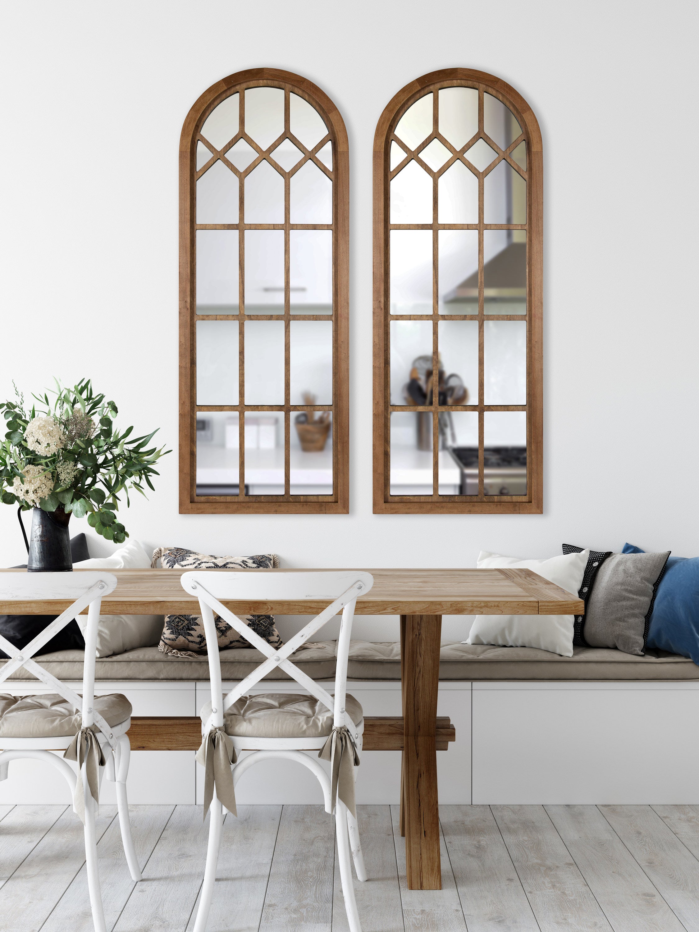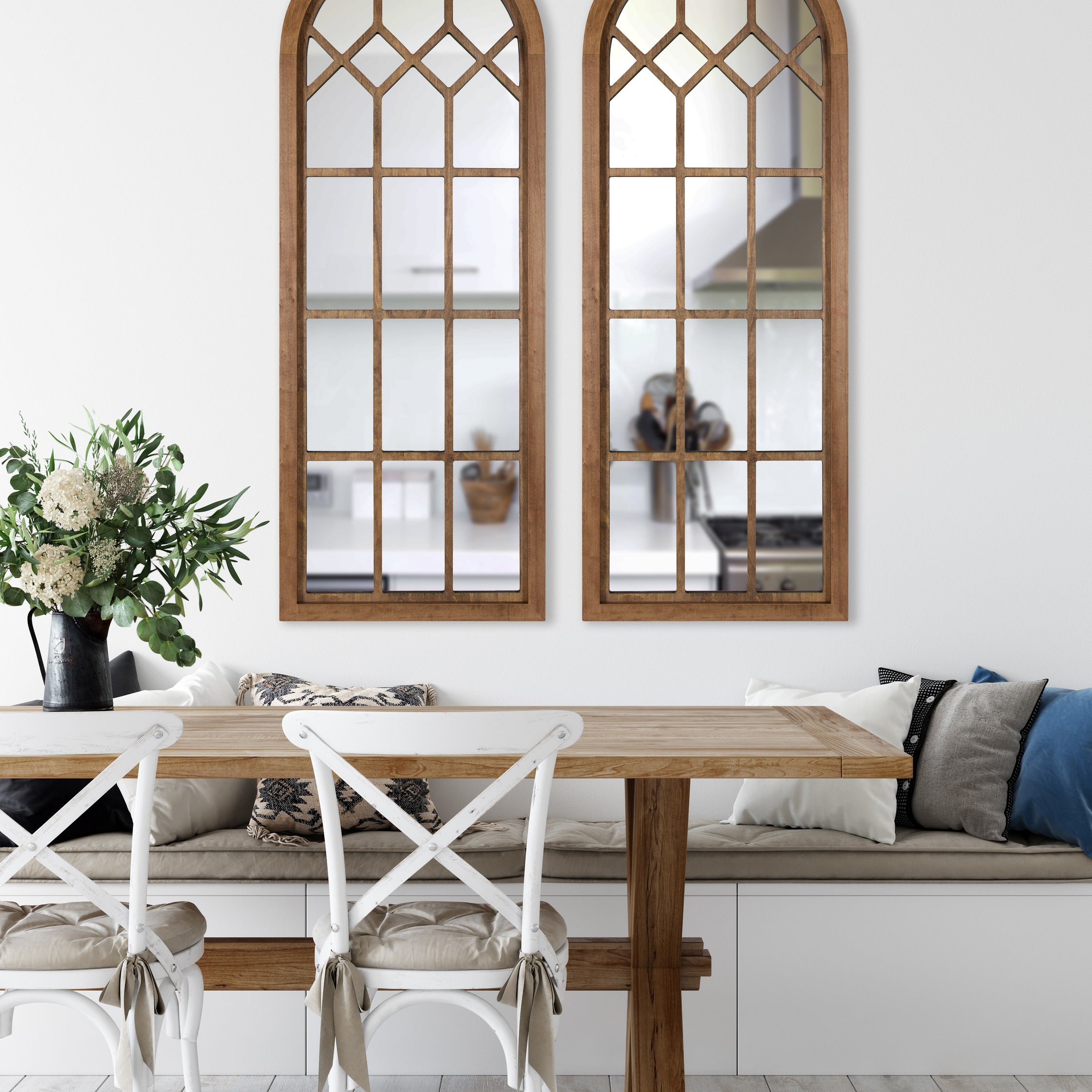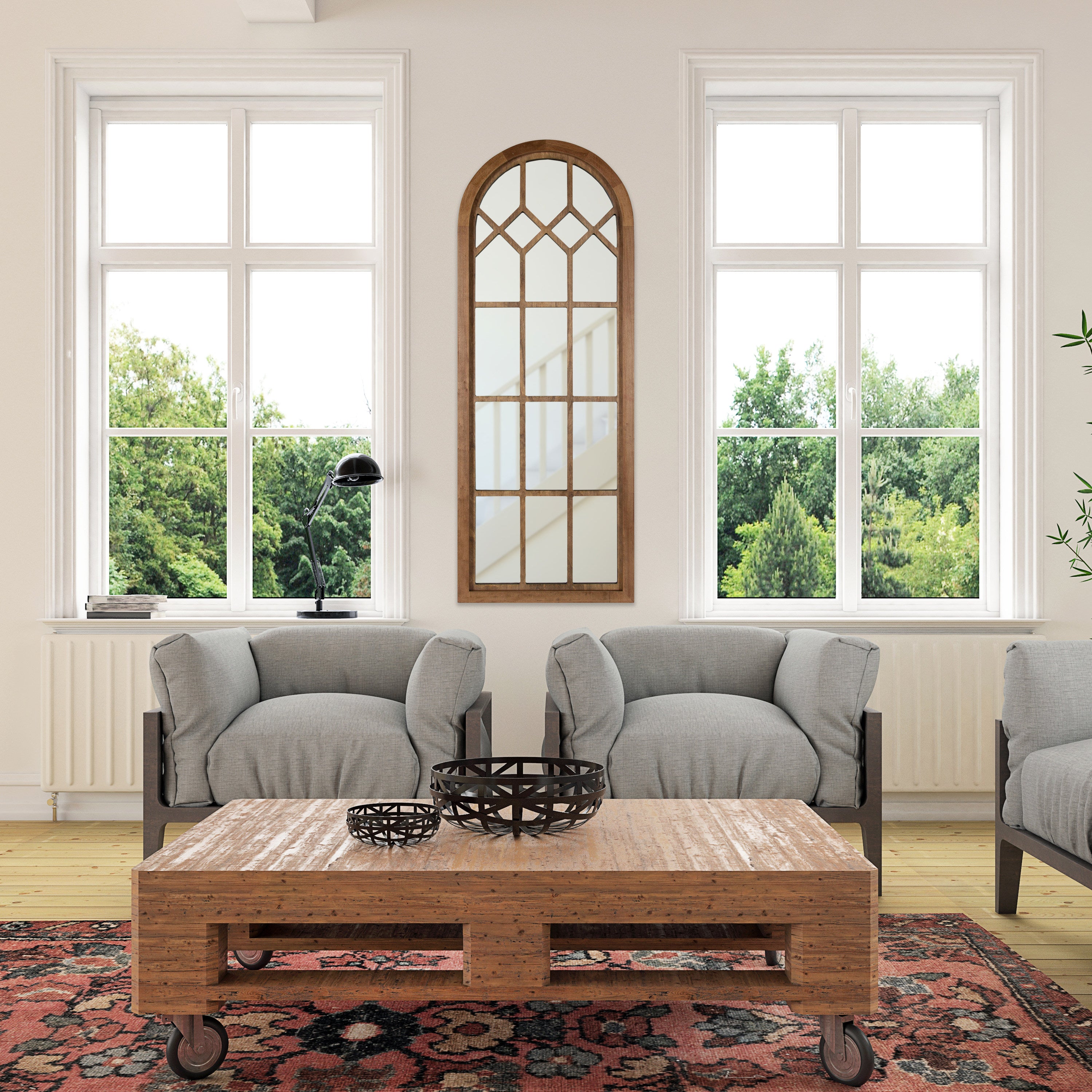 Decorate your beautiful farmhouse home with the lovely Gilcrest wall mirror. Inspired by vintage decor, the Gilcrest mirror has a solid wood frame with a wood inlay that is reminiscent of cathedral or farmhouse windows. The arched shape is an excellent symmetrical accent for any wall of your home. This accent goes to work by adding vibrancy to any tall wall, reflecting more light throughout the room and enhancing the dimension. The traditional look of this mirror is sure to make all your guests' heads turn.