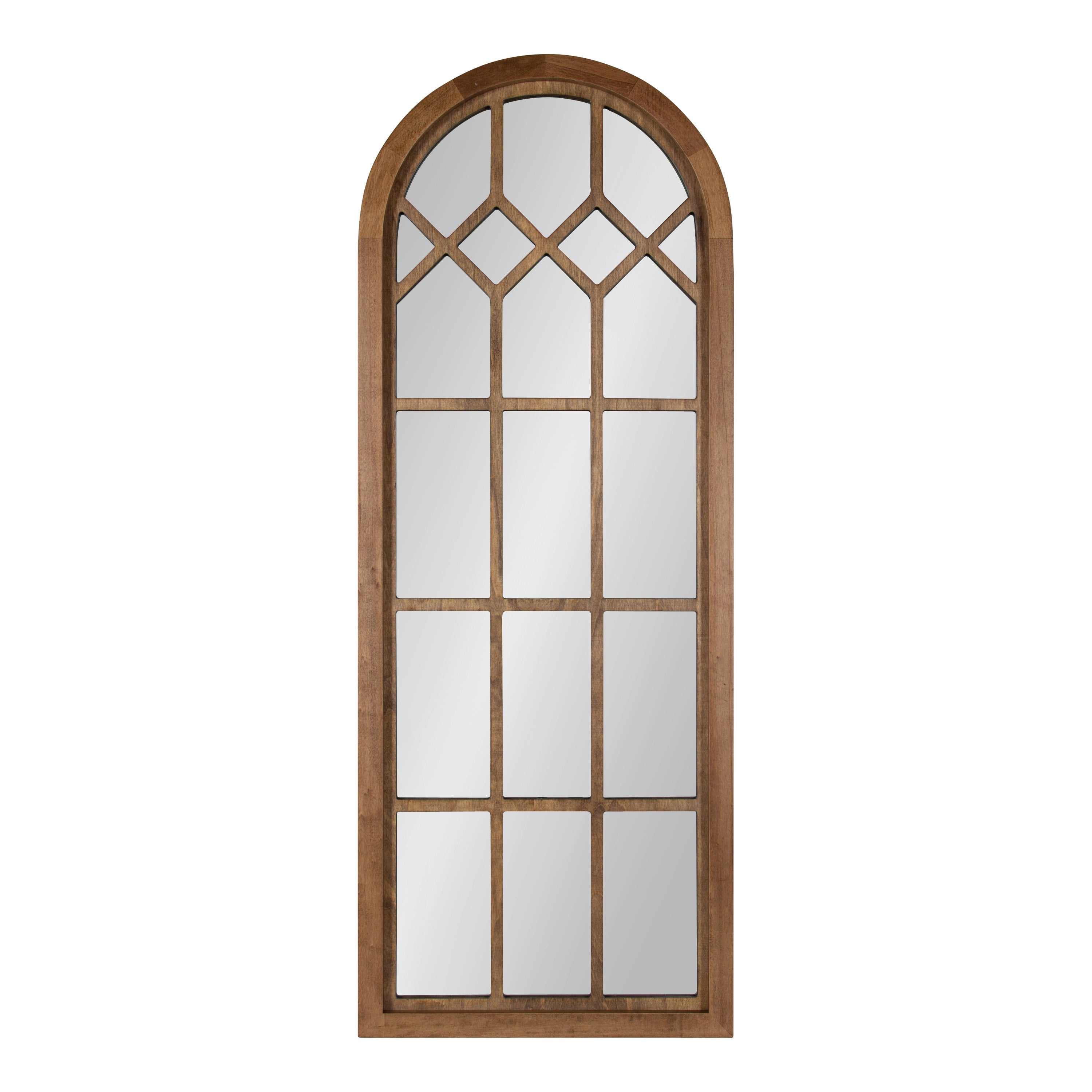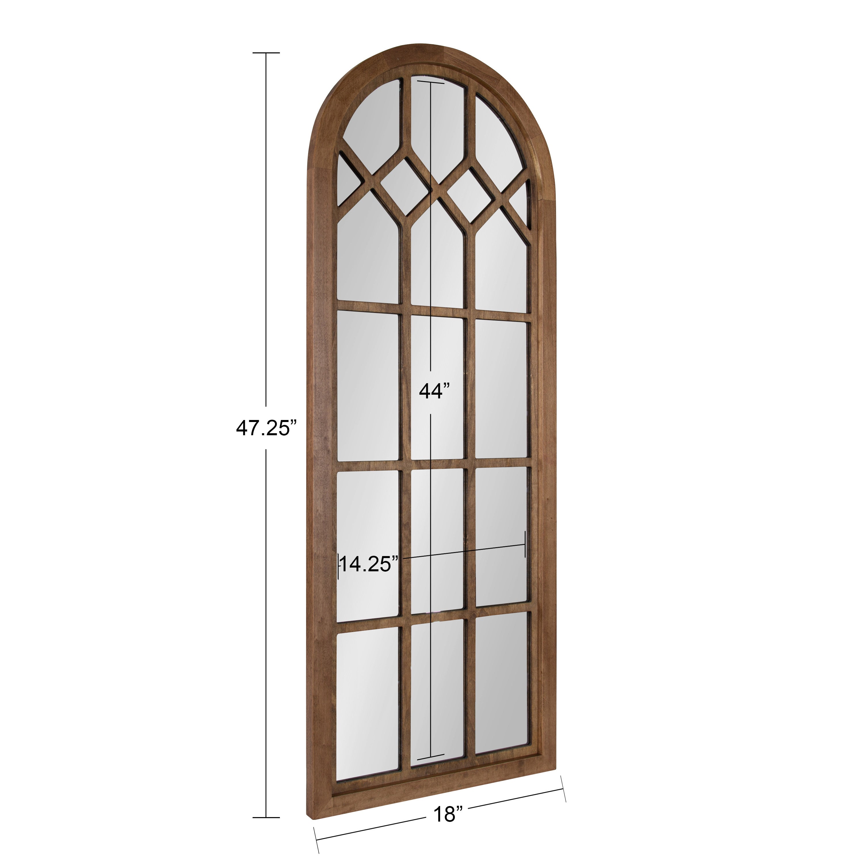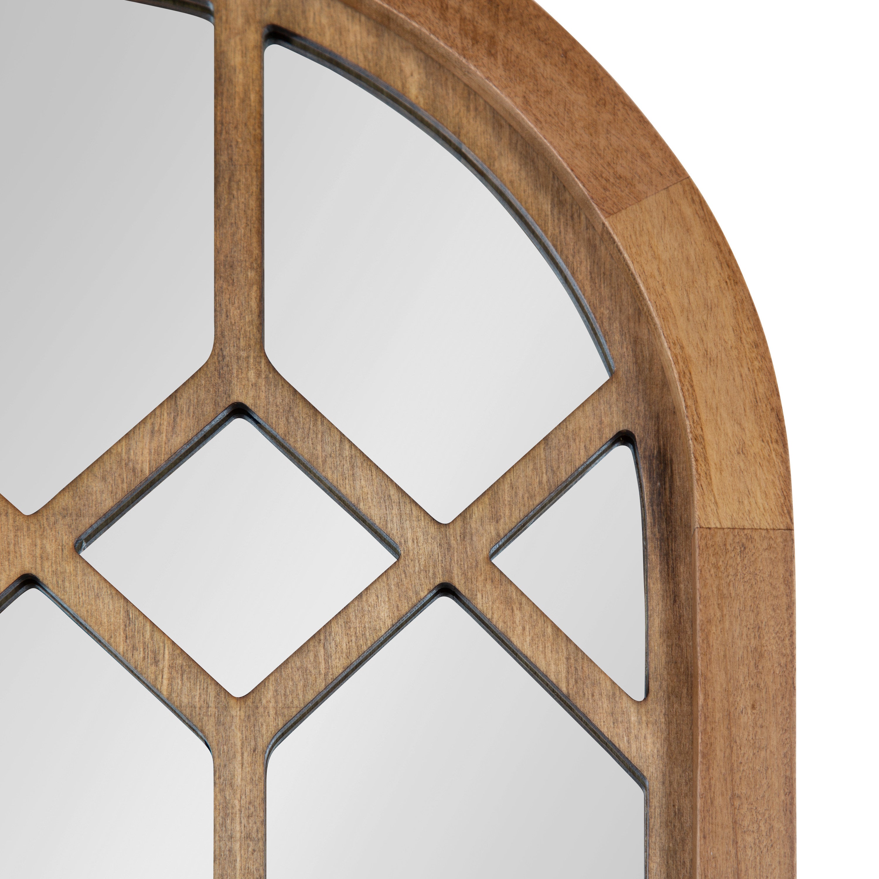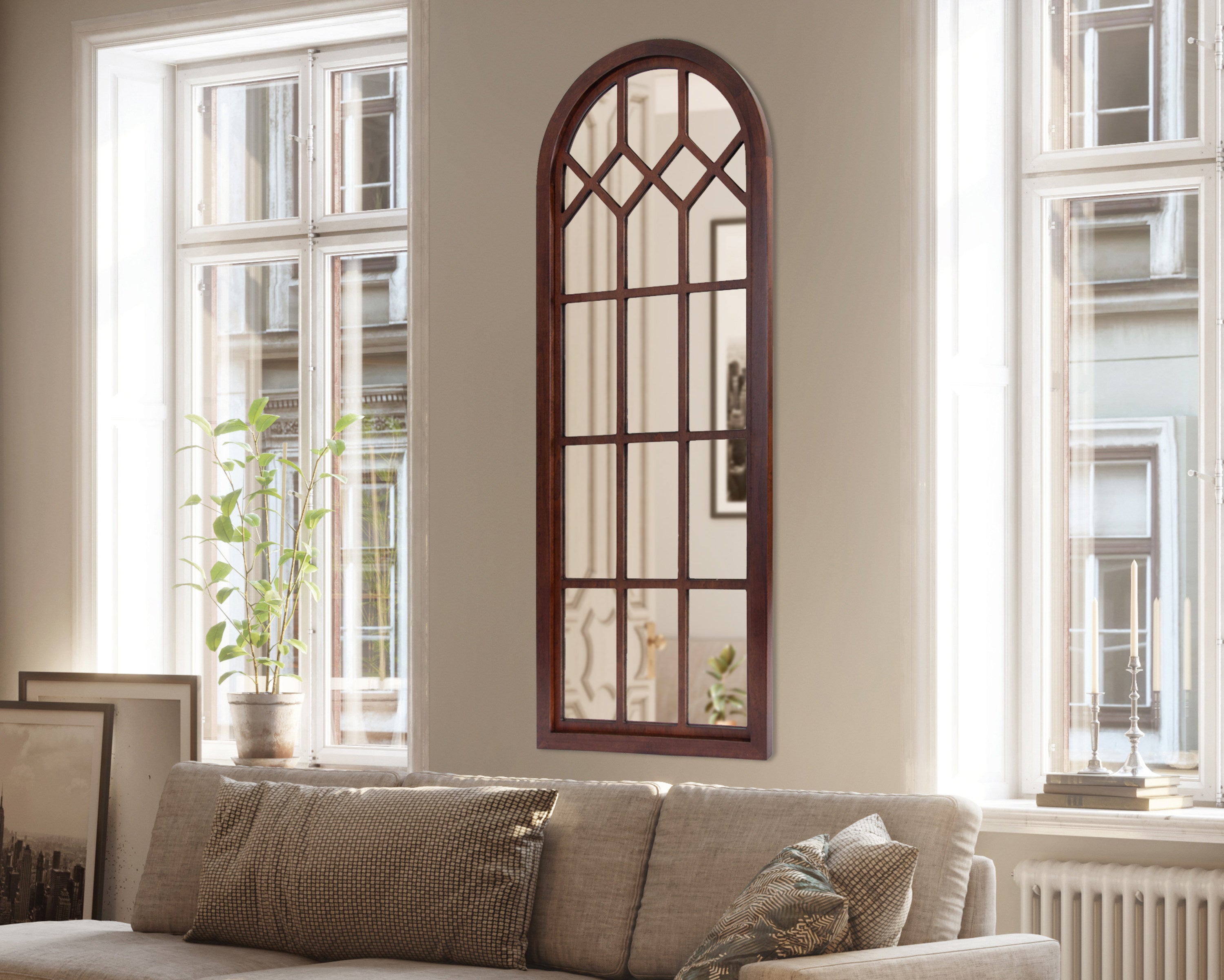 Decorate your beautiful farmhouse home with the lovely Gilcrest wall mirror. Inspired by vintage decor, the Gilcrest mirror has a solid wood frame with a wood inlay that is reminiscent of cathedral or farmhouse windows. The arched shape is an excellent symmetrical accent for any wall of your home. This accent goes to work by adding vibrancy to any tall wall, reflecting more light throughout the room and enhancing the dimension. The traditional look of this mirror is sure to make all your guests' heads turn.