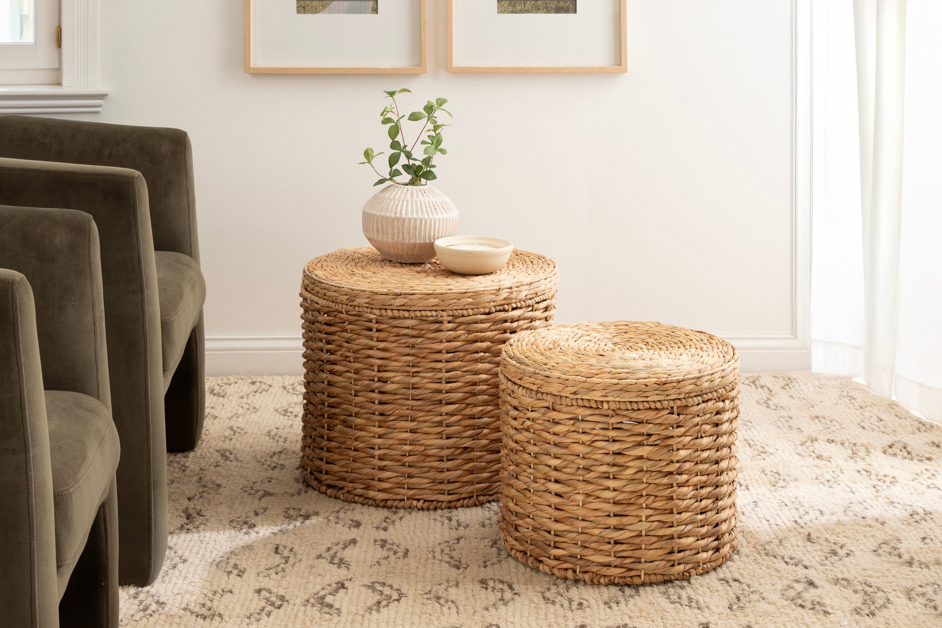 This charming set of two tables blends contemporary design with natural textures, featuring hand-woven rattan that exudes rustic sophistication. The clean, circular design pairs seamlessly with a variety of decor styles, from bohemian and coastal to modern and minimalist. Thoughtfully designed for both beauty and practicality, each table features a lift-top surface that reveals hidden storage, perfect for keeping your living space tidy. Use them to store blankets, books, toys, or any items you'd prefer out of sight but within reach. Their sturdy construction includes metal framing to ensure stability and durability, while their lightweight build allows for easy movement and versatility. Whether styled as end tables beside your sofa, small ottomans near your couch, or decorative accents in your bedroom, these tables bring both charm and purpose to any space.