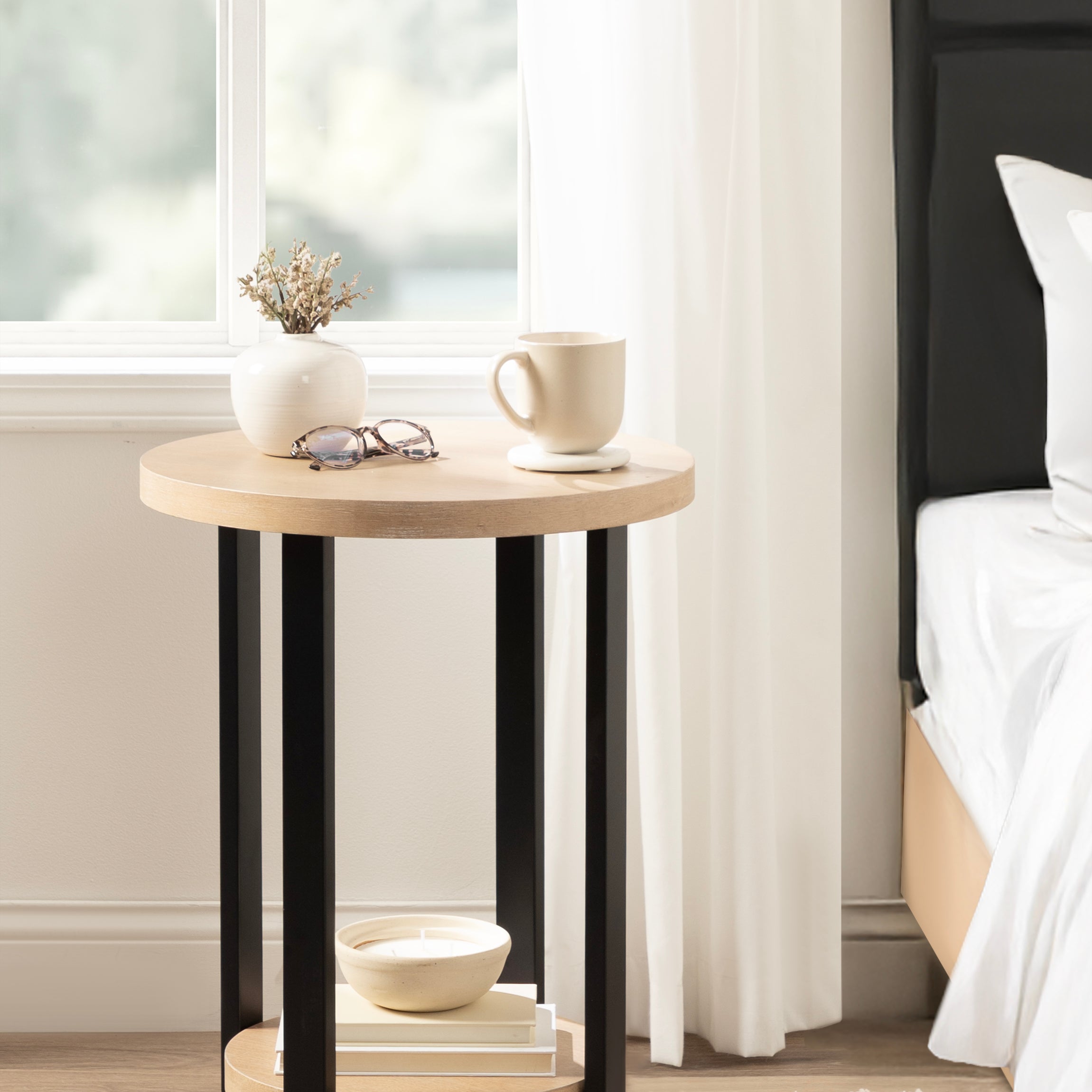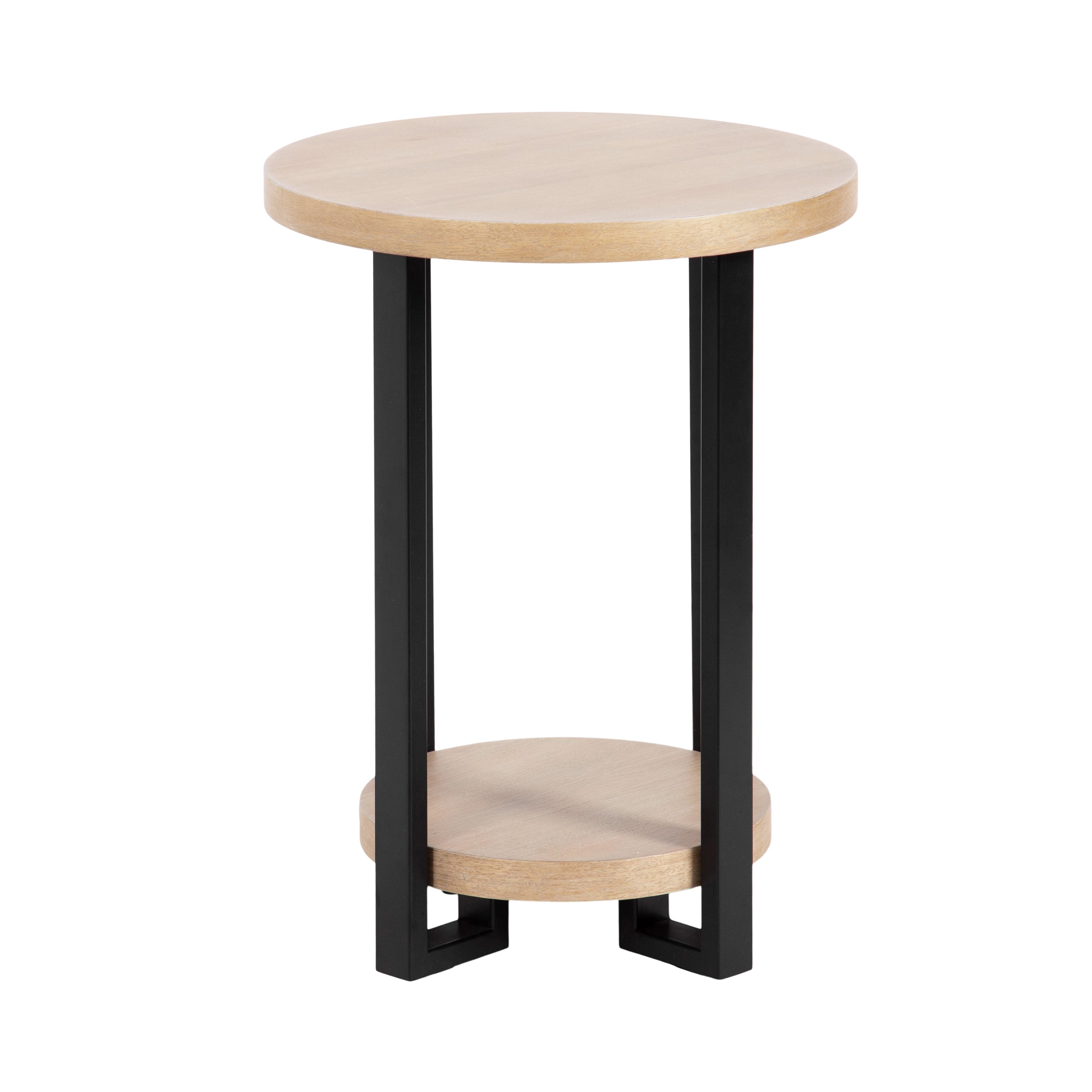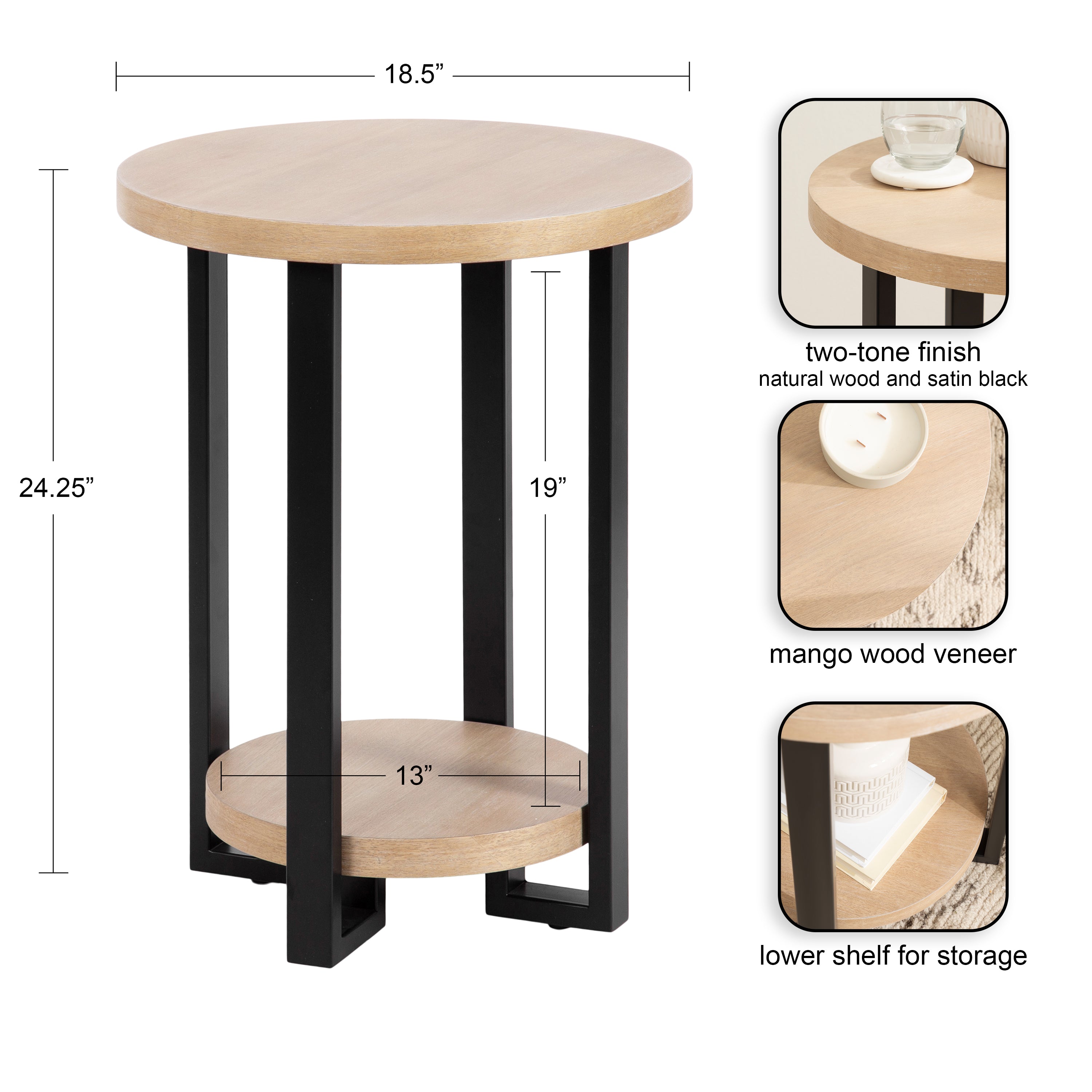 Showcase your transitional-inspired style with the Hendricks round side table from Kate and Laurel. The soft and elegant finish of the wood adds a touch of sophistication to any space, while the simple and clean lines of the design make it easy to blend seamlessly with any decor style. This beautiful end table is crafted from a sturdy wooden material with a mango wood veneer, creating a statement that is as durable as it is beautiful. The top wooden tier is perfect for creating a lovely display area for candles, small lamps, and other accents. The bottom tier of the side table is great for storing your favorite household accessories, from blankets and pillows to everyday essentials. Assemble this table in only a matter of minutes with a simple, three-step assembly process.