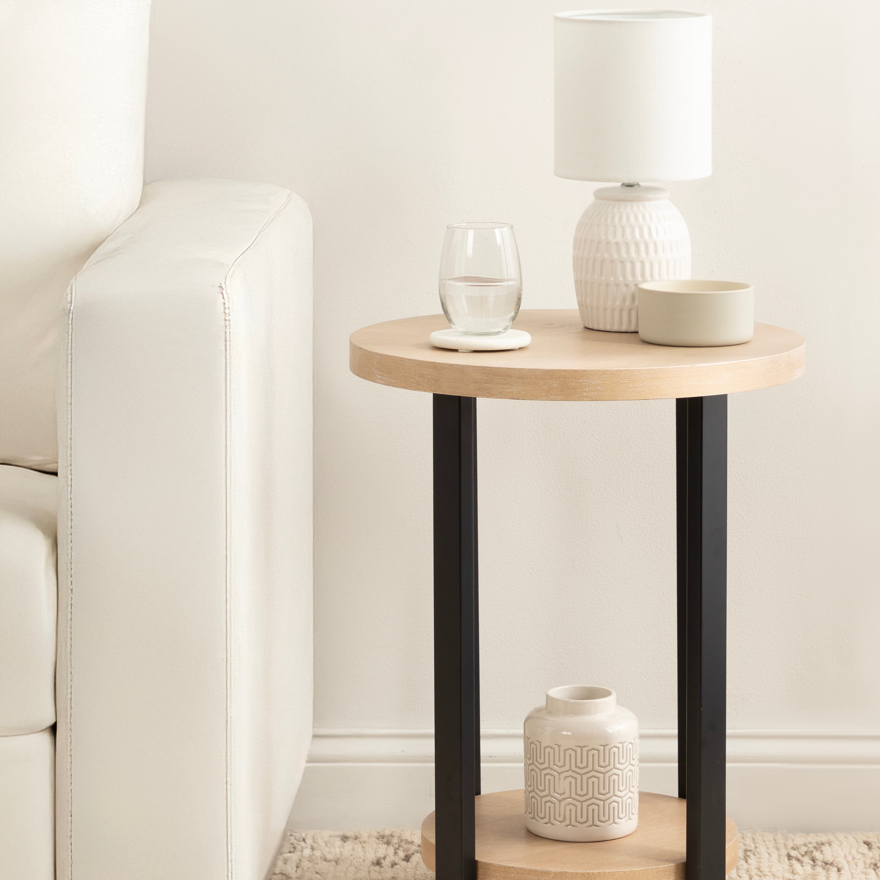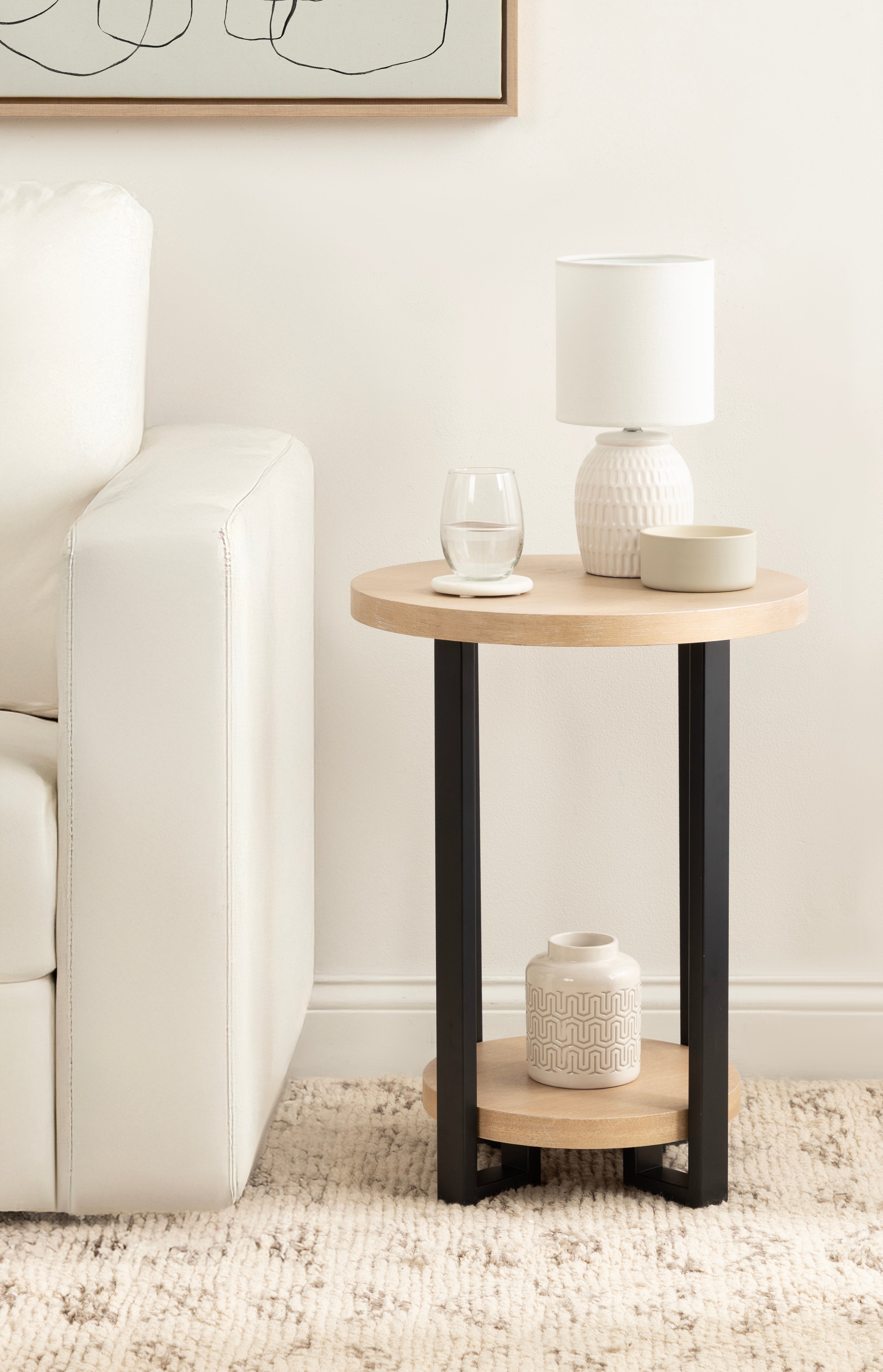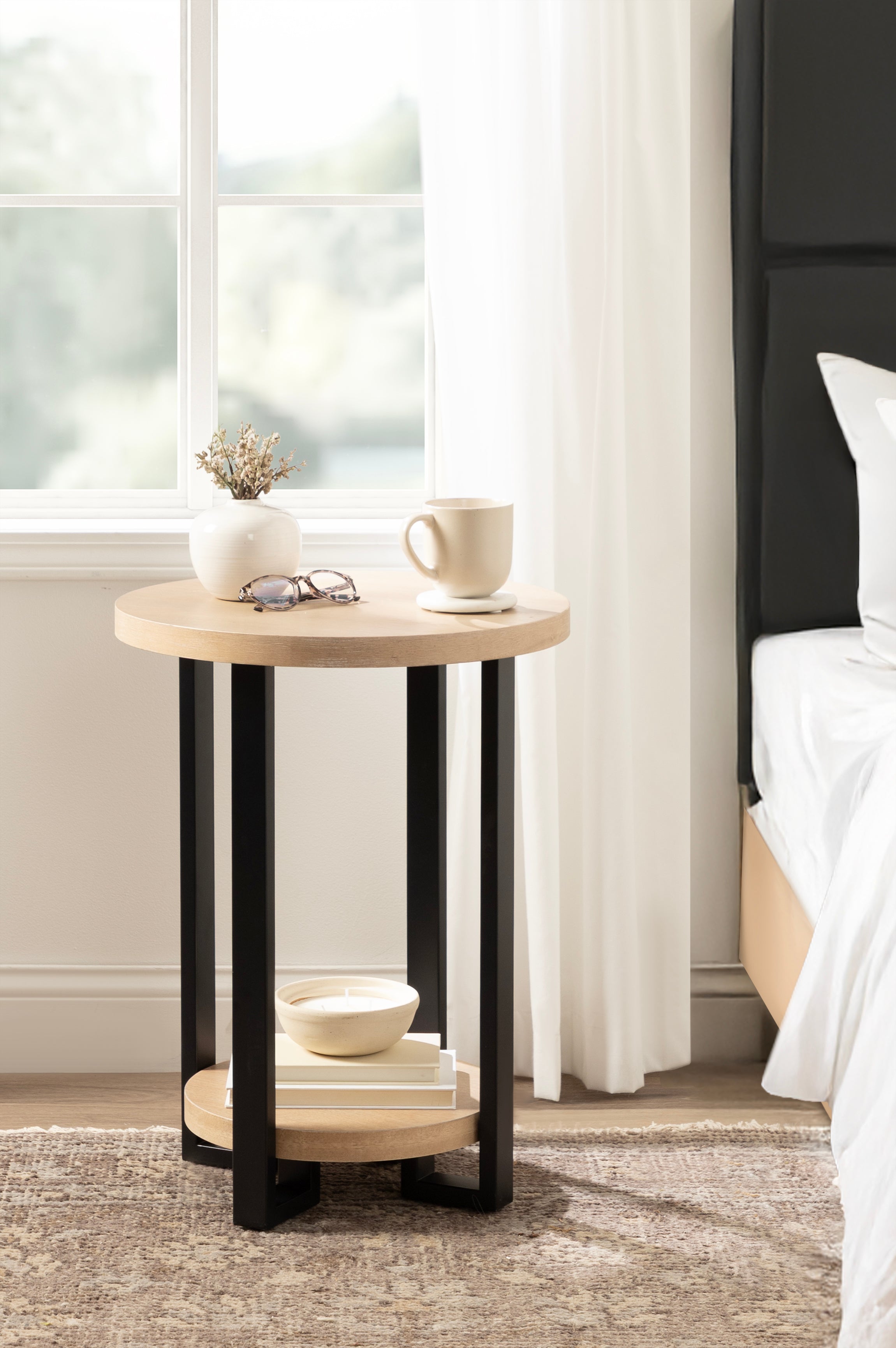 Showcase your transitional-inspired style with the Hendricks round side table from Kate and Laurel. The soft and elegant finish of the wood adds a touch of sophistication to any space, while the simple and clean lines of the design make it easy to blend seamlessly with any decor style. This beautiful end table is crafted from a sturdy wooden material with a mango wood veneer, creating a statement that is as durable as it is beautiful. The top wooden tier is perfect for creating a lovely display area for candles, small lamps, and other accents. The bottom tier of the side table is great for storing your favorite household accessories, from blankets and pillows to everyday essentials. Assemble this table in only a matter of minutes with a simple, three-step assembly process.