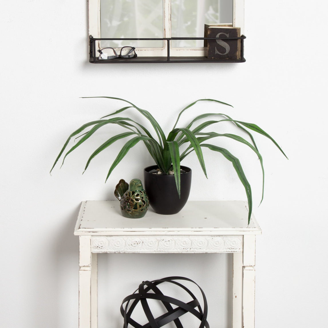 - Features center shelf framed with a lovely embossed botanical designed metal apron