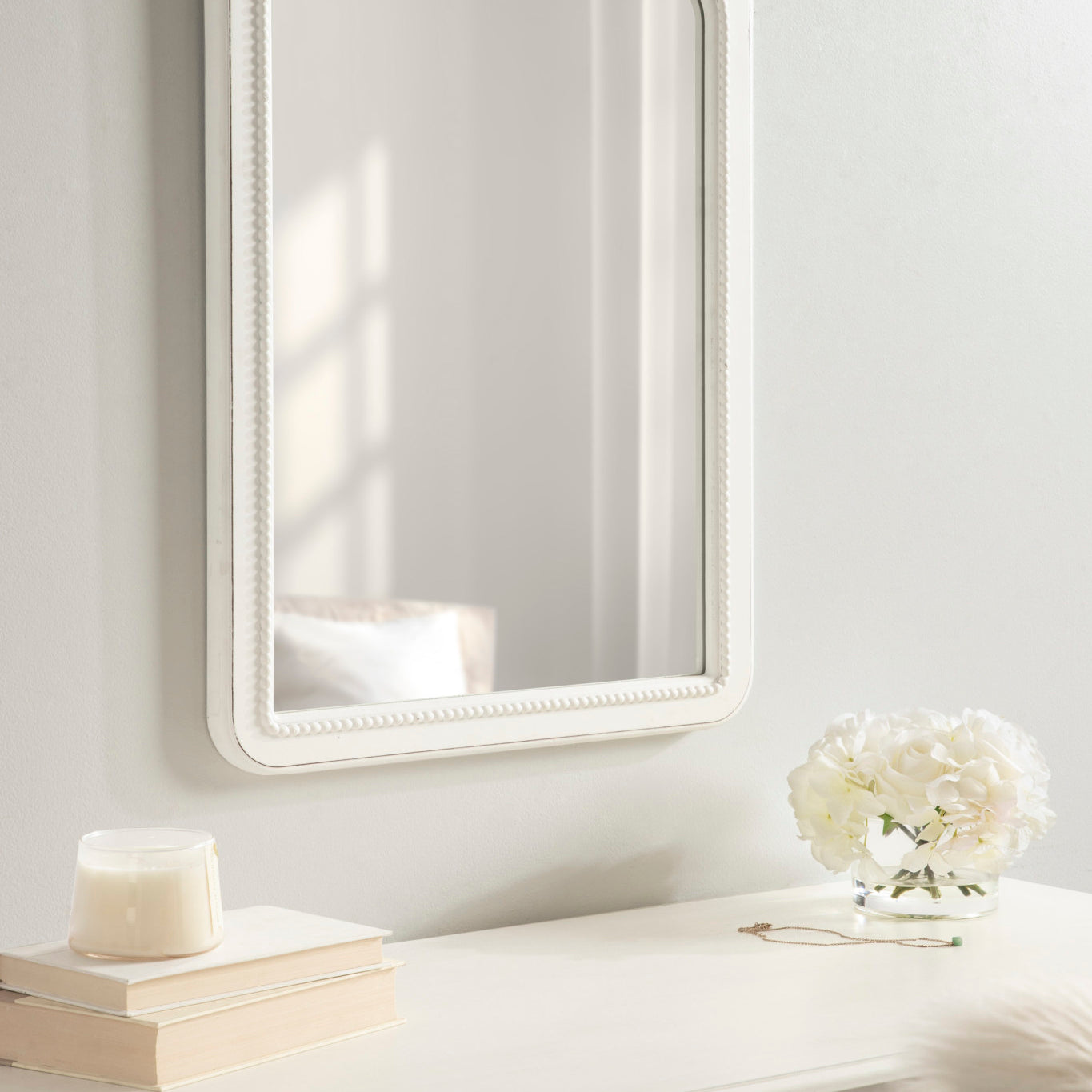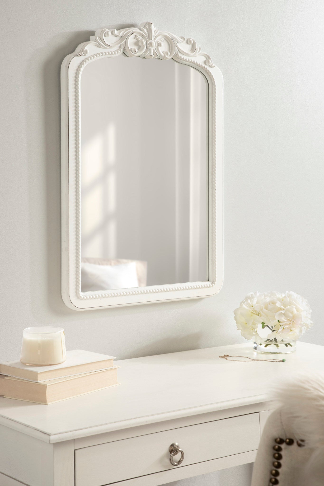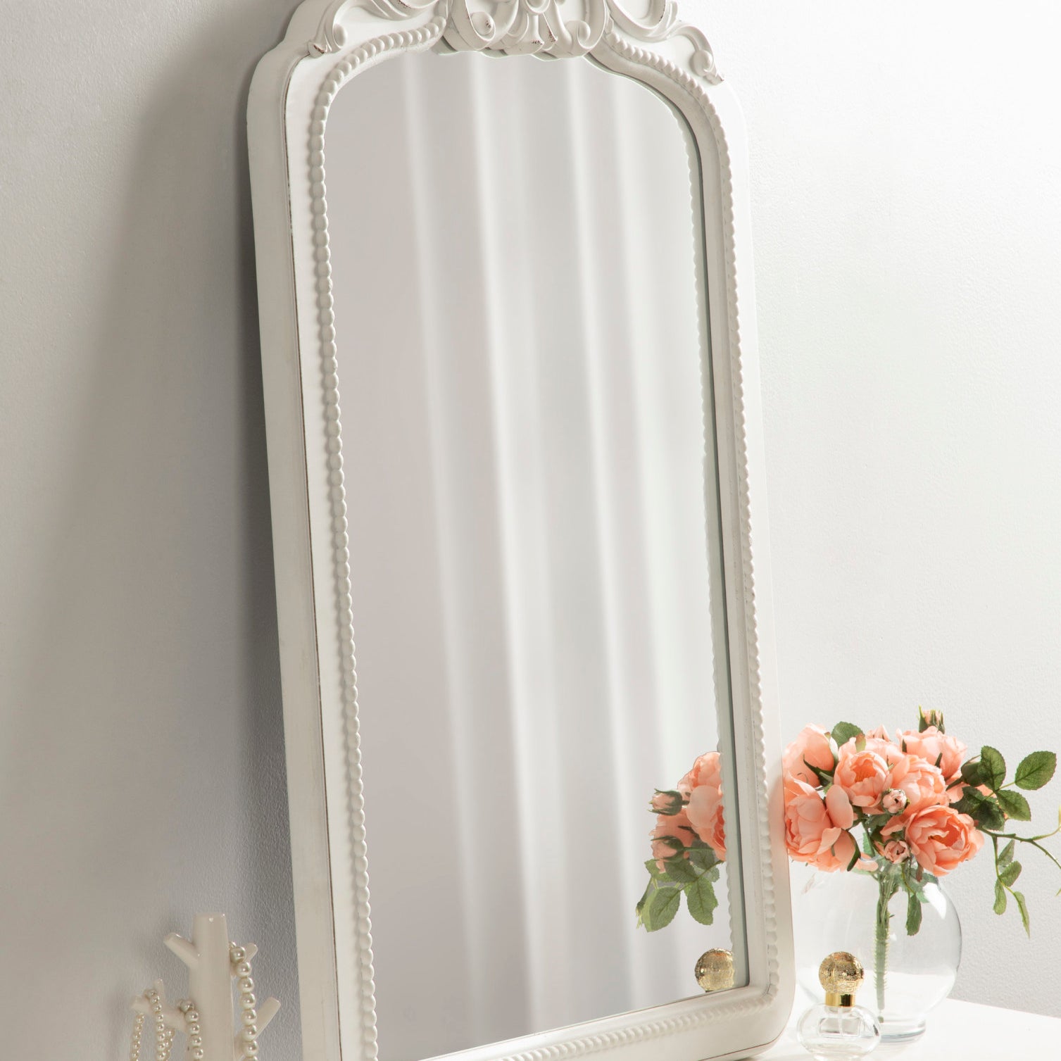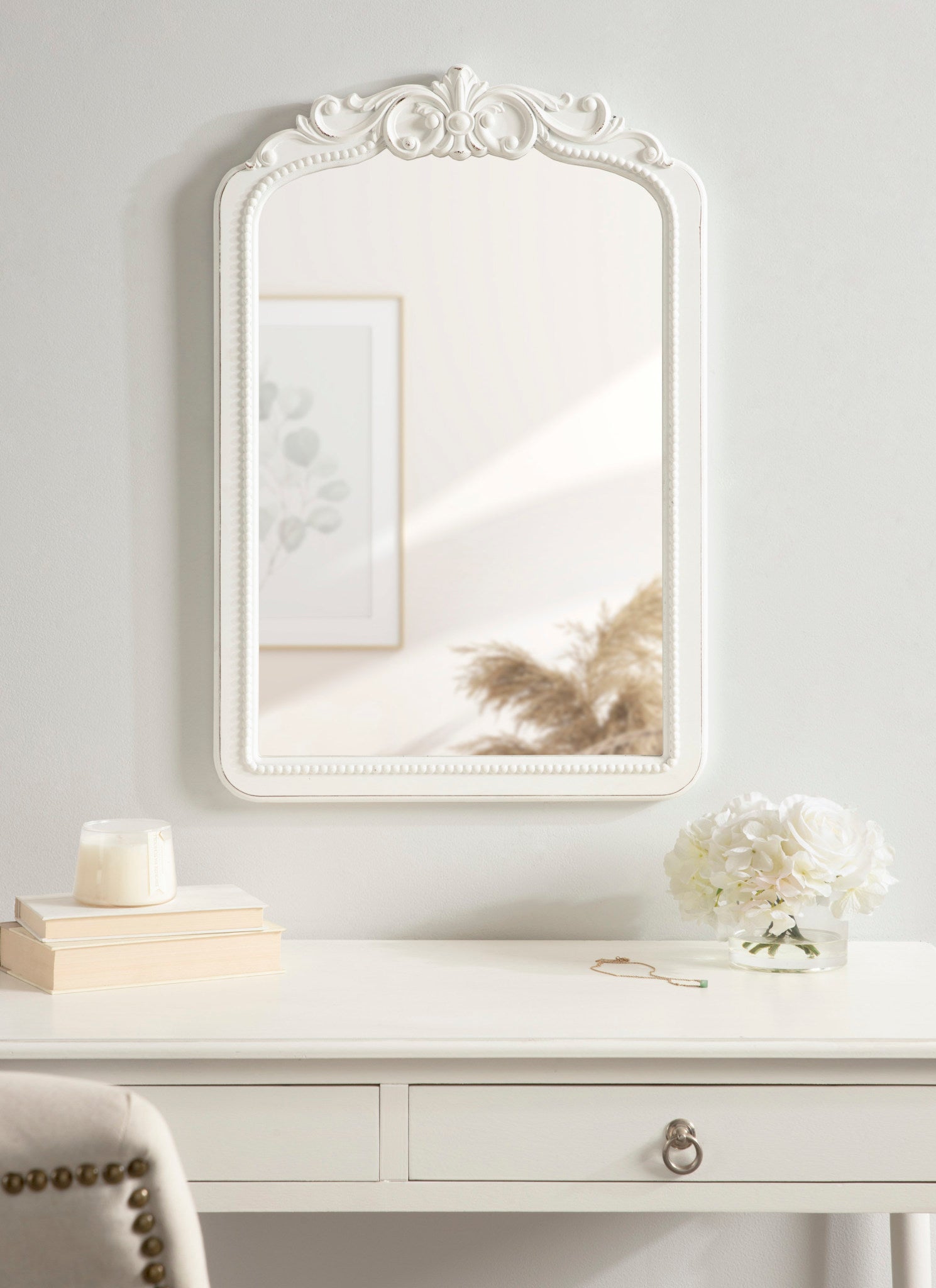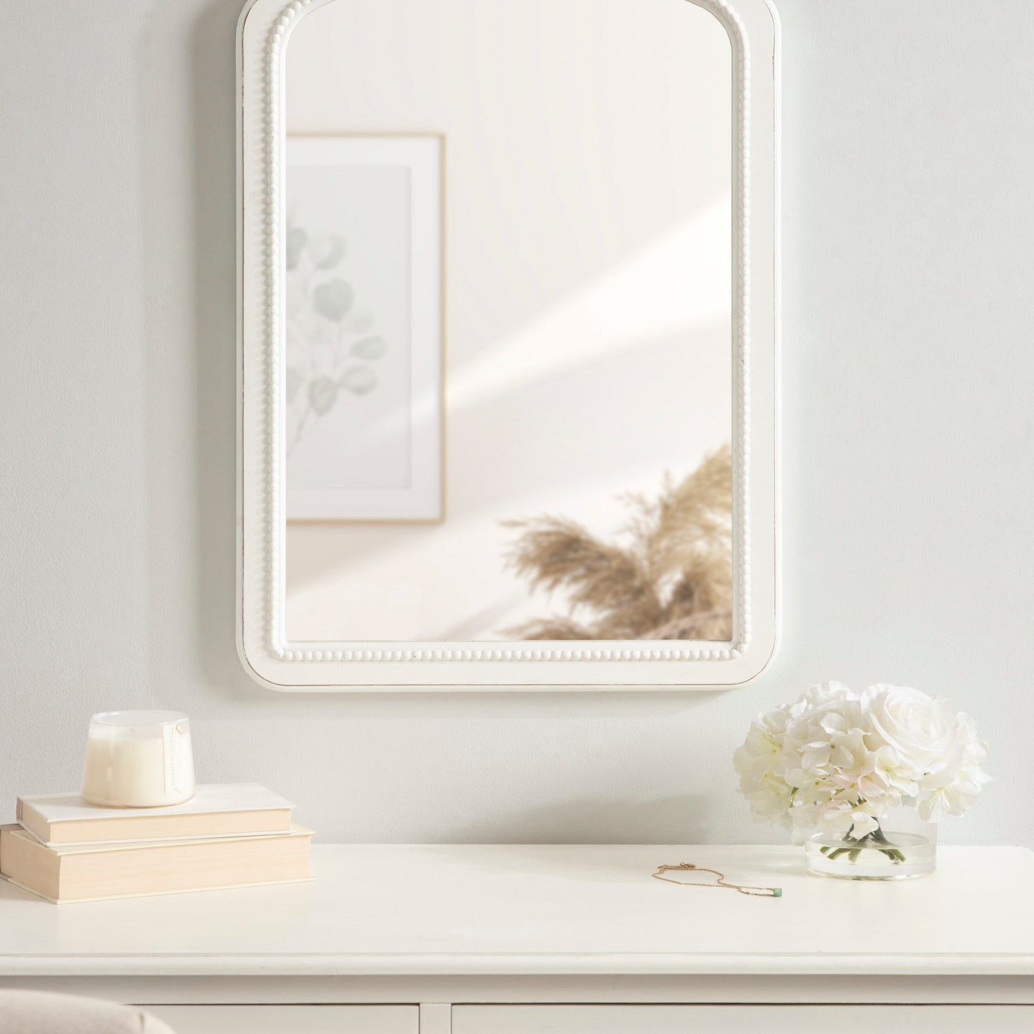 Embrace classical design on your wall with the dazzling Jenelle mirror. Inspired by french provincial and baroque styles, this lovely wall mirror features a bold beaded edge with an ornamental, cascading garland crown. The soft and elegant design of the Jenelle mirror makes it a fantastic accent piece for your living room mantle, entryway console table, bedroom dresser, or bathroom vanity.