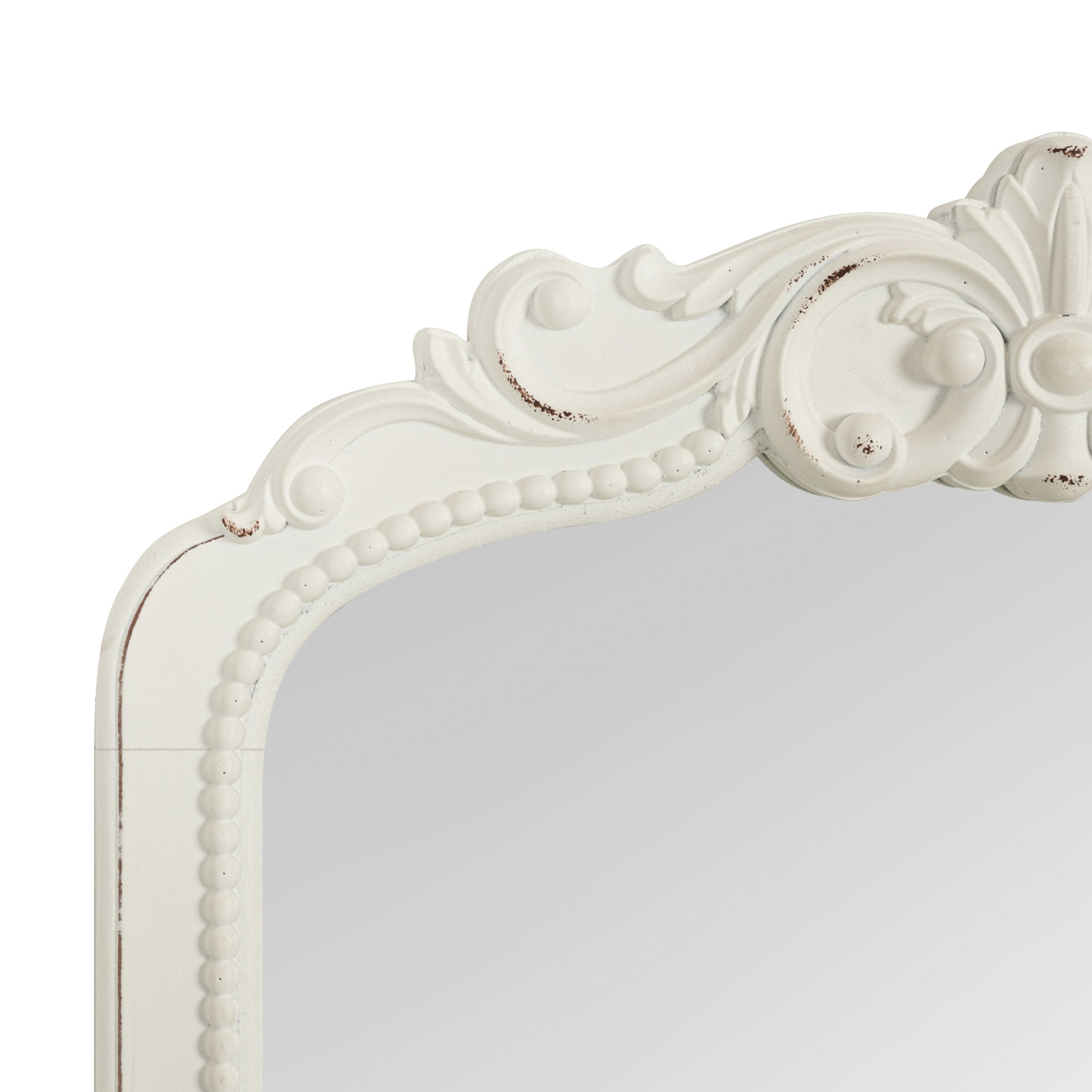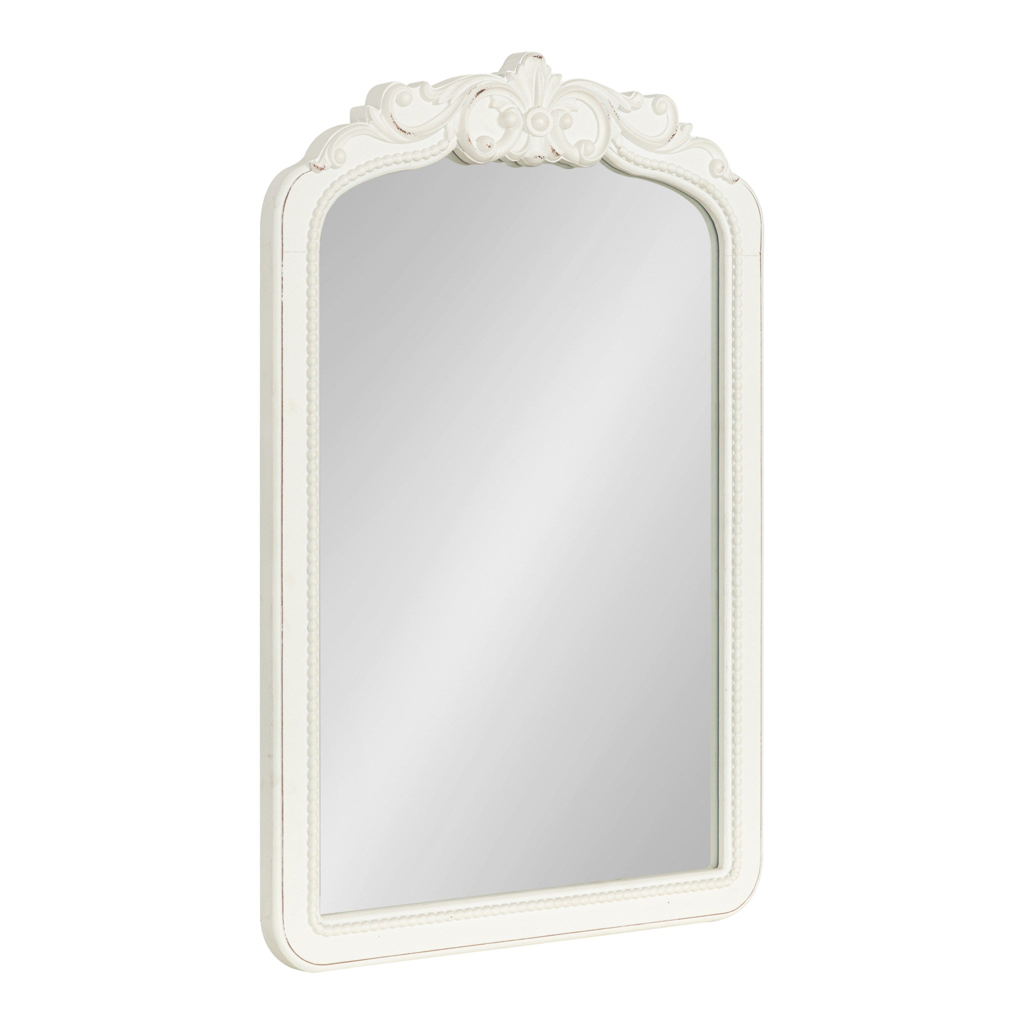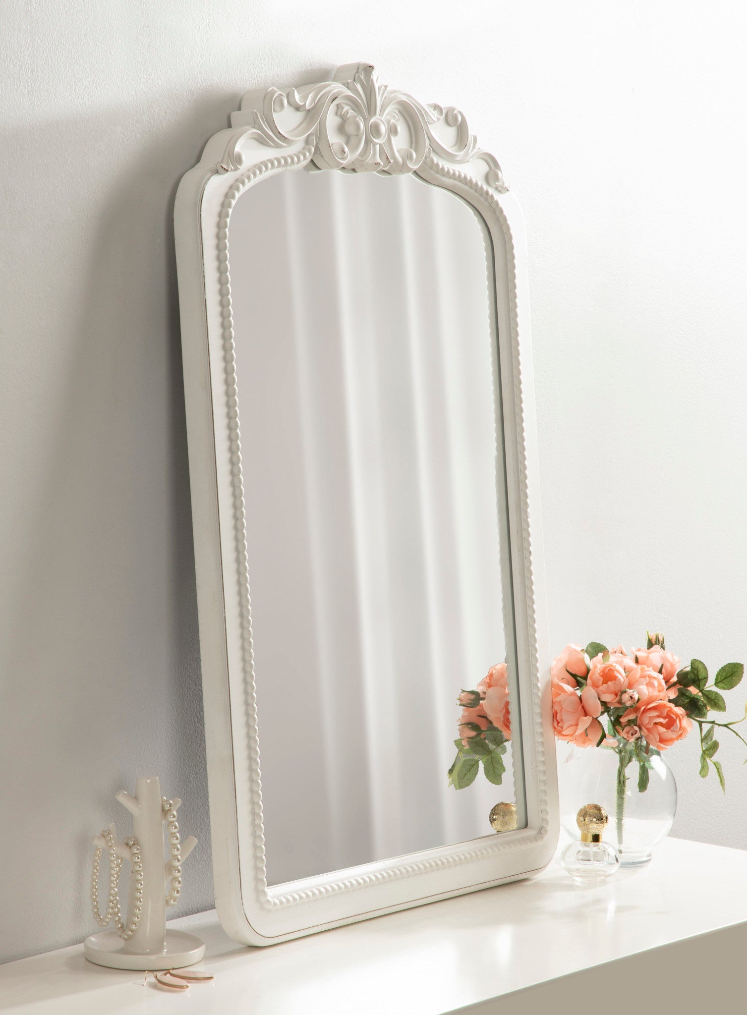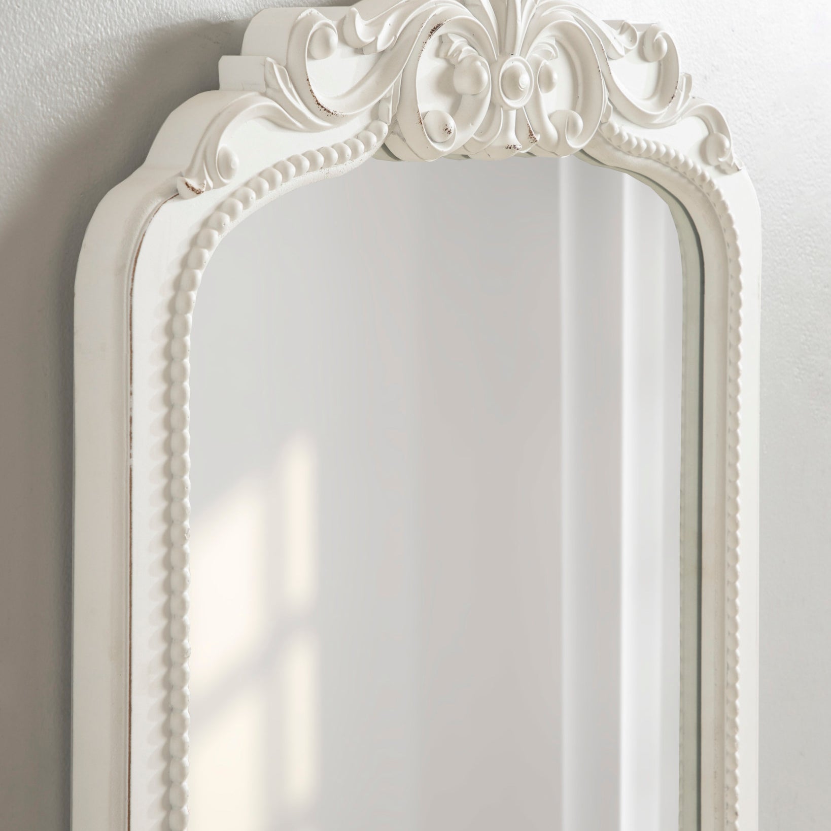 Embrace classical design on your wall with the dazzling Jenelle mirror. Inspired by french provincial and baroque styles, this lovely wall mirror features a bold beaded edge with an ornamental, cascading garland crown. The soft and elegant design of the Jenelle mirror makes it a fantastic accent piece for your living room mantle, entryway console table, bedroom dresser, or bathroom vanity.