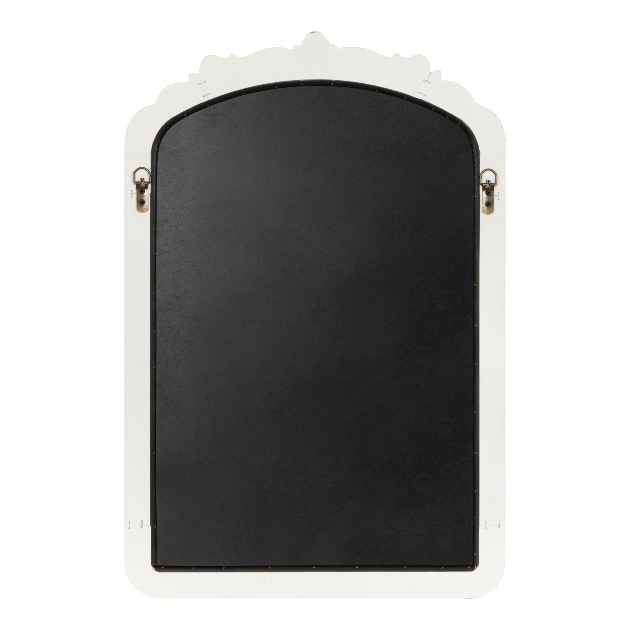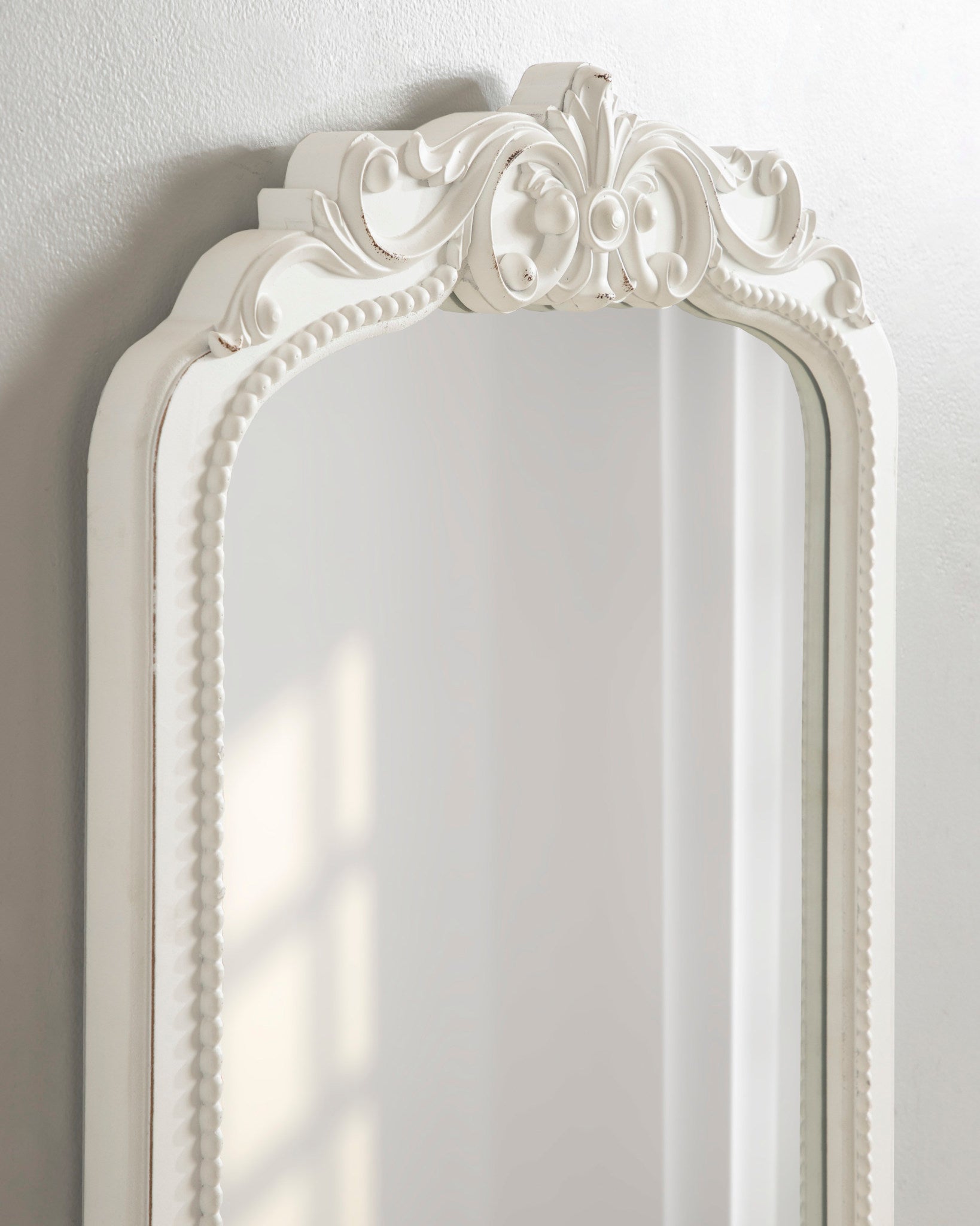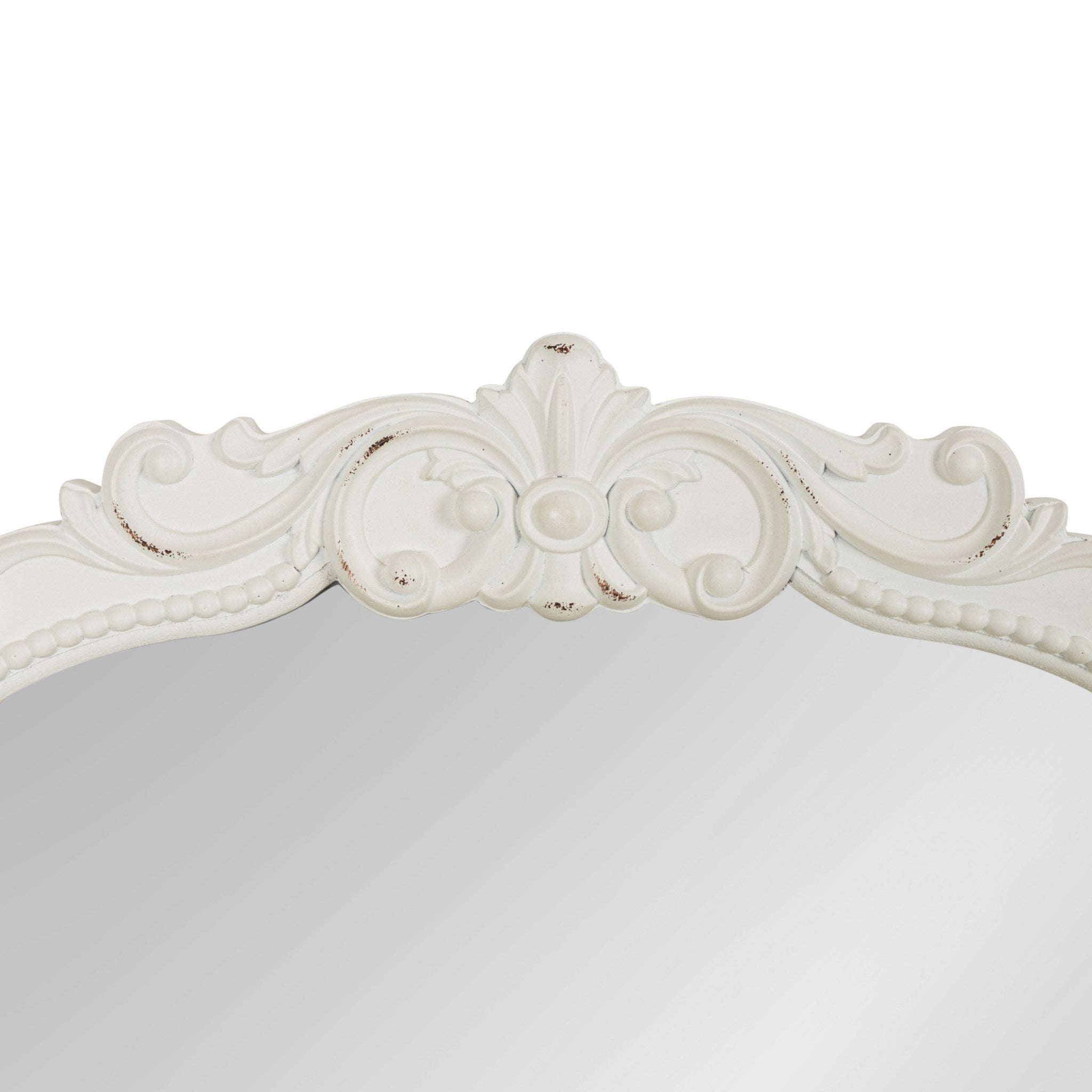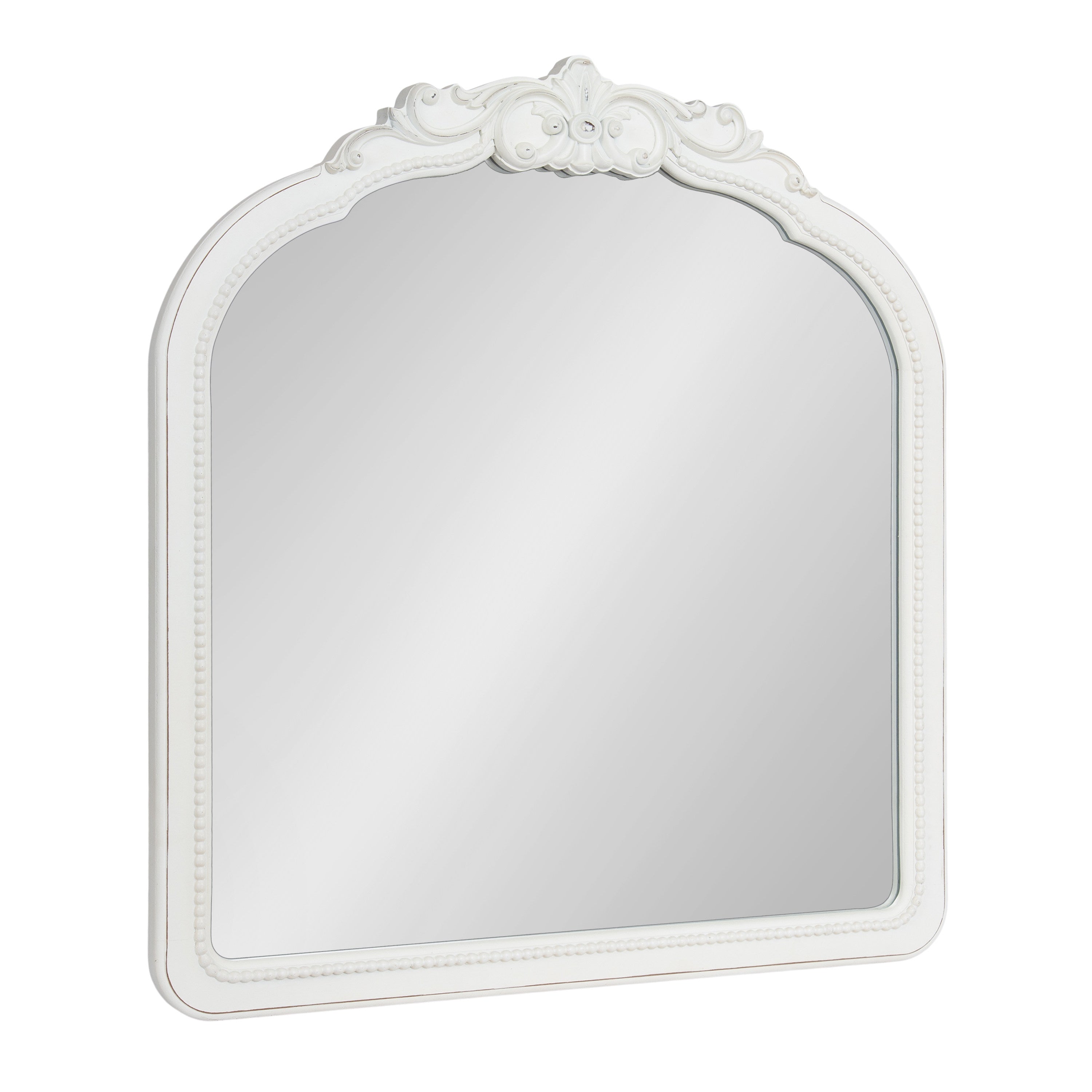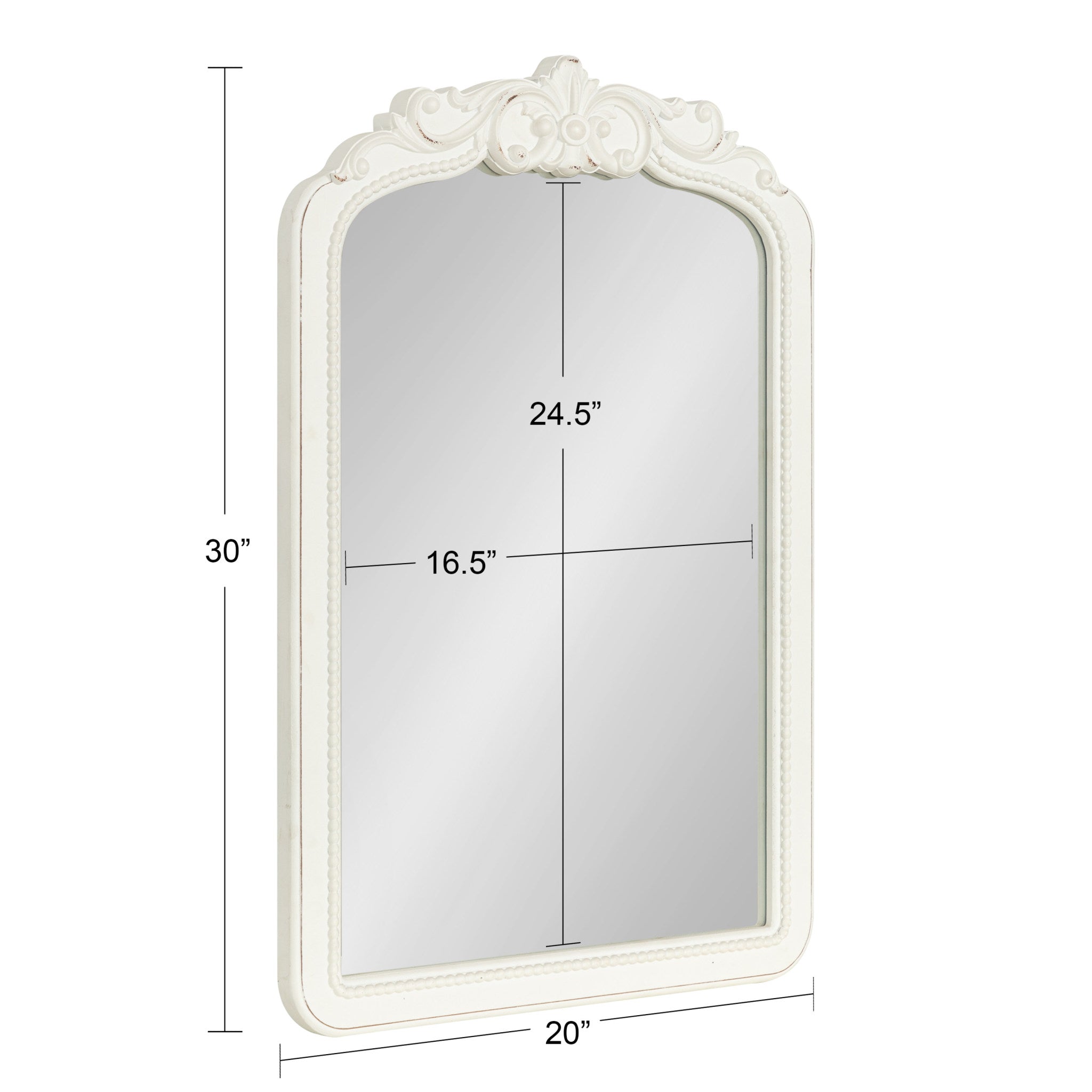 Embrace classical design on your wall with the dazzling Jenelle mirror. Inspired by french provincial and baroque styles, this lovely wall mirror features a bold beaded edge with an ornamental, cascading garland crown. The soft and elegant design of the Jenelle mirror makes it a fantastic accent piece for your living room mantle, entryway console table, bedroom dresser, or bathroom vanity.