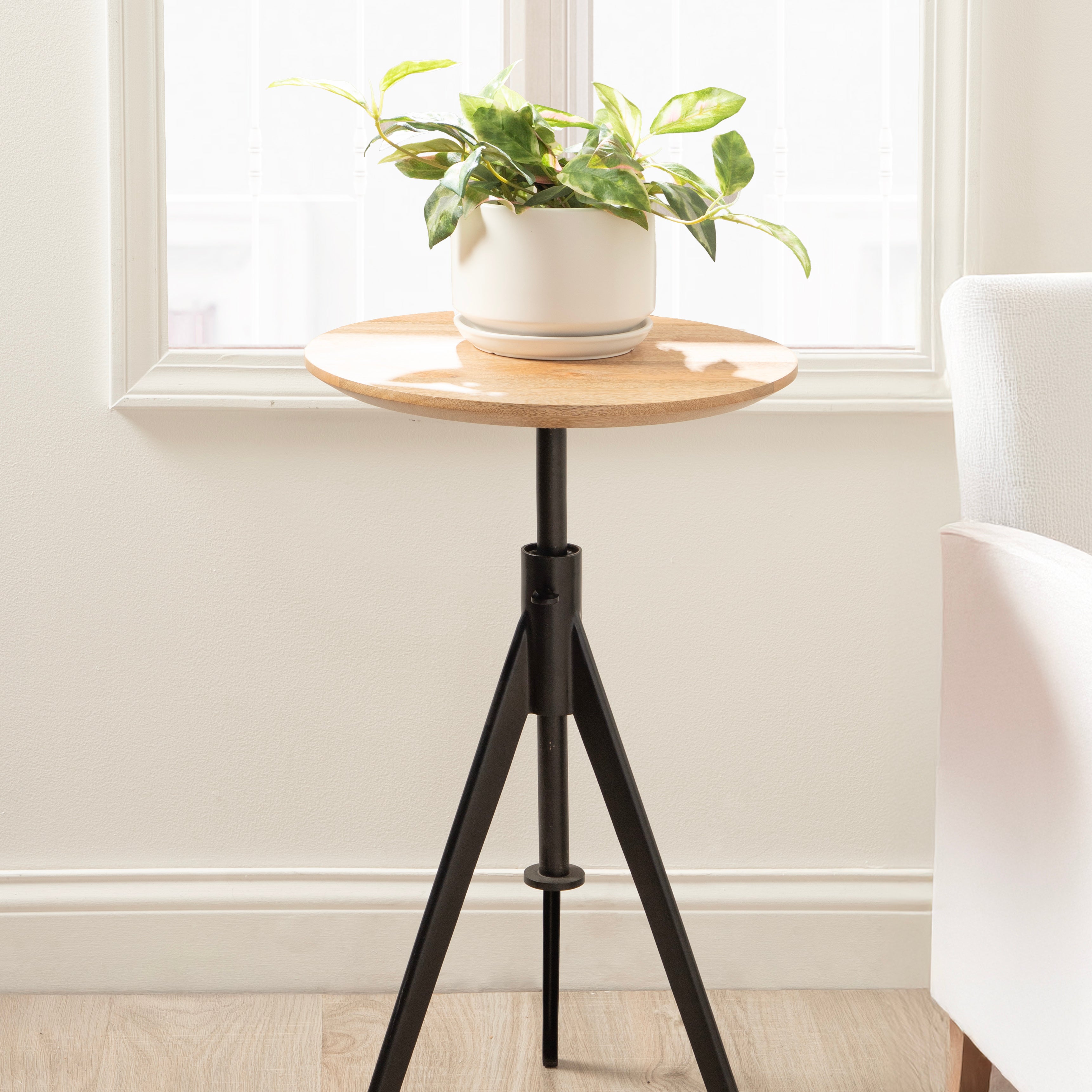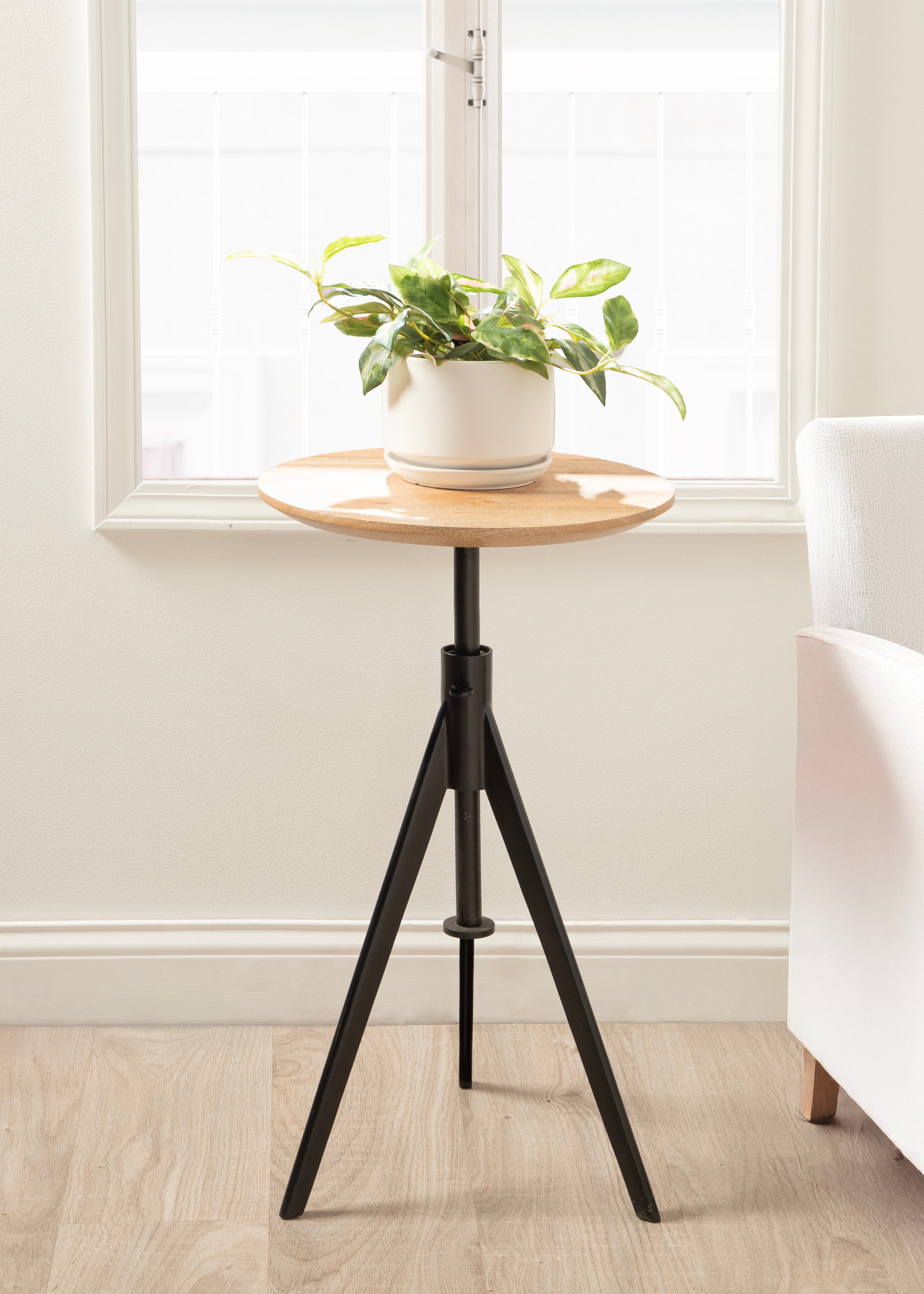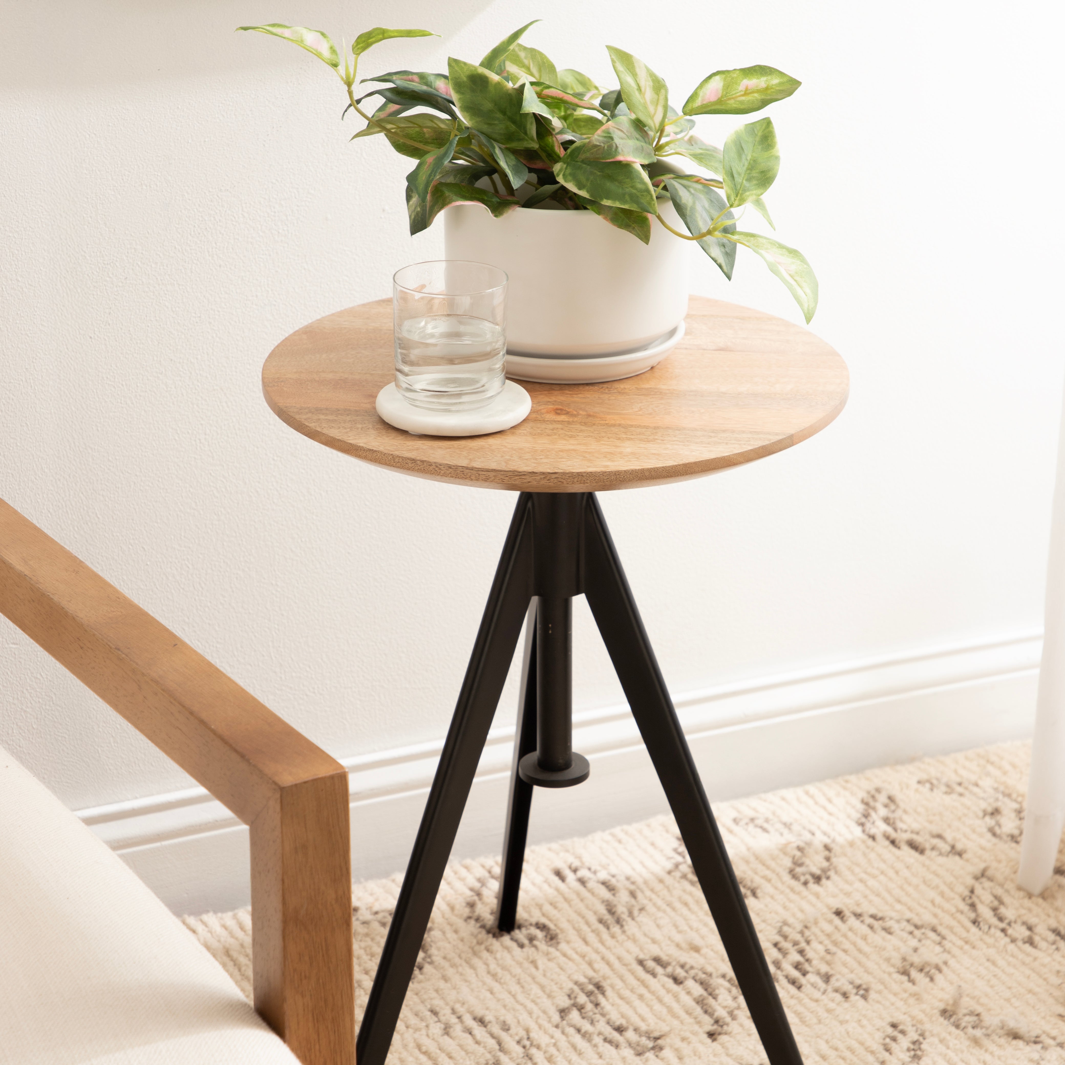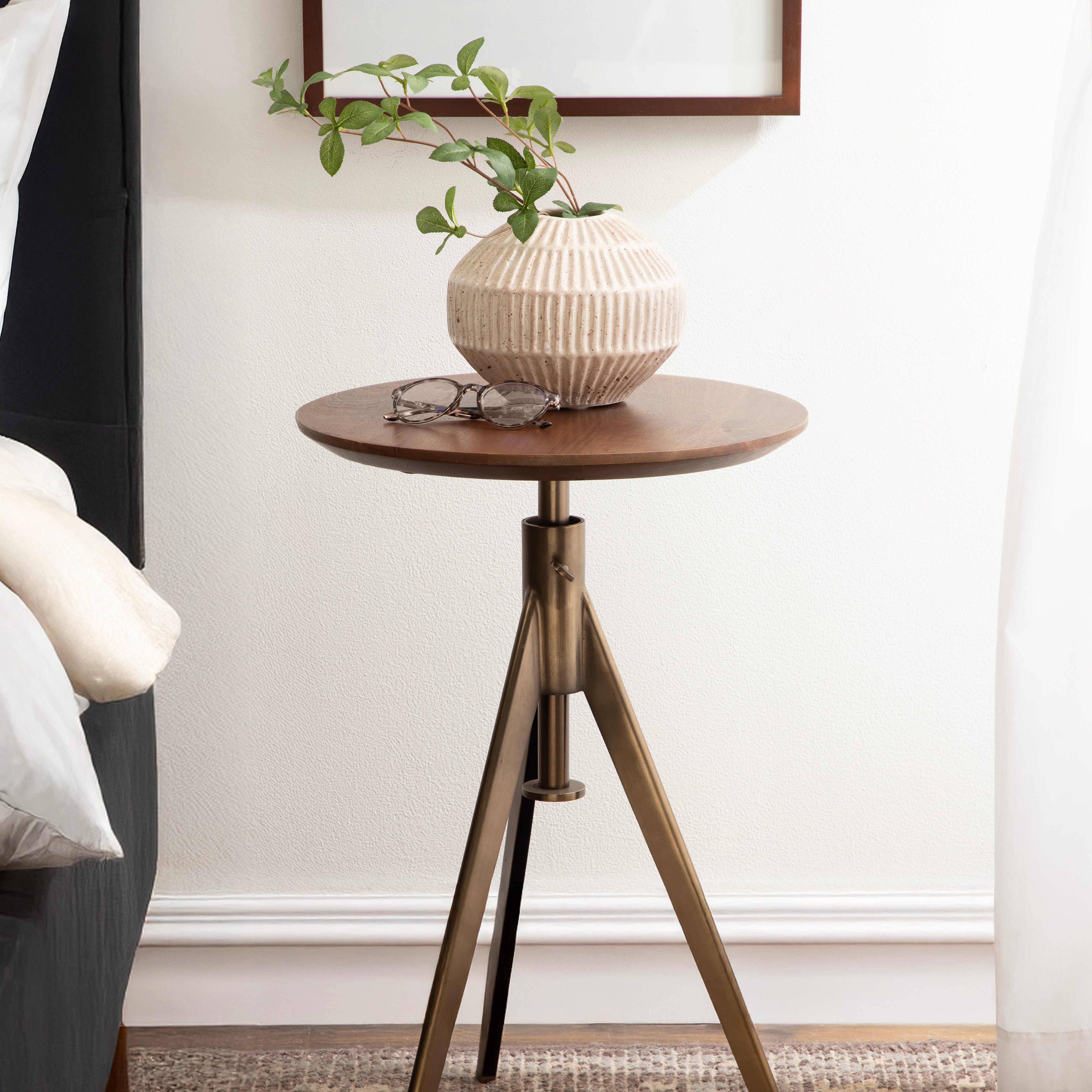 This charming one-of-a-kind accent table makes a bold impression with its handcrafted traditional style. The Keres side table has a sophisticated design, with a round solid mango wood tabletop and a unique tripod base design. This round end table features a unique telescope design, which allows you to adjust the height anywhere from 22 inches to 28 inches tall. This means that you can make it fit whatever height works best for your space. The Keres pedestal table looks great serving drinks on coasters, acting as a catch-all for small household items, or displaying a sprawling house plant as a plant stand. Start enjoying and utilizing this charming table immediately as it comes fully assembled.