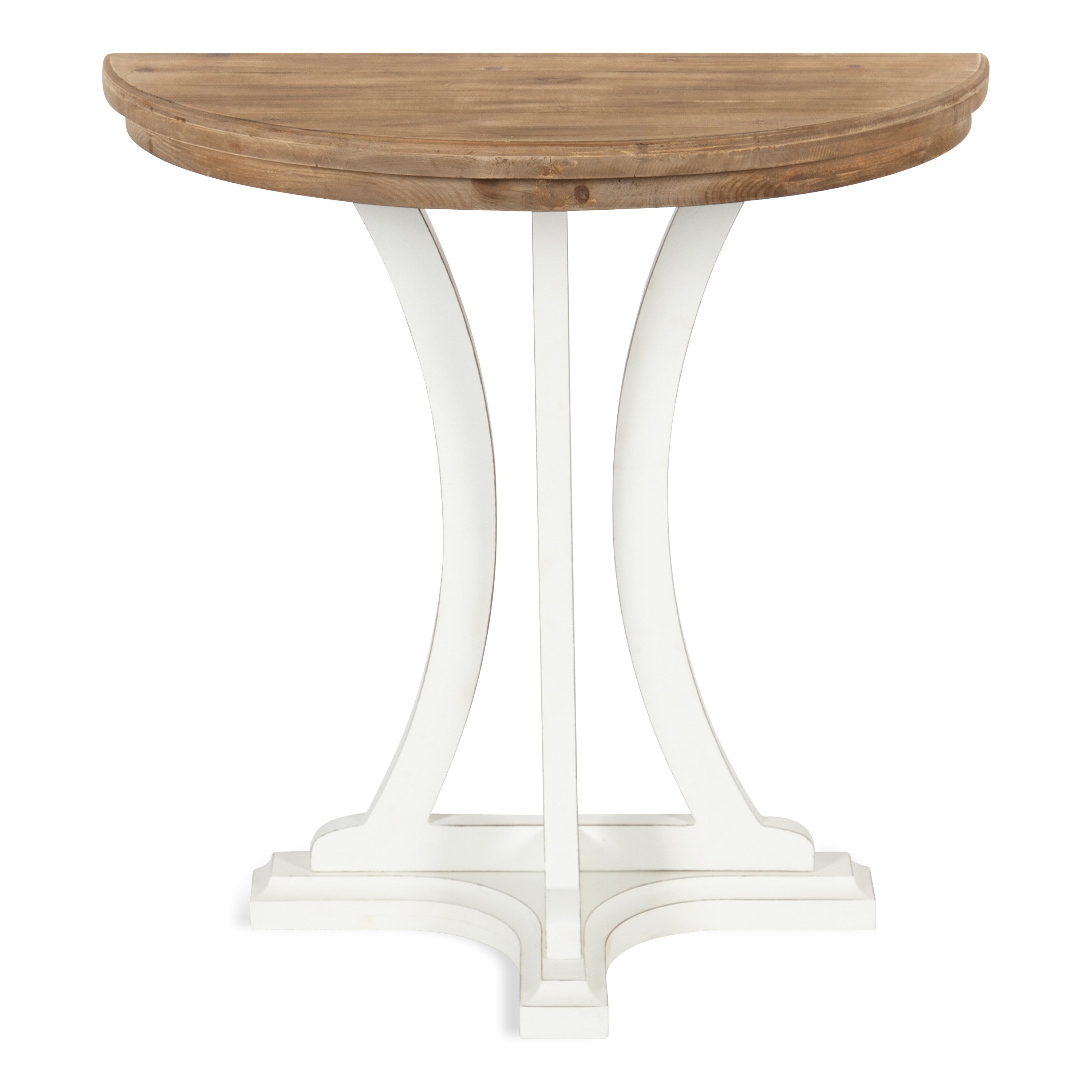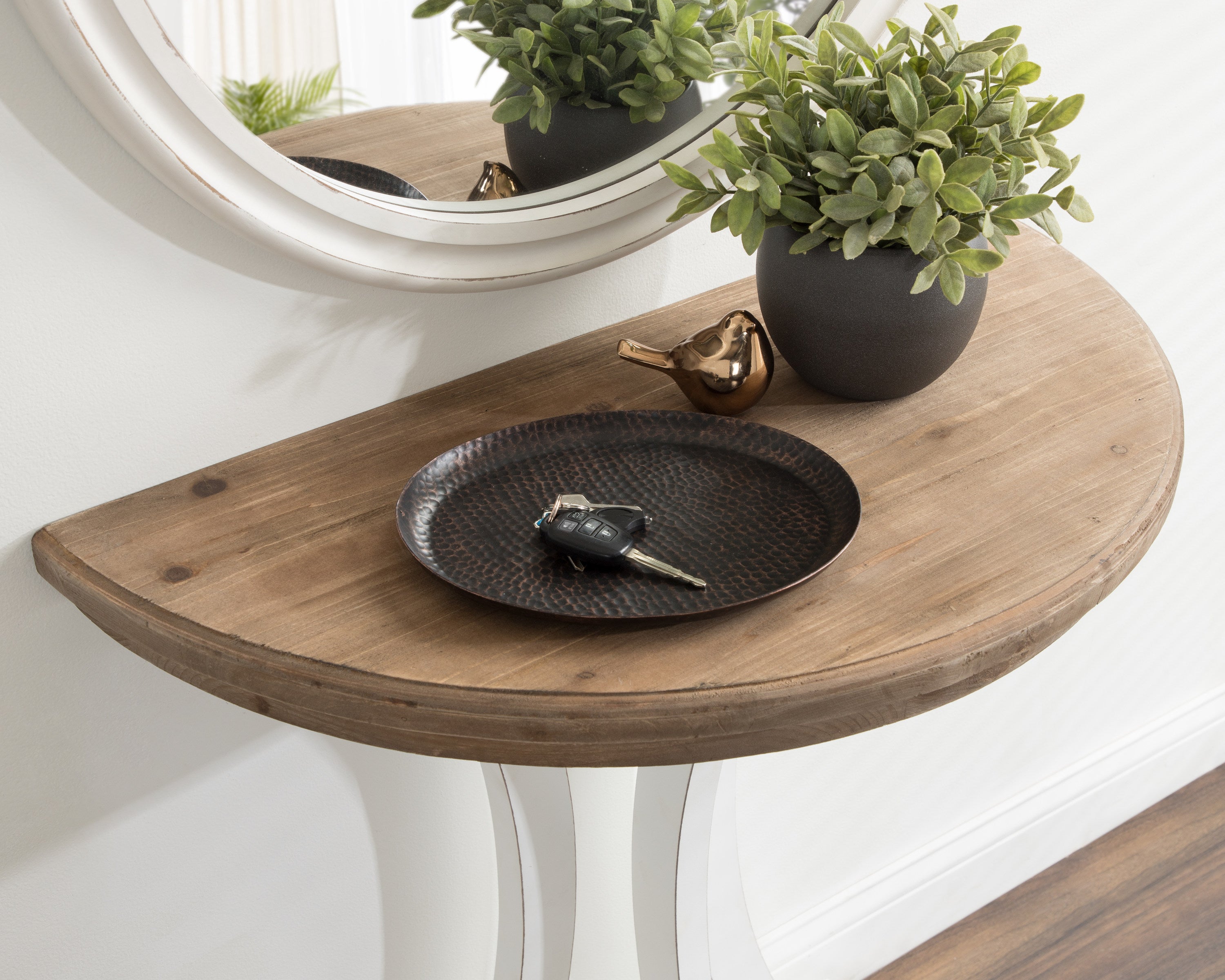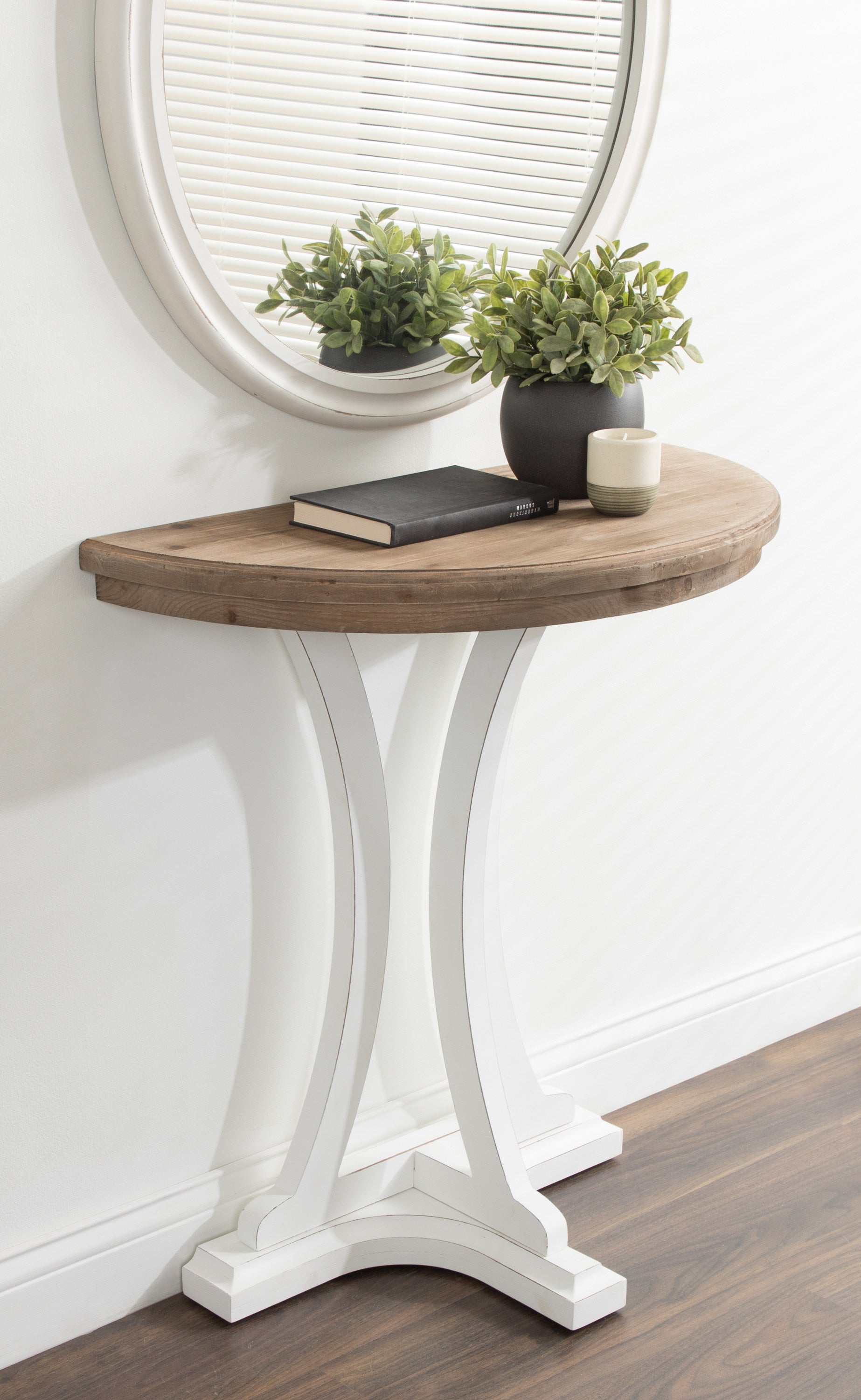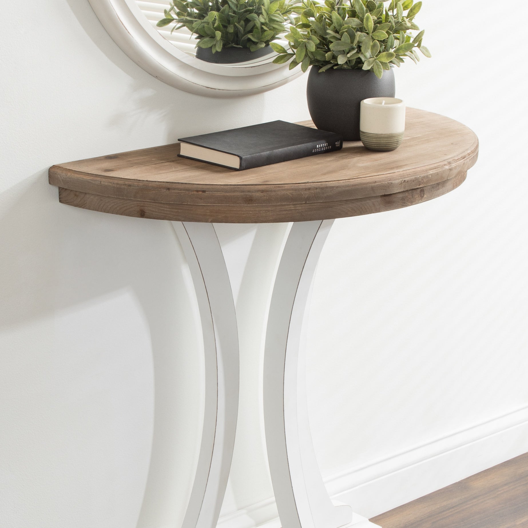 Give your home a sense of rustic charm with the farmhouse design of the Linsley console table. This beautiful console features wood construction with authentic wood knots that make each piece unique. The half-moon shape is excellent for creating a dimensional farmhouse theme and making a bold impression in your entryway, living room, or bedroom. Use it as a decorative surface for keepsakes and charming decor pieces or as a lovely vanity.