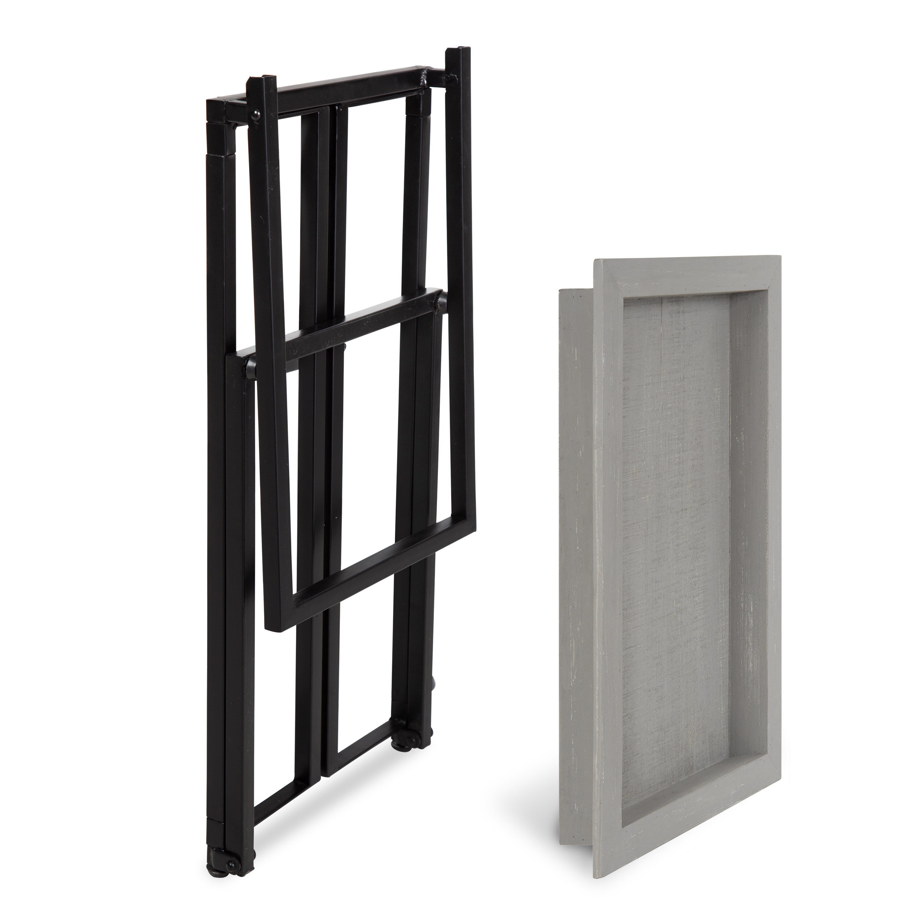 - Constructed of a sturdy metal base and a removable wooden tray top