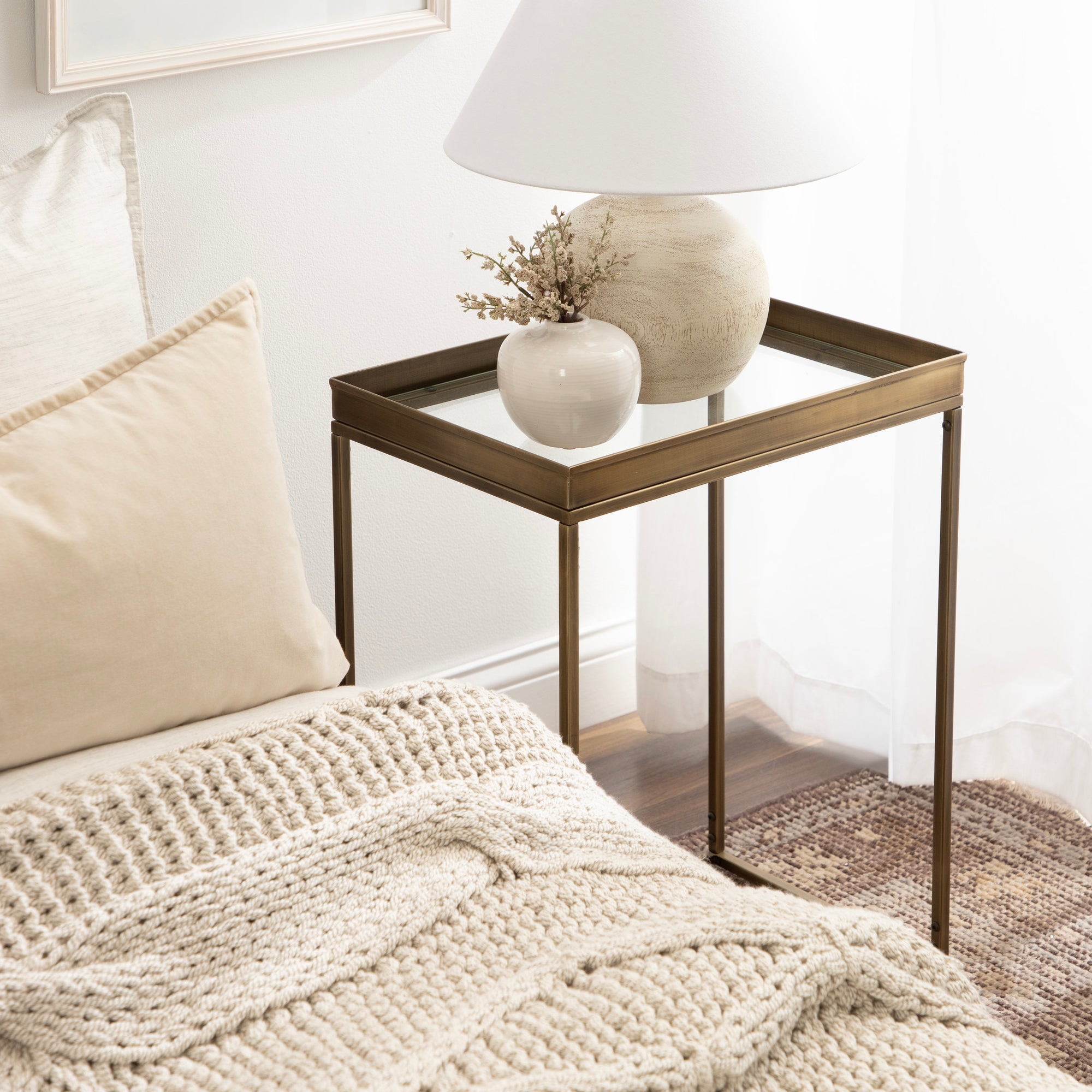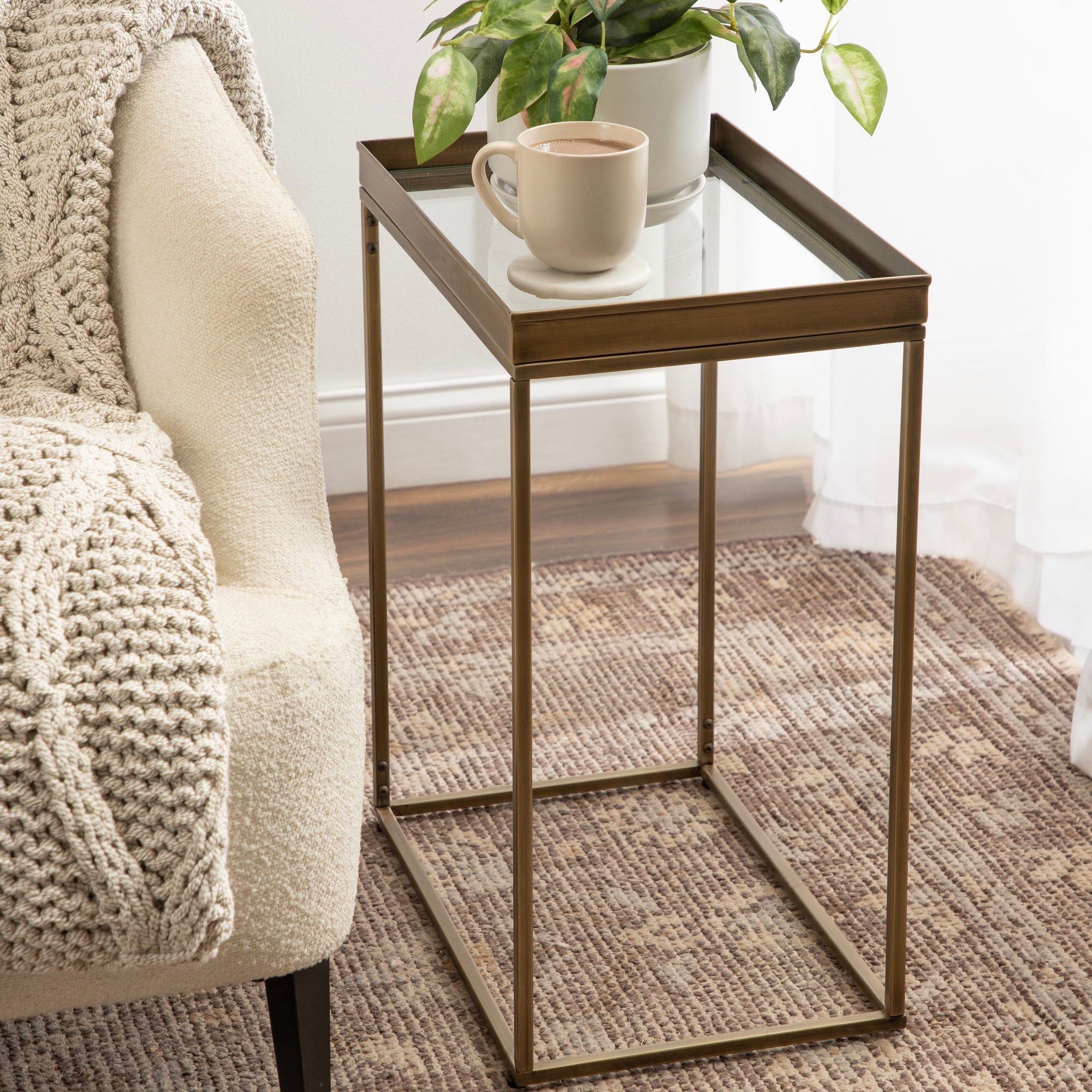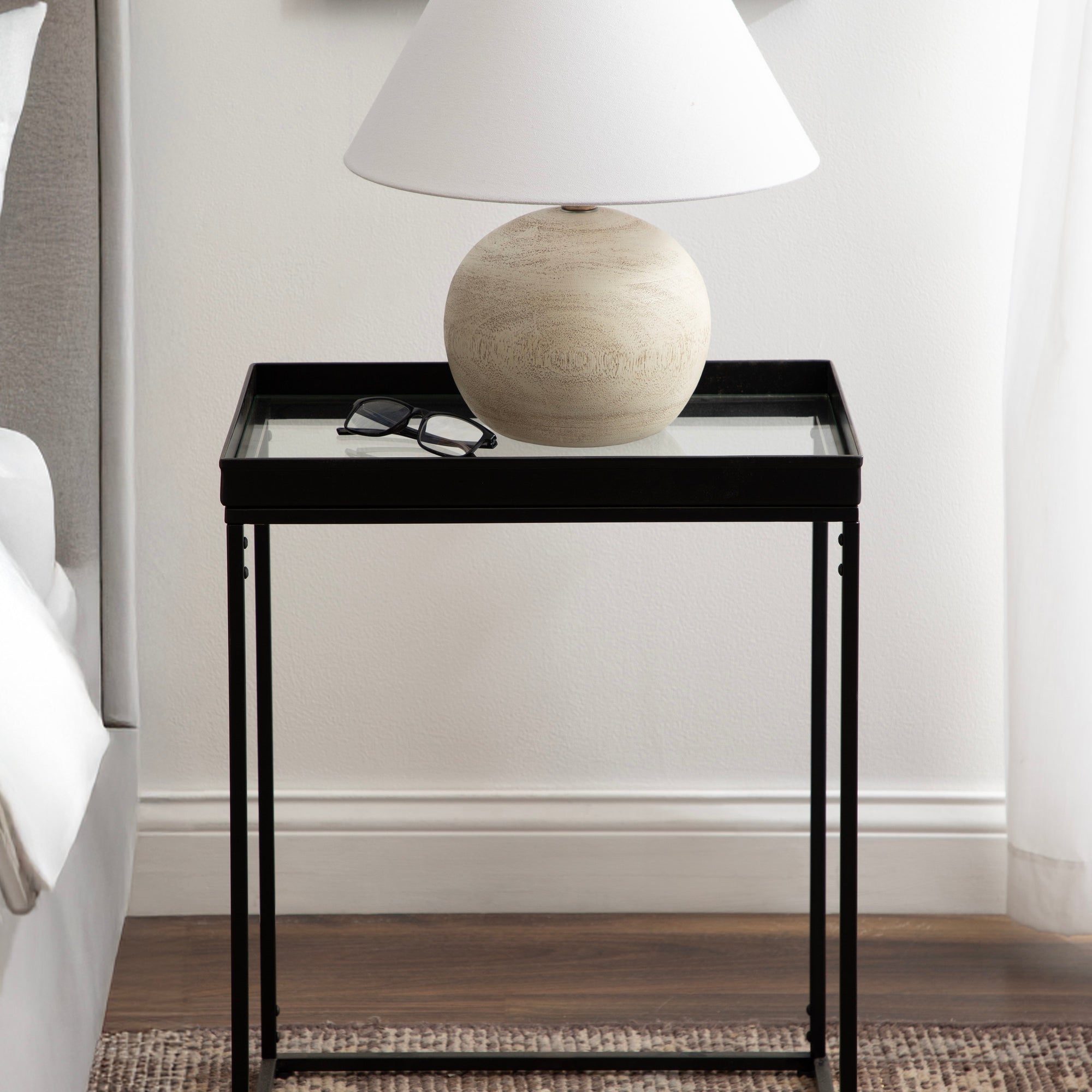 The Lonsdale end table brings classic sophistication to your home with its sharp and unique design. Inspired by modern design, this beautiful end table features a rectangular shape and clean, uncomplicated lines. To add a touch of elegance to your space, this beautiful table also has a stunning finish, commanding attention in any room of your home. The Lonsdale is crafted from a rich and premium iron material, with a recessed tempered glass tabletop to add sleekness and refinement. It's fantastic to create a small display of your favorite accent pieces, store small household necessities like media remotes, jewelry, or books, or act as a catch-all for those "out-the-door" items you need before you leave.