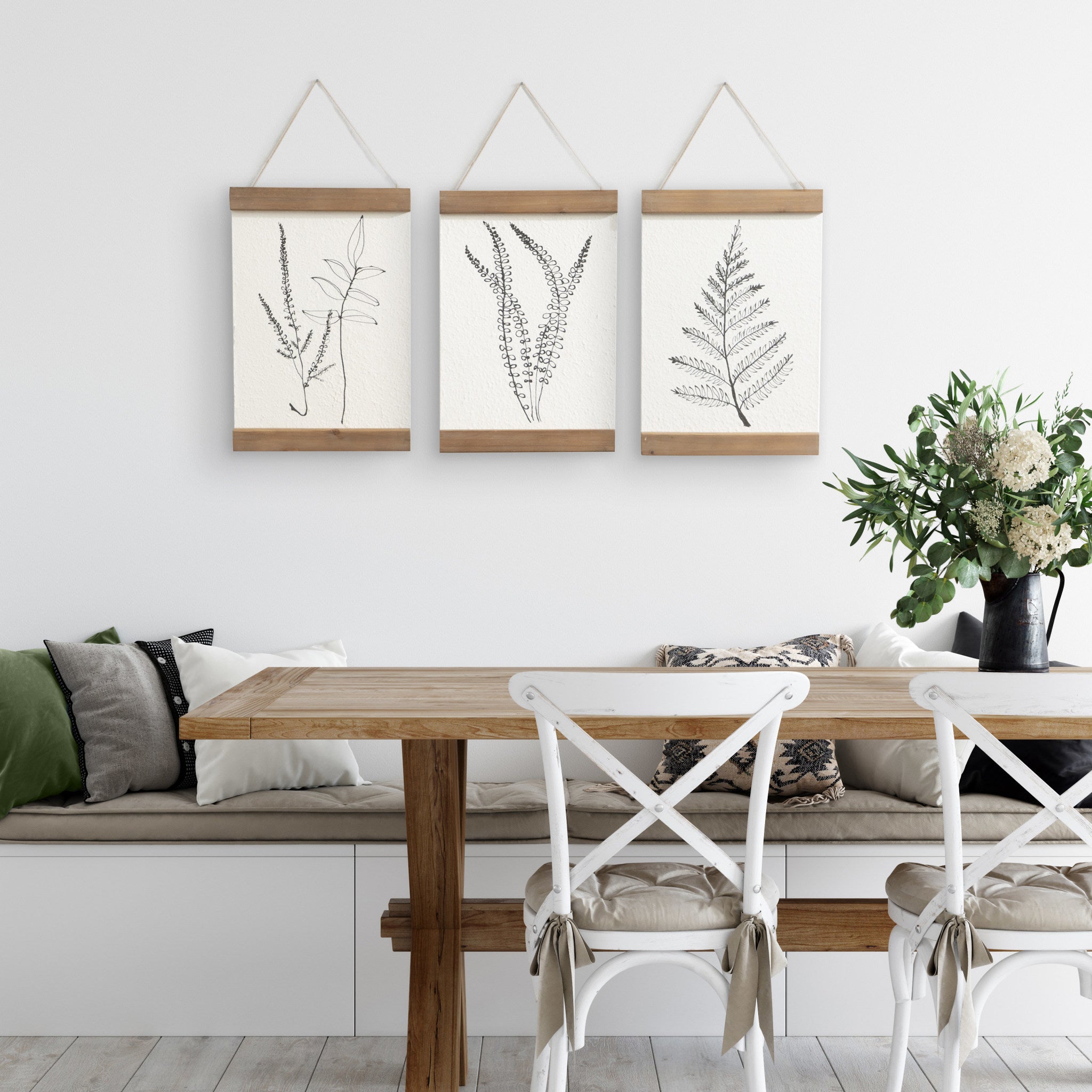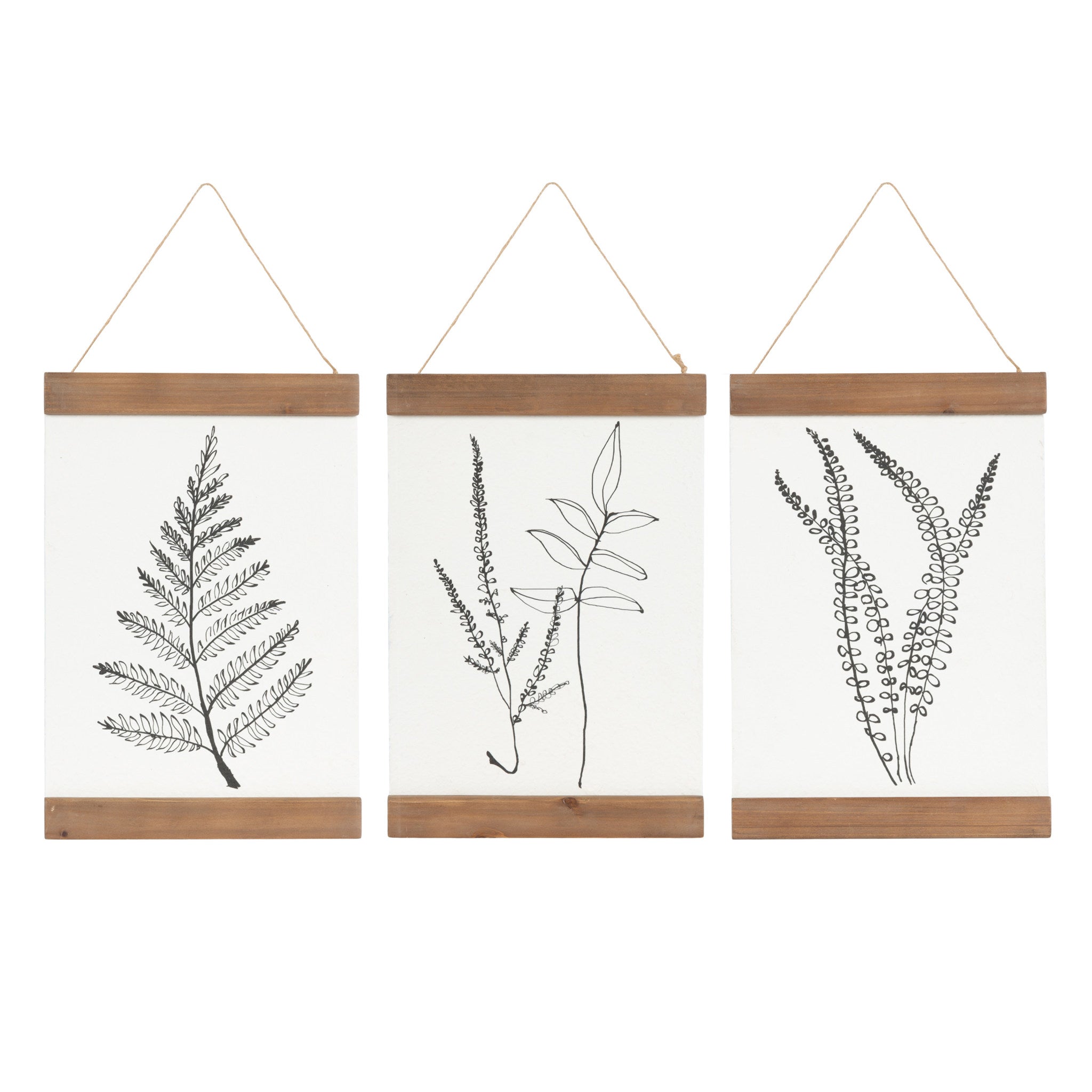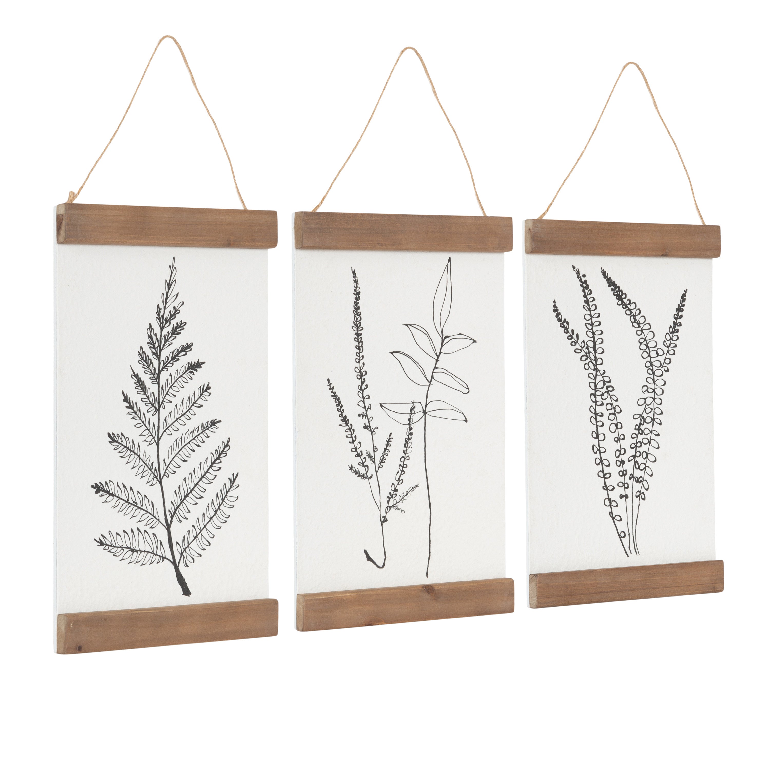 Provide a lovely, organic addition to your nursery or entryway with this natural three-piece botanical art set. This thoughtful art set is the perfect way to add a touch of farmhouse charm to your decor. Crafted from resilient, quality materials, this art set features a textured paper backdrop, wooden headers, jute hangers, and sturdy metal backing. Each piece of this set has a different botanical drawing, giving your space a cohesive set where each piece is still individual and unique. This decorative art set is great in a child's nursery, a bedroom, an entryway, a hallway, and wherever else you can imagine! Easy to hang, this set comes with attached twine for simple, secure hanging that is as decorative as it is stable.
