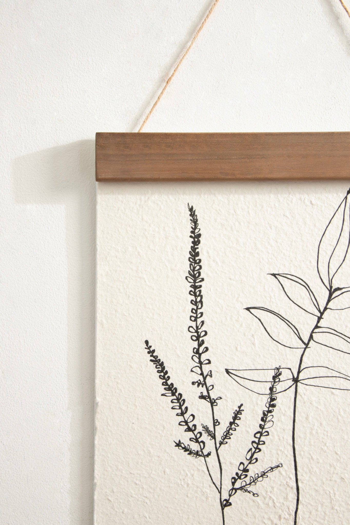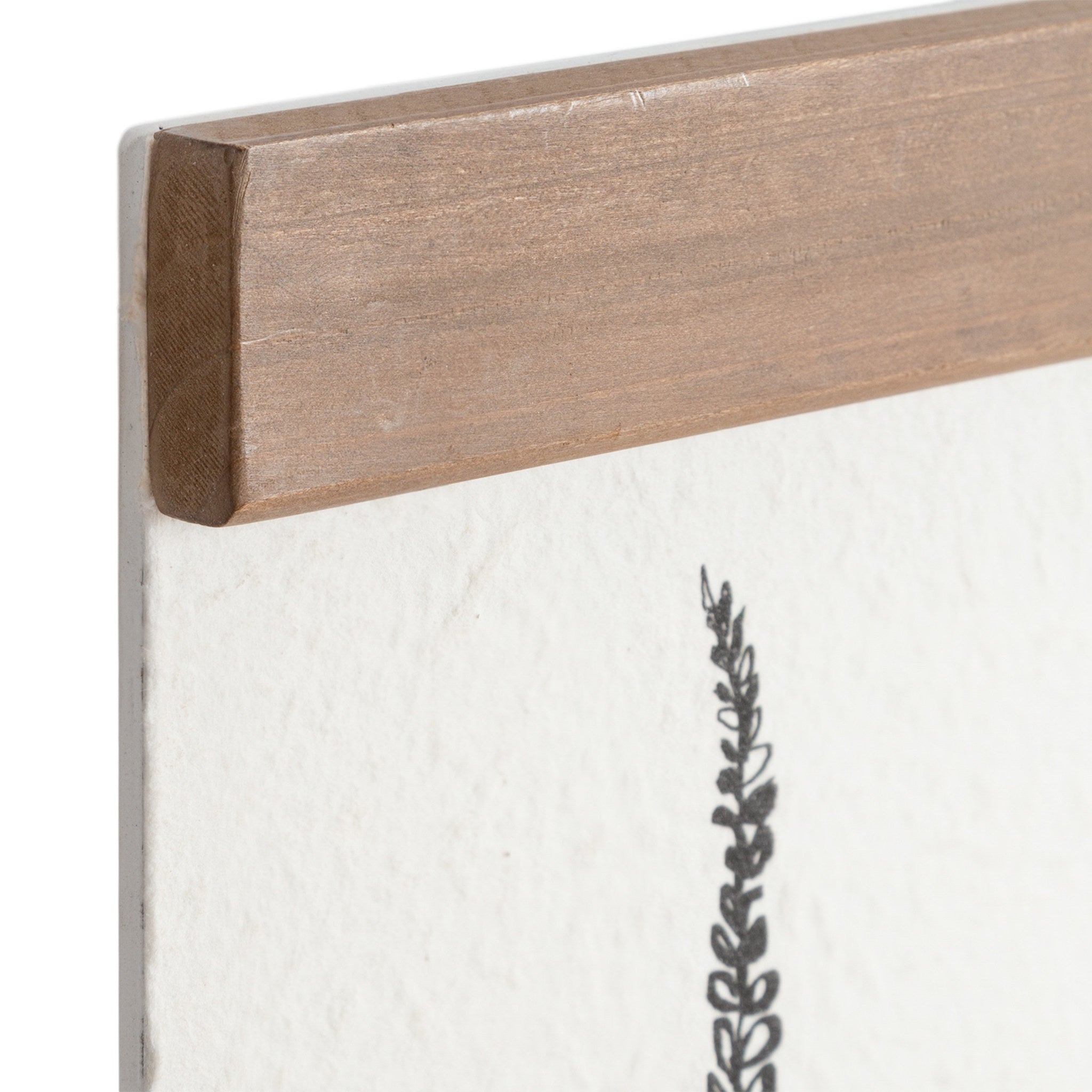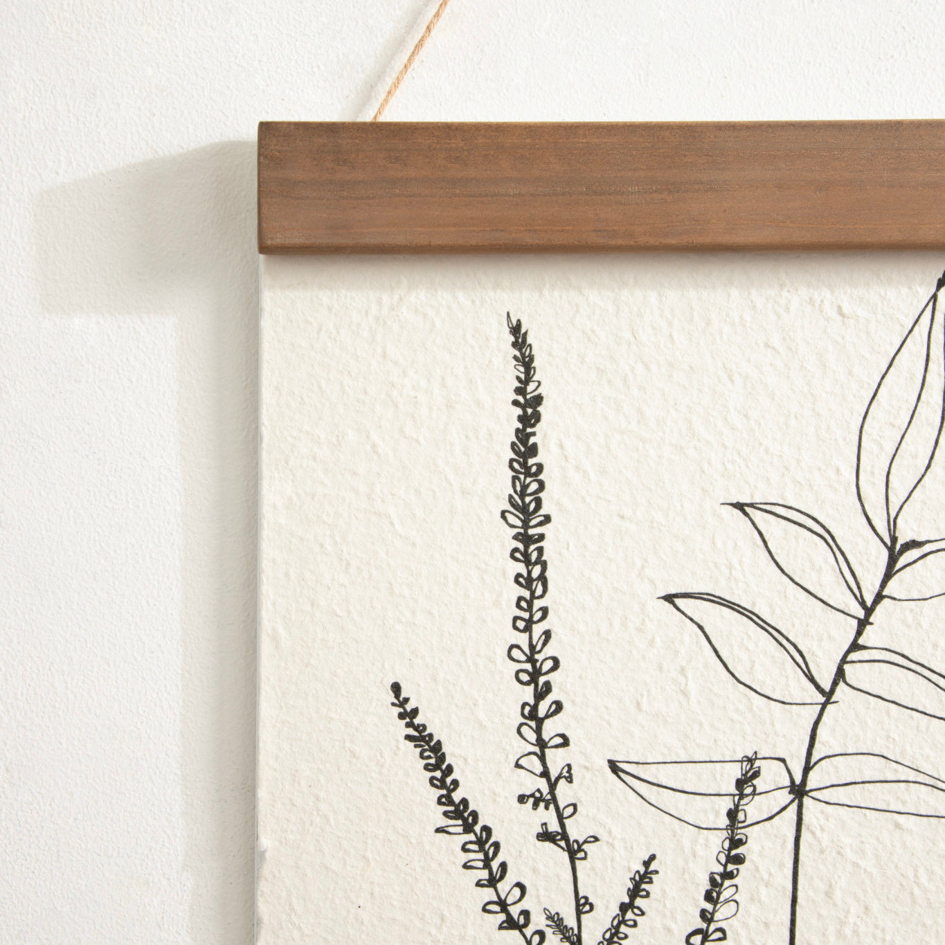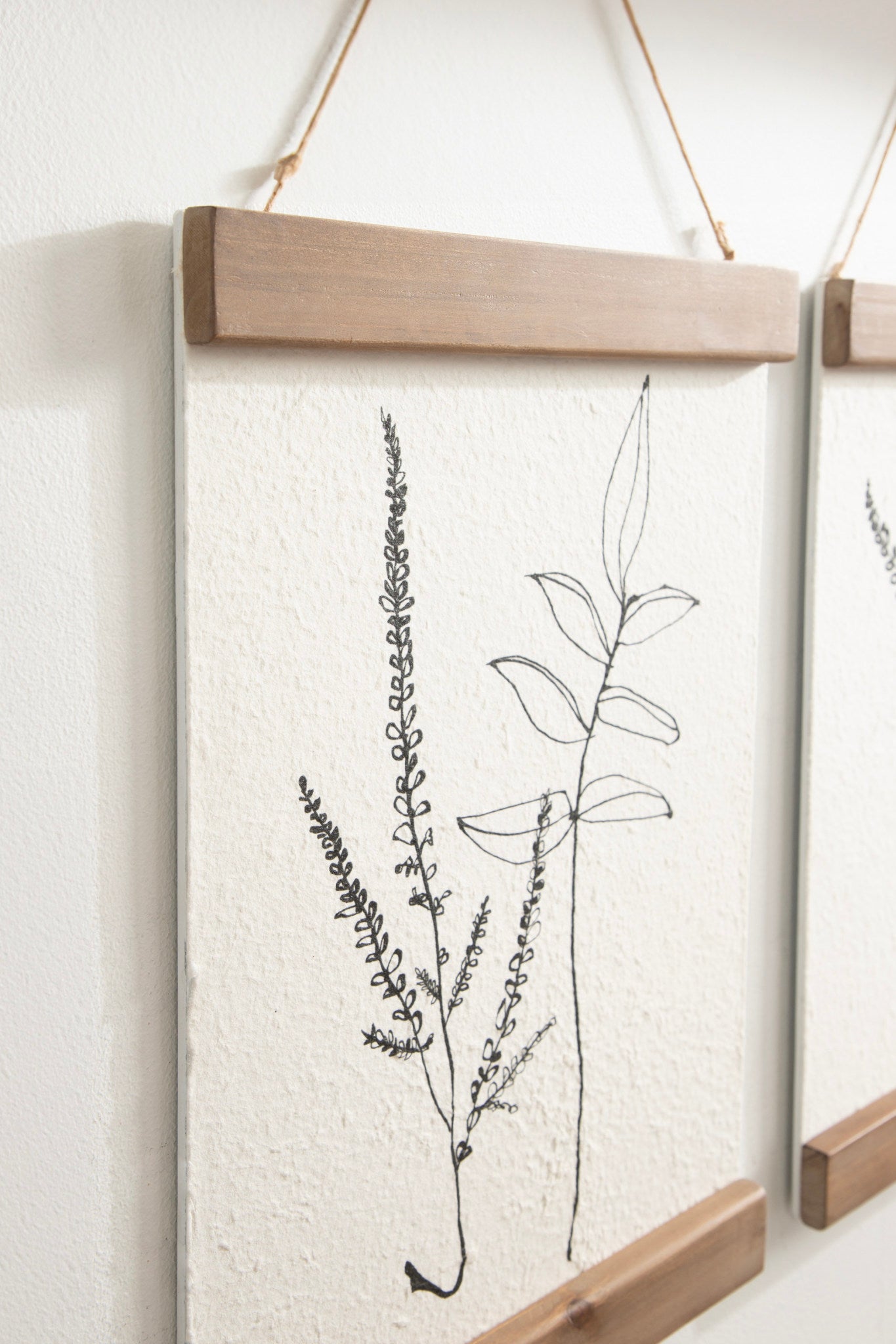 Provide a lovely, organic addition to your nursery or entryway with this natural three-piece botanical art set. This thoughtful art set is the perfect way to add a touch of farmhouse charm to your decor. Crafted from resilient, quality materials, this art set features a textured paper backdrop, wooden headers, jute hangers, and sturdy metal backing. Each piece of this set has a different botanical drawing, giving your space a cohesive set where each piece is still individual and unique. This decorative art set is great in a child's nursery, a bedroom, an entryway, a hallway, and wherever else you can imagine! Easy to hang, this set comes with attached twine for simple, secure hanging that is as decorative as it is stable.