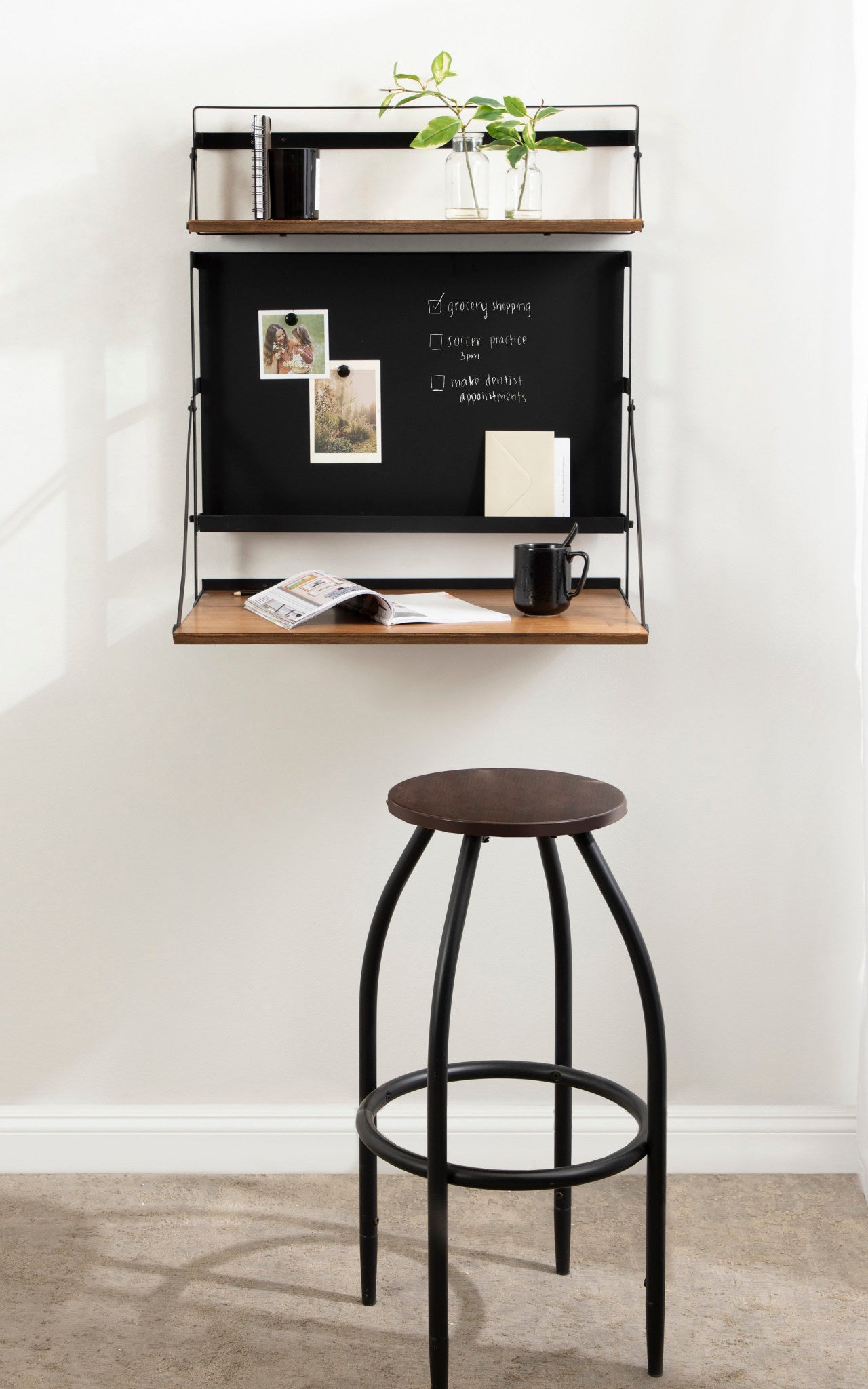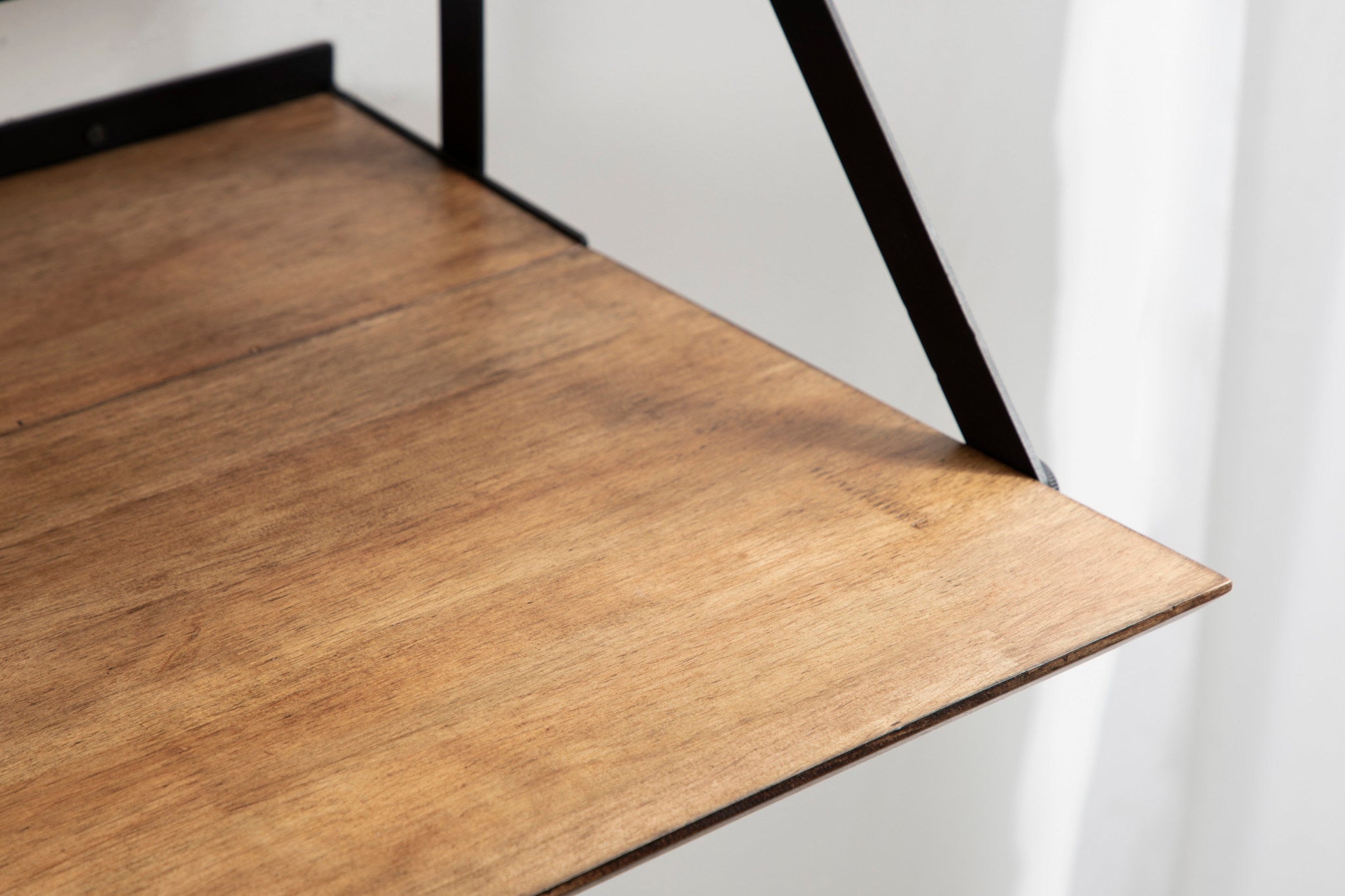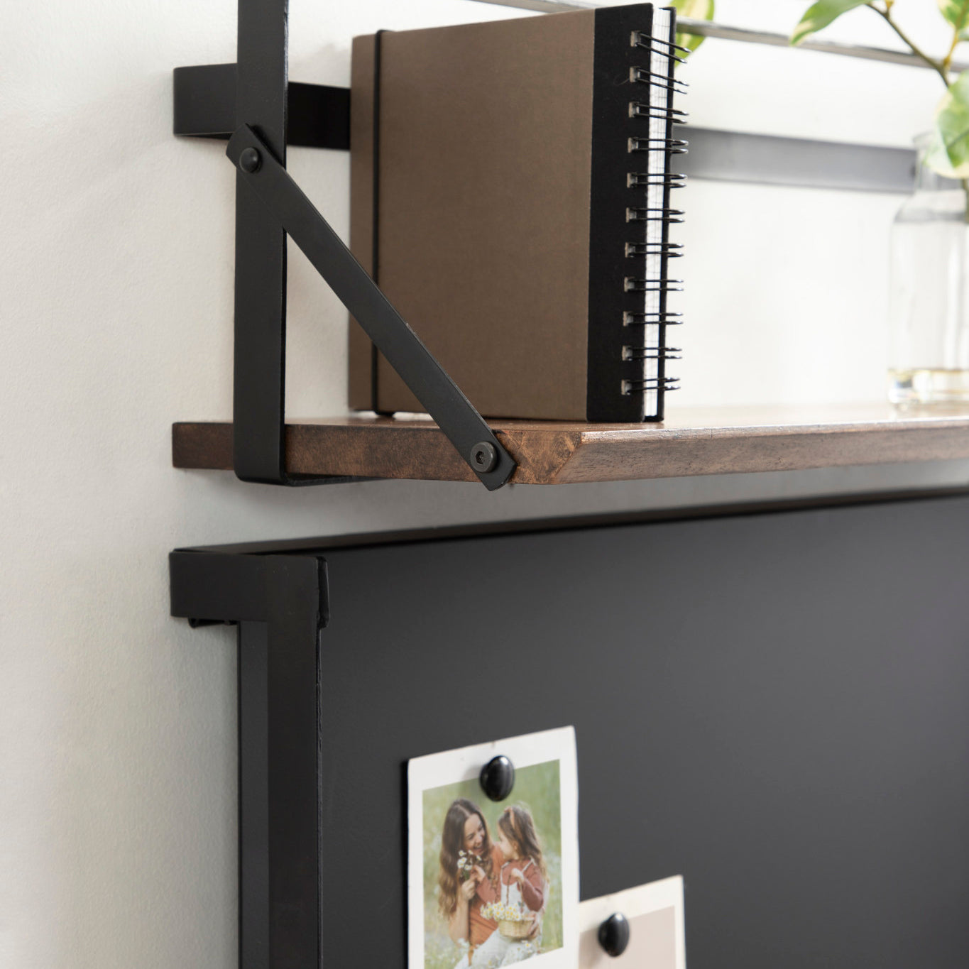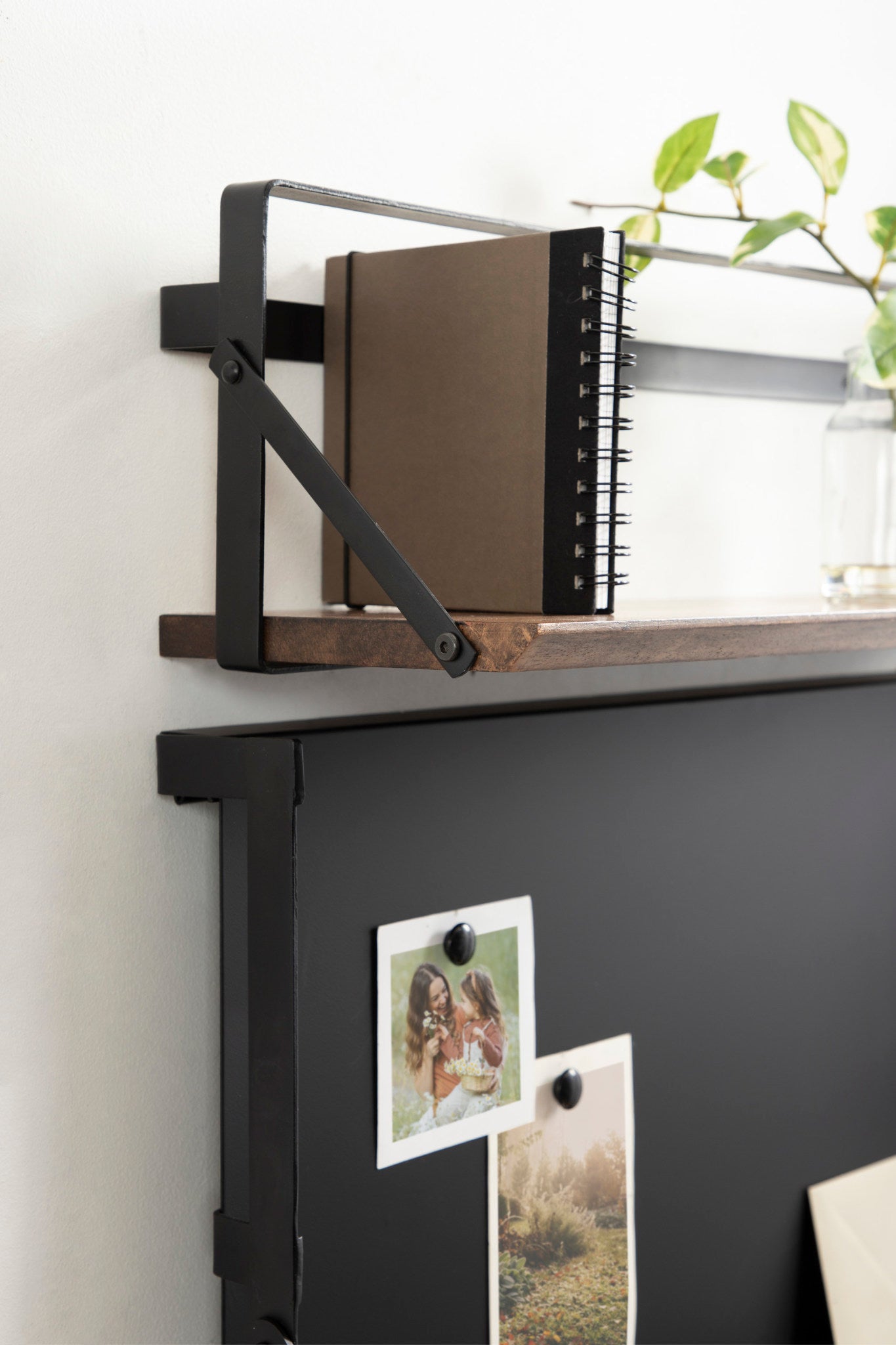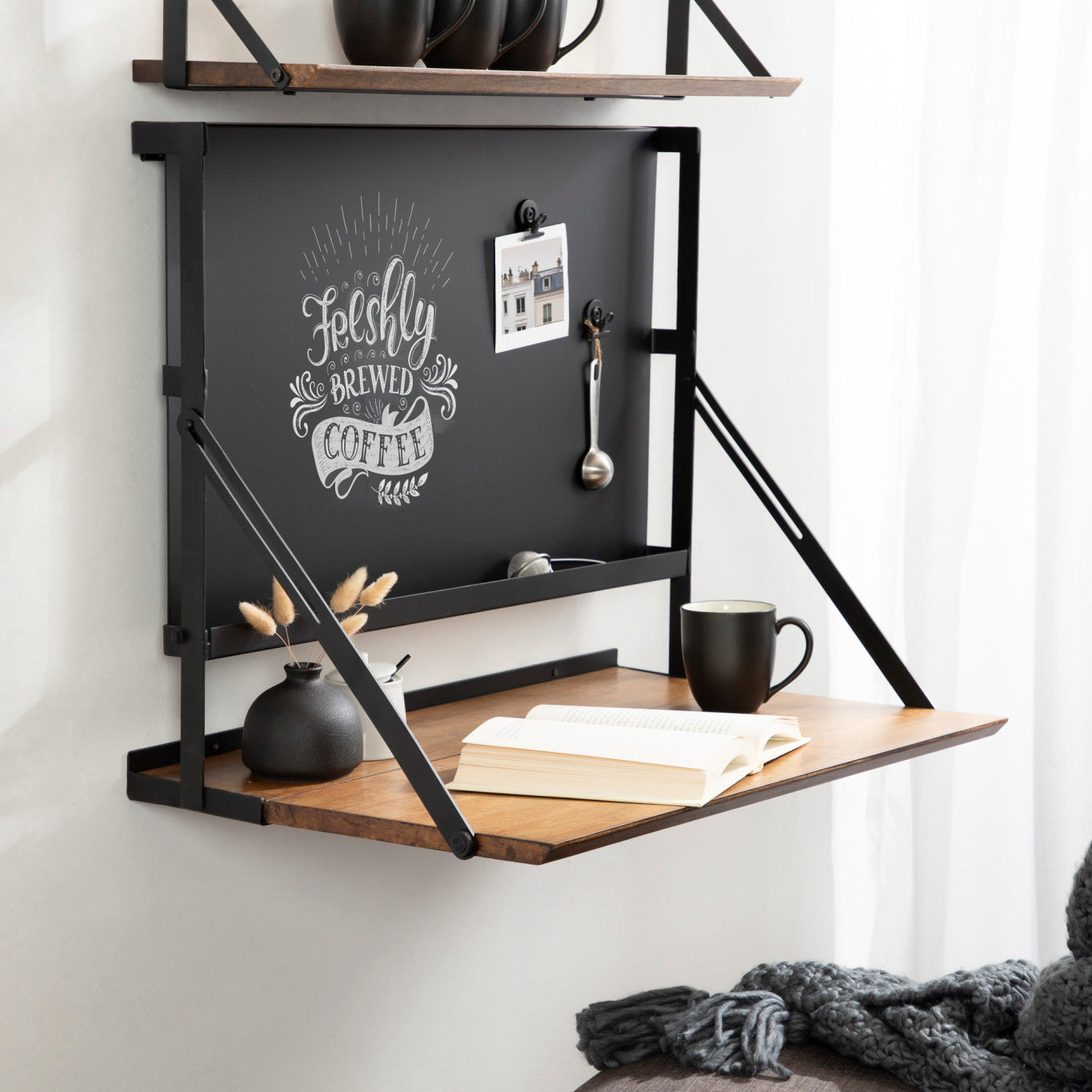 Thanks to the McAllister's unique and purposeful design, you can get a highly-versatile floating desk that provides your space with style, charm, and function. The McAllister floating desk is an excellent solution for creating a functional home office without taking up too much floor space. This modern, foldable desk features a tabletop that folds up, plus a magnetic chalkboard and shelves for display and storage. Each McAllister desk is crafted with robust wood and resilient iron, making this desk unique in woodgrain and finish.