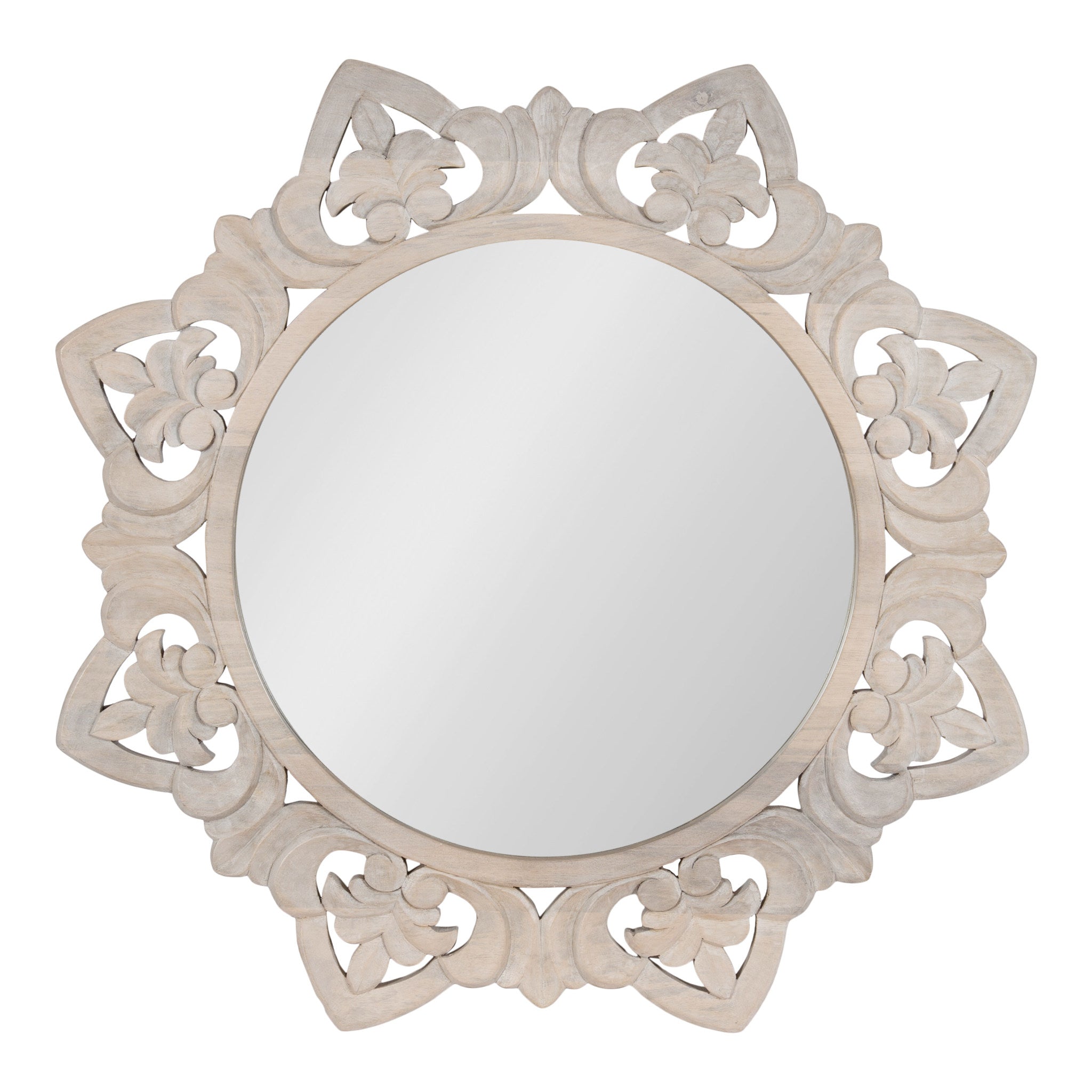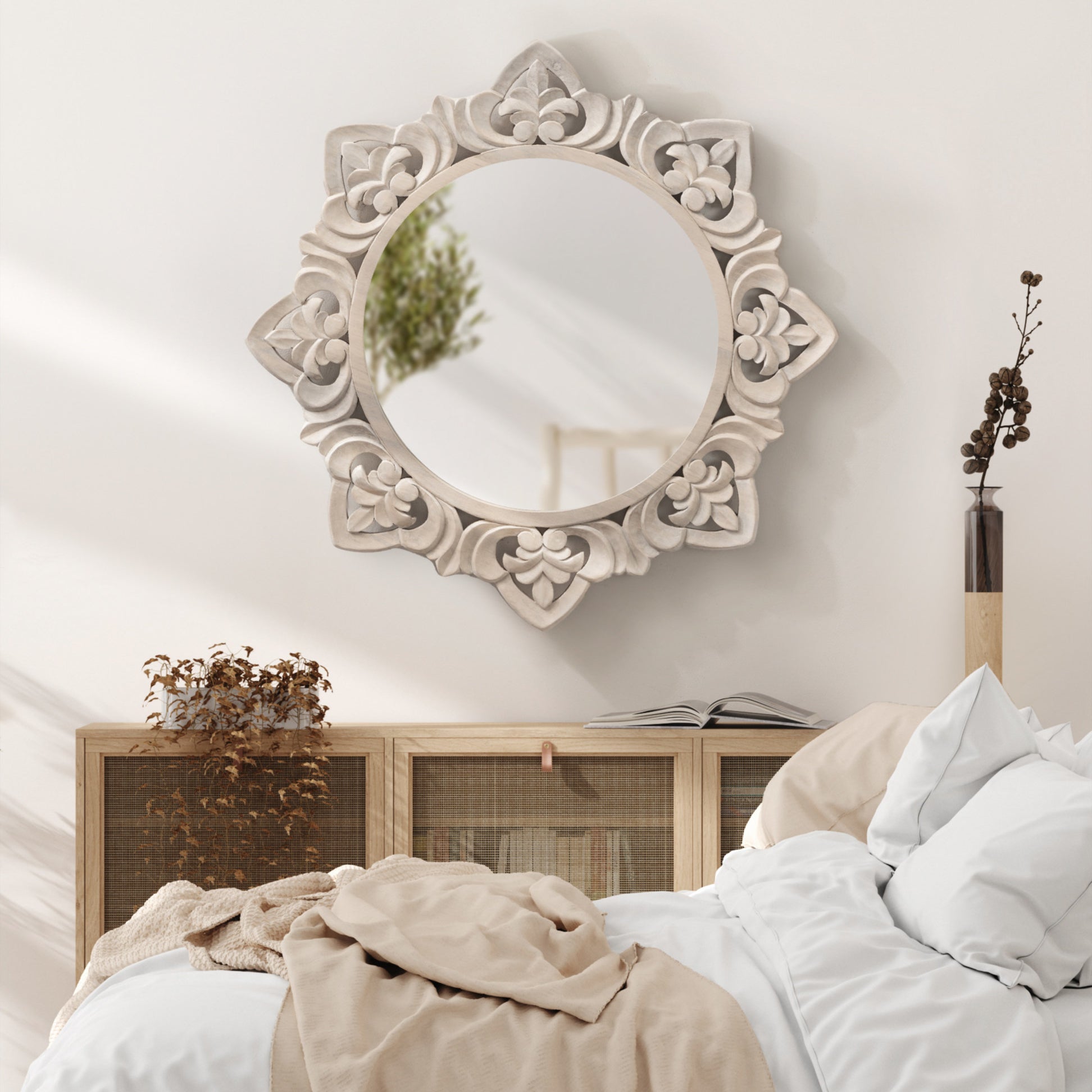 Crafted with meticulous attention to detail, the Meera carved mirror boasts a detailed starburst frame that adds a touch of artistry to its design. The intricate carvings not only enhance the mirror's aesthetic appeal but also create a sense of depth and dimension, making it a focal point in any room. The Meera mirror effortlessly combines form and function, providing both a practical reflective surface and a decorative element. The timeless design ensures versatility, complementing a variety of interior styles from classic to modern.